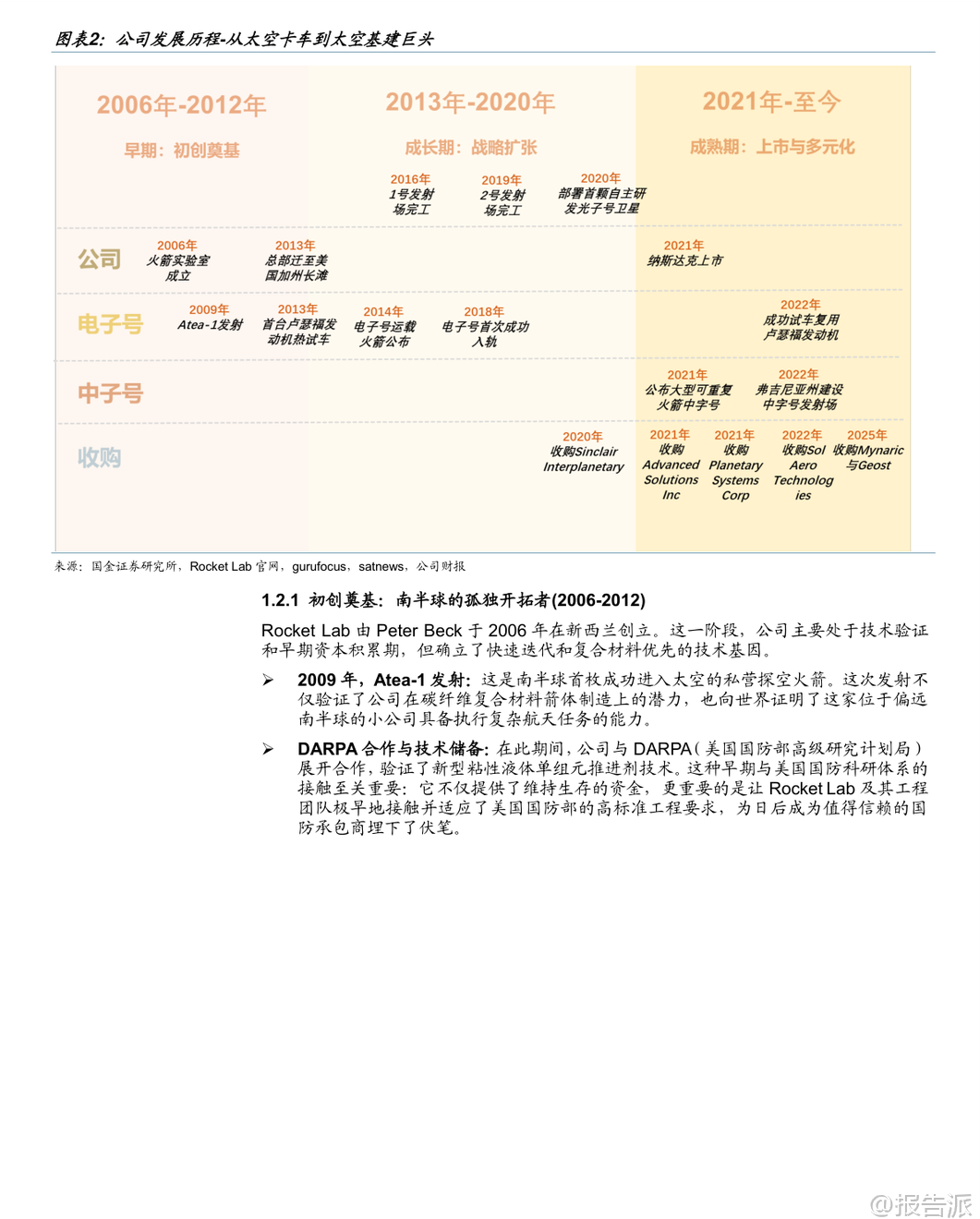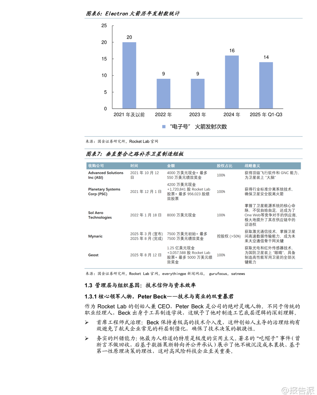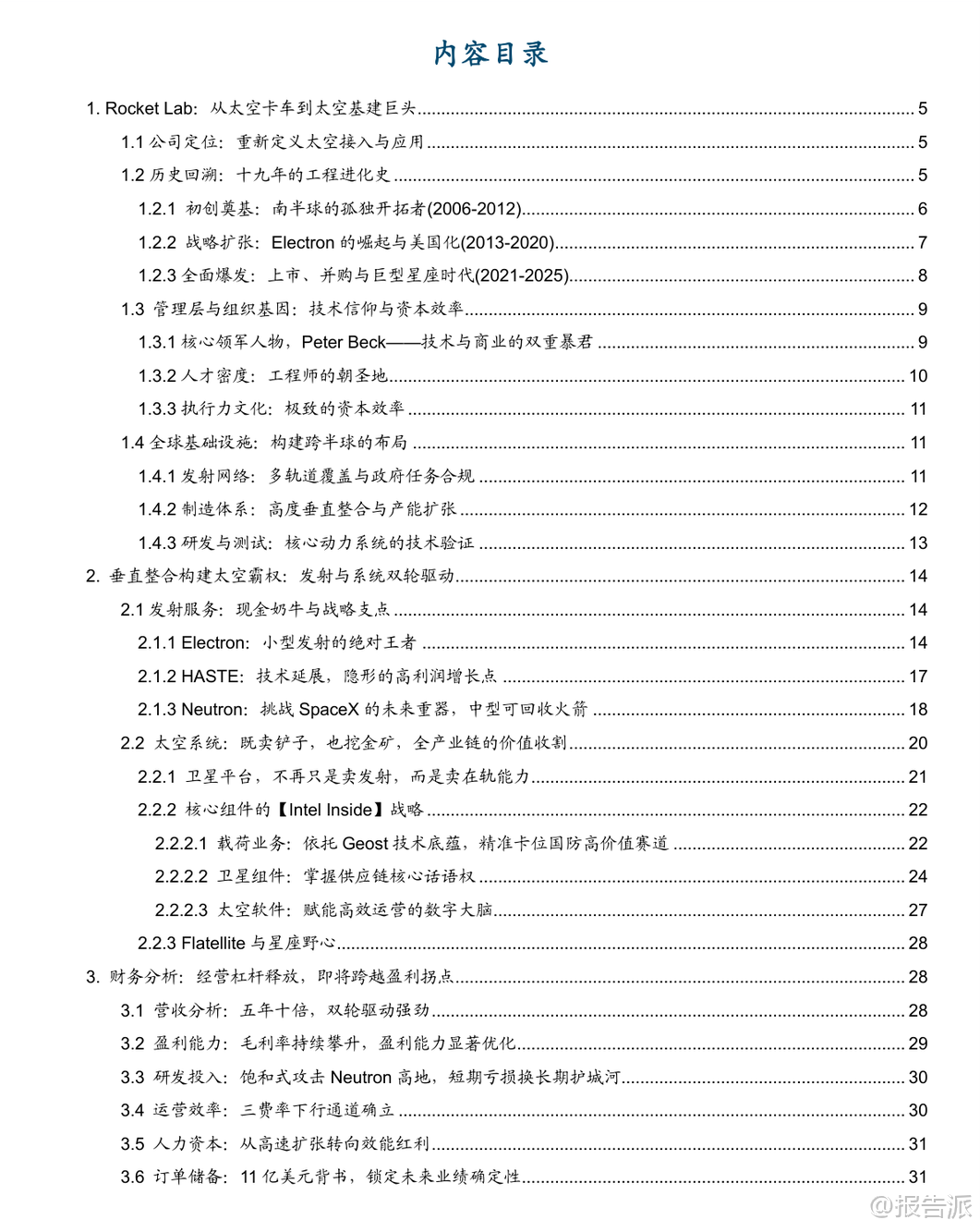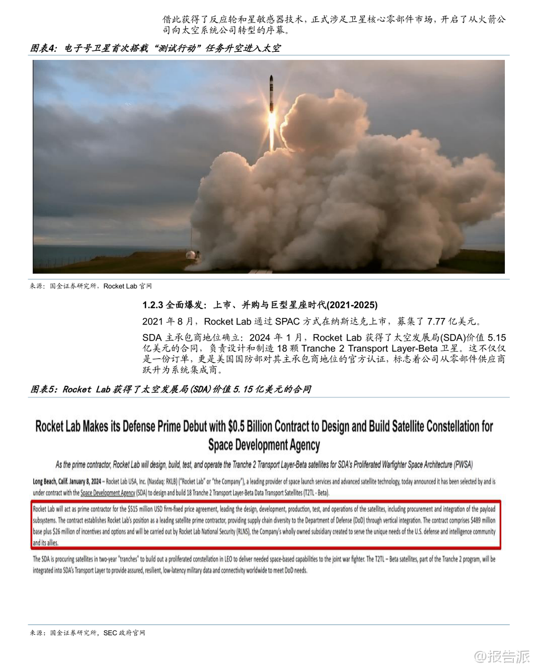 | Rocket Lab正从一家小型火箭发射公司蜕变为全球领先的端到端太空系统巨头,成为仅次于SpaceX的“航天第二极”。 作为全球仅有的两家能同时提供高频轨道发射和大规模航天器制造的私营企业之一,其战略价值不仅在于商业竞争,更在于对美国及其盟友太空进入能力的国防支撑。 在发射业务方面,Electron火箭已成为西方世界小型卫星发射的绝对龙头,具备高频次、高可靠性的优势。 其单次发射价格约750万美元,虽高于SpaceX拼车服务,但提供专属轨道与灵活时间窗口,满足Synspective、HawkEye 360等客户的精准部署需求。 Electron已执行79次发射,成功部署245颗卫星,并实现每周一次的发射能力,甚至创下两天内连续两次发射的纪录。 Kick Stage(补充加速级)具备居里发动机,可实现精确入轨与快速离轨,显著提升任务灵活性与环境可持续性。 复用方面,公司已转向海面溅落回收方案,多次成功回收一级火箭并复用发动机。 Neutron中型火箭是公司挑战Falcon 9垄断的关键利器,预计2026年Q1首飞。 其设计极具创新性:“Hungry Hippo”一体化整流罩随一级返回,避免传统回收难题;采用液氧/甲烷推进剂与富氧分级燃烧循环的阿基米德发动机,在可靠性与复用成本间取得平衡;全碳纤维结构实现轻量化制造。 Neutron运力达13吨至LEO,将切入巨型星座组网市场,打开更大增长空间。 在空间系统领域,Rocket Lab通过一系列战略性并购构建了完整的垂直整合能力。 收购SolAero掌握太阳能电池核心技术,为OneWeb等客户提供能源模块;收购PSC获得标准分离系统;收购ASI强化飞行软件与GNC能力;收购Mynaric布局激光通信;收购Geost则切入高价值国防载荷赛道,推出海姆达尔(空间域感知)、凤凰(ISR)、星光(太空防护)三大产品线,深度嵌入美国国防部供应链。 Photon通用卫星平台是公司转型的核心载体,已赢得SDA价值5.15亿美元的主承包合同,负责制造18颗Tranche 2 Transport Layer-Beta卫星,标志着其正式跻身顶级卫星制造商行列。 公司还推出Flatellite概念,一种专为Neutron优化的扁平化、可堆叠卫星,预示其未来可能自建通信星座,从服务商向运营商转型。 财务上,公司营收近五年增长超十倍,2024年达4.36亿美元,Non-GAAP毛利率从2023年Q1的17.9%攀升至2025年Q3的41.9%,盈利能力显著改善。 截至2025年Q3,订单储备达11亿美元,其中57%将在未来12个月内确认收入,业绩可见性极高。 尽管研发投入加大导致短期亏损,但这是为Neutron构建长期护城河的战略投入。 展望2026年,中国商业航天也将迎来“阿尔法元年”。 政策层面,“十五五”规划将商业航天提升至支柱产业高度,国家航天局设立商业航天司,顶层行动计划出台,推动产业系统化发展。 国际竞争层面,轨道与频谱资源争夺进入“生死时速”,中国GW(1.3万颗)与G60(1.4万颗)星座面临ITU申报的时间压力,2026年必须加速发射以保频占轨。 投资策略上,建议采取“哑铃型配置”:一端布局卡位核心频轨资源的国资系统集成商(获取确定性贝塔收益),另一端切入火箭与卫星核心零部件环节的民营龙头(如相控阵T/R组件、激光通信、3D打印、测试设备等,获取高弹性阿尔法收益)。 国内产业链逻辑清晰:可回收液体火箭是当前最紧迫的瓶颈;卫星工业化制造与核心载荷是确定性最强的长坡厚雪赛道;地面终端与数据应用则是面向未来的广阔蓝海。 本文由【报告派】研读,输出观点仅作为行业分析! 原文标题:原文标题:2026-01-23-国金证券-国金证券-商业航天行业研究系列5:Rocket Lab——从小火箭之王到太空基建总包商,被低估的航天第二极 发布时间:2026年 报告出品方:国金证券 文档页数:54页