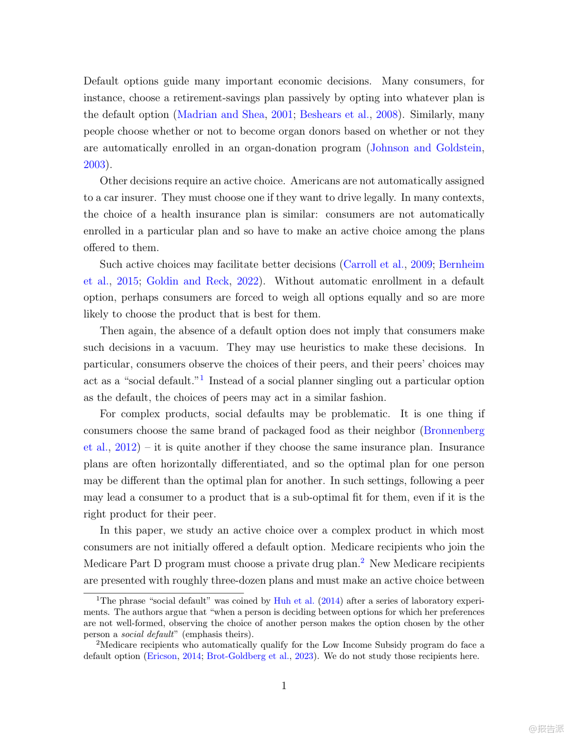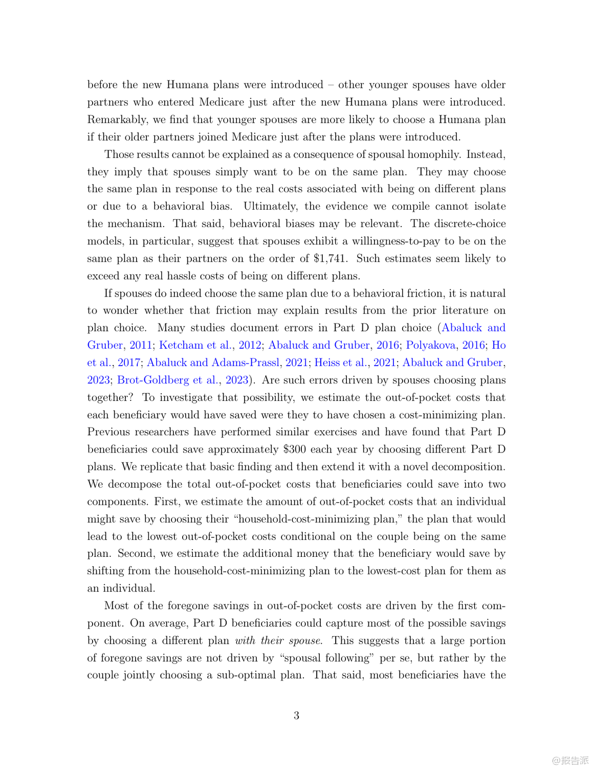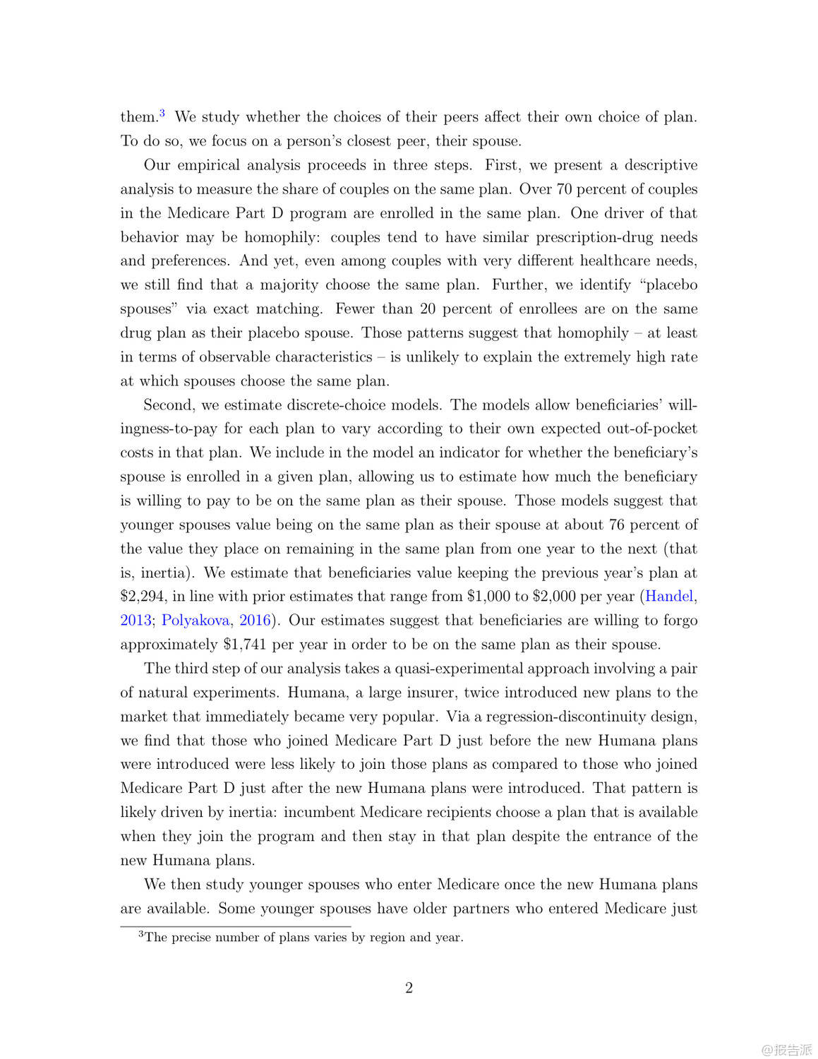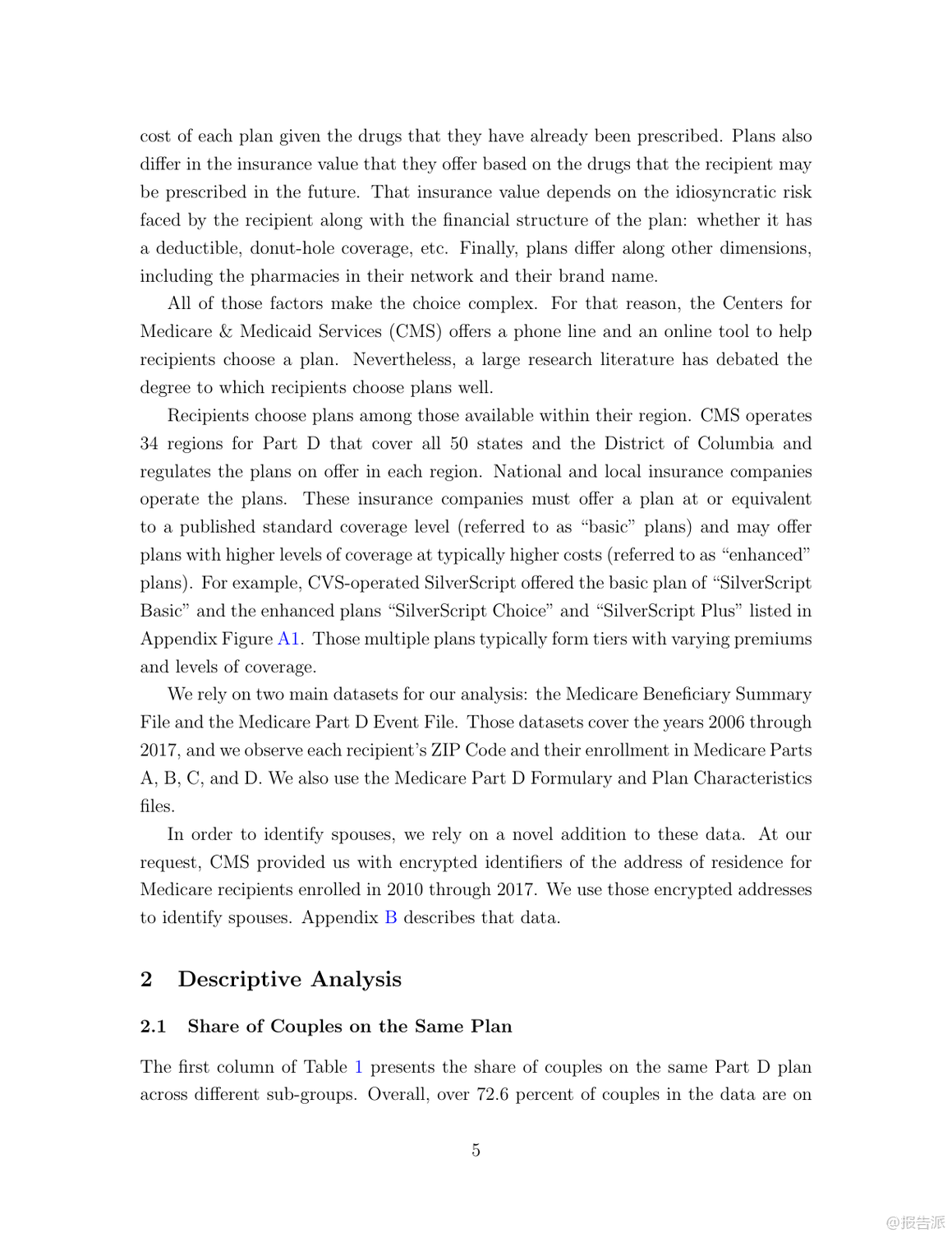 | 一项由世界银行发布的最新研究揭示了美国老年夫妇在选择联邦医疗保险D部分(Medicare Part D)处方药保险计划时的显著行为模式——超过七成的参保者选择了与配偶相同的保险计划,即便双方的医疗需求存在明显差异。 这项名为《社会默认与计划选择:配偶追随案例》的研究通过分析2006至2017年间约20%的Medicare受益人数据发现,这种“配偶追随”现象普遍存在且影响深远。 研究人员首先进行了描述性统计分析,结果显示整体上有72.6%的夫妻选择了同一药物保险计划。 即使是在健康状况差异较大的夫妻中——例如一方患有慢性病而另一方没有——仍有近七成的人选择相同计划。 为了排除“同质性偏好”(homophily)的影响,团队构建了“安慰剂配偶”对照组,即基于年龄、种族、收入等可观测特征匹配的非真实伴侣,结果发现这些虚拟配对中仅有不到20%的人选择了同一计划,进一步证明了真实婚姻关系对决策的强大影响力。 研究第二阶段采用离散选择模型估算配偶一致性的价值。 结果表明,参保人愿意每年支付高达约1,741美元来与配偶保持在同一保险计划内。 这一金额相当于他们前一年所选计划惯性价值(inertia value)的76%,远超基本计划平均年保费(约360美元),说明情感或心理因素可能压倒经济理性。 第三部分采用了回归断点设计(RDD)进行准实验分析,聚焦于Humana公司在2011年和2014年推出的低价沃尔玛品牌新计划。 数据显示,若年长配偶在新计划推出后立即加入Medicare,则其年轻配偶也更倾向于选择该计划;反之则不然。 这表明年轻配偶的选择受到年长配偶初始环境的显著影响,而非共同偏好的结果。 最后,研究对联合选单造成的超额支出进行了分解。 虽然大多数节省可通过夫妻共同选择最优家庭计划实现,但对于约38%的家庭而言,个人最优计划与家庭最优不一致,此时坚持共用计划将导致人均多支出数百至上千美元。 特别是“被主导方”配偶,若单独选计划可额外节省高达87%的成本。 综上所述,该研究表明社会默认选项——尤其是配偶的选择——在复杂保险决策中扮演关键角色,可能导致显著的资源配置低效。 政策制定者或可考虑引入个性化推荐系统或联合-独立双轨选择机制,以平衡便利性与经济效益。 出品方:世界银行 发布时间:2025年