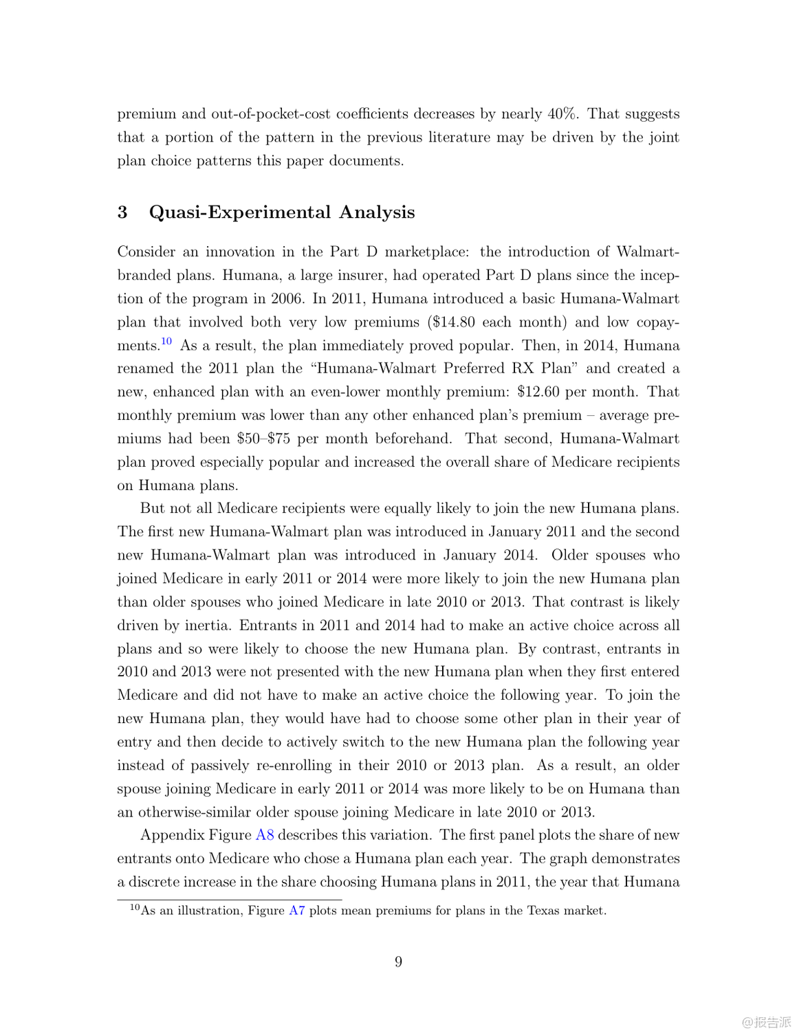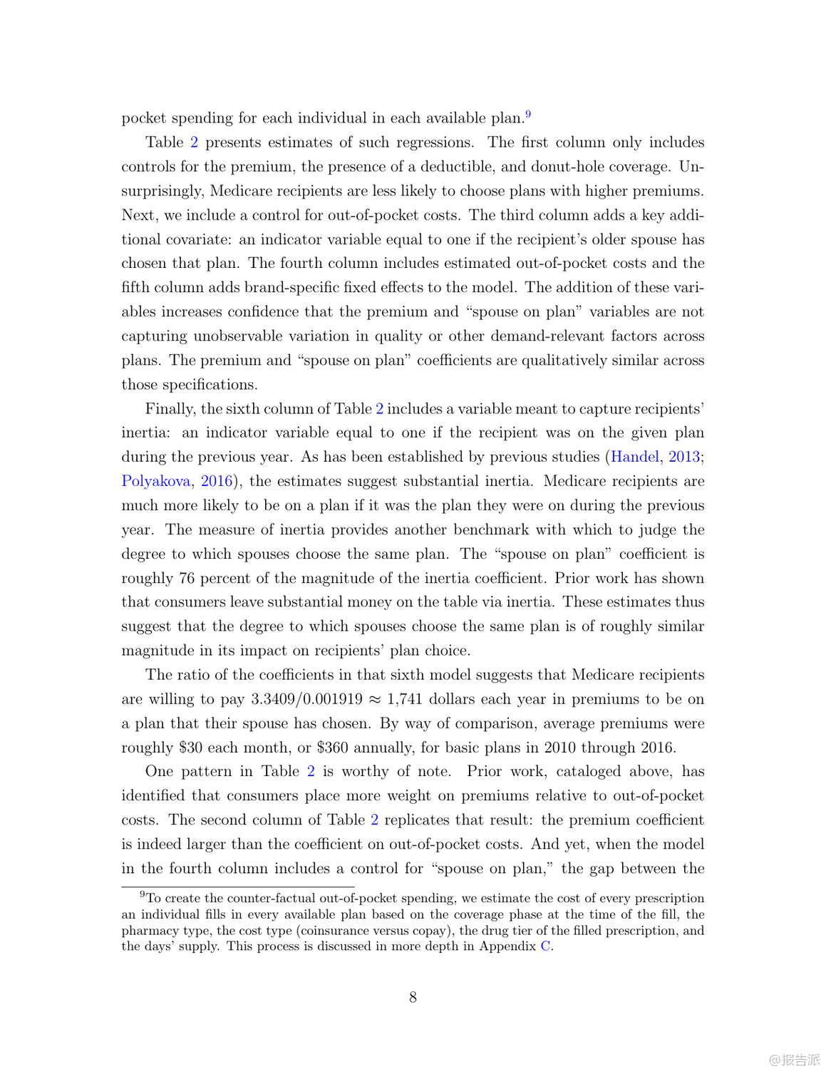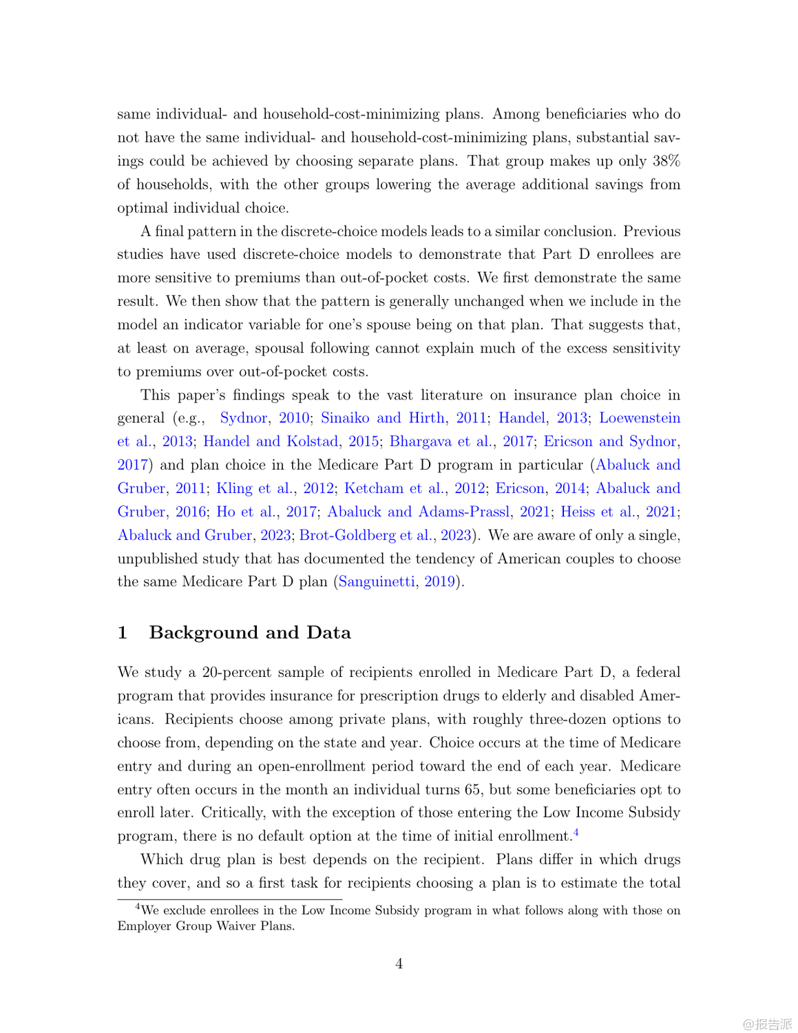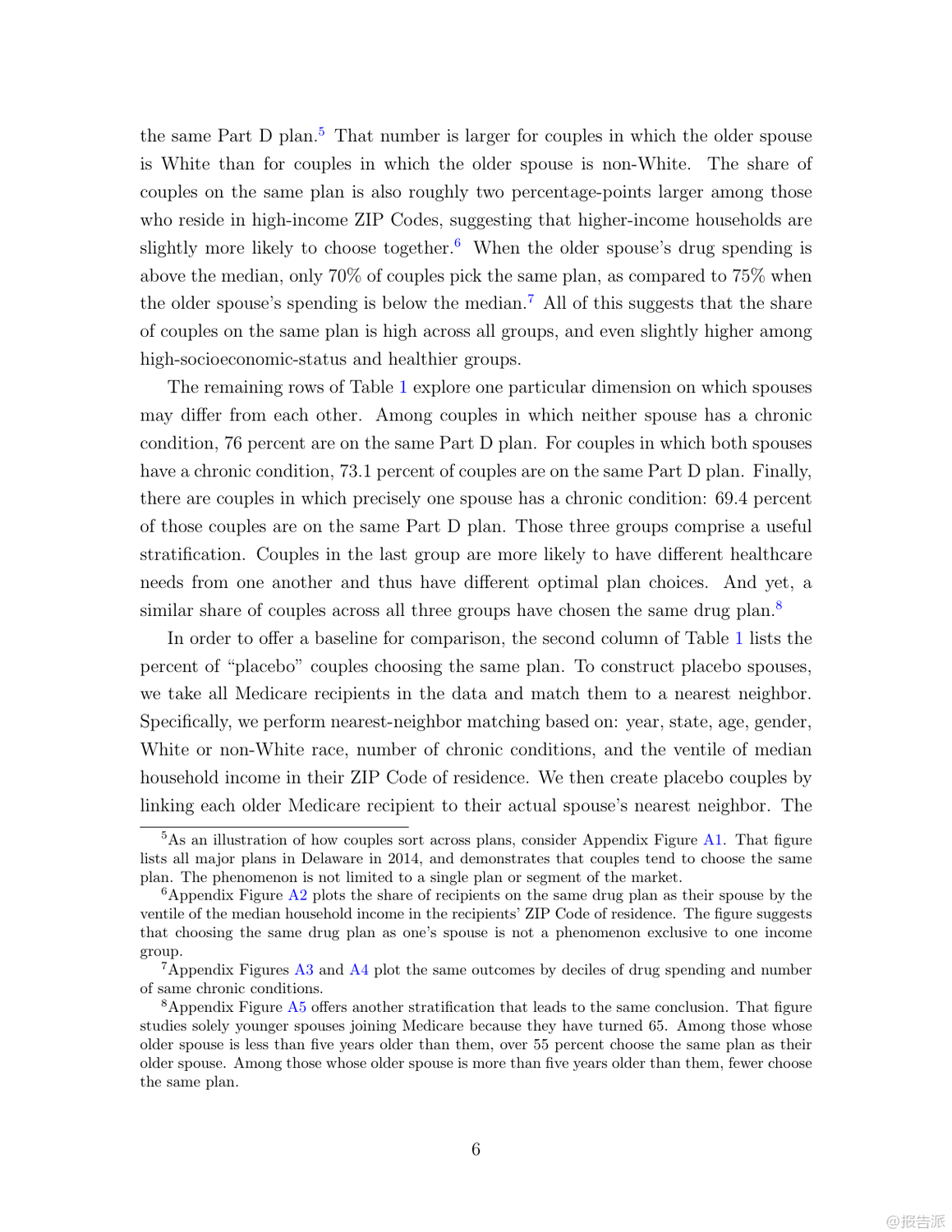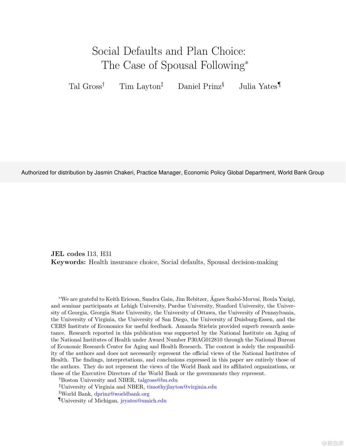 | 一项由世界银行发布的最新研究揭示了美国老年夫妇在选择联邦医疗保险D部分(Medicare Part D)处方药保险计划时的显著行为模式——超过七成的参保者选择了与配偶相同的保险计划,即便双方的医疗需求存在明显差异。 这项名为《社会默认与计划选择:配偶追随案例》的研究通过分析2006至2017年间约20%的Medicare受益人数据发现,这种“配偶追随”现象普遍存在且影响深远。 研究人员首先进行了描述性统计分析,结果显示整体上有72.6%的夫妻选择了同一药物保险计划。 即使是在健康状况差异较大的夫妻中——例如一方患有慢性病而另一方没有——仍有近七成的人选择相同计划。 为了排除“同质性偏好”(homophily)的影响,团队构建了“安慰剂配偶”对照组,即基于年龄、种族、收入等可观测特征匹配的非真实伴侣,结果发现这些虚拟配对中仅有不到20%的人选择了同一计划,进一步证明了真实婚姻关系对决策的强大影响力。 研究第二阶段采用离散选择模型估算配偶一致性的价值。 结果表明,参保人愿意每年支付高达约1,741美元来与配偶保持在同一保险计划内。 这一金额相当于他们前一年所选计划惯性价值(inertia value)的76%,远超基本计划平均年保费(约360美元),说明情感或心理因素可能压倒经济理性。 第三部分采用了回归断点设计(RDD)进行准实验分析,聚焦于Humana公司在2011年和2014年推出的低价沃尔玛品牌新计划。 数据显示,若年长配偶在新计划推出后立即加入Medicare,则其年轻配偶也更倾向于选择该计划;反之则不然。 这表明年轻配偶的选择受到年长配偶初始环境的显著影响,而非共同偏好的结果。 最后,研究对联合选单造成的超额支出进行了分解。 虽然大多数节省可通过夫妻共同选择最优家庭计划实现,但对于约38%的家庭而言,个人最优计划与家庭最优不一致,此时坚持共用计划将导致人均多支出数百至上千美元。 特别是“被主导方”配偶,若单独选计划可额外节省高达87%的成本。 综上所述,该研究表明社会默认选项——尤其是配偶的选择——在复杂保险决策中扮演关键角色,可能导致显著的资源配置低效。 政策制定者或可考虑引入个性化推荐系统或联合-独立双轨选择机制,以平衡便利性与经济效益。 出品方:世界银行 发布时间:2025年