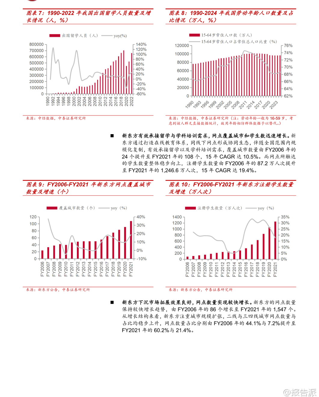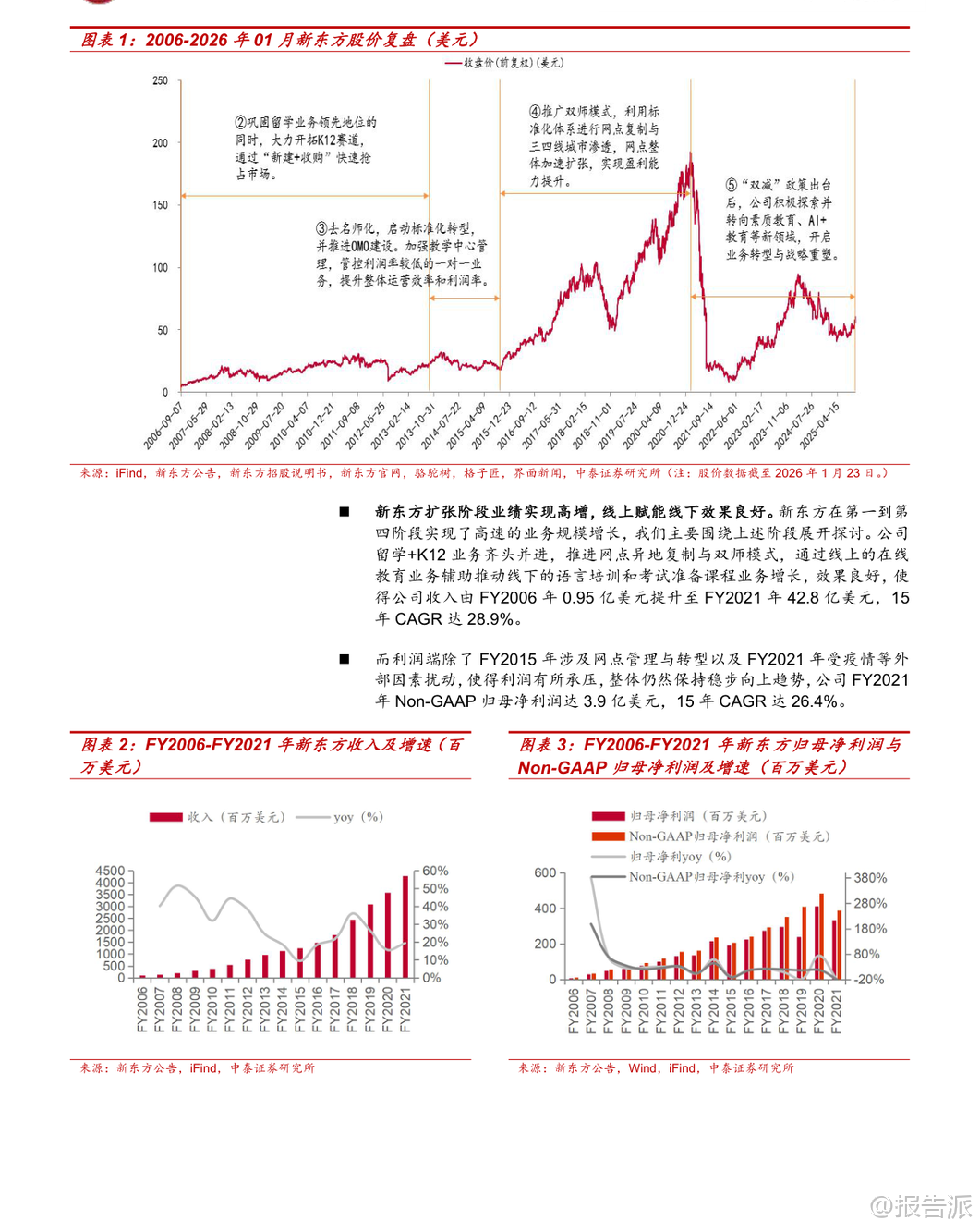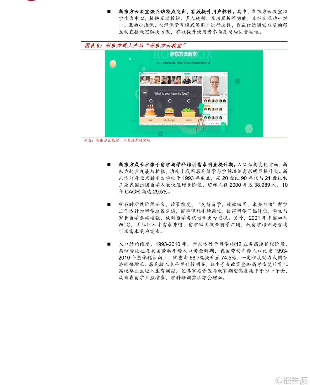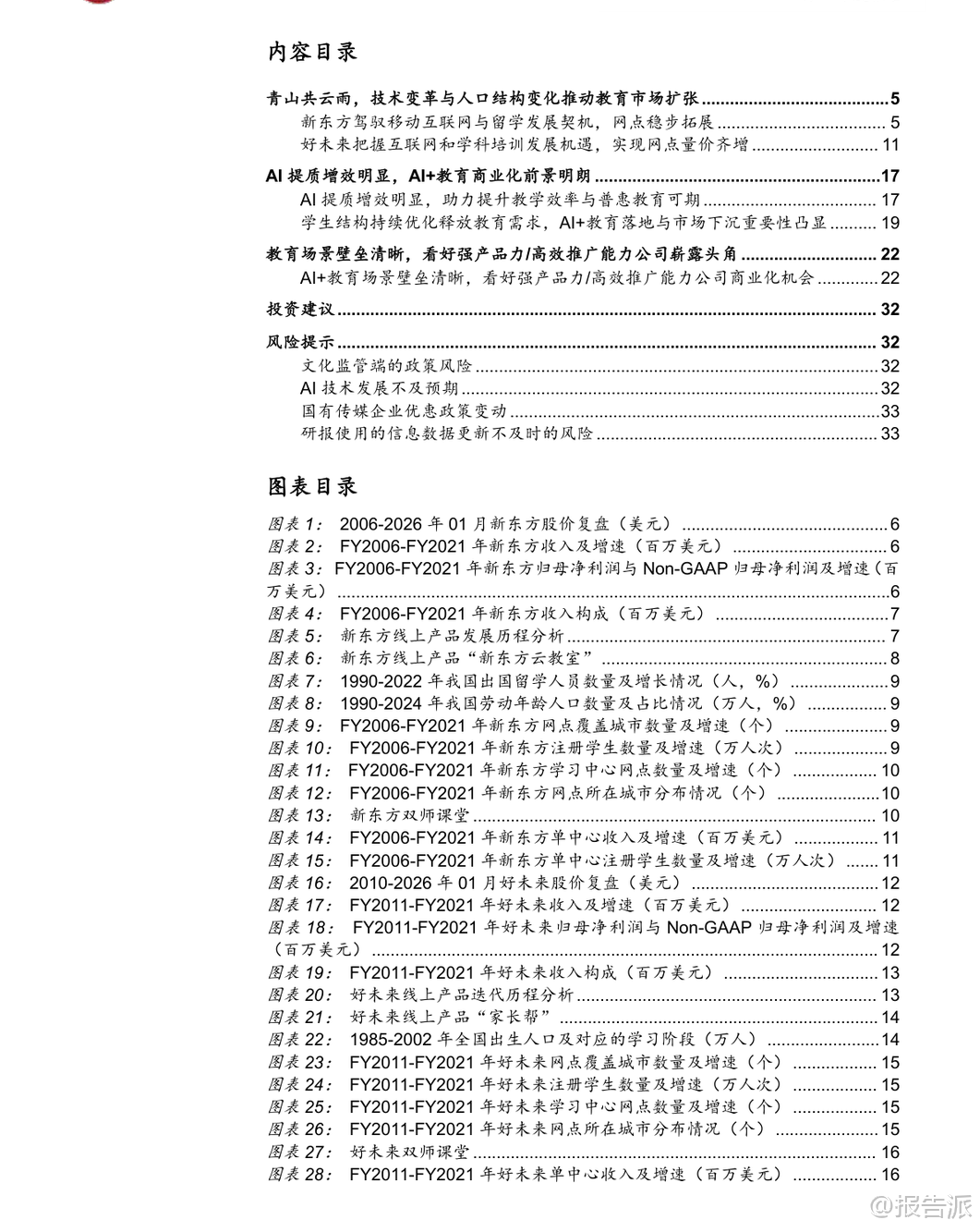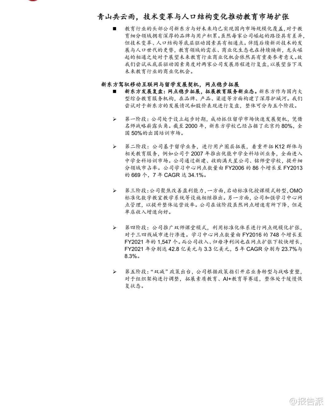 | 在人工智能与社会结构双重变革的交汇点上,教育行业的未来图景正被重新定义。 中泰证券最新发布的《复盘教育行业双龙头崛起之路:AI+教育深度报告》以新东方、好未来两大巨头的发展路径为镜,揭示了技术变革与人口结构变迁如何共同驱动教育市场扩张,并前瞻性地指出:AI+教育已进入商业化破局的关键阶段。 报告开篇即强调,教育行业的每一次跃迁,都离不开“技术”与“人口”两大底层驱动力。 回望过去,新东方抓住了移动互联网兴起与留学热潮的双重机遇,通过线下网点稳步扩张和OMO模式创新,在FY2006至FY2021年间实现了收入15年复合增长率达28.9%的惊人增长;而好未来则依托互联网红利与K12学科培训需求爆发,凭借双师课堂与标准化复制能力,实现10年CAGR高达44.8%的增长奇迹。 两者成功的核心逻辑,在于精准把握时代脉搏,将外部趋势转化为自身规模化发展的动能。 如今,这一历史逻辑正在被AI技术延续并升级。 当前通用大模型持续迭代,不仅在自然语言理解、数学推理等多维度基准测试中超越人类水平,更关键的是其长文本处理能力和成本效率显著提升。 例如,阿里云Qwen模型上下文窗口已达256K tokens,DeepSeek-OCR等技术可实现7-20倍token压缩率,大幅降低AI处理复杂教学材料的成本。 这意味着,过去受限于算力与成本难以普及的个性化教学服务——如作文批改、知识点精讲、学习路径规划——如今具备了大规模落地的可能性。 与此同时,我国K12学生结构虽面临总量波动,但非学科类培训与课后服务支出持续上升,2023年分别达到人均914元和279元,显示出家长对素质教育与学业支持的刚性需求。 叠加教育资源区域分布不均、优质师资稀缺等长期痛点,AI赋能教育的普惠价值愈发凸显。 政策层面也积极呼应,《新一代人工智能发展规划》《关于加强中小学人工智能教育的通知》等一系列文件出台,明确推动AI融入教学全环节,构建智能化新型教育体系。 然而,AI并非万能钥匙。 报告特别指出,教育场景高度分散且需求非标化,通用型AI工具难以满足个体差异。 真正具备竞争力的企业,必须建立“产品力+推广力”的双重护城河。 一方面,拥有深厚教研积累与学情数据壁垒的公司更具优势。 如松鼠Ai基于超4300万学生的行为数据训练智适应系统,实验证明其教学组优秀率显著高于传统班级;豆神教育依托大语文内容沉淀打造AI知识图谱与学伴机器人,实现从“对话”到“共情陪伴”的跨越;世纪天鸿的小鸿助教、粉笔的AI刷题系统班,则分别在教师备课与职业备考领域提供高精度解决方案。 另一方面,高效的渠道触达能力同样至关重要。 南方传媒依托覆盖广东全省的发行网络,将E听说、新华乐育等AI产品快速渗透至校园;新东方凭借全国1241个学习中心与4.1万名教师团队,将智慧学习机、AI1对1原版营等服务无缝嵌入线下场景;中原传媒则联合地方政府打造省级智慧教育平台,成为区域数字化转型的重要入口。 这些案例表明,AI+教育的胜利,属于那些既能打磨极致产品、又能高效连接用户的综合性玩家。 综合来看,AI对教育的影响不是替代,而是重构。 它降低了优质教育的服务门槛,提升了教学效率与公平性,催生出智能硬件、AI助教、自适应学习平台等多元商业模式。 报告最终建议关注三类企业:一是具备丰富垂类数据与强产品力的豆神教育、世纪天鸿、粉笔、好未来;二是拥有高效推广网络的新东方、南方传媒、中原传媒;三是背靠国有出版集团、区域渠道价值深厚的山东出版、凤凰传媒等。 尽管存在政策监管、技术演进不确定性等风险,但AI+教育的商业化前景明朗,一场由技术与人口双轮驱动的产业变革已然开启。 本文由【报告派】研读,输出观点仅作为行业分析! 原文标题:2026-01-24-中泰证券-中泰证券-复盘教育行业双龙头崛起之路:AI+教育深度报告:技术人口双轮驱动,AI+教育商业破局 发布时间:2026年 报告出品方:中泰证券
