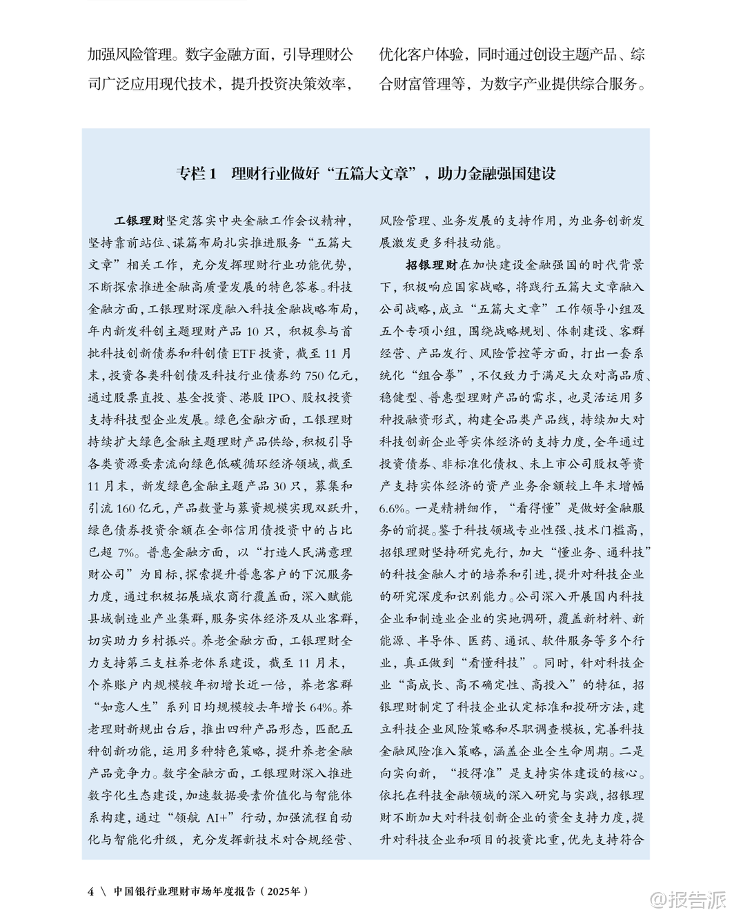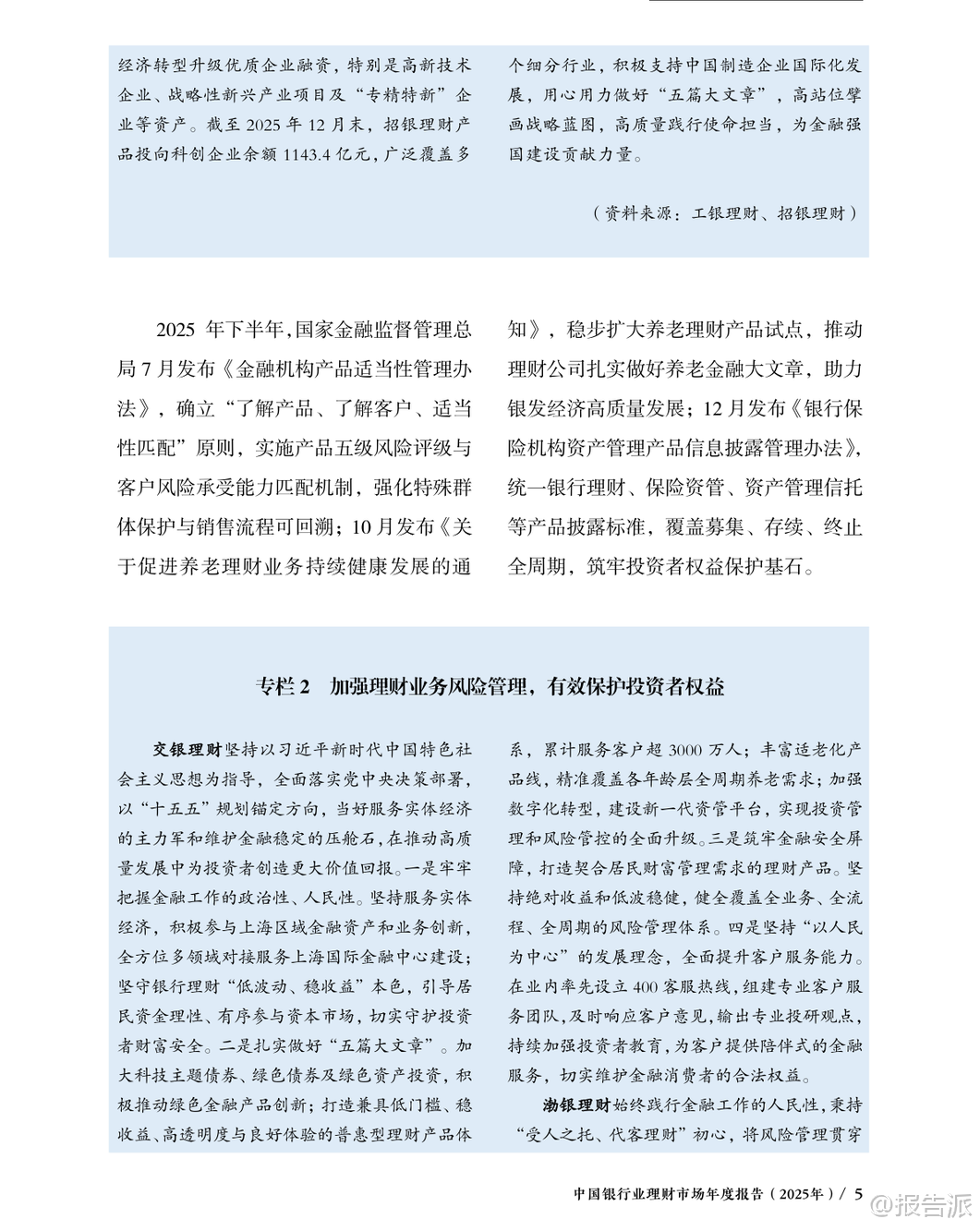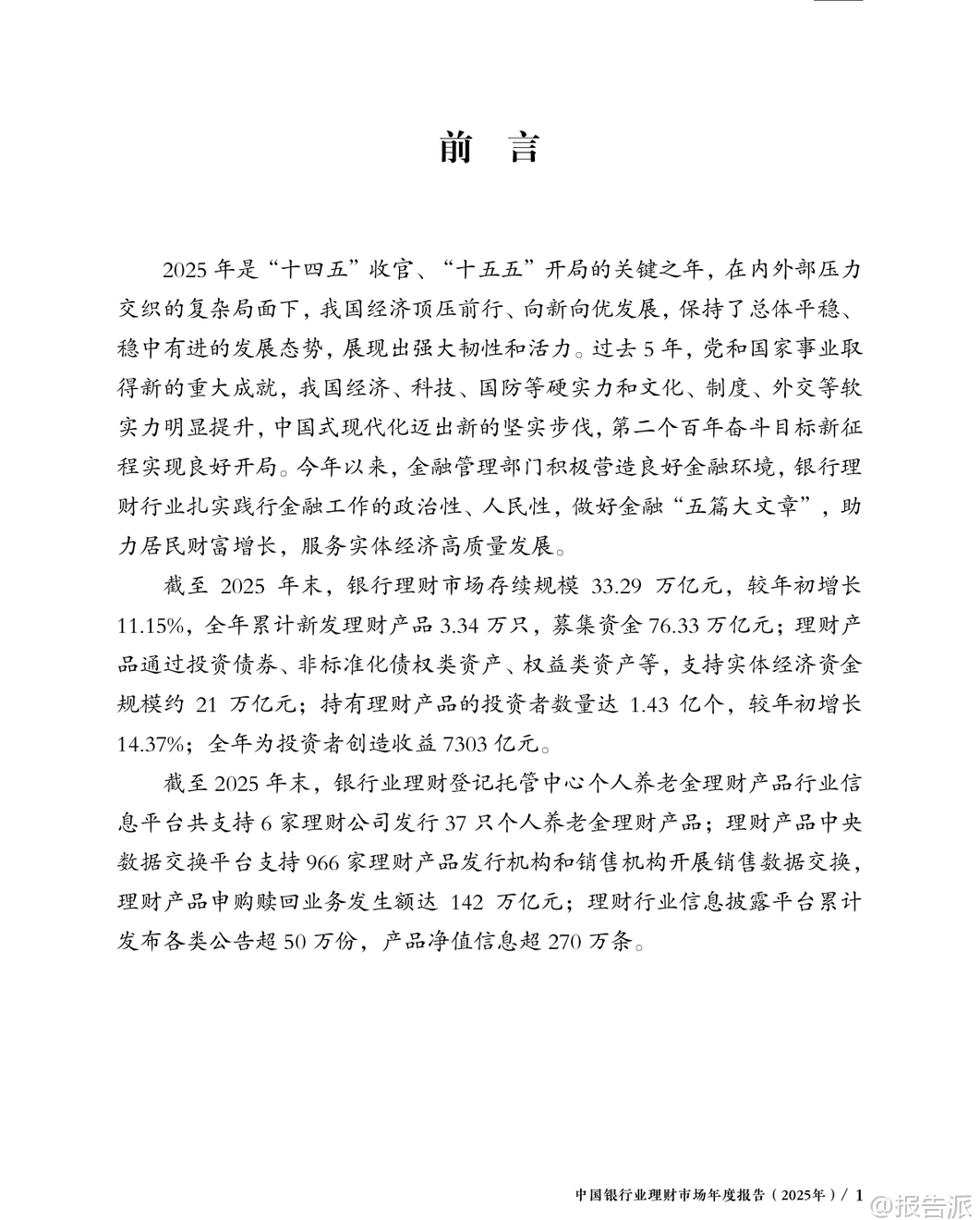 | 2025年是中国“十四五”收官与“十五五”开局的关键之年,面对复杂多变的国内外经济环境,中国银行业理财市场展现出强大的韧性与活力。 根据《中国银行业理财市场年度报告(2025年)》数据显示,截至2025年末,银行理财市场存续规模达33.29万亿元,较年初增长11.15%,全年累计新发理财产品3.34万只,募集资金76.33万亿元,为投资者创造收益7303亿元,同比增长2.87%。 这一系列数据不仅体现了理财市场的稳健发展态势,也反映出居民财富管理需求持续释放、金融服务实体经济能力不断增强的趋势。 从机构类型看,理财公司已成为市场绝对主力。 截至2025年末,32家理财公司共存续产品3.37万只,规模达30.71万亿元,占全市场比重高达92.25%,同比增速达16.72%,远超银行机构-29.12%的负增长。 这表明资管新规过渡期结束后,银行理财子公司化、专业化运营格局已全面确立。 与此同时,投资者数量突破1.43亿个,较年初增长14.37%,其中个人投资者占比98.64%,仍是市场主导力量,且风险偏好以二级(稳健型)为主,显示出市场整体仍以低波动、稳收益为核心诉求。 在产品结构方面,固定收益类产品依然是主流,存续规模达32.32万亿元,占比97.09%;混合类、权益类和商品及金融衍生品类产品合计占比不足3%,显示市场仍处于稳健转型阶段。 但值得注意的是,含权策略正逐步深化,开放式产品中现金管理类产品规模为7.04万亿元,占比较年初下降3.69个百分点,反映监管引导下产品净值化转型持续推进。 封闭式产品中,一年期以上产品占比提升至70.87%,为资本市场提供了更多长期资金支持。 服务实体经济成效显著。 2025年,理财产品通过债券、非标债权、权益资产等渠道支持实体经济资金规模约21万亿元。 其中投向绿色债券超3800亿元,“一带一路”、区域发展、扶贫纾困等专项债券超1100亿元,支持中小微企业近5.4万亿元。 科技金融领域投资加速,多家理财公司通过科创债、股权投资基金等方式加大对高新技术、“专精特新”企业的支持力度,助力高水平科技自立自强。 养老金融成为新增长极。 截至2025年底,个人养老金理财产品行业信息平台已支持6家理财公司发行37只产品,投资者开户数达188.9万个,产品余额199.1亿元。 中银理财、苏银理财等机构积极布局“福”“吉”“禄”等品牌化养老产品线,推出分红机制、重疾提前赎回等功能,满足多元化养老需求。 华夏银行等正构建涵盖理财、保险、医养服务的综合养老生态体系。 数字化转型深入推进。 人工智能、大数据、云计算广泛应用于投研、风控、运营和服务环节。 浦银理财打造“智浦魔方”工作台与“智浦小鹿”数字助理,实现智能投研与风险预警;施罗德交银理财部署RPA机器人提升流程效率;贝莱德建信理财本地化部署大模型用于制度检索与文档处理。 中邮理财建立覆盖924项标准的企业级数据治理体系,夯实智能化基础。 合规与投资者保护持续强化。 2025年监管部门陆续出台《金融机构产品适当性管理办法》《银行保险机构资产管理产品信息披露管理办法》,明确“了解客户、了解产品、适当性匹配”原则,统一全周期披露标准。 银行业理财登记托管中心推动中央数据交换平台升级至V1.1版,支持966家机构开展数据交互,全年处理申赎金额达142万亿元,并建成中国理财网统一信息披露平台,累计发布公告超50万份、净值信息超270万条,切实保障投资者知情权。 总体来看,2025年中国银行业理财市场在规范中稳步发展,呈现出“机构专业化、产品多元化、服务实体化、运营数字化、监管精细化”的五大趋势。 未来,在“加快建设金融强国”战略指引下,围绕科技金融、绿色金融、普惠金融、养老金融、数字金融“五篇大文章”,银行理财有望进一步发挥连接居民财富与实体经济的桥梁作用,推动形成高质量发展的良性循环。 本文由【报告派】研读,输出观点仅作为行业分析! 原文标题:原文标题:中国银行业理财市场年度报告(2025年) 发布时间:2025年 报告出品方:理财中心 文档页数:49页