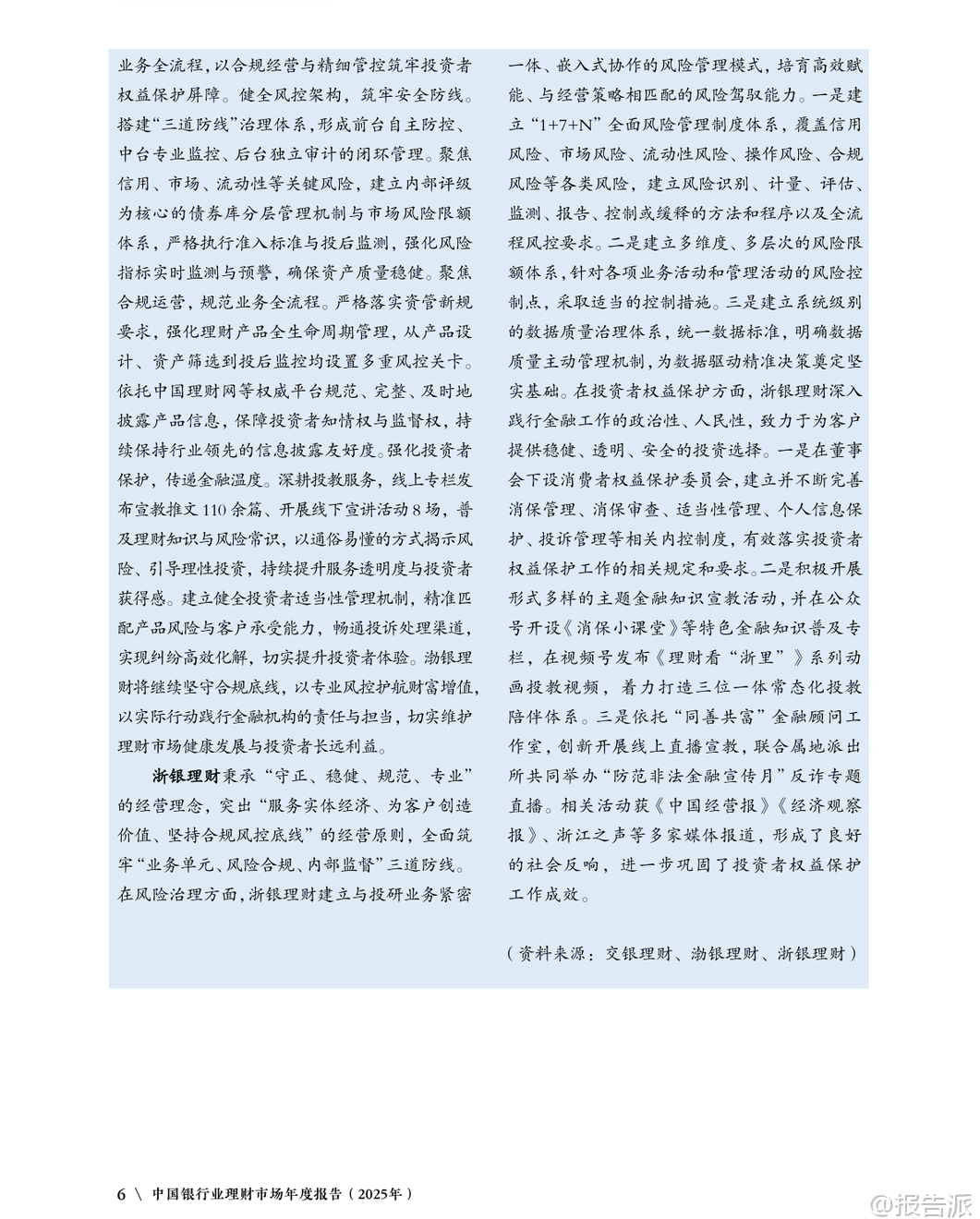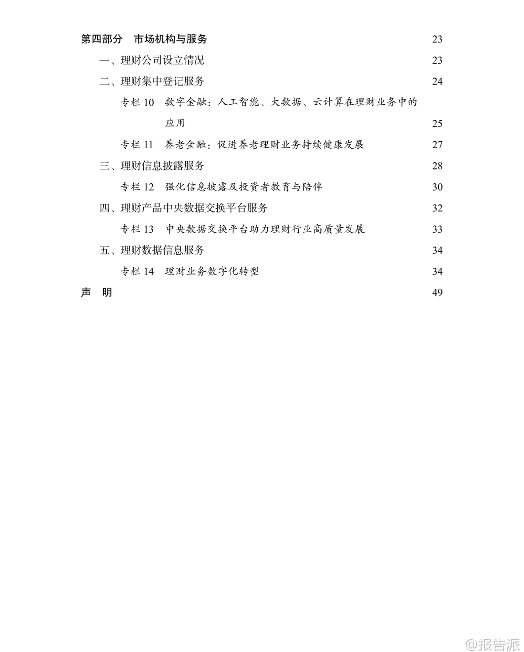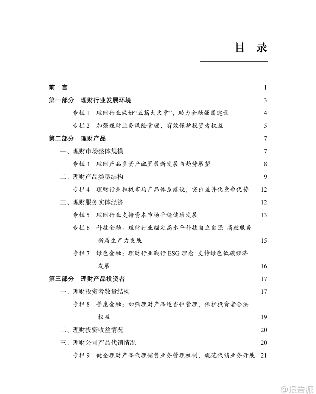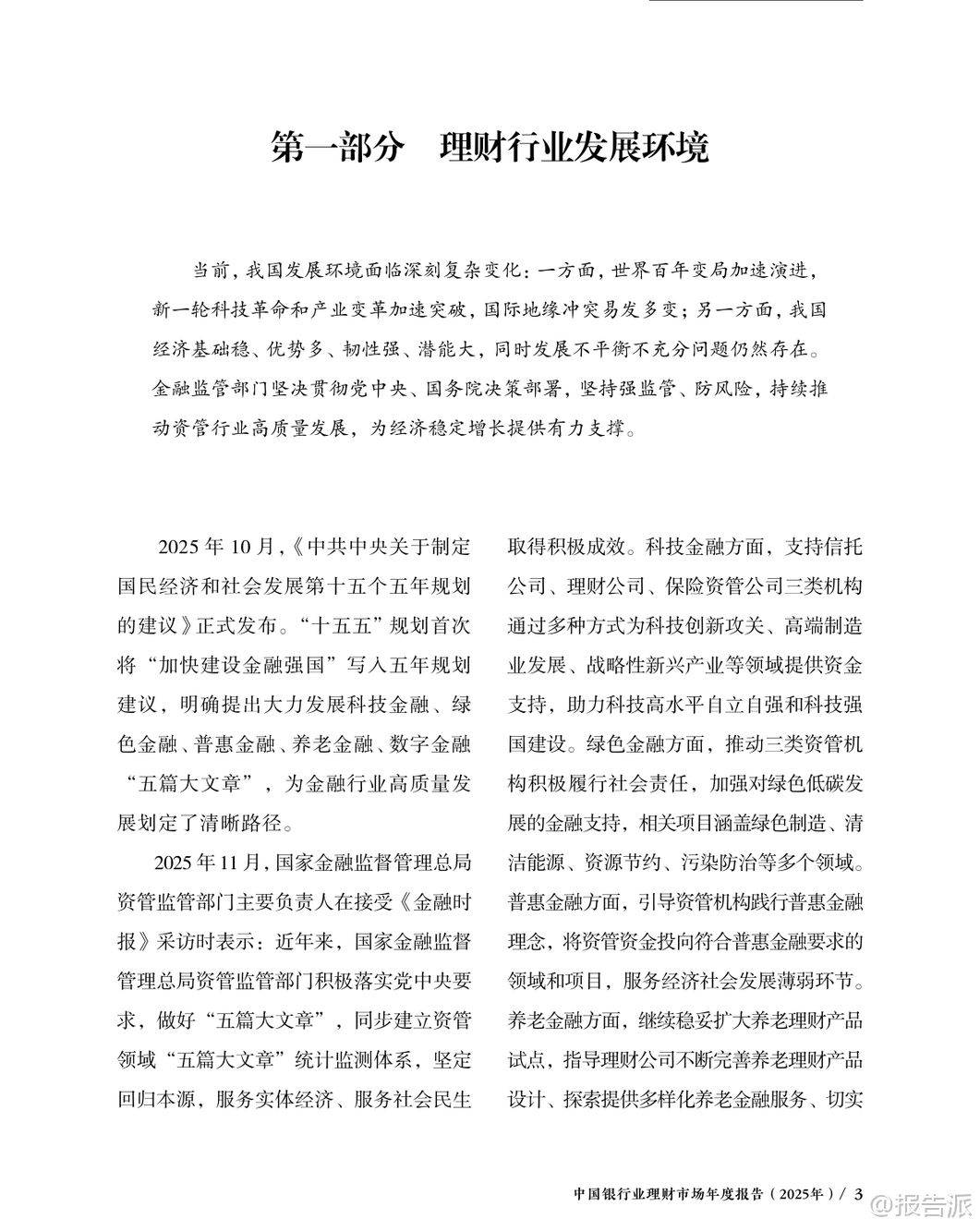 | 2025年是中国“十四五”收官与“十五五”开局的关键之年,面对复杂多变的国内外经济环境,中国银行业理财市场展现出强大的韧性与活力。 根据《中国银行业理财市场年度报告(2025年)》数据显示,截至2025年末,银行理财市场存续规模达33.29万亿元,较年初增长11.15%,全年累计新发理财产品3.34万只,募集资金76.33万亿元,为投资者创造收益7303亿元,同比增长2.87%。 这一系列数据不仅体现了理财市场的稳健发展态势,也反映出居民财富管理需求持续释放、金融服务实体经济能力不断增强的趋势。 从机构类型看,理财公司已成为市场绝对主力。 截至2025年末,32家理财公司共存续产品3.37万只,规模达30.71万亿元,占全市场比重高达92.25%,同比增速达16.72%,远超银行机构-29.12%的负增长。 这表明资管新规过渡期结束后,银行理财子公司化、专业化运营格局已全面确立。 与此同时,投资者数量突破1.43亿个,较年初增长14.37%,其中个人投资者占比98.64%,仍是市场主导力量,且风险偏好以二级(稳健型)为主,显示出市场整体仍以低波动、稳收益为核心诉求。 在产品结构方面,固定收益类产品依然是主流,存续规模达32.32万亿元,占比97.09%;混合类、权益类和商品及金融衍生品类产品合计占比不足3%,显示市场仍处于稳健转型阶段。 但值得注意的是,含权策略正逐步深化,开放式产品中现金管理类产品规模为7.04万亿元,占比较年初下降3.69个百分点,反映监管引导下产品净值化转型持续推进。 封闭式产品中,一年期以上产品占比提升至70.87%,为资本市场提供了更多长期资金支持。 服务实体经济成效显著。 2025年,理财产品通过债券、非标债权、权益资产等渠道支持实体经济资金规模约21万亿元。 其中投向绿色债券超3800亿元,“一带一路”、区域发展、扶贫纾困等专项债券超1100亿元,支持中小微企业近5.4万亿元。 科技金融领域投资加速,多家理财公司通过科创债、股权投资基金等方式加大对高新技术、“专精特新”企业的支持力度,助力高水平科技自立自强。 养老金融成为新增长极。 截至2025年底,个人养老金理财产品行业信息平台已支持6家理财公司发行37只产品,投资者开户数达188.9万个,产品余额199.1亿元。 中银理财、苏银理财等机构积极布局“福”“吉”“禄”等品牌化养老产品线,推出分红机制、重疾提前赎回等功能,满足多元化养老需求。 华夏银行等正构建涵盖理财、保险、医养服务的综合养老生态体系。 数字化转型深入推进。 人工智能、大数据、云计算广泛应用于投研、风控、运营和服务环节。 浦银理财打造“智浦魔方”工作台与“智浦小鹿”数字助理,实现智能投研与风险预警;施罗德交银理财部署RPA机器人提升流程效率;贝莱德建信理财本地化部署大模型用于制度检索与文档处理。 中邮理财建立覆盖924项标准的企业级数据治理体系,夯实智能化基础。 合规与投资者保护持续强化。 2025年监管部门陆续出台《金融机构产品适当性管理办法》《银行保险机构资产管理产品信息披露管理办法》,明确“了解客户、了解产品、适当性匹配”原则,统一全周期披露标准。 银行业理财登记托管中心推动中央数据交换平台升级至V1.1版,支持966家机构开展数据交互,全年处理申赎金额达142万亿元,并建成中国理财网统一信息披露平台,累计发布公告超50万份、净值信息超270万条,切实保障投资者知情权。 总体来看,2025年中国银行业理财市场在规范中稳步发展,呈现出“机构专业化、产品多元化、服务实体化、运营数字化、监管精细化”的五大趋势。 未来,在“加快建设金融强国”战略指引下,围绕科技金融、绿色金融、普惠金融、养老金融、数字金融“五篇大文章”,银行理财有望进一步发挥连接居民财富与实体经济的桥梁作用,推动形成高质量发展的良性循环。 本文由【报告派】研读,输出观点仅作为行业分析! 原文标题:原文标题:中国银行业理财市场年度报告(2025年) 发布时间:2025年 报告出品方:理财中心 文档页数:49页