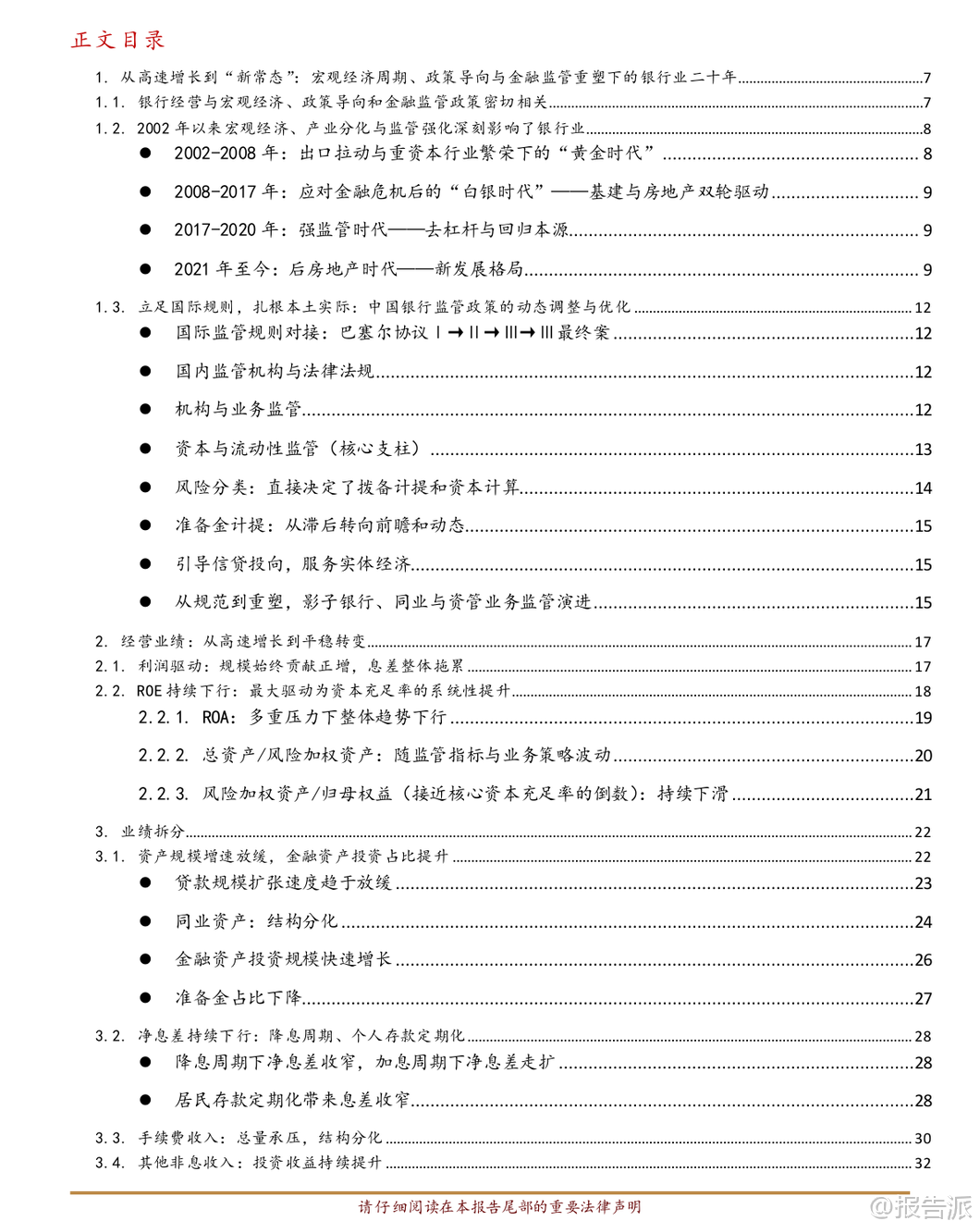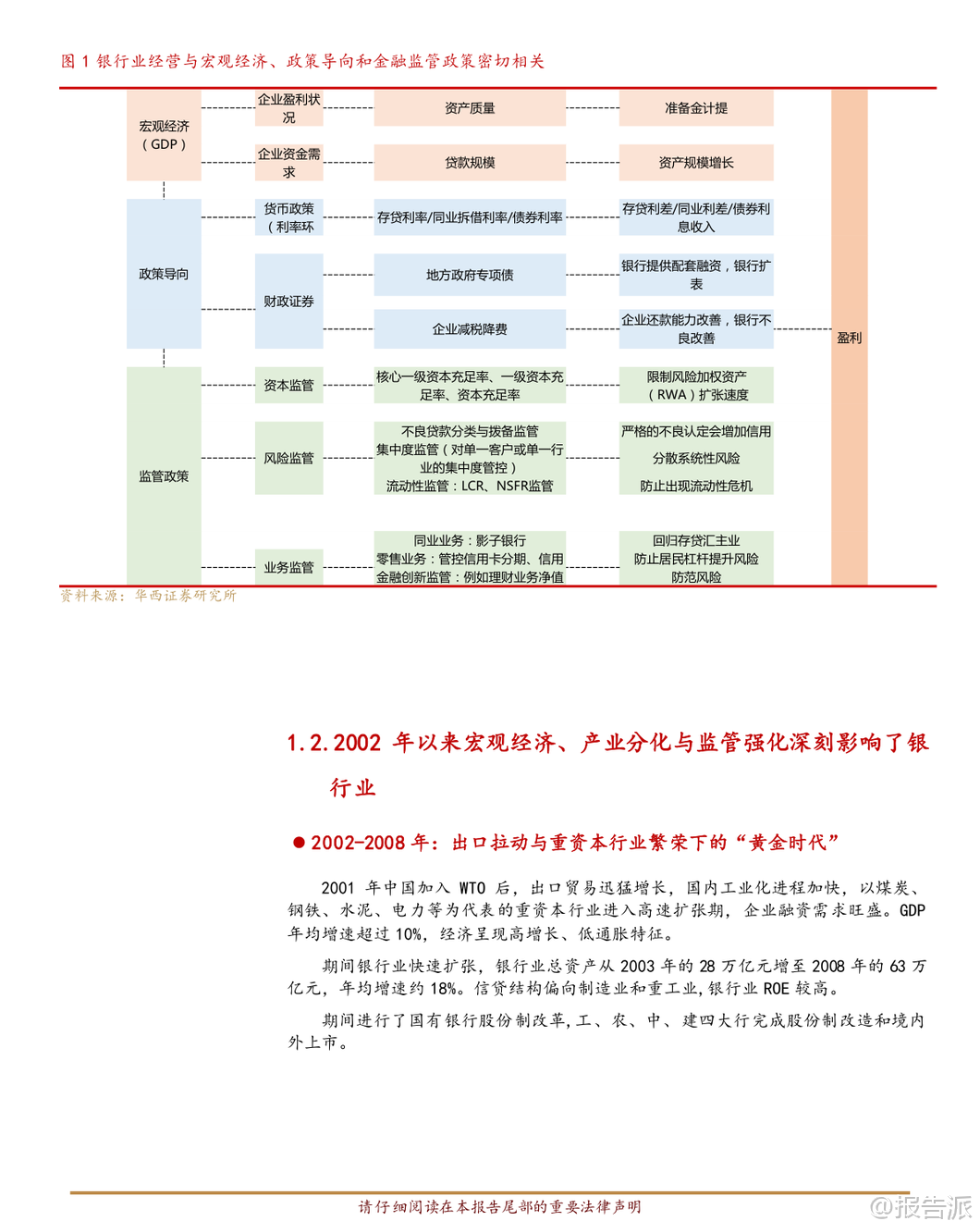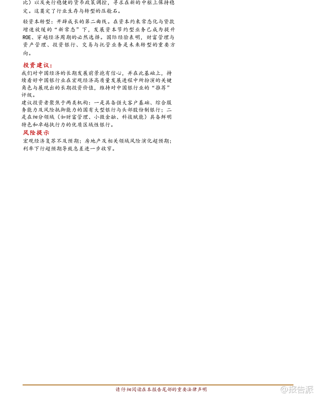 | 中国银行业正经历一场深刻的历史性转型,从过去依赖规模扩张的“黄金时代”,迈入以价值创造为核心的“新常态”。 这份由华西证券发布的深度研究报告,系统回顾了中国银行业近二十多年的发展历程,并通过与美国、欧洲、日本等主要经济体银行业的对比分析,揭示了当前行业所处的阶段、面临的挑战以及未来的战略方向。 报告指出,尽管近年来中国银行业的净资产收益率(ROE)进入阶段性下行区间,目前约为9.50%,在全球主要经济体中仍处于中上水平,且历史波动最小,体现出极强的经营韧性和稳定性。 然而,这一下行趋势背后反映出驱动增长的核心动能已发生根本转变。 杜邦分解显示,资本约束趋严(RWA/Equity下降)是ROE下滑的首要原因,其次则是净息差持续收窄导致的资产回报率(ROA)降低。 这意味着依靠高杠杆和利差红利的时代已经结束,行业彻底告别了过去的“规模驱动”模式。 在经营模式方面,报告强调中国银行业对净利息收入的依赖度高达39.92%,远高于国际同业,而作为现代金融中介核心能力体现的手续费及佣金收入占比仅为7.40%,明显偏低。 这种收入结构的失衡不仅限制了盈利的多样性,也暴露了在财富管理、投资银行、交易服务等高端金融服务领域的短板。 相比之下,美国银行业展现出“全能型”特征:依托长期经济增长、较高的净息差以及多元均衡的收入结构(尤其在财富管理和投行业务表现强劲),实现了高且稳定的盈利能力。 其高管理费率投入支撑了专业能力建设,形成了“高投入—高回报”的良性循环。 而欧洲与日本银行业则属于“适应型”模式,在长期低利率甚至负利率环境下,息差极度微薄。 为求生存,这些地区的银行普遍采取增持低风险权重资产(实现高Asset/RWA)、大力发展非息收入等方式应对,但整体盈利水平较低,增长乏力,难以形成有效突破。 中国银行业正处于从“规模驱动、利息主导”向“轻重平衡、多元驱动”的关键转型期,可称为“转型中的效率领先者”。 虽然在成本控制和利润率方面具备突出优势,但收入结构单一的问题亟待解决。 未来必须在稳固宏观经济基本盘的同时,全力突破中间业务收入的“天花板”。 展望未来,中国银行业的发展路径将在宏观经济走势、监管政策导向与自身转型节奏的共同作用下展开,核心是从传统的“规模银行”迈向现代化的“价值银行”。 宏观与息差层面,将构筑稳健的基本盘。 银行业与实体经济共生共荣的关系不会改变。 在经济高质量发展和现代化产业体系建设过程中,围绕科技创新、绿色低碳、普惠金融、养老金融等领域的信贷需求将成为新的增长点。 尽管净息差面临持续下行压力,但通过负债端成本的有效管控、资产端结构的优化调整(如提高科技、绿色、普惠贷款占比),以及央行稳健的货币政策支持,息差有望在新的中枢水平上保持相对稳定,成为行业转型的压舱石。 轻资本转型则被视为开辟成长“第二曲线”的关键。 在资本约束常态化与贷款增速放缓的新常态下,发展资本节约型业务已成为提升ROE、穿越经济周期的必然选择。 国际经验表明,财富管理与资产管理、投资银行、交易银行及托管业务将是未来转型的重要方向。 这些业务不仅能带来稳定的非息收入,还能增强客户黏性,提升综合服务能力。 投资建议方面,报告对中国经济的长期发展前景保持信心,并在此基础上持续看好银行业的长期投资价值,维持“推荐”评级。 建议投资者重点关注两类机构:一是具备强大客户基础、全面综合服务能力以及较强风险抵御能力的国有大型银行和头部股份制银行;二是在细分领域如财富管理、小微金融、科技赋能等方面拥有鲜明特色和卓越执行力的优质区域性银行。 当然,风险也不容忽视。 主要包括:宏观经济复苏不及预期可能影响资产质量和信贷需求;房地产及相关领域潜在风险若演化超预期,将对银行资产质量构成冲击;此外,利率进一步快速下行可能导致息差再度收窄,加剧盈利压力。 总体来看,中国银行业正站在新旧动能转换的关键节点。 过去的高速增长模式难以为继,未来的竞争力将更多体现在精细化管理、差异化服务、创新驱动和价值创造能力上。 谁能率先完成从“规模扩张”到“价值创造”的跨越,谁就能在下一个周期中占据主动,赢得未来。 本文由【报告派】研读,输出观点仅作为行业分析! 原文标题:原文标题:从规模扩张到价值创造:中国银行业二十年演进与中外模式比较——基于“黄金时代”到“新常态”的基本面深度复盘 发布时间:2026年 报告出品方:华西证券
