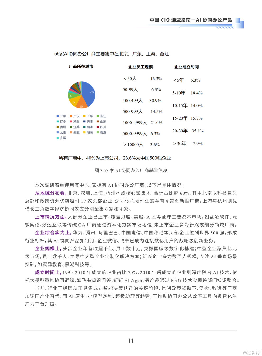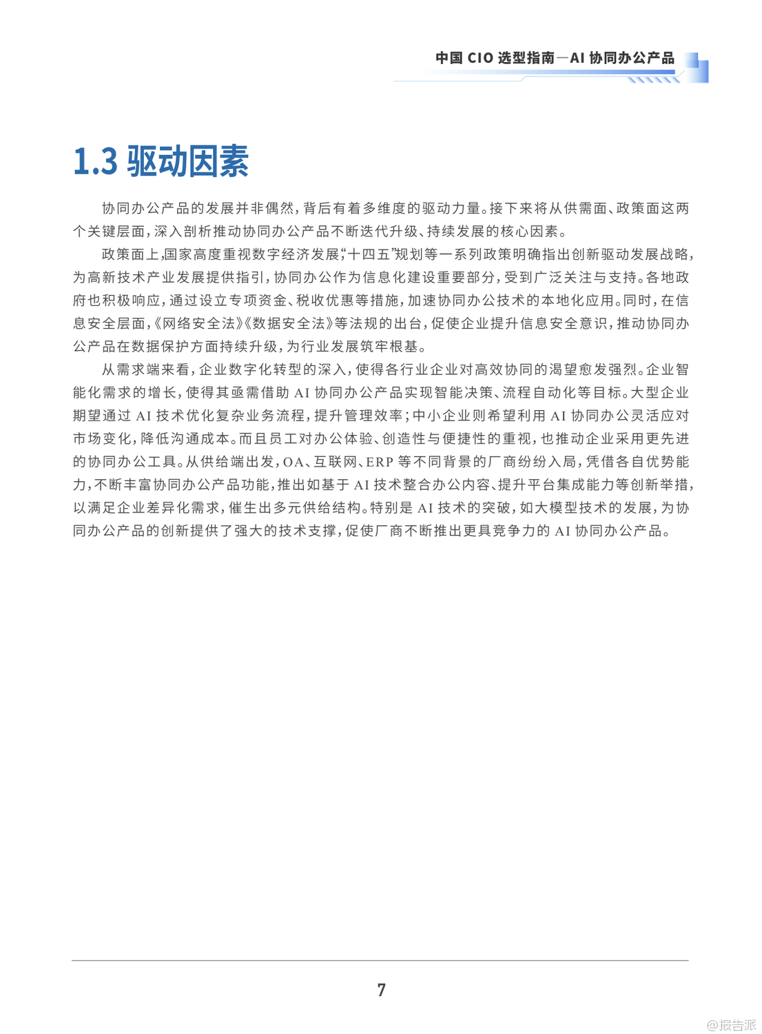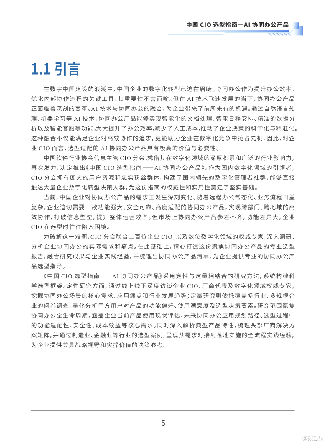 | 在数字化浪潮席卷各行各业的今天,AI与协同办公的深度融合正成为企业提效增能的关键突破口。 由中国软件行业协会CIO分会联合多家权威机构发布的《2025年中国CIO选型指南——AI协同办公产品》,为全国企业CIO提供了一份极具实操价值的选型参考。 该报告基于对118家企业的调研数据与55家AI协同办公厂商的深度分析,系统梳理了当前AI协同办公的发展现状、核心价值、应用场景及未来趋势,构建起一套科学完整的选型体系。 报告显示,沟通协作(82%)、文档协作(76%)和在线会议(63%)是企业使用频率最高的三大功能模块,反映出企业在远程协作、信息同步与高效沟通方面的强烈需求。 与此同时,73%的企业愿意为AI功能付费,尤其青睐深度AI辅助决策、自动化流程与智能数据分析等功能。 AI协同办公已不仅仅是效率工具,更是推动企业数字化转型的核心引擎——80%的企业认为其显著提升了协作效率,77%的企业认同其加速了整体数字化进程。 然而,企业在应用过程中也面临多重挑战:60%的企业表示“场景多样协同难”,53%担忧“数据安全风险”,42%反映“应用割裂导致体验分散”。 这暴露出当前协同工具生态碎片化、系统集成度不高、安全管理机制不健全等现实痛点。 为此,报告明确提出未来AI协同办公将朝三大方向演进:一是向AI Agent与超级助理演进,实现任务自动拆解与智能执行;二是构建动态化生态整合平台,打破系统壁垒,实现跨平台数据联动;三是强化RPA与移动办公融合,推动“泛在化”智能协同。 在选型建议上,报告构建了涵盖产品功能、技术性能、安全性、价格优势、用户体验与服务支持六大维度的评估体系,并对钉钉、飞书、蓝凌、泛微等主流厂商进行了综合评级。 其中,钉钉、飞书、蓝凌等6家厂商获评“A级(卓越)”,展现出在AI能力、生态整合与行业适配上的领先优势。 报告特别强调,企业在选型时应坚持“业务场景驱动、安全合规托底、生态延展赋能”的原则,结合自身规模、行业属性与技术路线,优先考虑系统集成性、数据安全机制与供应商服务能力。 值得一提的是,三一集团与某大型央国企车企的落地案例表明,通过AI协同平台实现智能审批、多语言翻译、全球门户统一与智能培训等应用,不仅能显著提升跨国协作效率,还可缩短产品上市周期、降低运营成本,释放巨大商业价值。 可以预见,随着大模型、RPA与信创技术的持续演进,AI协同办公将从“工具协同”迈向“智能共生”的新阶段,成为企业构建敏捷组织、实现数智化转型的战略支点。 出品方:中国软件行业协会 发布时间:2025年 文档页数:49页