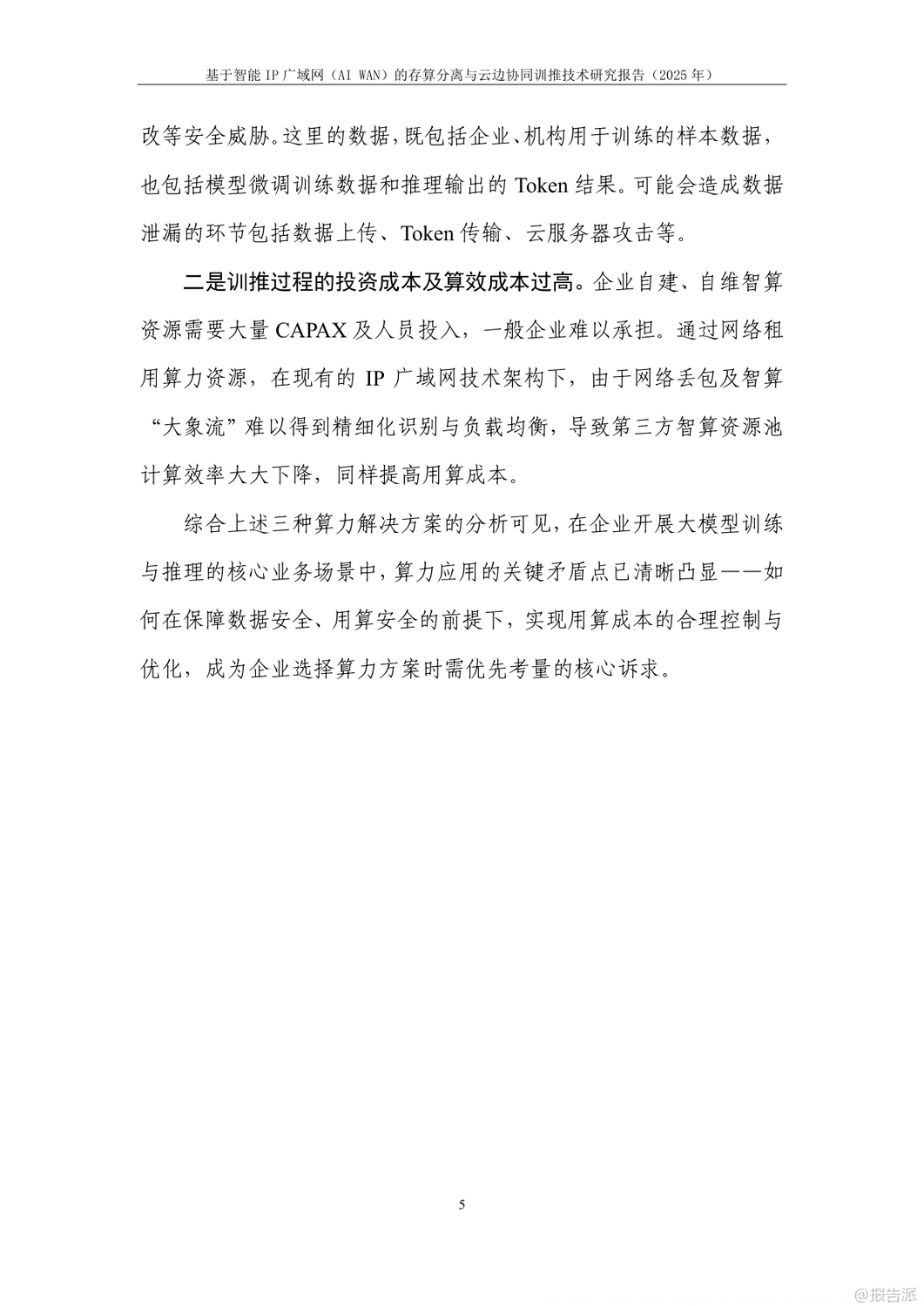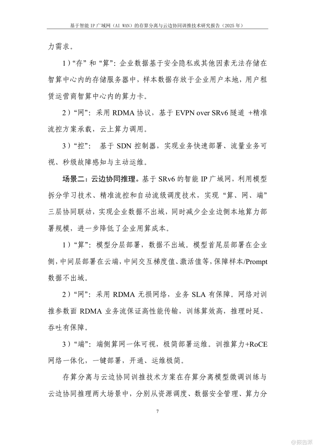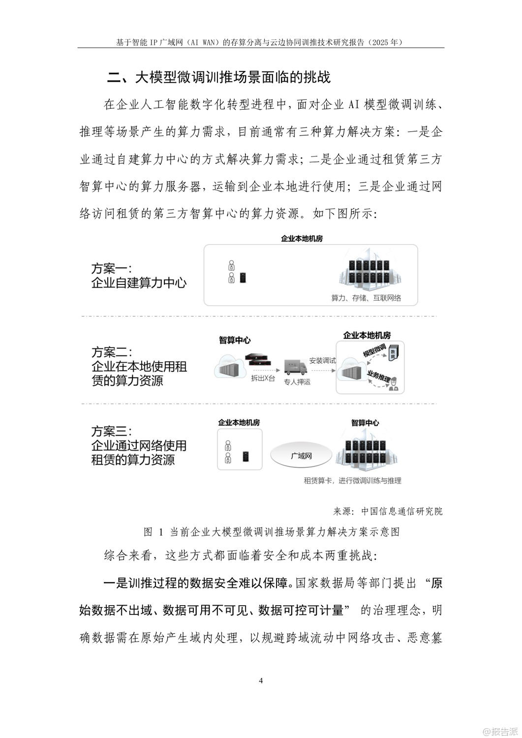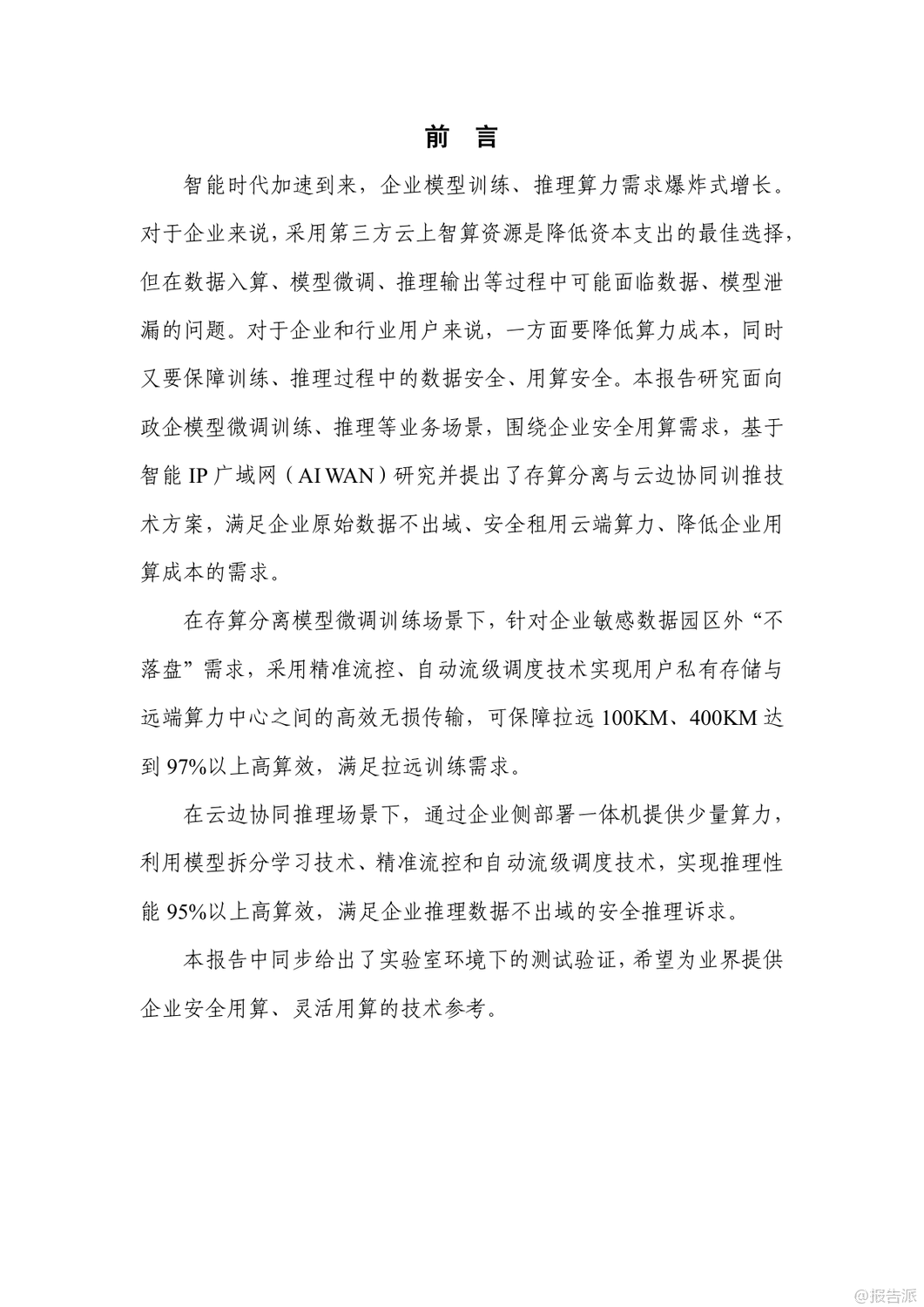 | 在人工智能加速发展的当下,企业对大模型训练与推理的算力需求呈爆发式增长。 然而,如何在保障数据安全的同时降低算力成本,成为政企用户面临的核心难题。 由中国信息通信研究院与华为联合发布的《基于智能IP广域网(AI WAN)的存算分离与云边协同训推技术研究报告(2025年)》正是针对这一矛盾提出系统性解决方案。 报告指出,当前企业AI训推主要依赖自建算力、租赁算力服务器搬至本地、或通过网络远程租用云端算力三种模式。 但这些方式普遍存在数据泄露风险高、投资成本大、网络传输效率低等问题。 尤其是在金融、政务、医疗等敏感行业,“原始数据不出域”已成为硬性合规要求。 为此,报告创新性地提出“存算分离+云边协同”的双轨技术路径。 在模型微调训练场景中,采用“存算分离”模式:企业本地保留数据存储,仅将训练过程中的中间结果通过智能IP广域网传输至远端算力中心进行计算。 结合精准流控与自动流级调度技术,即使在100公里乃至400公里的拉远距离下,仍可实现97%以上的高算效,真正做到“数据不落盘、不出域”。 而在推理场景中,则采用“云边协同”架构。 通过模型拆分学习技术,将大模型的首尾层部署在企业侧,中间计算密集层部署在云端。 网络中仅传输无法还原原始数据的高维向量,从根本上杜绝了数据泄露风险。 实验证明,在200公里拉远场景下,Qwen-32B模型推理算效劣化不超过5%,边侧算力利用率仅为4%,大幅降低了企业本地部署成本。 支撑这两大场景的核心技术包括三项:一是模型拆分学习,实现数据与模型的物理隔离;二是精准流控技术,基于SRv6与租户级反压机制,避免拥塞扩散,保障多租户业务稳定;三是自动流级调度技术,通过控制器实时感知大象流并动态调优路径,提升整网带宽利用率,降低企业用网成本。 实验室验证结果显示,在LLAMA2、Qwen、ResNet、DeepSeek等主流大模型上,该方案均能实现接近本地训练的算效表现,同时网络抓包证实云边协同模式下传输内容完全加密,安全性远超传统方案。 展望未来,该技术有望在医疗、金融、能源等高安全要求行业率先落地。 随着标准体系的建立和试点推广,智能IP广域网将成为连接企业数据与云端算力的安全高速通道,推动AI真正实现“可用、可信、可负担”的普惠化发展。 出品方:信通院 发布时间:2025年 文档页数:24页