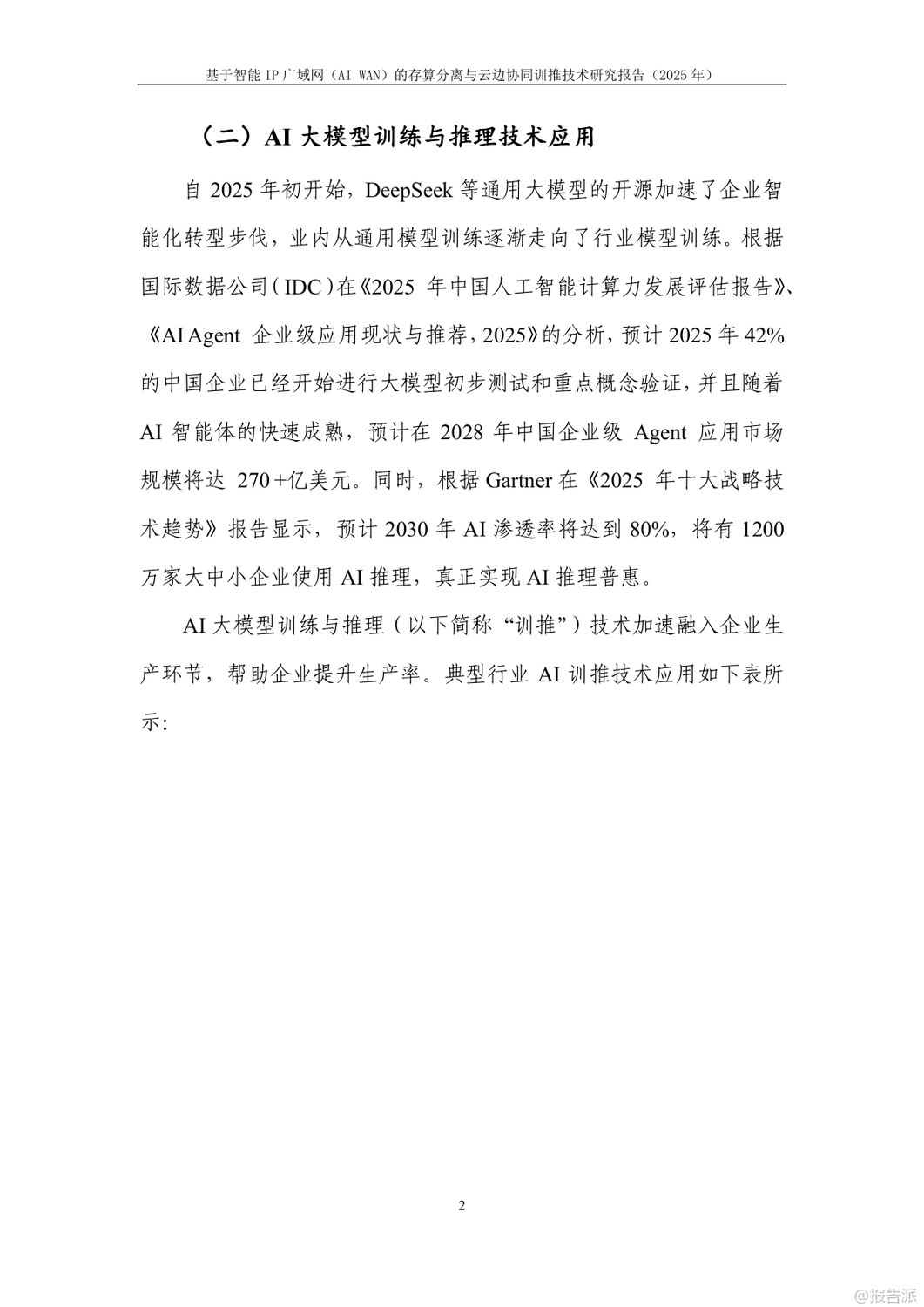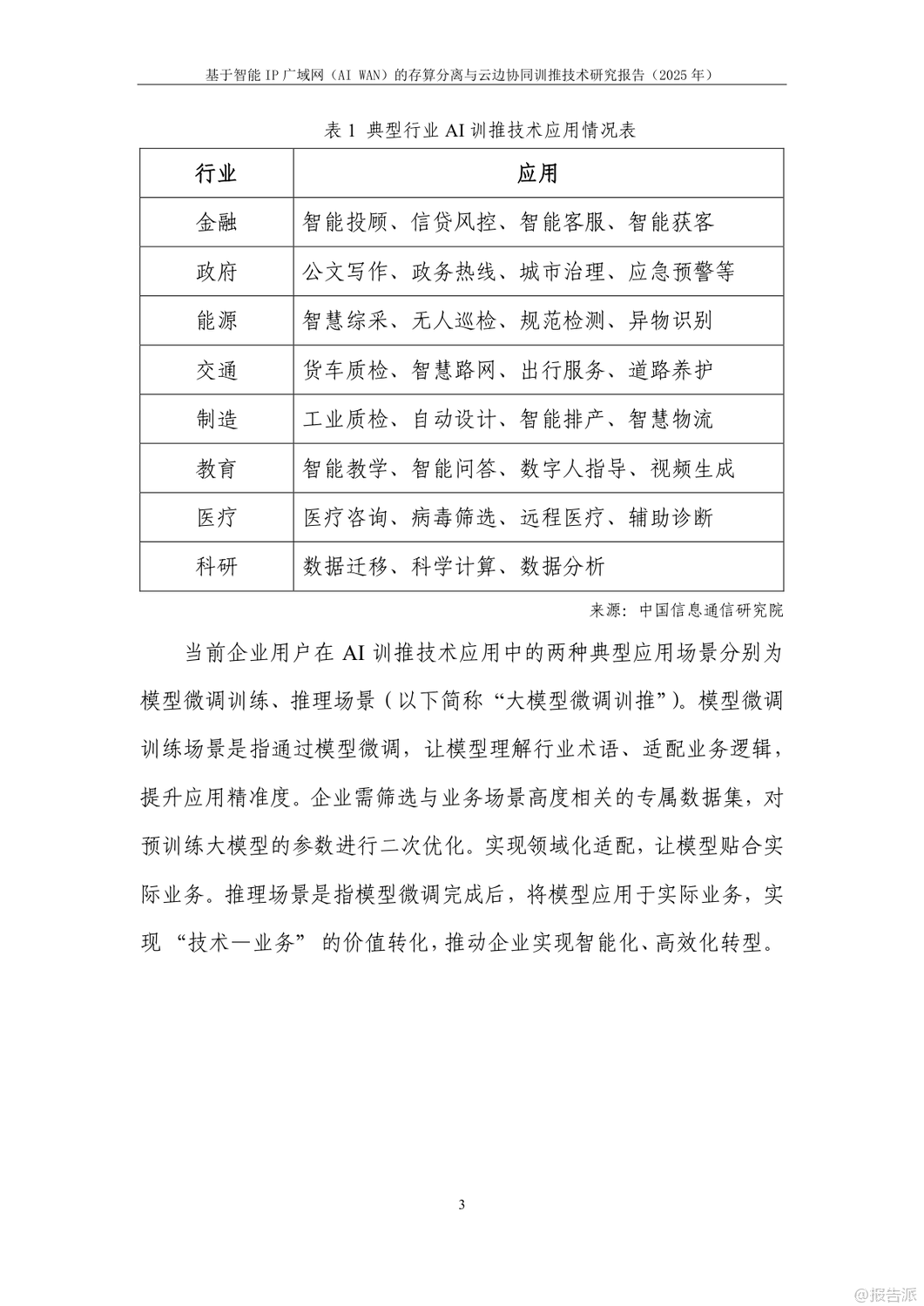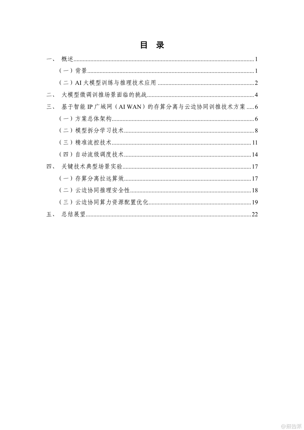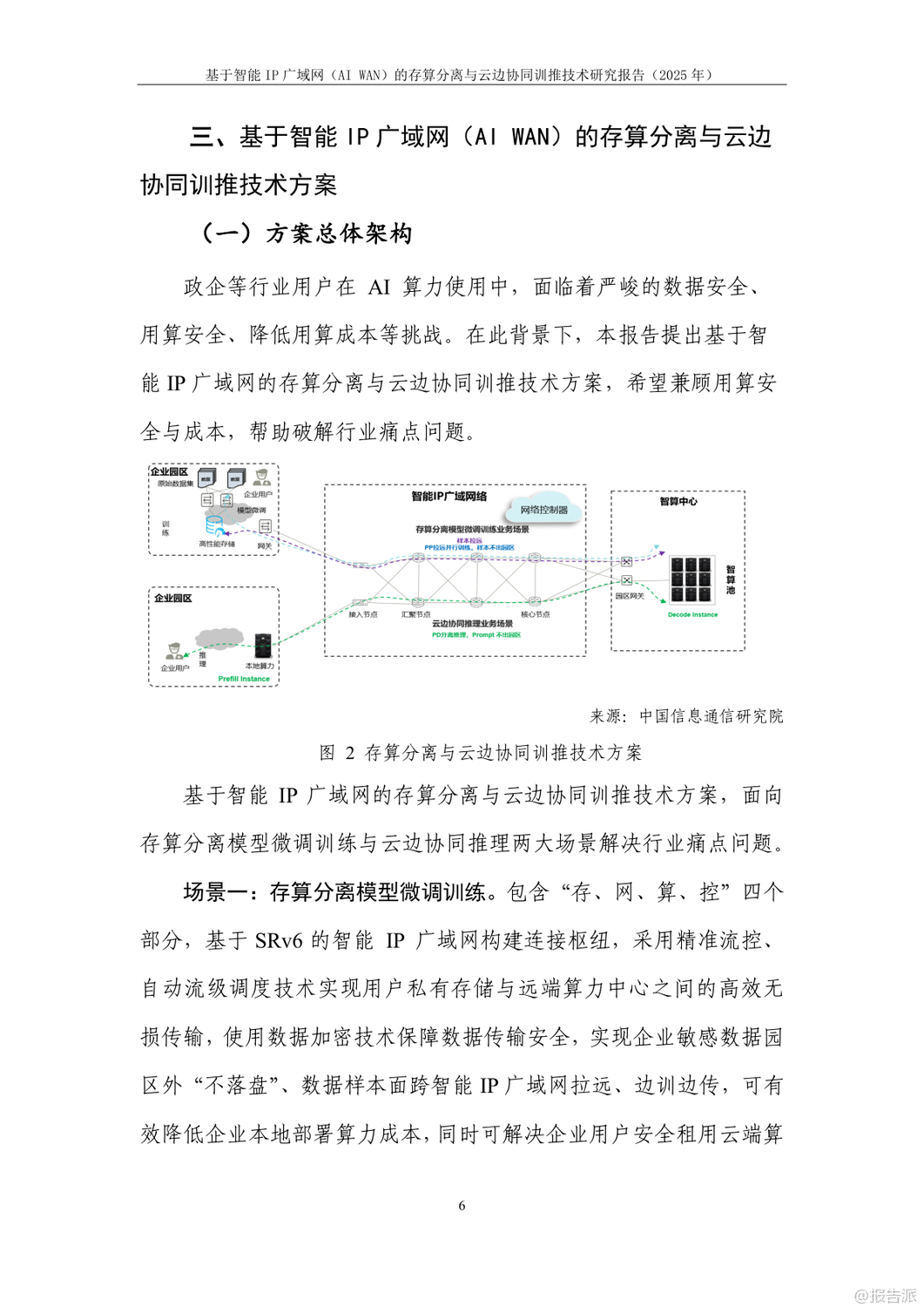 | 在人工智能加速发展的当下,企业对大模型训练与推理的算力需求呈爆发式增长。 然而,如何在保障数据安全的同时降低算力成本,成为政企用户面临的核心难题。 由中国信息通信研究院与华为联合发布的《基于智能IP广域网(AI WAN)的存算分离与云边协同训推技术研究报告(2025年)》正是针对这一矛盾提出系统性解决方案。 报告指出,当前企业AI训推主要依赖自建算力、租赁算力服务器搬至本地、或通过网络远程租用云端算力三种模式。 但这些方式普遍存在数据泄露风险高、投资成本大、网络传输效率低等问题。 尤其是在金融、政务、医疗等敏感行业,“原始数据不出域”已成为硬性合规要求。 为此,报告创新性地提出“存算分离+云边协同”的双轨技术路径。 在模型微调训练场景中,采用“存算分离”模式:企业本地保留数据存储,仅将训练过程中的中间结果通过智能IP广域网传输至远端算力中心进行计算。 结合精准流控与自动流级调度技术,即使在100公里乃至400公里的拉远距离下,仍可实现97%以上的高算效,真正做到“数据不落盘、不出域”。 而在推理场景中,则采用“云边协同”架构。 通过模型拆分学习技术,将大模型的首尾层部署在企业侧,中间计算密集层部署在云端。 网络中仅传输无法还原原始数据的高维向量,从根本上杜绝了数据泄露风险。 实验证明,在200公里拉远场景下,Qwen-32B模型推理算效劣化不超过5%,边侧算力利用率仅为4%,大幅降低了企业本地部署成本。 支撑这两大场景的核心技术包括三项:一是模型拆分学习,实现数据与模型的物理隔离;二是精准流控技术,基于SRv6与租户级反压机制,避免拥塞扩散,保障多租户业务稳定;三是自动流级调度技术,通过控制器实时感知大象流并动态调优路径,提升整网带宽利用率,降低企业用网成本。 实验室验证结果显示,在LLAMA2、Qwen、ResNet、DeepSeek等主流大模型上,该方案均能实现接近本地训练的算效表现,同时网络抓包证实云边协同模式下传输内容完全加密,安全性远超传统方案。 展望未来,该技术有望在医疗、金融、能源等高安全要求行业率先落地。 随着标准体系的建立和试点推广,智能IP广域网将成为连接企业数据与云端算力的安全高速通道,推动AI真正实现“可用、可信、可负担”的普惠化发展。 出品方:信通院 发布时间:2025年 文档页数:24页