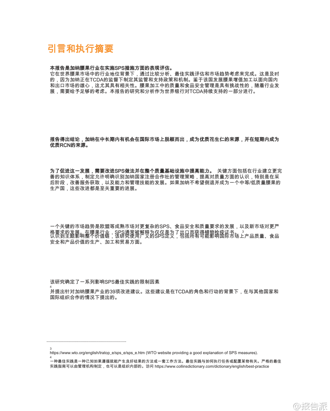 | 加纳作为全球腰果产业的新兴力量,正面临从“产量增长”向“质量升级”的关键转型。 根据世界银行发布的《加纳:改进腰果行业的卫生和植物卫生实践及产品质量》报告,该国腰果产量在过去十年以年均14.9%的速度迅猛增长,2022年产量达16万吨,占全球总产量的4%,跃居世界第八、非洲第五大生产国。 然而,这一亮眼数据背后,却潜藏着严峻挑战——加纳出口的生腰果(RCN)中,高达70%为来自科特迪瓦、布基纳法索等邻国的过境贸易产品。 这种“借港出海”的模式虽为加纳带来了物流和贸易服务收入,但也严重稀释了“加纳产”腰果的品牌声誉,导致国际市场将低质混杂的货物误认为是加纳本土产品,损害了其本应享有的优质溢价。 报告指出,加纳腰果的核心竞争力在于其卓越的品质。 无论是产出率(KOR)、坚果尺寸还是加工特性,加纳RCN在国际市场上都享有高价。 数据显示,2022年越南进口的加纳RCN平均价格仅次于塞内加尔、几内亚比绍和柬埔寨,位列第四。 印度买家尤其青睐加纳腰果,因其更早上市且加工性能优异。 然而,近年来由于产后处理失当、交易商掺杂使假以及农民对质量漠不关心,加纳腰果的质量稳定性正受到威胁。 这直接导致了加工企业Usibras Ghana Ltd.等本土加工厂难以获得稳定、优质的原料,进而阻碍了国家发展高附加值深加工产业的战略目标。 目前,加纳的加工能力利用率远低于西非竞争对手如科特迪瓦和贝宁,形成了“只卖原料,不赚加工钱”的尴尬局面。 报告揭示了问题的深层原因:一是监管与支持体系薄弱。 尽管成立了树木作物发展局(TCDA),但各机构间协调不足,缺乏统一的国家级质量标准和有效的追溯系统。 二是信息传递断层。 小农户占主导的生产模式使得良好农业规范(GAP)和食品安全知识难以普及,农民不了解质量与价格的关联,自然缺乏提升质量的动力。 三是国际贸易环境趋严。 欧盟等成熟市场对农药残留(MRLs)、黄曲霉毒素等SPS(卫生与植物卫生)要求日益严格,而加纳目前尚无强制性的检测机制和认证支持,本土加工商在满足这些要求时面临巨大成本和技术壁垒。 为此,世界银行提出了涵盖七大领域的39项具体建议。 核心策略是推动加纳从“转口贸易中心”向“高质量品牌产地”转型。 首要任务是建立可追溯的国家注册系统,通过电子植物检疫(ePhyto)等手段,清晰区分本土与过境产品,保护“加纳产”的金字招牌。 其次,必须改革最低收购价制度,将价格与质量参数(如产出率、水分含量)直接挂钩,激励农民追求高品质。 同时,亟需构建强大的公共服务体系,包括提供HACCP、BRC等国际认证的培训与咨询,改善实验室检测接入,并建立一个集成了市场信息、质量投诉和买家需求的数据库,赋能整个产业链。 总而言之,加纳腰果产业正处于十字路口。 它拥有成为西非乃至全球优质腰果核心供应地的巨大潜力,但这份潜力正被短视的贸易行为和落后的质量基础设施所侵蚀。 若能抓住机遇,采纳报告中的建议,系统性地提升SPS实践、强化质量管理和品牌建设,加纳完全有能力摆脱“低端原料出口”的困境,在全球价值链中占据更有利的位置,实现从“腰果大国”到“腰果强国”的跨越。 本文由【报告派】研读,输出观点仅作为行业分析! 原文标题:原文标题:2026-01-27-世界银行-腰果行业加纳:改善腰果行业的卫生和植物检疫实践以及产品质量(英译中) 发布时间:2025年 出品方:世界银行 文档页数:49页