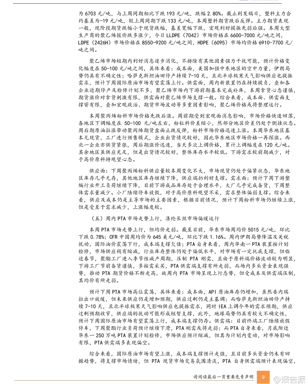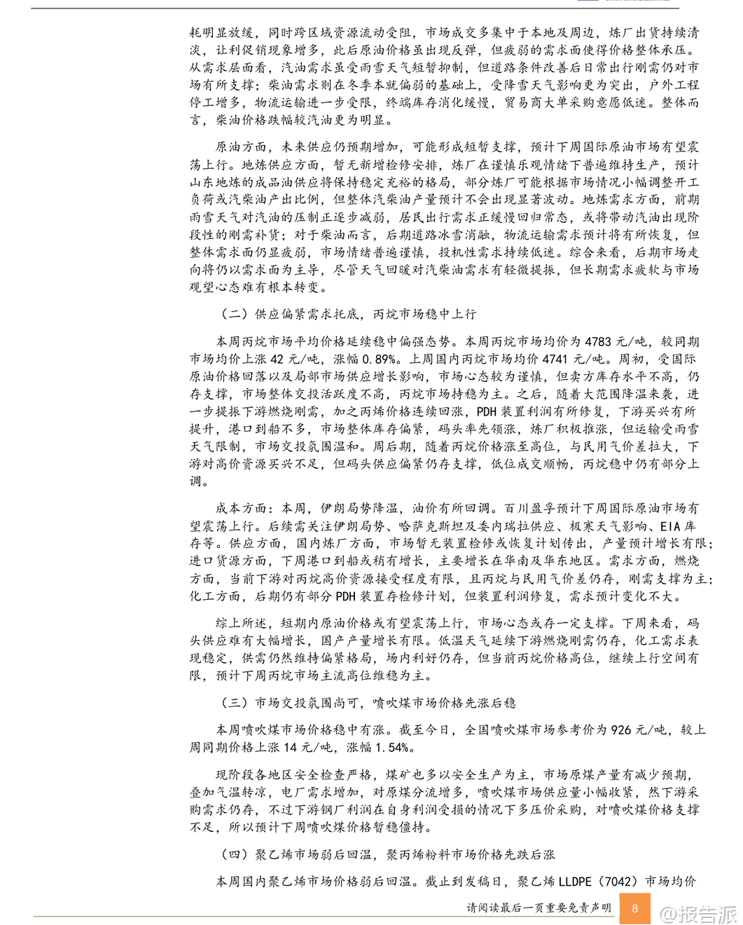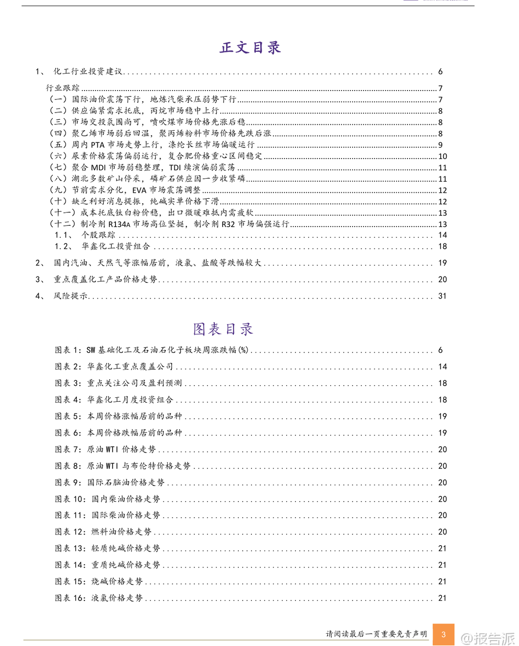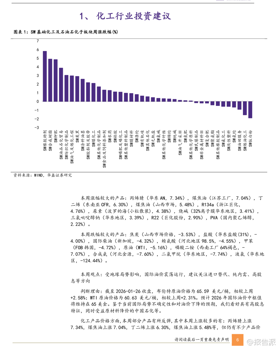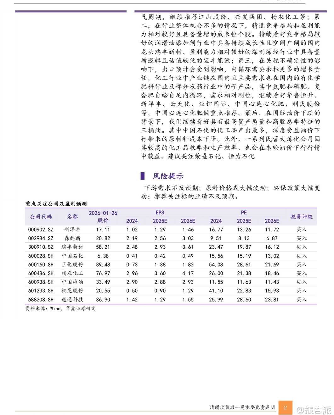 | 近期,华鑫证券发布《基础化工行业研究》报告,围绕2026年初化工品价格走势、市场格局及投资策略展开深入分析。 报告指出,当前基础化工行业整体仍处于弱势周期,但结构性机会逐步显现,建议重点关注进口替代、纯内需、高股息资产以及景气有望反转的细分赛道。 从产品价格表现来看,本周化工品市场呈现明显分化。 部分产品价格强势反弹,其中丙烯腈(华东AN)周涨幅达7.34%,煤焦油(江苏工厂)上涨7.04%,丁二烯(东南亚CFR)上涨6.30%,制冷剂R134a、尿素、烧碱等也录得不同程度上涨。 价格上涨主要受供需格局改善、成本支撑及下游需求阶段性回暖等因素驱动。 例如,丙烷市场因低温天气提振燃烧需求,叠加PDH装置利润修复,带动丙烯相关产业链产品价格上行;而制冷剂R134a和R32则受益于新能源汽车和空调出口增长带来的长期需求支撑,市场维持“供需紧平衡”状态,价格高位坚挺。 与此同时,也有不少化工品价格持续承压下行。 液氯华东地区价格周跌幅高达124.44%,二氯甲烷下跌7.74%,合成氨、磷酸二铵、甲苯、原油WTI等均出现显著回调。 价格下跌的主要原因在于供应过剩、需求疲软以及上游原料价格波动。 特别是液氯作为氯碱工业的副产品,其价格剧烈波动反映出主产品烧碱与副产品液氯之间供需失衡的矛盾。 此外,国际油价虽在哈萨克斯坦油田停产、极寒天气等因素扰动下短期反弹,但整体仍面临供应增加的压力,WTI原油周均价环比下跌,对石化产业链形成一定压制。 在行业整体业绩方面,三季报数据显示化工行业仍处调整期,各子板块表现分化。 过去两年产能集中投放导致行业进入新一轮产能周期,叠加终端需求偏弱,使得多数企业面临盈利压力。 不过,部分细分领域表现超预期,如润滑油添加剂等行业展现出较强的抗周期属性和成长潜力。 基于当前市场环境,华鑫证券提出四大核心投资主线:第一,布局有望迎来景气反转的草甘膦行业。 该行业经历长期低迷后,已呈现出明显的底部特征:库存持续去化,价格开始企稳回升。 在全球补库存周期启动的背景下,行业有望进入新一轮景气上行通道。 报告继续推荐江山股份、兴发集团、扬农化工等具备全产业链优势的龙头企业。 第二,精选具备持续成长性和良好竞争格局的优质个股。 在行业整体机会有限的情况下,应聚焦于具有量增逻辑、盈利能力强且估值合理的成长股。 重点看好润滑油添加剂领域的国内龙头瑞丰新材,其技术壁垒高、市场空间广阔;以及煤制烯烃领域的宝丰能源,凭借低成本优势和持续扩产能力,具备较强的盈利韧性和成长确定性。 第三,把握“纯内需”主线,规避出口不确定性风险。 在全球贸易摩擦加剧、关税政策存在变数的背景下,出口导向型化工品面临压力。 因此,应优先选择产业链和需求均在国内的品种,如氮肥、磷肥、复合肥等化肥农药子行业。 这些产品需求刚性,自给率高,受外部冲击小。 报告推荐华鲁恒升、新洋丰、云天化、亚钾国际、中国心连心化肥等,并将中国心连心化肥列为“重点推荐”。 第四,关注高股息资产,尤其是“三桶油”和民营大炼化企业。 在国际油价中枢预计维持在65美元/桶的背景下,上游原材料成本下降将显著增厚中下游企业的利润空间。 中国石化作为化工品产出最多的油企,将深度受益于成本下行,同时其本身具备高股息率和优质资产特征,是攻守兼备的配置选择。 此外,荣盛石化、恒力石化等民营大炼化企业凭借较高的化工品收率和运营效率,同样能在本轮行情中获益。 报告同时提示了四大风险:一是下游需求恢复不及预期,拖累产品价格和企业盈利;二是原料价格大幅波动,影响生产成本和利润稳定性;三是环保政策可能加码,带来供给端的不确定性;四是所推荐公司的实际业绩可能低于预期,影响股价表现。 综上所述,当前基础化工行业正处于结构性分化与转型的关键阶段。 投资者应摒弃“普涨”思维,转向精细化选股,重点挖掘景气拐点、内需刚性、高股息分红和具备长期成长性的优质标的,以应对复杂多变的宏观与产业环境。 本文由【报告派】研读,输出观点仅作为行业分析! 原文标题:原文标题:2026-01-27-华鑫证券-华鑫证券-基础化工行业研究:丙烯腈、煤焦油等涨幅居前,建议关注进口替代、纯内需、高股息等方向 发布时间:2026年 出品方:华鑫证券 文档页数:33页