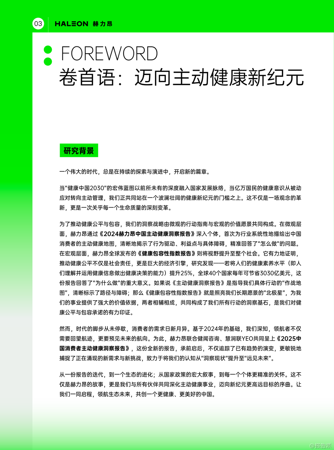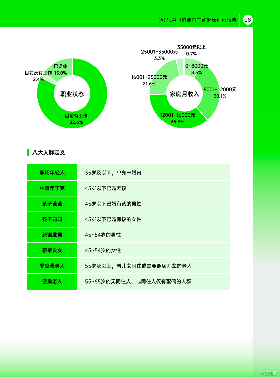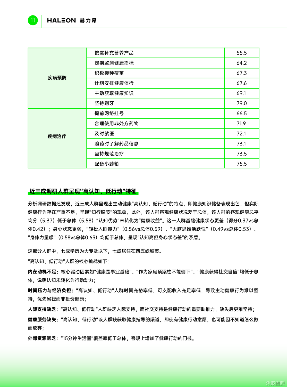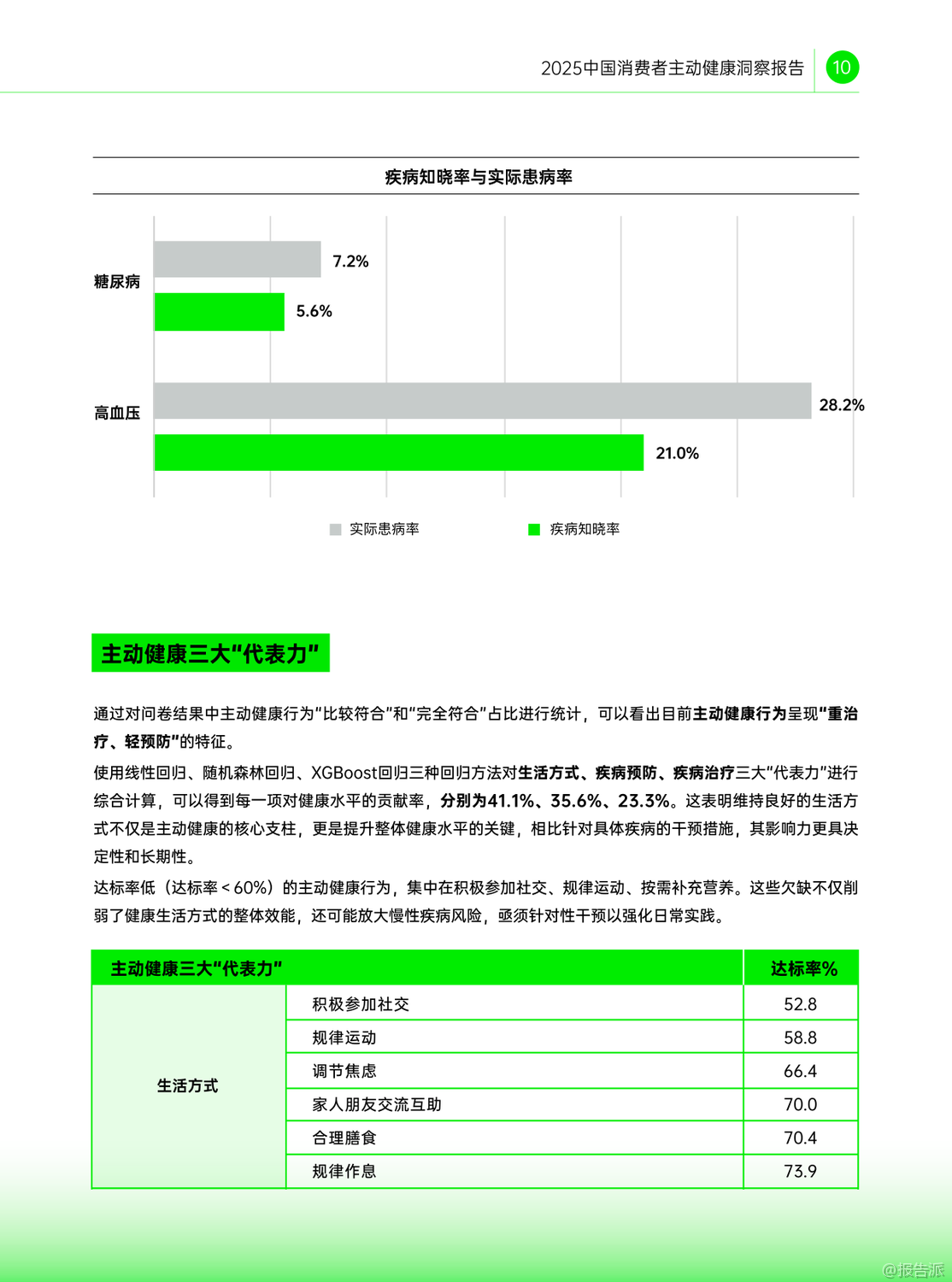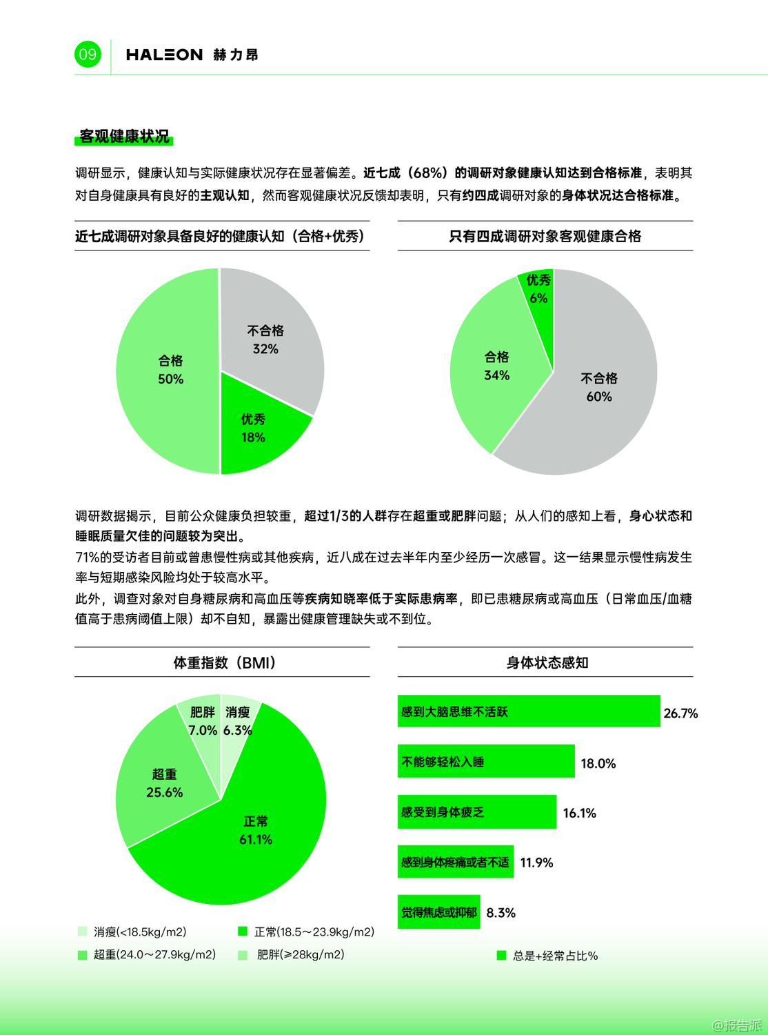 | 近日,赫力昂联合健闻咨询、慧涧联YEO共同发布了《2025中国消费者主动健康洞察报告》,深入剖析了中国消费者在健康认知与行为之间的巨大鸿沟,并揭示了推动全民主动健康的关键驱动力与现实阻碍。 报告指出,尽管近七成受访者主观上认为自己健康状况良好,但客观健康达标率却不足四成,暴露出“高认知、低行动”的普遍困境。 更令人警惕的是,超三分之一人群存在超重或肥胖问题,慢性病知晓率远低于实际患病率,健康管理仍处于被动应对阶段。 报告首次提出“主动健康三大代表力”——生活方式、疾病预防与疾病治疗,通过数据分析发现,生活方式对整体健康水平的贡献率高达41.1%,远超疾病预防(35.6%)和治疗(23.3%),凸显日常习惯在健康管理中的核心地位。 然而,规律运动、积极社交、按需营养补充等关键行为达标率均低于60%,成为全民健康提升的短板。 研究进一步揭示,近三成人群呈现“高认知、低行动”特征,他们多为四五线城市居民和低学历群体,虽具备一定健康知识,却因时间压力、经济负担、缺乏社交支持和健康服务渠道而难以付诸实践。 这一群体的客观健康评分显著低于总体水平,反映出认知未能转化为健康收益的严峻现实。 报告还对八大人群进行了差异化画像:职场年轻人看似健康基础好,实则潜藏慢性病风险;中青年丁克为事业透支健康;孩子爸爸健康知识匮乏;孩子妈妈是家庭健康的“承托者”却常忽略自我;新银发男展现最强主动健康意识,而新银发女则受家庭责任束缚;空巢老人虽有求知欲,却面临“数字鸿沟”;非空巢老人得益于家庭支持,整体表现更优。 在城市维度上,报告发现一个反直觉现象:一二三线高收入群体虽拥有顶尖医疗资源与健康认知,却是客观健康得分最低的“高知精英派”,饱受肥胖、高血压、颈椎病等困扰;而四五线高收入群体则被称为“健康幸运儿”,身心状态更佳,慢性病发生率更低,折射出“逃离内卷”背后的健康逻辑。 报告最终指出,推动主动健康需三方合力:个人需打破认知困局,将知识转化为行动;家庭应营造健康传承氛围;社会则需构建以“15分钟生活圈”为核心的健康支持环境。 唯有打通从认知到行动的“最后一公里”,才能真正实现“每个人是自己健康第一责任人”的全民健康愿景。 出品方:赫力昂 发布时间:2025年 文档页数:49页