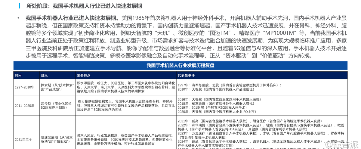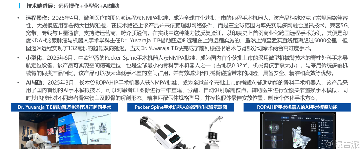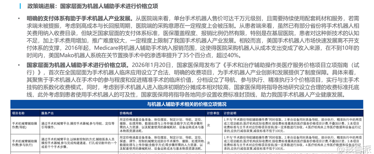 | 近期,华创证券发布了《中国手术机器人行业近况更新》研究报告,全面梳理了我国手术机器人行业的发展现状、技术突破、政策支持及市场前景。 作为高端医疗器械的重要方向,手术机器人正迎来从“资本驱动”向“价值驱动”的关键转型期,产业生态逐步成熟,商业化进程加速推进。 当前,我国手术机器人行业已进入快速发展期。 自1997年国内启动早期技术探索以来,历经20余年发展,特别是在国家政策扶持与资本持续注入的推动下,国产手术机器人在骨科、神经外科、腔镜等多个领域实现初步商业化落地。 代表产品包括天智航的“天玑”、微创医疗的“图迈TM”、精锋医疗的“MP1000TM”等。 目前行业正处于政策红利释放、制造业升级、市场需求扩容与技术迭代融合的关键阶段。 多家三甲医院和科研机构正在建设手术导航、影像配准与数据融合平台,5G与AI技术的深入应用,也推动手术机器人向远程手术、智能辅助决策、多模态影像融合等方向演进。 在技术端,三大趋势尤为突出:一是远程操作取得重大突破。 2025年,微创医疗的图迈®远程手术机器人获NMPA批准,成为全球首个获批上市的远程手术机器人。 其采用多网融合通信技术,兼容5G、宽带、专线与卫星通信,实现了跨运营商、跨介质连接。 例如,在上海至孟买超5000公里的跨国手术中,系统延迟仅132毫秒,成功完成高难度前列腺癌根治术,标志着我国在远程手术领域处于全球领先地位。 二是设备小型化进展显著。 2025年6月,中欧智薇的Pecker Spine手术机器人获批,采用微型机械臂技术,占地仅0.32㎡,为全球最小骨科手术机器人之一,极大节省手术室空间并降低碰撞风险。 三是AI辅助功能实现临床落地。 长木谷ROPAHIP手术机器人于2025年3月获批,是全球首款搭载AI辅助功能的骨科手术机器人,可基于患者CT图像进行三维重建、解剖点识别、假体匹配与手术方案模拟,实现个体化精准置换。 政策层面迎来里程碑式进展。 长期以来,支付体系不完善制约行业发展。 尽管部分省份将机器人手术纳入收费目录,但缺乏全国统一标准,医保覆盖有限,患者认知不足,导致推广受限。 相比之下,美国Medicare自2016年起将机器人辅助手术纳入报销,推动Mako系统在关节置换中渗透率十年内提升35个百分点,超过40%。 2026年1月20日,国家医保局发布《手术和治疗辅助操作类医疗服务价格项目立项指南(试行)》,首次在全国层面设立机器人辅助手术收费项目,实行“导航”“参与执行”“精准执行”三档分层定价,并与主手术挂钩按系数加收,同时设置托底线与封顶线,兼顾医院成本回收与患者可及性,为产业发展提供制度保障。 注册审批方面,国产手术机器人获批明显加速。 2016年以来,随着资本涌入和技术积累,国产产品陆续获批。 2021年后,审评体系完善进一步缩短注册周期。 2014–2024年,骨科手术机器人占获批总数的50%,稳居第一;2025年该比例仍达46%。 销售端呈现“量增价缓”特征。 2025年1–11月,手术机器人销量332台,同比增长3.75%;销售额29.73亿元,同比下降0.87%,销量增速高于销售额,反映国产替代深化与价格体系合理化协同推进,是行业迈向规模化渗透的良性信号。 细分来看,骨科机器人量额齐增(销量+17.81%,销售额+21.62%),而腔镜机器人销量下滑16.20%,神经外科销售额下降4.27%,其他类型则实现55%以上增长,显示新兴领域潜力巨大。 从细分市场看,腔镜与骨科机器人主导格局。 2024年,两者分别占市场份额42%和32%。 腔镜机器人临床优势显著,但国内渗透率仅为0.7%,远低于美国的21.9%,成长空间广阔。 预计到2033年,手术量将达155.5万例(CAGR 30.4%),装机量增至7245台(CAGR 34.3%),市场规模达405.43亿元(CAGR 28.7%)。 在竞争格局上,国产替代加速。 三年前达芬奇几乎垄断市场,如今国产厂商已打破壁垒。 2025年,8家国产企业实现中标,合计47台,占总量约52%。 精锋医疗、微创机器人等头部品牌已在多区域核心三甲医院持续中标,国产化进程提速。 骨科机器人则是高速增长赛道。 预计2023–2032年市场规模CAGR达49.4%,从5.74亿元增至212.79亿元。 国产化率超70%,天智航市占率近40%,稳居第一。 政策支持、老龄化需求与支付体系完善共同驱动其快速发展。 总体来看,中国手术机器人行业正站在爆发前夜。 技术突破、政策破局、国产替代与市场需求共振,推动行业从导入期迈向规模化成长期。 未来,随着AI、5G、小型化等技术持续赋能,以及更多创新产品获批与医保覆盖扩大,手术机器人有望在更多专科领域普及,真正实现“精准、微创、智能”的外科革命。 本文由【报告派】研读,输出观点仅作为行业分析! 原文标题:2026-01-31-华创证券-华创证券-医药行业投资观点&研究专题周周谈·第161期:中国手术机器人行业近况更新 发布时间:2026年 出品方:华创证券