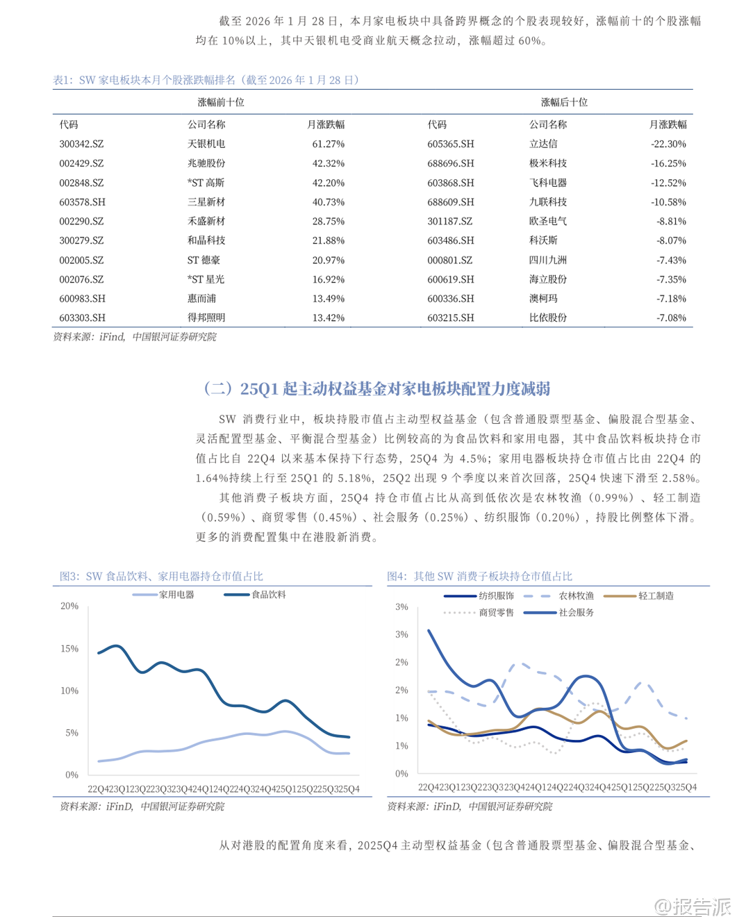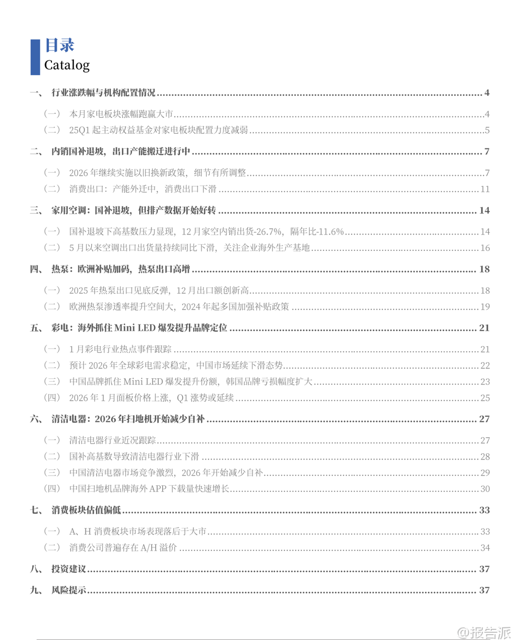 | 2026年初,中国家电行业迎来结构性变化与外部环境重塑的关键节点。 根据银河证券发布的《家电行业月度动态跟踪》报告,当前行业呈现“内销提价、出口分化、格局重构”三大核心趋势,为市场带来新的投资逻辑与竞争变局。 在内销市场,政策红利进入退坡期。 自2025年第三季度起,国家以旧换新补贴逐步退坡,叠加2024-2025年高基数效应,导致2025年末家电零售数据承压明显。 2025年10月至12月,家用电器和音像器材类社会消费品零售总额同比分别下降14.6%、19.4%和18.7%。 然而,进入2026年,随着原材料成本(如金属、内存)上涨,龙头企业开启反向操作——主动提价。 美的集团于1月初实施阶梯式涨价,热销机型累计上调6%;AVC数据显示,2026年第3周空调线上零售均价环比提升5.7%,其中美的、格力、海尔分别上涨15.3%、16.5%和6.1%。 这一现象标志着行业从“补贴驱动”转向“成本转嫁+品牌溢价”的新阶段。 与此同时,清洁电器领域也出现策略调整,石头科技等企业降低扫地机器人自补力度,推动产品均价触底回升,行业有望结束价格战,进入高质量发展阶段。 出口方面,结构性亮点突出。 整体消费品类出口在2025年4月后持续下滑,主要受美国关税压力及产能外迁影响。 但细分赛道表现亮眼:一是热泵出口创历史新高。 2025年12月,我国热泵相关产品出口额达16.2亿元,同比增长21.7%,连续20个月正增长,并超越2022年同期历史高峰,创下12月单月新纪录。 这背后是欧洲多国重启或加码热泵补贴政策,推动能源转型。 目前欧洲热泵家庭渗透率仅为12%,多数国家低于20%,未来提升空间巨大,预计2026年出口景气度将持续。 二是黑电(彩电)出口格局加速重塑。 TCL电子宣布与索尼拟成立合资公司,由TCL持股51%、索尼持股49%,整合双方在制造、供应链与品牌技术上的优势。 若2027年顺利运营,TCL与索尼合并市占率有望达16.7%,直接挑战三星(预计16.2%)的全球第一地位。 韩国品牌因发动价格战导致利润大幅亏损,三星显示部门2025Q4营业利润率降至-4.1%,LG家庭娱乐部门降至-6.5%,已难以为继,为中国品牌出海提供战略窗口。 技术创新成为高端化突破口。 Mini LED电视成为2026年彩电行业最大亮点,其全球渗透率在2024年首次超过OLED,并持续扩大差距。 群智咨询预测,2026年Mini LED电视出货量将达2073万台,渗透率提升至9.5%。 中国品牌在该技术路线上引领创新,海信主推RGB Mini LED,TCL则探索SQD-Mini LED路径,形成差异化竞争。 此外,面板价格自2026年初开启上涨周期,中小尺寸涨幅1美元,中大尺寸涨2-3美元,主要受世界杯备货拉动,预计涨势延续至Q1末。 投资层面,机构配置有所回落。 截至2025Q4,基金持仓家电板块市值占比为2.58%,环比下降0.17个百分点,结束此前连续上行趋势。 估值方面,当前家电行业市盈率(TTM)为15.6倍,低于十年均值17.58倍,处于历史偏低水平。 报告推荐关注三条主线:一是上游核心零部件企业,如三花智控、儒竞科技;二是具备海外市场科技消费优势的企业,包括TCL电子H、绿联科技、海信视像、石头科技;三是具备竞争优势与稳定分红能力的龙头,如美的集团、海尔智家。 综上所述,2026年中国家电行业正处于转型升级的关键时期。 内需虽面临补贴退坡压力,但龙头企业通过提价与减少补贴维持盈利能力;出口虽整体承压,但在热泵、高端彩电等领域实现突破性增长。 未来竞争将更依赖技术研发、全球化布局与产业链整合能力,行业集中度有望进一步提升,具备核心技术与海外渠道优势的头部企业将脱颖而出。 本文由【报告派】研读,输出观点仅作为行业分析! 原文标题:原文标题:银河证券-家电行业月度动态跟踪:内销开始提价,热泵、黑电海外表现突出 发布时间:2026年 报告出品方:银河证券 文档页数:49页