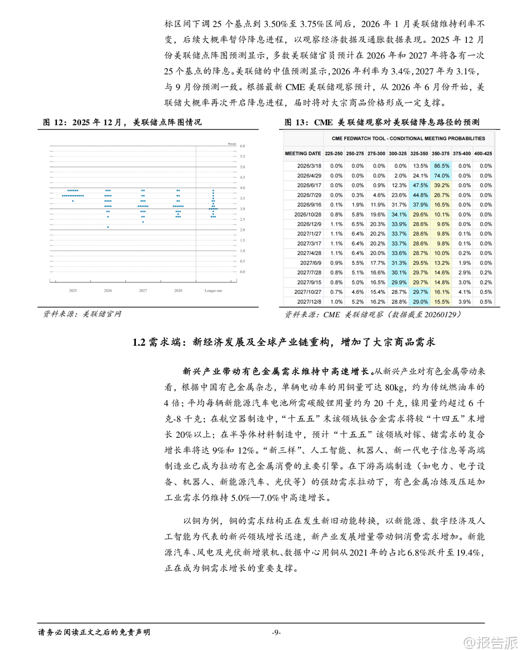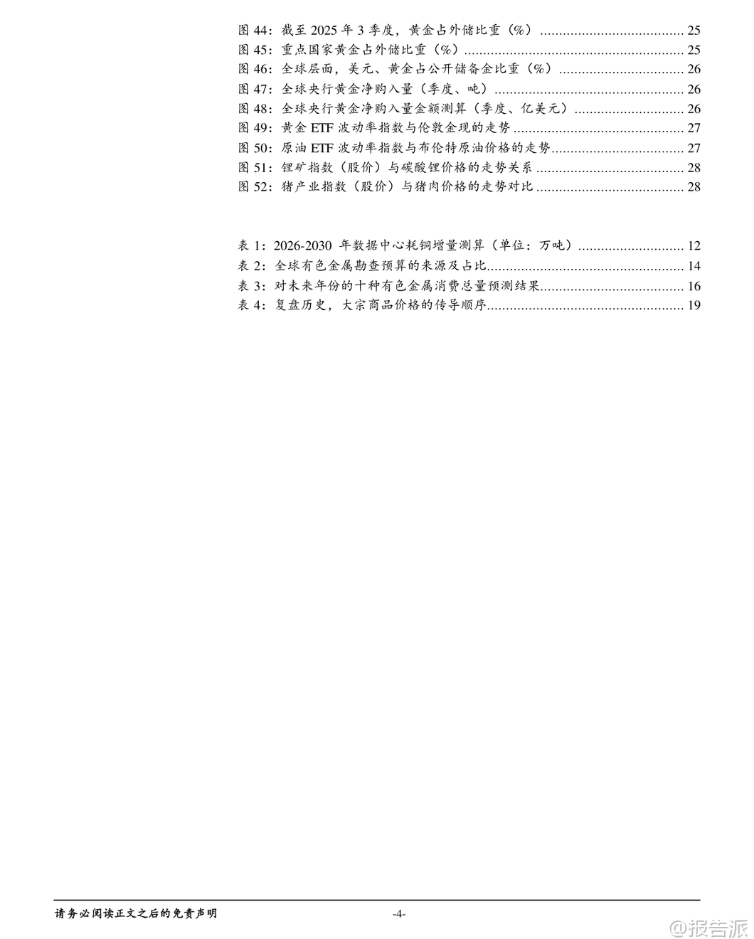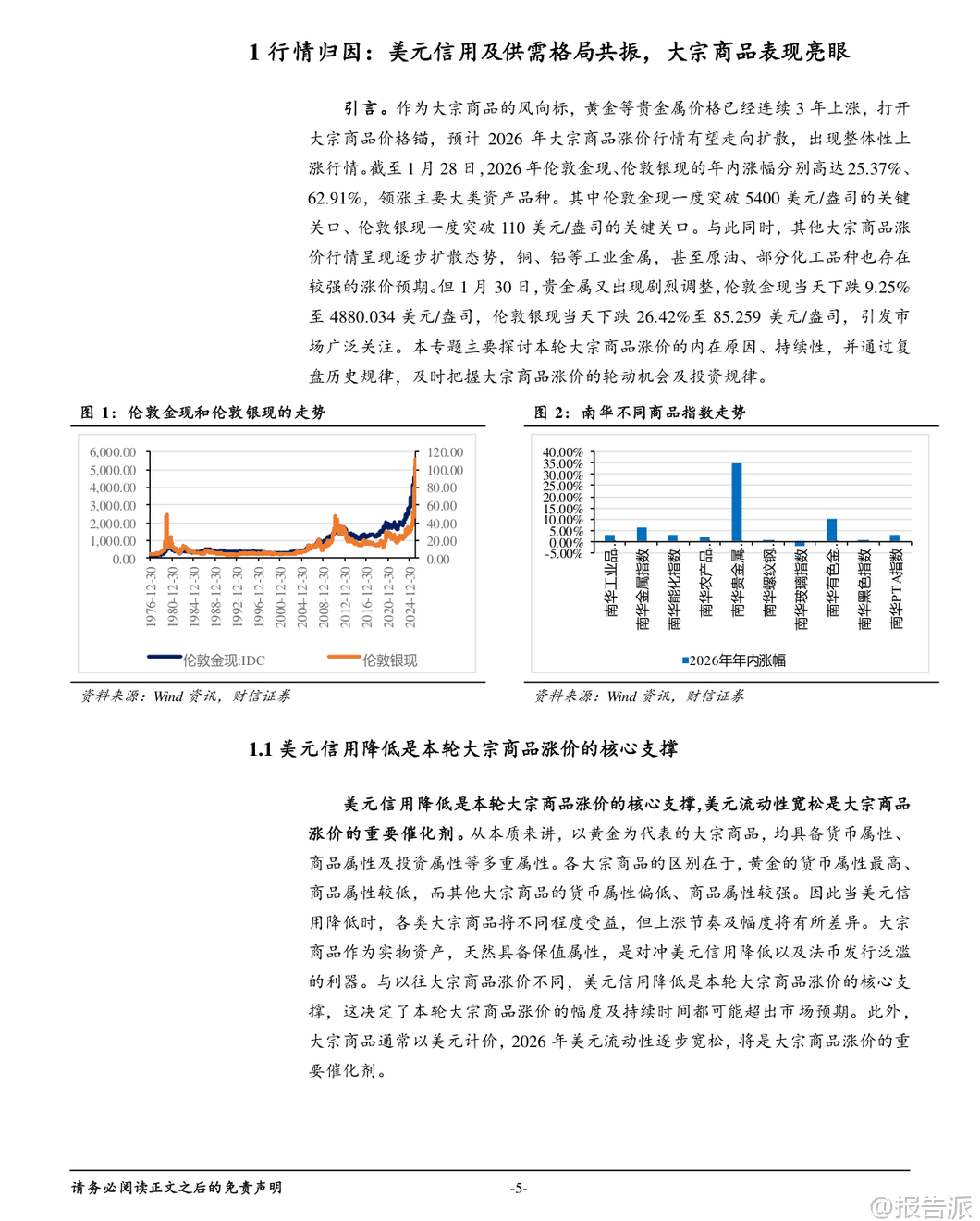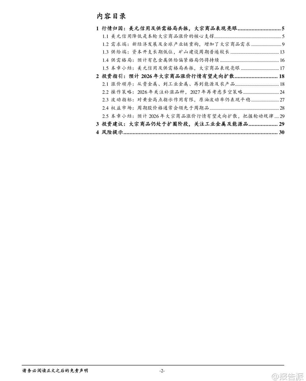 | 近期,财信证券发布《大宗商品专题报告》,深入剖析了2026年全球大宗商品市场的运行逻辑与未来趋势。 报告指出,本轮大宗商品涨价的核心驱动力来自美元信用弱化、全球产业链重构以及供需格局的持续紧张,尤其在黄金等贵金属已率先大幅上涨的背景下,预计2026年涨价行情将向工业金属和能源品扩散。 报告认为,美元信用降低是此轮大宗商品牛市的根本支撑。 俄乌冲突后美国冻结他国外汇储备的行为,严重削弱了美元作为全球储备货币的信任基础。 SWIFT支付体系中美元占比下降、多国加速“去美元化”、央行持续增持黄金等现象,均表明黄金正在脱离传统“10年期美债实际收益率”的定价框架。 基于历史债务规模与全球名义GDP的对比测算,2026年伦敦金现均价有望达到5000-6000美元/盎司区间,即便短期出现剧烈波动,其易涨难跌的趋势仍将延续。 从需求端看,新经济发展成为重要引擎。 新能源汽车、光伏风电、AI数据中心等产业对有色金属的需求激增。 例如,单辆电动车用铜量是燃油车的4倍;2026-2030年,全球数据中心耗铜量预计将以23.2%的复合年增长率攀升,到2030年用铜量或占全球消费总量的5%。 同时,全球“再工业化”浪潮兴起,美国《制造业回流》、德国《国家工业战略2030》、日本供应链回迁政策等,都增加了对原材料的长期需求。 供给端则面临长期资本开支不足的硬约束。 全球有色金属勘查预算在2012年见顶后持续下滑,尽管价格回升,但初级矿业公司融资困难,导致新矿项目稀缺。 矿山建设周期普遍长达10年以上,叠加资源品位下降(如全球铜矿平均品位已跌破0.7%),供给弹性极低。 此外,“反内卷”政策和地缘政治风险(如印尼镍出口管制、刚果钴管控)进一步加剧了供给扰动。 综合来看,2025-2026年中国十种有色金属产量预计年均增长1.5%,而同期消费量年均增速预计达2.2%,供需缺口将持续存在。 分品种看,金、锌、铅的供需格局有望改善,而铜等关键工业金属紧平衡状态难改。 报告最核心的观点在于:大宗商品的涨价行情正从贵金属向其他品类扩散。 历史规律显示,大周期通常始于贵金属(抗通胀、避险属性强),随后传导至工业金属(受益于经济复苏),最后轮动至能源和农产品。 当前,金油比(85.65)和金铜比(899.64)均已远超近2年均值及+2倍标准差水平,表明金价相对油价、铜价已明显超涨。 这种极端分化预示着原油和工业金属存在强烈的补涨动能。 具体操作策略上,报告建议:2026年应重点关注处于扩圈阶段的工业金属(如铜、铝)和能源品(原油、化工),把握其补涨机会。 日历效应也支持这一判断——春节后中国制造业复工将推升铜需求,而上海期货交易所库存偏低,将进一步支撑铜价。 待行情进入尾声缩圈阶段(可能在2027年后),可考虑“做多黄金、做空其他”的多空策略,因黄金的上涨持续性最强。 此外,报告提醒投资者关注权益市场信号。 周期股(如锂矿、猪产业指数)的价格变动往往领先于商品现货价格,可作为预判周期拐点的重要参考。 虽然波动率指标对判断黄金长周期顶部作用有限,但仍是短期风险监控的辅助工具。 综上所述,该报告描绘了一幅由货币信用危机引发、供需失衡强化的大宗商品全景图。 在“布雷顿森林体系III”的叙事下,黄金锚定价值重估,带动整个商品链条重定价。 对于投资者而言,2026年的主线并非追逐已高飞的黄金,而是布局即将启动补涨的工业金属与能源品,紧跟“涨价扩散”的轮动节奏。 本文由【报告派】研读,输出观点仅作为行业分析! 原文标题:原文标题:2026-01-30-财信证券-财信证券-大宗商品专题报告:大宗商品行情扩散,关注工业金属及能源品 发布时间:2026年 报告出品方:财信证券 文档页数:31页