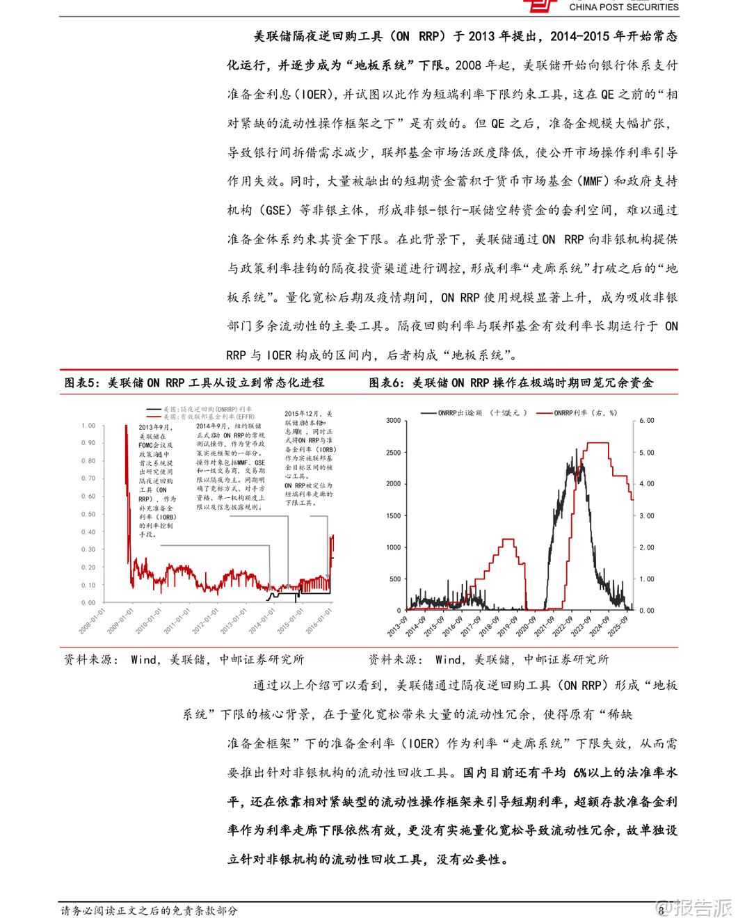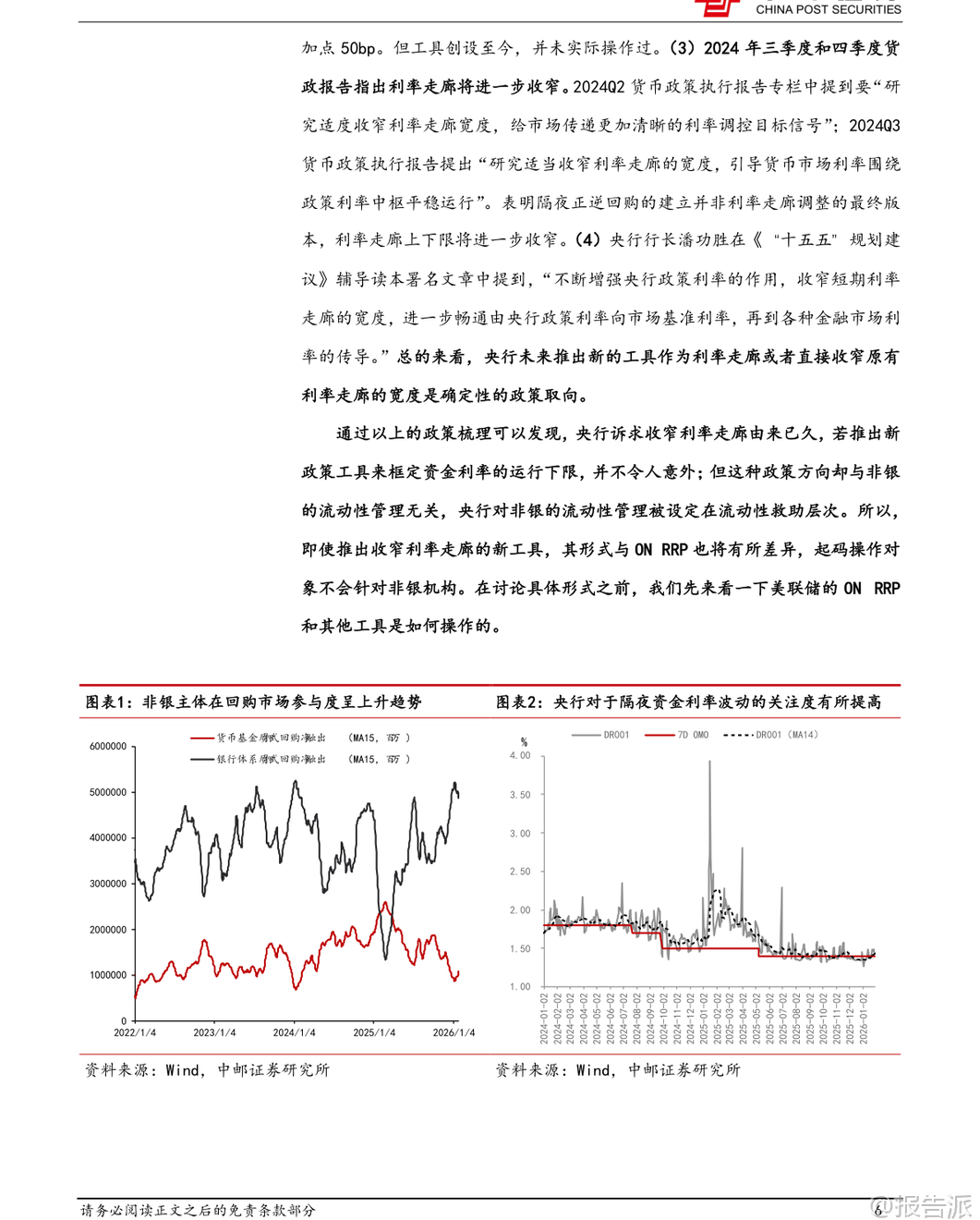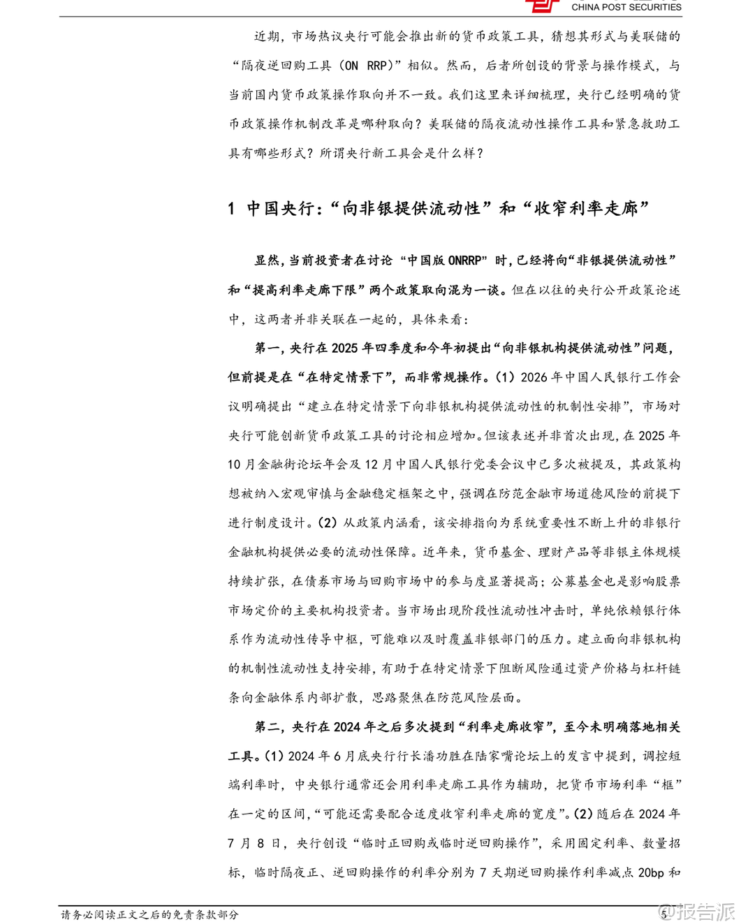 | 近期市场热议央行或将推出类似美联储ON RRP的“中国版隔夜逆回购工具”,但根据中邮证券梁伟超团队的研究分析,这一猜想存在明显误解。 当前投资者普遍将“向非银机构提供流动性”与“收窄利率走廊”混为一谈,而实际上,这两者在政策逻辑、操作对象和实施目标上均有本质区别。 首先,央行明确提出“建立在特定情景下向非银机构提供流动性的机制性安排”,但这并非日常流动性投放工具,而是定位于金融稳定框架下的应急救助机制。 近年来,货币基金、理财产品等非银机构在债券和回购市场中的参与度持续上升,已成为影响资产定价的重要力量。 一旦发生系统性流动性冲击,仅依赖银行体系传导流动性可能难以及时覆盖非银部门的风险外溢。 因此,设立面向非银的流动性支持机制,核心目的是防范金融市场道德风险,阻断“赎回—抛售—价格下跌”的负反馈循环,属于宏观审慎管理的延伸,而非常规利率调控手段。 其次,央行自2024年以来多次强调“适度收窄利率走廊宽度”。 目前我国的利率走廊以上限7天逆回购利率、下限超额存款准备金利率(IOER)构成,但实际运行中,DR007常大幅偏离政策利率中枢。 尤其在银行负债宽松时期,大行融出资金压低利率,导致短端利率长期低于IOER,削弱了政策利率的引导作用。 为此,央行已在2024年创设“临时正/逆回购操作”,设定利率分别为7天逆回购利率减20bp和加50bp,但至今未实际启用。 这表明,未来更可能通过新工具进一步框定利率运行区间,实现更精细化的短端调控。 值得注意的是,尽管市场将此类工具类比为“中国版ON RRP”,但中美两国的货币政策环境存在根本差异。 美联储设立ON RRP的核心背景是量化宽松后流动性严重过剩,银行体系准备金充足,导致IOER作为利率下限失效,必须通过向非银机构开放的逆回购工具回收冗余资金,形成“地板系统”。 而中国目前仍维持约6%的法定存款准备金率,流动性处于相对稀缺状态,IOER依然有效,不存在大规模流动性回收的需求。 因此,单独设立针对非银机构的流动性回收工具既无必要,也不符合当前政策框架。 基于此,中邮证券提出两大政策工具猜想:其一,为落实“利率走廊收窄”,可能推出面向一级交易商或大型银行的“存款便利”类工具。 该工具利率将高于当前IOER(如0.35%),但低于公开市场操作利率(如1.8%),作为银行存放央行资金的新渠道,从源头上约束资金融出利率的下限,避免DR001过度偏离。 其二,为落实“流动性救助”,可能创设定向支持非银机构的应急工具,如类似美联储MMLF的货币市场基金流动性便利,通过SPV或合作金融机构向非银提供融资支持,以应对极端市场冲击。 但由于现行《中国人民银行法》禁止央行直接向非银机构贷款,此类工具或需等待法律修订,或通过间接机制设计实现。 此外,研究指出,资金利率的偏离不仅受政策调控影响,也与银行负债状况密切相关。 例如2025年一季度,在非银活期监管加强背景下,银行负债承压,央行保持流动性克制,导致资金利率上行;而2022年则因银行资产收缩带来被动负债宽松,推动利率大幅下行。 这说明,银行作为流动性传导中枢,其资产负债行为对市场利率有决定性影响。 综合来看,央行未来的工具创新将围绕“利率走廊收窄”和“非银流动性救助”两条主线推进,前者侧重于提升利率调控效率,后者服务于金融稳定目标。 即便推出新工具,其操作对象大概率仍以银行或一级交易商为主,而非全面向非银开放。 因此,所谓“中国版ON RRP”的预期不宜高估。 工具创设虽具长期制度意义,但对短期市场的影响或将趋于中性。 投资者应关注央行对DR001的重视程度提升,以及在极端情景下非银救助机制的落地进展,而非简单对标海外经验进行套利推演。 本文由【报告派】研读,输出观点仅作为行业分析! 原文标题:2026-01-30-中邮证券-固收专题:货币“新工具”会是什么样? 发布时间:2026年 出品方:中邮证券