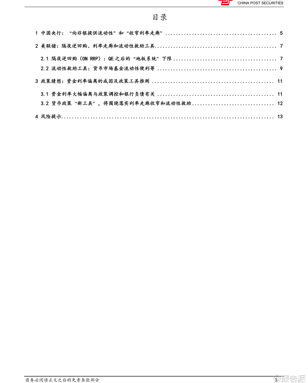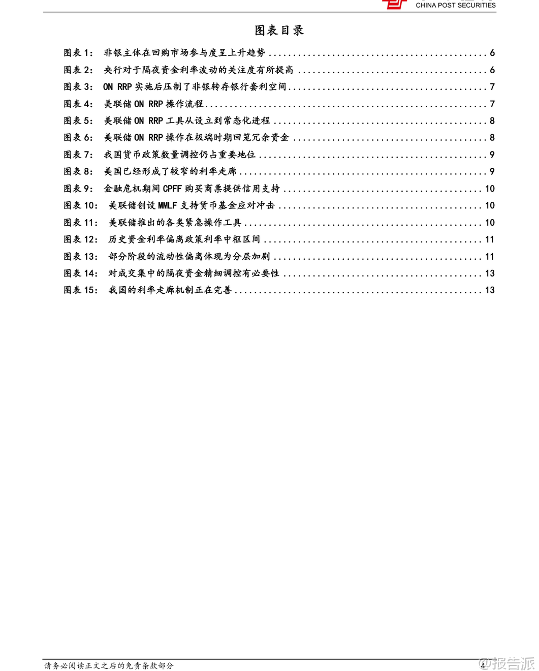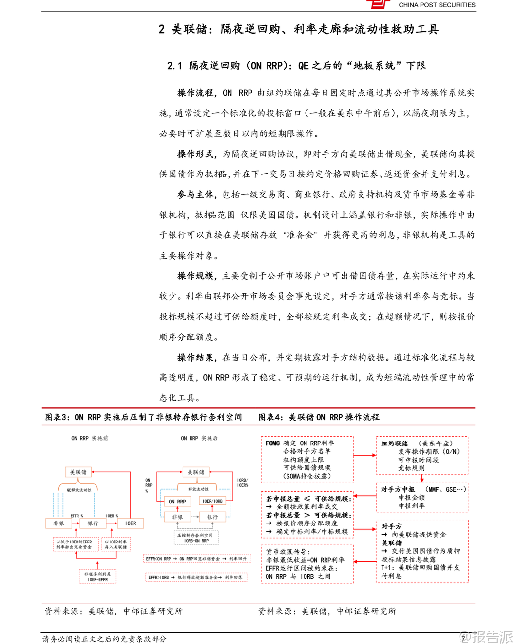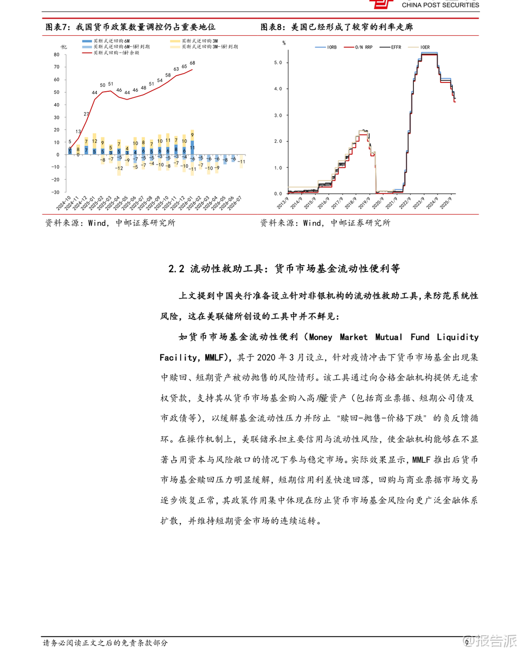 | 近期市场热议央行或将推出类似美联储ON RRP的“中国版隔夜逆回购工具”,但根据中邮证券梁伟超团队的研究分析,这一猜想存在明显误解。 当前投资者普遍将“向非银机构提供流动性”与“收窄利率走廊”混为一谈,而实际上,这两者在政策逻辑、操作对象和实施目标上均有本质区别。 首先,央行明确提出“建立在特定情景下向非银机构提供流动性的机制性安排”,但这并非日常流动性投放工具,而是定位于金融稳定框架下的应急救助机制。 近年来,货币基金、理财产品等非银机构在债券和回购市场中的参与度持续上升,已成为影响资产定价的重要力量。 一旦发生系统性流动性冲击,仅依赖银行体系传导流动性可能难以及时覆盖非银部门的风险外溢。 因此,设立面向非银的流动性支持机制,核心目的是防范金融市场道德风险,阻断“赎回—抛售—价格下跌”的负反馈循环,属于宏观审慎管理的延伸,而非常规利率调控手段。 其次,央行自2024年以来多次强调“适度收窄利率走廊宽度”。 目前我国的利率走廊以上限7天逆回购利率、下限超额存款准备金利率(IOER)构成,但实际运行中,DR007常大幅偏离政策利率中枢。 尤其在银行负债宽松时期,大行融出资金压低利率,导致短端利率长期低于IOER,削弱了政策利率的引导作用。 为此,央行已在2024年创设“临时正/逆回购操作”,设定利率分别为7天逆回购利率减20bp和加50bp,但至今未实际启用。 这表明,未来更可能通过新工具进一步框定利率运行区间,实现更精细化的短端调控。 值得注意的是,尽管市场将此类工具类比为“中国版ON RRP”,但中美两国的货币政策环境存在根本差异。 美联储设立ON RRP的核心背景是量化宽松后流动性严重过剩,银行体系准备金充足,导致IOER作为利率下限失效,必须通过向非银机构开放的逆回购工具回收冗余资金,形成“地板系统”。 而中国目前仍维持约6%的法定存款准备金率,流动性处于相对稀缺状态,IOER依然有效,不存在大规模流动性回收的需求。 因此,单独设立针对非银机构的流动性回收工具既无必要,也不符合当前政策框架。 基于此,中邮证券提出两大政策工具猜想:其一,为落实“利率走廊收窄”,可能推出面向一级交易商或大型银行的“存款便利”类工具。 该工具利率将高于当前IOER(如0.35%),但低于公开市场操作利率(如1.8%),作为银行存放央行资金的新渠道,从源头上约束资金融出利率的下限,避免DR001过度偏离。 其二,为落实“流动性救助”,可能创设定向支持非银机构的应急工具,如类似美联储MMLF的货币市场基金流动性便利,通过SPV或合作金融机构向非银提供融资支持,以应对极端市场冲击。 但由于现行《中国人民银行法》禁止央行直接向非银机构贷款,此类工具或需等待法律修订,或通过间接机制设计实现。 此外,研究指出,资金利率的偏离不仅受政策调控影响,也与银行负债状况密切相关。 例如2025年一季度,在非银活期监管加强背景下,银行负债承压,央行保持流动性克制,导致资金利率上行;而2022年则因银行资产收缩带来被动负债宽松,推动利率大幅下行。 这说明,银行作为流动性传导中枢,其资产负债行为对市场利率有决定性影响。 综合来看,央行未来的工具创新将围绕“利率走廊收窄”和“非银流动性救助”两条主线推进,前者侧重于提升利率调控效率,后者服务于金融稳定目标。 即便推出新工具,其操作对象大概率仍以银行或一级交易商为主,而非全面向非银开放。 因此,所谓“中国版ON RRP”的预期不宜高估。 工具创设虽具长期制度意义,但对短期市场的影响或将趋于中性。 投资者应关注央行对DR001的重视程度提升,以及在极端情景下非银救助机制的落地进展,而非简单对标海外经验进行套利推演。 本文由【报告派】研读,输出观点仅作为行业分析! 原文标题:2026-01-30-中邮证券-固收专题:货币“新工具”会是什么样? 发布时间:2026年 出品方:中邮证券