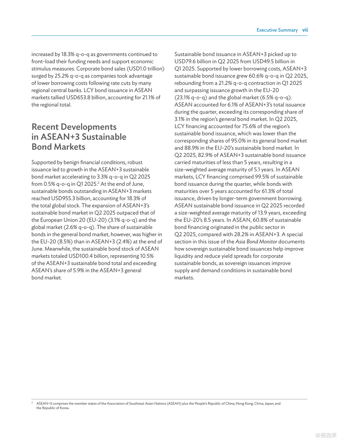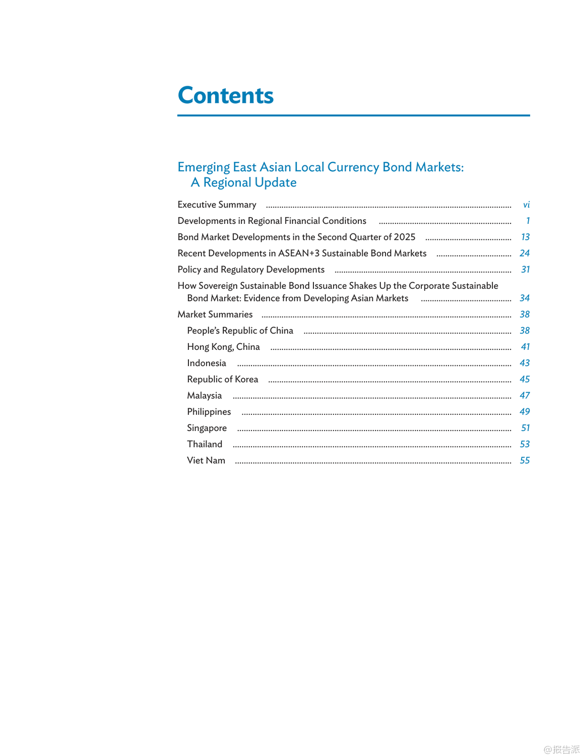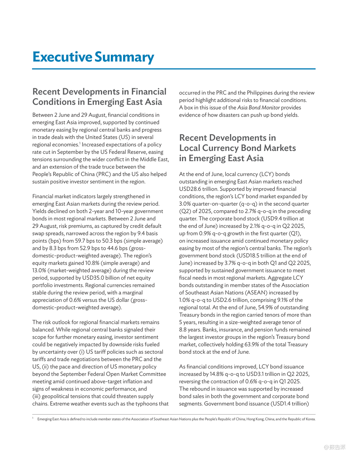 | 2025年第三季度,亚洲开发银行(ADB)发布的《亚洲债券监测》报告显示,新兴东亚地区的本地货币债券市场在第二季度延续扩张态势,整体规模达28.6万亿美元,环比增长3.0%,增速较第一季度有所提升。 这一增长主要得益于区域多国央行持续的货币宽松政策以及政府为应对经济不确定性而加大财政支出,推动了政府和企业债券发行的双轮驱动。 从结构上看,政府债券仍是市场的主导力量,截至6月底规模达18.5万亿美元,环比增长3.7%;企业债券规模增至9.4万亿美元,环比增长2.1%。 中国和韩国是推动区域债市增长的主要引擎,两国合计占区域总存量近九成。 其中,中国债市规模达23.1万亿美元,单季增长3.5%;韩国债市规模占其GDP比重高达130%,居区域首位。 相比之下,东盟国家债市虽仅占区域总量的9.1%,但其可持续债券发行占比却超过其在一般债券市场中的份额,显示出更强的绿色转型动力。 在可持续债券领域,东盟+3(ASEAN+3)市场表现亮眼。 二季度末,可持续债券存量达9553亿美元,环比增速高达3.3%,远超全球及欧盟市场。 尽管其占整体债券市场的比例(2.4%)仍低于欧盟(8.5%),但发展潜力巨大。 值得注意的是,区域内可持续债券融资以本地货币为主(占比75.6%),且东盟内部公共部门发行占比高达60.8%,显著高于东盟+3整体水平,反映出政府在引领绿色金融方面发挥着关键作用。 研究还特别指出,主权可持续债券的发行对提振企业级市场具有“催化剂”效应。 实证证据表明,当一个国家首次发行主权可持续债券后,企业可持续债券的流动性会改善(买卖价差收窄),融资成本也会下降(利差缩小)。 这种影响主要通过降低“绿色溢价”实现,说明主权发行能有效增强投资者信心、完善市场标准并提供定价基准,从而撬动更多私人资本进入可持续发展领域。 然而,市场也面临多重风险。 外部环境的不确定性,包括中美贸易政策走向、美联储未来加息路径以及地缘政治紧张局势,均可能冲击区域金融稳定。 此外,极端天气事件频发也凸显了气候相关金融风险,研究表明灾难发生后短期内主权借贷成本会上升,形成“灾害溢价”。 因此,报告建议各国政府需加强气候适应性投资、完善灾害保险机制,并通过战略性发行主权可持续债券来深化市场,以构建更具韧性的金融体系。 出品方:亚开行 发布时间:2025年 文档页数:49页