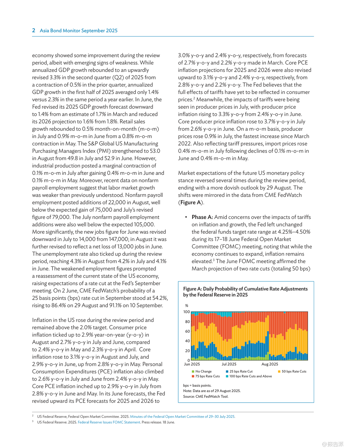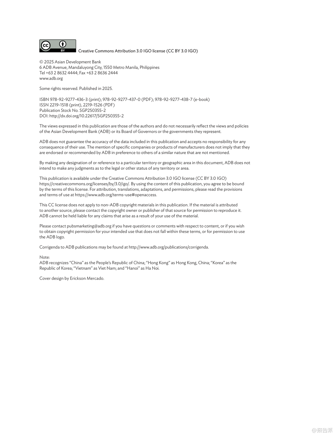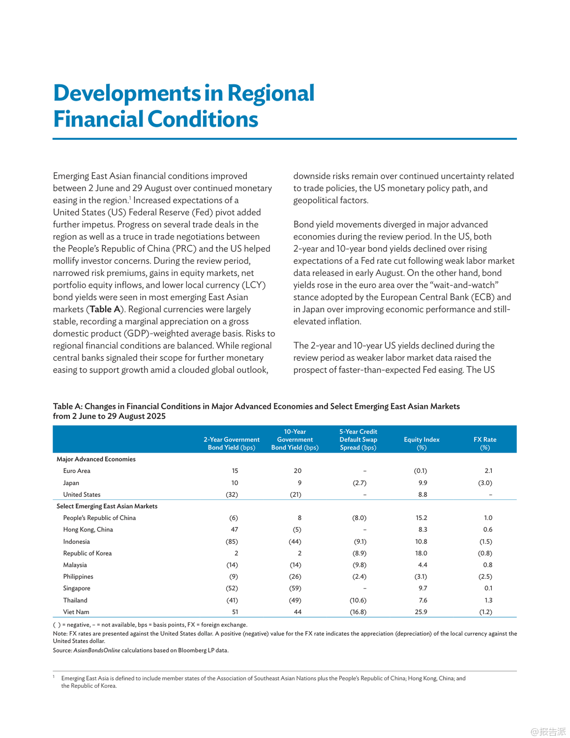 | 2025年第三季度,亚洲开发银行(ADB)发布的《亚洲债券监测》报告显示,新兴东亚地区的本地货币债券市场在第二季度延续扩张态势,整体规模达28.6万亿美元,环比增长3.0%,增速较第一季度有所提升。 这一增长主要得益于区域多国央行持续的货币宽松政策以及政府为应对经济不确定性而加大财政支出,推动了政府和企业债券发行的双轮驱动。 从结构上看,政府债券仍是市场的主导力量,截至6月底规模达18.5万亿美元,环比增长3.7%;企业债券规模增至9.4万亿美元,环比增长2.1%。 中国和韩国是推动区域债市增长的主要引擎,两国合计占区域总存量近九成。 其中,中国债市规模达23.1万亿美元,单季增长3.5%;韩国债市规模占其GDP比重高达130%,居区域首位。 相比之下,东盟国家债市虽仅占区域总量的9.1%,但其可持续债券发行占比却超过其在一般债券市场中的份额,显示出更强的绿色转型动力。 在可持续债券领域,东盟+3(ASEAN+3)市场表现亮眼。 二季度末,可持续债券存量达9553亿美元,环比增速高达3.3%,远超全球及欧盟市场。 尽管其占整体债券市场的比例(2.4%)仍低于欧盟(8.5%),但发展潜力巨大。 值得注意的是,区域内可持续债券融资以本地货币为主(占比75.6%),且东盟内部公共部门发行占比高达60.8%,显著高于东盟+3整体水平,反映出政府在引领绿色金融方面发挥着关键作用。 研究还特别指出,主权可持续债券的发行对提振企业级市场具有“催化剂”效应。 实证证据表明,当一个国家首次发行主权可持续债券后,企业可持续债券的流动性会改善(买卖价差收窄),融资成本也会下降(利差缩小)。 这种影响主要通过降低“绿色溢价”实现,说明主权发行能有效增强投资者信心、完善市场标准并提供定价基准,从而撬动更多私人资本进入可持续发展领域。 然而,市场也面临多重风险。 外部环境的不确定性,包括中美贸易政策走向、美联储未来加息路径以及地缘政治紧张局势,均可能冲击区域金融稳定。 此外,极端天气事件频发也凸显了气候相关金融风险,研究表明灾难发生后短期内主权借贷成本会上升,形成“灾害溢价”。 因此,报告建议各国政府需加强气候适应性投资、完善灾害保险机制,并通过战略性发行主权可持续债券来深化市场,以构建更具韧性的金融体系。 出品方:亚开行 发布时间:2025年 文档页数:49页