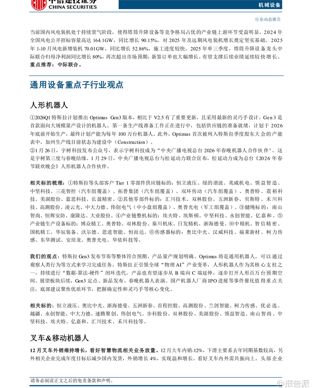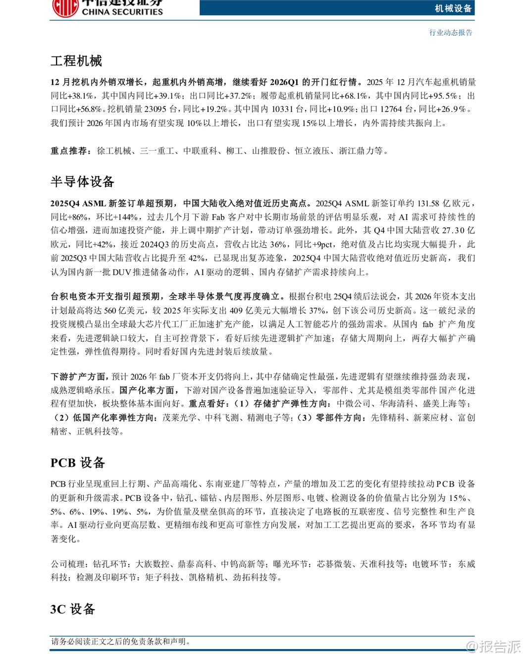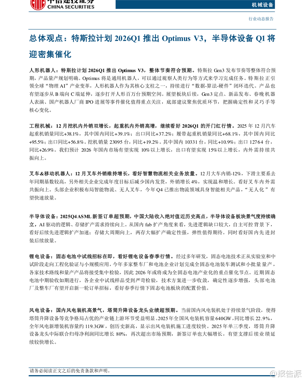 | 本报告由中信建投证券于2026年2月2日发布,围绕机械设备行业的多个核心子领域展开深入分析,重点聚焦人形机器人、工程机械、半导体设备、锂电设备等高成长性赛道,并提出“强于大市”的投资评级。 报告认为,2026年第一季度将是多个关键产业的密集催化期,具备较强的投资配置价值。 在人形机器人领域,特斯拉计划于2026年第一季度推出Optimus Gen3版本,标志着产品正式进入大规模量产准备阶段。 该机器人具备通用任务学习能力,可通过观察人类行为进行自主学习,是特斯拉引领“物理AI”变革的核心载体。 目前,其加州生产线正处于建设中,初步规划年产能达百万台。 报告指出,Optimus的迭代不仅推动“数据-算法-硬件”闭环的持续优化,更有望从B端应用逐步向C端消费市场延伸,打开百万台级别的长期空间。 后续值得关注的催化事件包括Gen3定点进展、新品发布、春晚机器人表演以及国产机器人厂商的IPO进程。 产业链方面,建议关注恒立液压、绿的谐波、奥比中光等核心零部件供应商及整机标的。 工程机械板块延续复苏态势。 2025年12月数据显示,挖机销量达23095台,同比增长19.2%,其中国内销售10331台(+10.9%),出口12764台(+26.9%),内外销双增;起重机表现更为亮眼,汽车起重机销量同比+38.1%,履带起重机销量同比高达+68.1%。 高增长主要受益于国内基建需求稳定、海外市场企稳复苏以及企业内部高质量发展战略。 报告预计2026年国内市场有望实现10%以上增长,出口增长15%以上,内外需共振向上趋势明确,看好一季度“开门红”行情。 半导体设备景气度持续确立,Q1将迎来密集催化。 2025年第四季度,全球龙头ASML新签订单达131.58亿欧元,同比大幅增长86%,中国大陆地区收入达27.30亿欧元,接近历史高点,占比提升至36%。 同时,台积电宣布2026年资本开支最高将达560亿美元,同比增长超37%,创下历史新高,凸显AI驱动下先进制程扩产的强劲需求。 报告认为,在自主可控背景下,国内先进逻辑芯片缺口较大,扩产加速确定性强;存储周期向上,NAND和DRAM两大领域扩产确定性高,弹性值得期待。 此外,国内先进封装技术有望迎来放量。 重点推荐中微公司、华海清科、盛美上海等存储设备厂商,以及茂莱光学、中科飞测等低国产化率环节的突破者。 锂电设备方面,固态电池产业化进程提速,2026年或成关键节点。 经过多年研发,全固态电池正从实验室走向工程化验证与小规模应用。 多家整车厂和电池企业计划在2026年完成装车测试和小批量量产,吉利、亿纬锂能等头部企业已宣布具体量产时间表。 近期固态电池中试线中期验收如期进行,技术方案进一步收敛,确定性增强。 报告预计,头部电池厂及整车厂有望在春季启动新一轮订单招标,带动相关设备企业进入业绩释放期,看好锂电设备春季行情。 建议关注在头部客户中份额领先且固态电池进展顺利的先导智能、先惠技术、海目星等设备商。 其他细分领域亦有亮点。 叉车&移动机器人方面,12月外销保持增长,头部企业积极布局无人叉车和物流领域具身智能产品,智慧物流“无人化”有望快速放量。 风电设备维持高景气,2025年全国风电新增装机创历史新高,塔筒升降设备龙头中际联合单季度净利润同比大增80%,业绩超预期。 工业气体、仪器仪表等领域也受益于流程工业设备出海、国产替代等趋势。 报告重点推荐恒立液压、三一重工、中微公司、先导智能、博众精工、中际联合等优质标的。 风险方面,报告提示需关注国内宏观经济波动、海外市场不确定性以及下游扩产不及预期可能带来的影响。 总体而言,报告认为机械设备行业在多重创新周期叠加下,结构性机会显著,尤其是人形机器人、半导体设备和固态电池等前沿科技领域,值得投资者重点关注。 本文由【报告派】研读,输出观点仅作为行业分析! 原文标题:2026-02-02-中信建投-机械设备行业周观点:特斯拉计划2026Q1推出Optimus V3,半导体设备Q1将迎密集催化 发布时间:2026年 报告出品方:中信建投 文档页数:42页