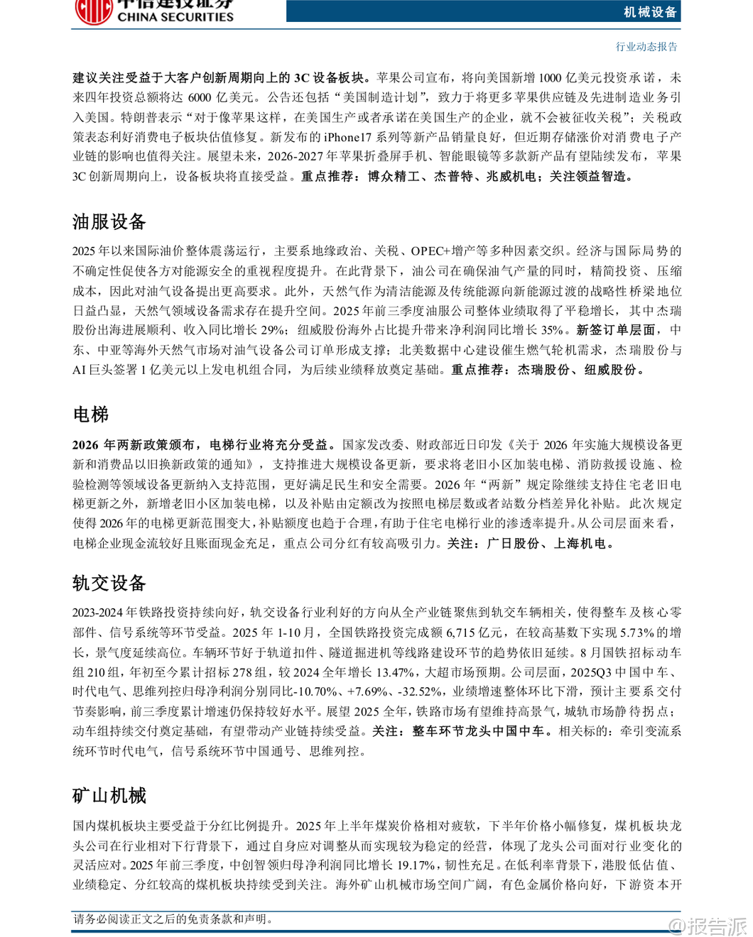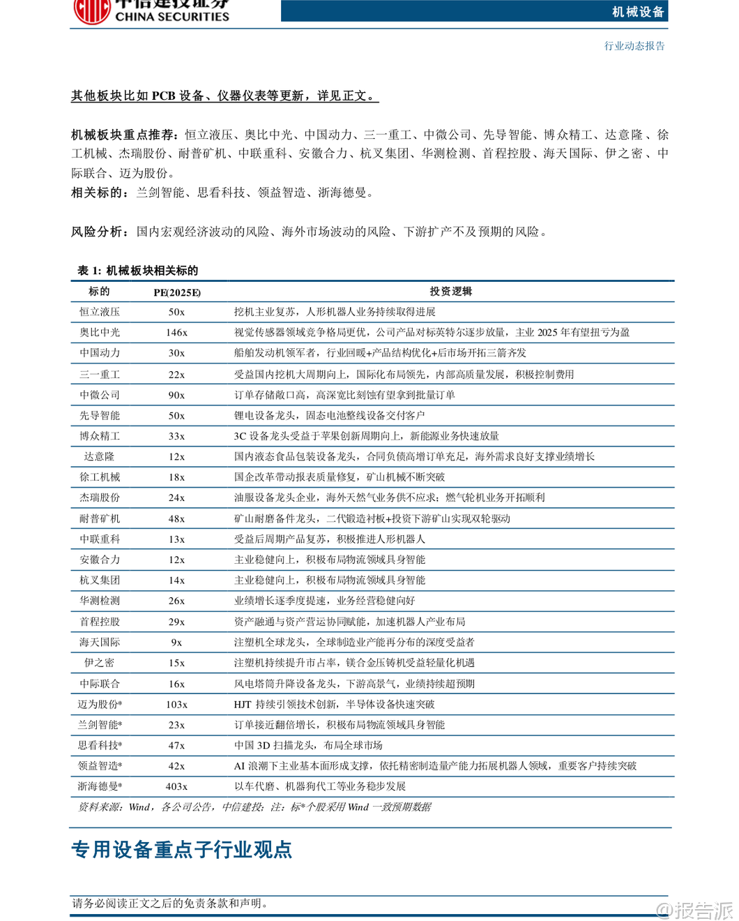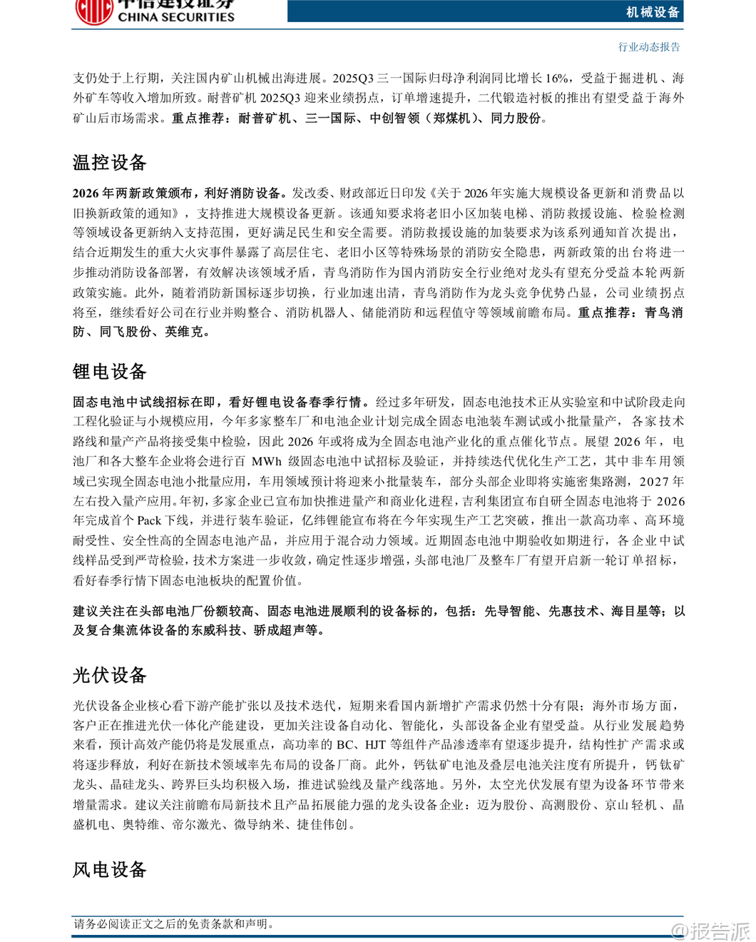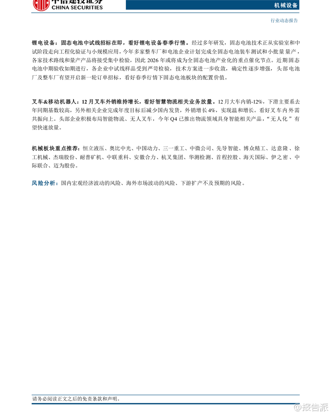 | 本报告由中信建投证券于2026年2月2日发布,围绕机械设备行业的多个核心子领域展开深入分析,重点聚焦人形机器人、工程机械、半导体设备、锂电设备等高成长性赛道,并提出“强于大市”的投资评级。 报告认为,2026年第一季度将是多个关键产业的密集催化期,具备较强的投资配置价值。 在人形机器人领域,特斯拉计划于2026年第一季度推出Optimus Gen3版本,标志着产品正式进入大规模量产准备阶段。 该机器人具备通用任务学习能力,可通过观察人类行为进行自主学习,是特斯拉引领“物理AI”变革的核心载体。 目前,其加州生产线正处于建设中,初步规划年产能达百万台。 报告指出,Optimus的迭代不仅推动“数据-算法-硬件”闭环的持续优化,更有望从B端应用逐步向C端消费市场延伸,打开百万台级别的长期空间。 后续值得关注的催化事件包括Gen3定点进展、新品发布、春晚机器人表演以及国产机器人厂商的IPO进程。 产业链方面,建议关注恒立液压、绿的谐波、奥比中光等核心零部件供应商及整机标的。 工程机械板块延续复苏态势。 2025年12月数据显示,挖机销量达23095台,同比增长19.2%,其中国内销售10331台(+10.9%),出口12764台(+26.9%),内外销双增;起重机表现更为亮眼,汽车起重机销量同比+38.1%,履带起重机销量同比高达+68.1%。 高增长主要受益于国内基建需求稳定、海外市场企稳复苏以及企业内部高质量发展战略。 报告预计2026年国内市场有望实现10%以上增长,出口增长15%以上,内外需共振向上趋势明确,看好一季度“开门红”行情。 半导体设备景气度持续确立,Q1将迎来密集催化。 2025年第四季度,全球龙头ASML新签订单达131.58亿欧元,同比大幅增长86%,中国大陆地区收入达27.30亿欧元,接近历史高点,占比提升至36%。 同时,台积电宣布2026年资本开支最高将达560亿美元,同比增长超37%,创下历史新高,凸显AI驱动下先进制程扩产的强劲需求。 报告认为,在自主可控背景下,国内先进逻辑芯片缺口较大,扩产加速确定性强;存储周期向上,NAND和DRAM两大领域扩产确定性高,弹性值得期待。 此外,国内先进封装技术有望迎来放量。 重点推荐中微公司、华海清科、盛美上海等存储设备厂商,以及茂莱光学、中科飞测等低国产化率环节的突破者。 锂电设备方面,固态电池产业化进程提速,2026年或成关键节点。 经过多年研发,全固态电池正从实验室走向工程化验证与小规模应用。 多家整车厂和电池企业计划在2026年完成装车测试和小批量量产,吉利、亿纬锂能等头部企业已宣布具体量产时间表。 近期固态电池中试线中期验收如期进行,技术方案进一步收敛,确定性增强。 报告预计,头部电池厂及整车厂有望在春季启动新一轮订单招标,带动相关设备企业进入业绩释放期,看好锂电设备春季行情。 建议关注在头部客户中份额领先且固态电池进展顺利的先导智能、先惠技术、海目星等设备商。 其他细分领域亦有亮点。 叉车&移动机器人方面,12月外销保持增长,头部企业积极布局无人叉车和物流领域具身智能产品,智慧物流“无人化”有望快速放量。 风电设备维持高景气,2025年全国风电新增装机创历史新高,塔筒升降设备龙头中际联合单季度净利润同比大增80%,业绩超预期。 工业气体、仪器仪表等领域也受益于流程工业设备出海、国产替代等趋势。 报告重点推荐恒立液压、三一重工、中微公司、先导智能、博众精工、中际联合等优质标的。 风险方面,报告提示需关注国内宏观经济波动、海外市场不确定性以及下游扩产不及预期可能带来的影响。 总体而言,报告认为机械设备行业在多重创新周期叠加下,结构性机会显著,尤其是人形机器人、半导体设备和固态电池等前沿科技领域,值得投资者重点关注。 本文由【报告派】研读,输出观点仅作为行业分析! 原文标题:2026-02-02-中信建投-机械设备行业周观点:特斯拉计划2026Q1推出Optimus V3,半导体设备Q1将迎密集催化 发布时间:2026年 报告出品方:中信建投 文档页数:42页