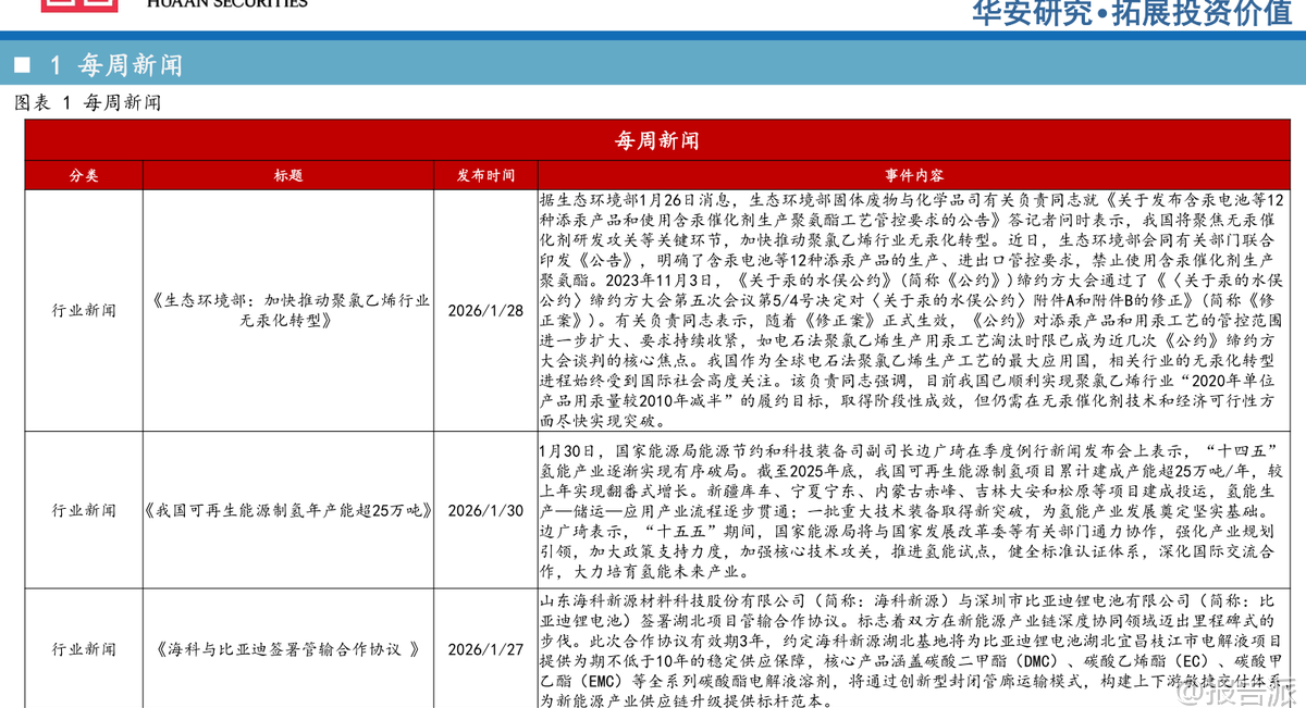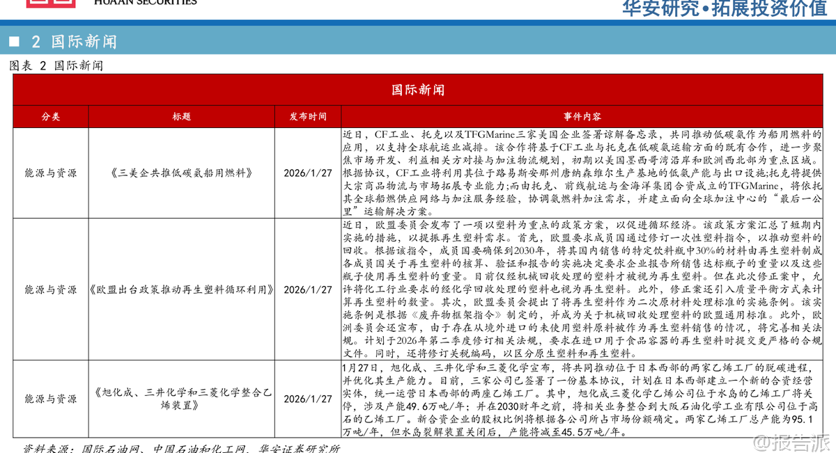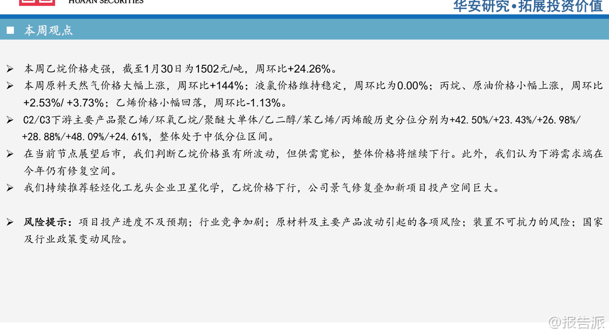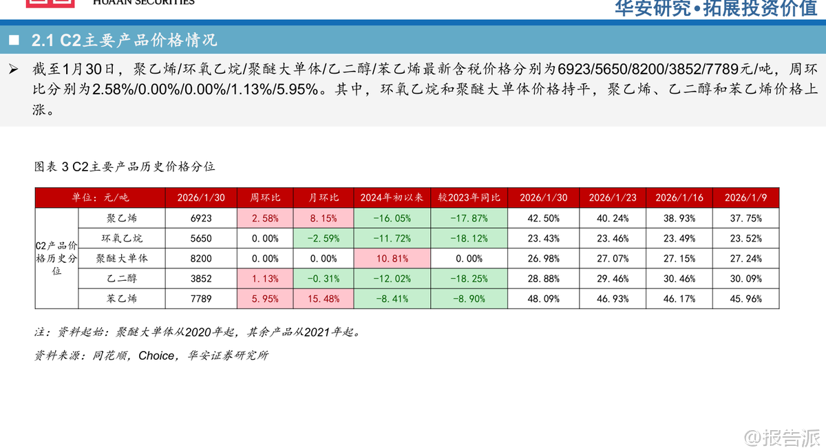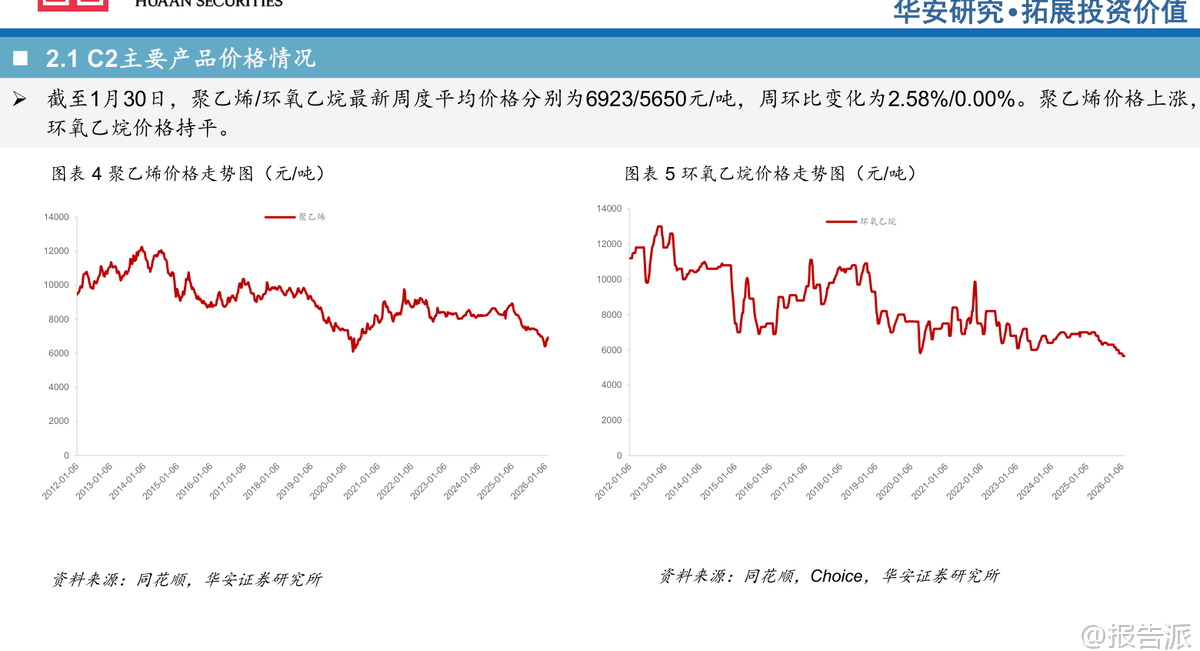 | 本周烯烃市场呈现原料价格剧烈波动、下游产品分化运行的格局。 乙烷价格大幅上涨,截至1月30日达1502元/吨,周环比上涨24.26%,但华安证券判断当前供需整体宽松,未来价格仍有下行空间。 与此同时,天然气作为关键能源和原料,价格出现极端飙升,达到25.01美元/百万英热单位,周环比暴涨144.43%,创近期新高,反映出短期供应紧张或市场情绪影响显著。 其他原料方面,丙烷和原油价格也小幅走强,分别上涨2.53%和3.73%,而乙烯价格则小幅回落1.13%至5399元/吨。 从C2下游产品来看,价格走势出现分化。 聚乙烯、乙二醇和苯乙烯价格上扬,涨幅分别为2.58%、1.13%和5.95%;环氧乙烷和聚醚大单体价格保持稳定。 历史价格分位数据显示,当前多数C2产品仍处于中低分位区间,其中苯乙烯以48.09%的分位居首,聚乙烯为42.50%,乙二醇为28.88%,环氧乙烷为23.43%,聚醚大单体为26.98%,表明整体行业景气度尚未进入高位。 C3系列产品中,聚丙烯价格上涨2.06%,而丙烯酸和丙烯酸丁酯价格持平。 丙烯酸的历史价格分位为24.61%,处于较低水平,显示出该细分领域仍面临一定压力。 价差分析揭示了产业链利润的重新分配。 在C2路线中,尽管乙烯-乙烷价差因乙烷成本快速上升而收窄11.20%,但下游深加工环节的利润空间普遍扩大。 乙二醇-乙烯、环氧乙烷-乙烯、聚乙烯-乙烯以及苯乙烯-纯苯-乙烯的价差周环比分别扩大15.01%、3.12%、18.28%和15.63%,说明即使上游原料成本增加,主要衍生物的加工利润依然得到修复或维持。 在C3路线中,丙烯-丙烷价差大幅扩张36.58%,显示PDH(丙烷脱氢)路线盈利性显著改善。 然而,聚丙烯-丙烯价差却大幅收窄28.62%,表明下游聚丙烯环节的加工利润被严重挤压。 横向对比不同生产工艺路线,成本优势格局清晰。 在乙烯生产领域,乙烷裂解路线的现金成本和完全成本显著低于石脑油裂解和煤制烯烃(CTO/MTO),展现出突出的成本竞争力。 近期乙烷价格虽有波动,但其相对于其他原料的经济性优势仍在拉大。 相比之下,在丙烯生产方面,PDH路线目前盈利不佳,其完全成本未显示出明显优势,行业整体处于盈亏平衡甚至亏损的边缘。 下游需求端释放出积极信号。 汽车销量和房地产竣工面积是重要的需求风向标。 截至2025年11月,汽车销量单月达303.7万辆,同比稳步增长;房屋竣工面积单月高达4593万平方米,同比大幅上升23.07%,创下近年新高。 地产端的强劲复苏为聚乙烯、聚丙烯等通用塑料带来了直接的需求拉动,预示着今年化工品需求端仍有较大的修复空间。 政策与行业动态方面,国内外均在推动产业转型升级。 国内生态环境部加速推进聚氯乙烯行业的无汞化转型,对电石法PVC工艺构成长期政策压力,利好采用乙烯法等更环保工艺的企业。 国家能源局披露,我国可再生能源制氢年产能已超25万吨,较上年翻番,氢能产业链正加速形成。 国际上,欧盟出台新政大力推动再生塑料循环利用,要求到2030年饮料瓶中再生塑料含量达30%,并允许将化学回收塑料计入再生料范畴,这将深刻影响全球塑料供应链。 此外,旭化成、三井化学和三菱化学宣布整合日本西部的乙烯装置,通过关停老旧产能、优化布局来实现脱碳目标,反映了全球化工巨头应对气候变化的战略调整。 在投资标的上,报告重点推荐轻烃化工龙头企业卫星化学。 核心逻辑在于,公司以乙烷为原料,其成本与乙烷价格高度相关。 当前乙烷价格虽短期冲高,但分析师认为其长期将回归下行通道,这将直接增厚公司的利润空间。 同时,公司自身的新项目即将投产,有望带来巨大的业绩增量。 从估值角度看,根据1月30日收盘价,卫星化学2024年市盈率为11.41倍,2025年预期市盈率为14.76倍,2026年预期市盈率降至9.67倍,显示出较高的成长性和投资性价比。 综合来看,当前烯烃行业正处于一个成本波动与需求复苏交织的阶段。 短期原料价格的剧烈变动考验着企业的运营能力,但从中期视角看,以乙烷裂解为代表的低成本路线竞争优势稳固,下游地产和汽车需求回暖提供了有力支撑。 在此背景下,拥有低成本原料保障、技术先进且具备持续扩张能力的龙头企业,如卫星化学,将迎来景气修复与成长放量的双重机遇。 投资者需关注乙烷价格后续走势、新项目投产进度以及下游需求的持续性,警惕项目不及预期、行业竞争加剧及政策变动等风险。 本文由【报告派】研读,输出观点仅作为行业分析! 原文标题:原文标题:2026-02-02-华安证券-华安证券-卫星化学及烯烃行业周度动态跟踪 发布时间:2026年 报告出品方:华安证券 文档页数:34页