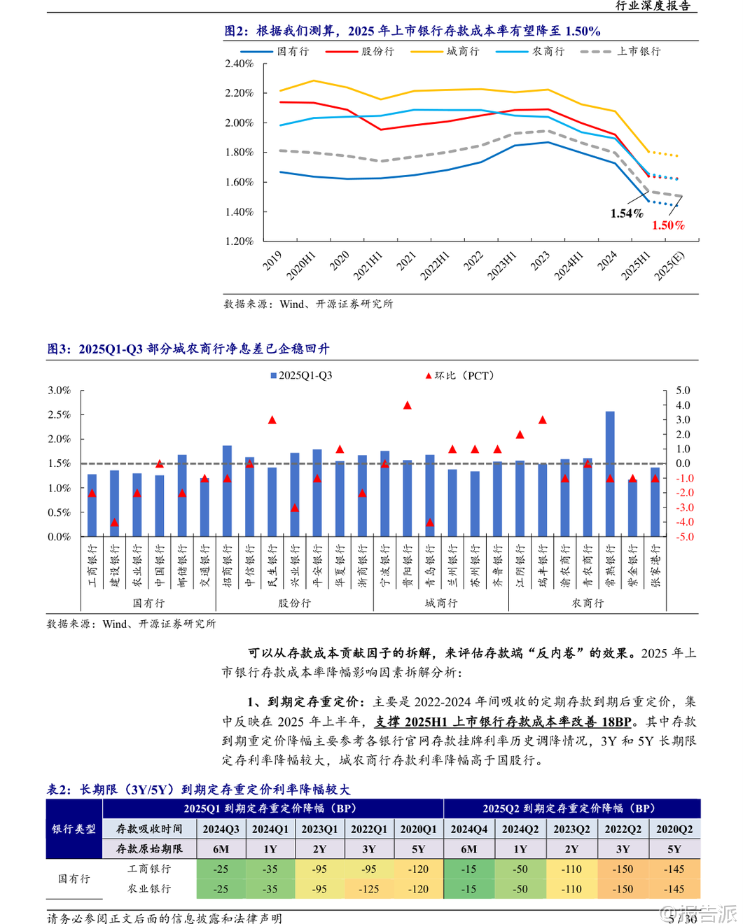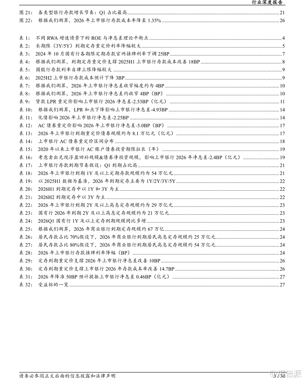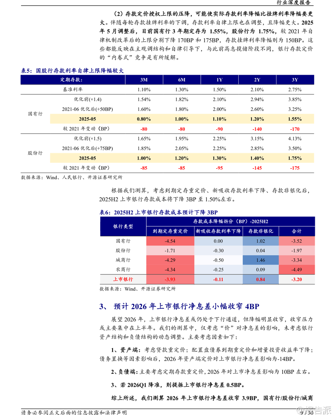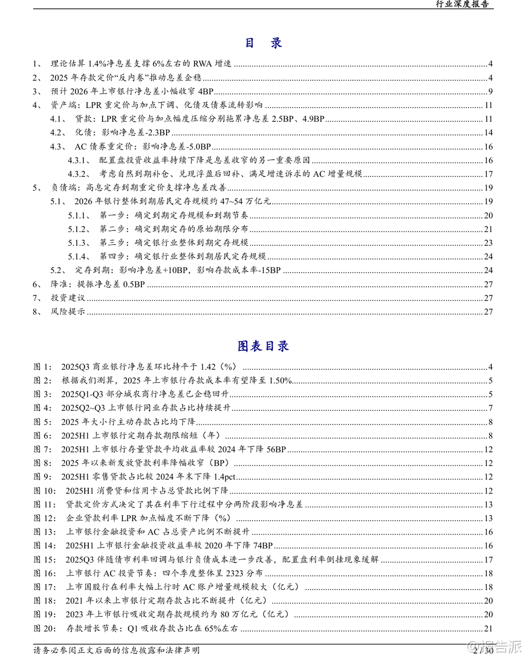 | 2026年银行净息差有望筑底企稳,尽管仍面临小幅收窄压力。 根据开源证券发布的《2026年净息差展望:筑底企稳》深度报告,预计2026年上市银行净息差将同比收窄约4BP,降幅明显趋缓,整体呈现“前高后低”的走势,主要改善动力来自负债端高息定期存款的集中到期重定价。 报告指出,2025年第三季度商业银行净息差已降至1.42%,低于维持6%-7%风险加权资产(RWA)增速所需的理论平衡点1.44%-1.57%。 这表明银行资产扩张正面临内生资本补充的硬约束,“稳息差”成为2026年银行业核心经营目标。 不过,得益于2025年以来存款定价“反内卷”政策的持续深化,息差下行趋势已得到初步遏制,部分城农商行在2025年前三季度甚至出现净息差企稳回升态势。 从2026年的核心影响因素看,资产端与负债端呈现“一降一升”的对冲格局。 资产端方面,三重压力将持续拖累息差表现。 其一,贷款重定价是最大拖累项,预计影响净息差-7.5BP,其中LPR每年一次的重定价贡献-2.5BP,而存量贷款到期续作时LPR加点幅度的普遍压缩则贡献-4.9BP,反映出银行在信贷竞争中议价能力的下降。 其二,地方政府债务置换进程继续推进,预计影响净息差-2.3BP。 其三,配置盘债券(AC账户)的重定价及增量投资收益率下滑,预计将拖累净息差-5.0BP。 近年来银行金融投资占总资产比重持续提升,但债市利率下行导致再配置收益走低,形成显著的息差压力。 相比之下,负债端迎来关键利好。 最大的积极因素是2026年将迎来高息定期存款的集中到期重定价窗口。 据测算,2026年上市银行到期定期存款规模高达53.8万亿元,其中上半年到期占比达60%,主要集中于国有大行。 这部分在2021-2023年高利率时期吸收的长期限、高成本存款,在2026年将按照当前更低的挂牌利率进行重定,预计将为上市银行节约利息支出,并直接支撑净息差改善+10BP,同时推动2026年上市银行存款平均成本率下降15BP至1.35%的历史低位。 此外,若央行在2026年第一季度降准50个基点,则可额外释放长期资金并降低银行负债成本,预计能进一步提振上市银行全年净息差0.46BP。 综合来看,尽管资产端的多重因素合计带来约-14BP的压力,但负债端仅定存重定价一项就可贡献+10BP的改善,再加上潜在的降准利好,最终使得2026年净息差的整体收窄幅度被有效控制在4BP左右,远好于此前市场悲观预期。 这意味着银行净息差最困难的时期或已过去,正在进入筑底企稳的新阶段。 基于此判断,报告给出了明确的投资建议。 推荐采取分层配置策略:(1)底仓配置大型国有银行,如农业银行、工商银行,其受益于Q1大规模的高息定存到期,负债成本改善最为显著;(2)核心配置头部综合龙头股份行,如招商银行、兴业银行,并推荐中信银行,它们兼具稳健的基本面和较强的综合服务能力;(3)弹性配置部分业绩增长潜力较大的区域性银行,如江苏银行、重庆银行、渝农商行等。 当然,报告也提示了两大主要风险:一是宏观经济增速若不及预期,可能导致信贷需求疲软和资产质量承压;二是债市利率若出现大幅波动,将直接影响银行FVTPL账户的市值和当期利润,进而影响业绩的稳定性。 总体而言,该报告为投资者描绘了一幅2026年银行业在息差压力缓解背景下逐步修复的图景。 本文由【报告派】研读,输出观点仅作为行业分析! 原文标题:原文标题:2026-02-03-开源证券-开源证券-银行行业深度报告:2026年净息差展望,筑底企稳 发布时间:2026年 报告出品方:开源证券