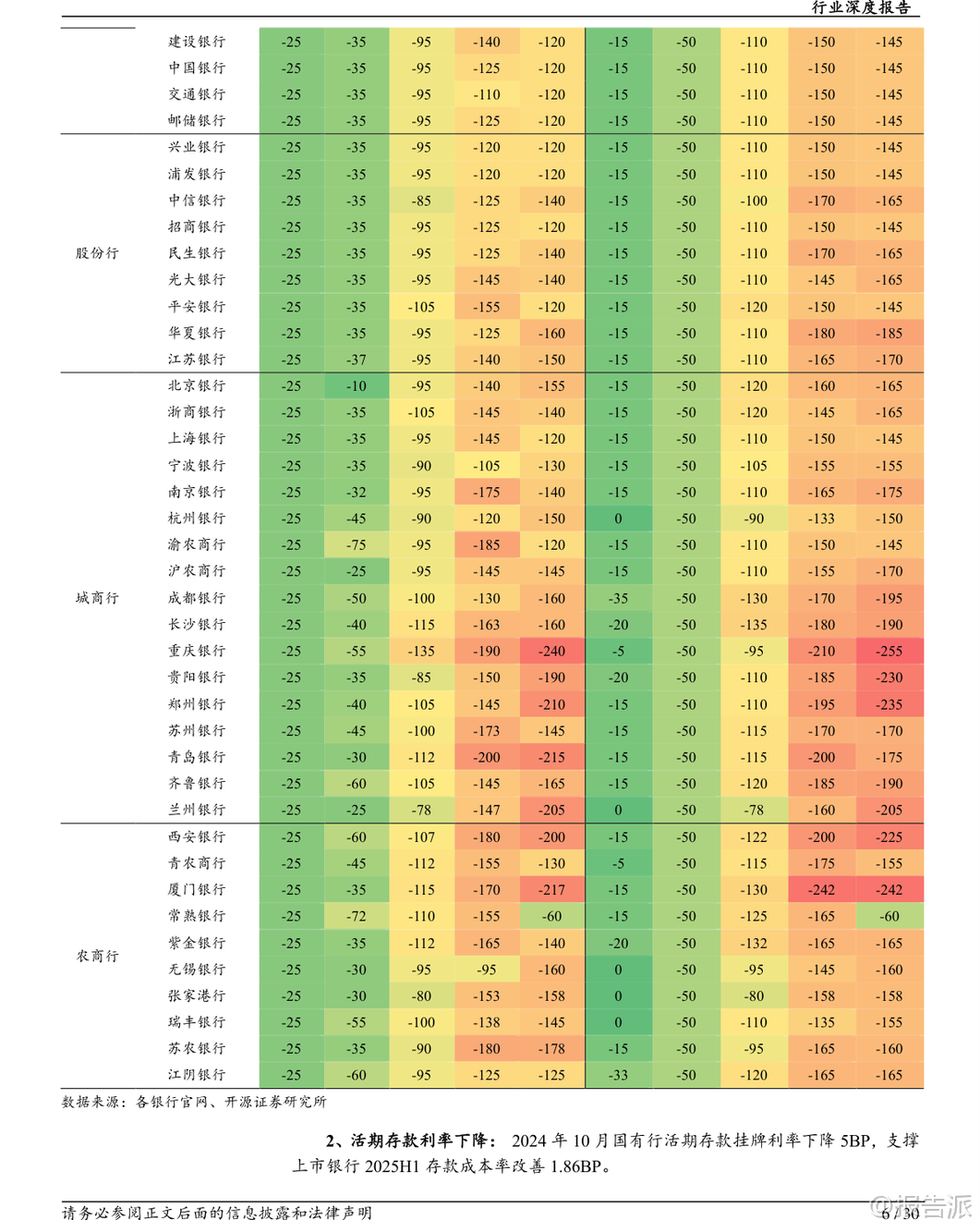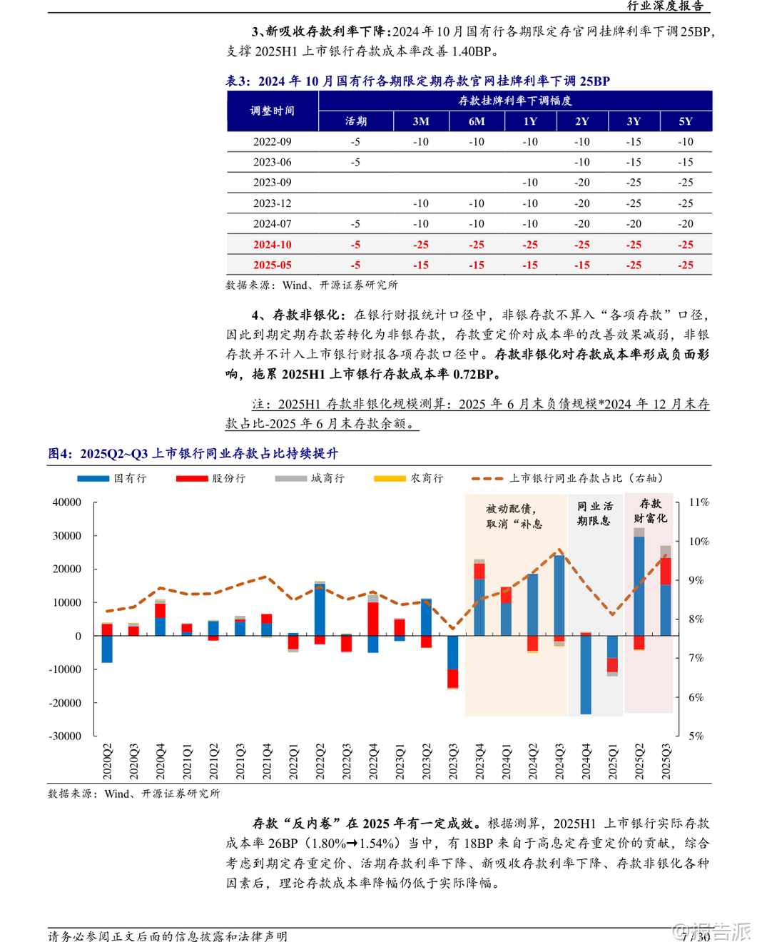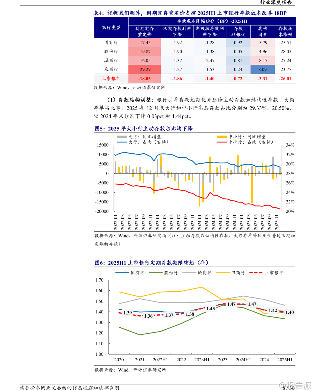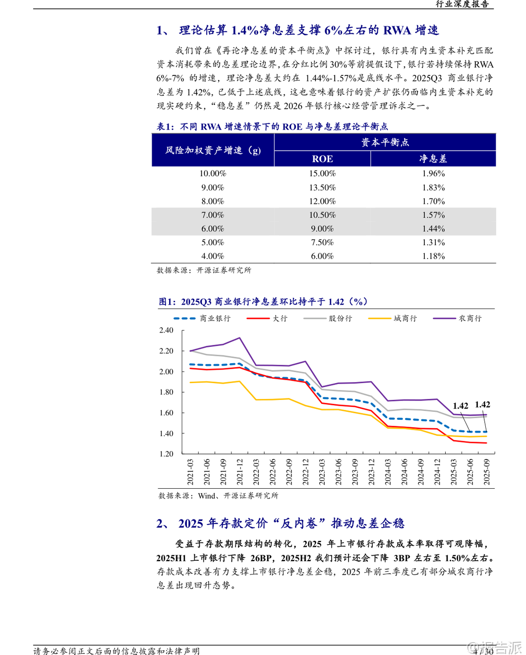 | 2026年银行净息差有望筑底企稳,尽管仍面临小幅收窄压力。 根据开源证券发布的《2026年净息差展望:筑底企稳》深度报告,预计2026年上市银行净息差将同比收窄约4BP,降幅明显趋缓,整体呈现“前高后低”的走势,主要改善动力来自负债端高息定期存款的集中到期重定价。 报告指出,2025年第三季度商业银行净息差已降至1.42%,低于维持6%-7%风险加权资产(RWA)增速所需的理论平衡点1.44%-1.57%。 这表明银行资产扩张正面临内生资本补充的硬约束,“稳息差”成为2026年银行业核心经营目标。 不过,得益于2025年以来存款定价“反内卷”政策的持续深化,息差下行趋势已得到初步遏制,部分城农商行在2025年前三季度甚至出现净息差企稳回升态势。 从2026年的核心影响因素看,资产端与负债端呈现“一降一升”的对冲格局。 资产端方面,三重压力将持续拖累息差表现。 其一,贷款重定价是最大拖累项,预计影响净息差-7.5BP,其中LPR每年一次的重定价贡献-2.5BP,而存量贷款到期续作时LPR加点幅度的普遍压缩则贡献-4.9BP,反映出银行在信贷竞争中议价能力的下降。 其二,地方政府债务置换进程继续推进,预计影响净息差-2.3BP。 其三,配置盘债券(AC账户)的重定价及增量投资收益率下滑,预计将拖累净息差-5.0BP。 近年来银行金融投资占总资产比重持续提升,但债市利率下行导致再配置收益走低,形成显著的息差压力。 相比之下,负债端迎来关键利好。 最大的积极因素是2026年将迎来高息定期存款的集中到期重定价窗口。 据测算,2026年上市银行到期定期存款规模高达53.8万亿元,其中上半年到期占比达60%,主要集中于国有大行。 这部分在2021-2023年高利率时期吸收的长期限、高成本存款,在2026年将按照当前更低的挂牌利率进行重定,预计将为上市银行节约利息支出,并直接支撑净息差改善+10BP,同时推动2026年上市银行存款平均成本率下降15BP至1.35%的历史低位。 此外,若央行在2026年第一季度降准50个基点,则可额外释放长期资金并降低银行负债成本,预计能进一步提振上市银行全年净息差0.46BP。 综合来看,尽管资产端的多重因素合计带来约-14BP的压力,但负债端仅定存重定价一项就可贡献+10BP的改善,再加上潜在的降准利好,最终使得2026年净息差的整体收窄幅度被有效控制在4BP左右,远好于此前市场悲观预期。 这意味着银行净息差最困难的时期或已过去,正在进入筑底企稳的新阶段。 基于此判断,报告给出了明确的投资建议。 推荐采取分层配置策略:(1)底仓配置大型国有银行,如农业银行、工商银行,其受益于Q1大规模的高息定存到期,负债成本改善最为显著;(2)核心配置头部综合龙头股份行,如招商银行、兴业银行,并推荐中信银行,它们兼具稳健的基本面和较强的综合服务能力;(3)弹性配置部分业绩增长潜力较大的区域性银行,如江苏银行、重庆银行、渝农商行等。 当然,报告也提示了两大主要风险:一是宏观经济增速若不及预期,可能导致信贷需求疲软和资产质量承压;二是债市利率若出现大幅波动,将直接影响银行FVTPL账户的市值和当期利润,进而影响业绩的稳定性。 总体而言,该报告为投资者描绘了一幅2026年银行业在息差压力缓解背景下逐步修复的图景。 本文由【报告派】研读,输出观点仅作为行业分析! 原文标题:原文标题:2026-02-03-开源证券-开源证券-银行行业深度报告:2026年净息差展望,筑底企稳 发布时间:2026年 报告出品方:开源证券
