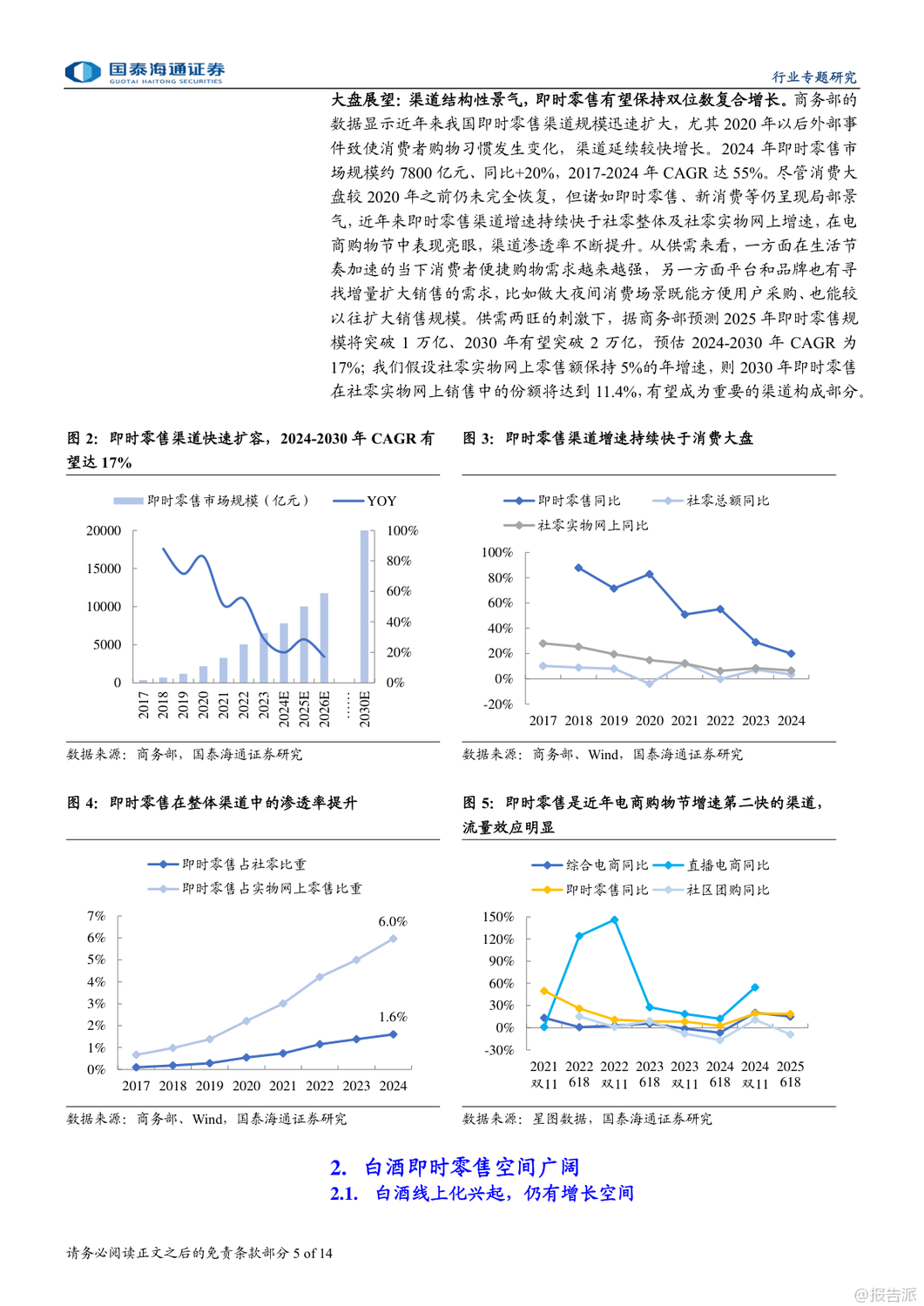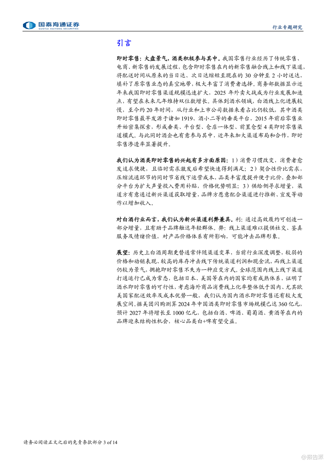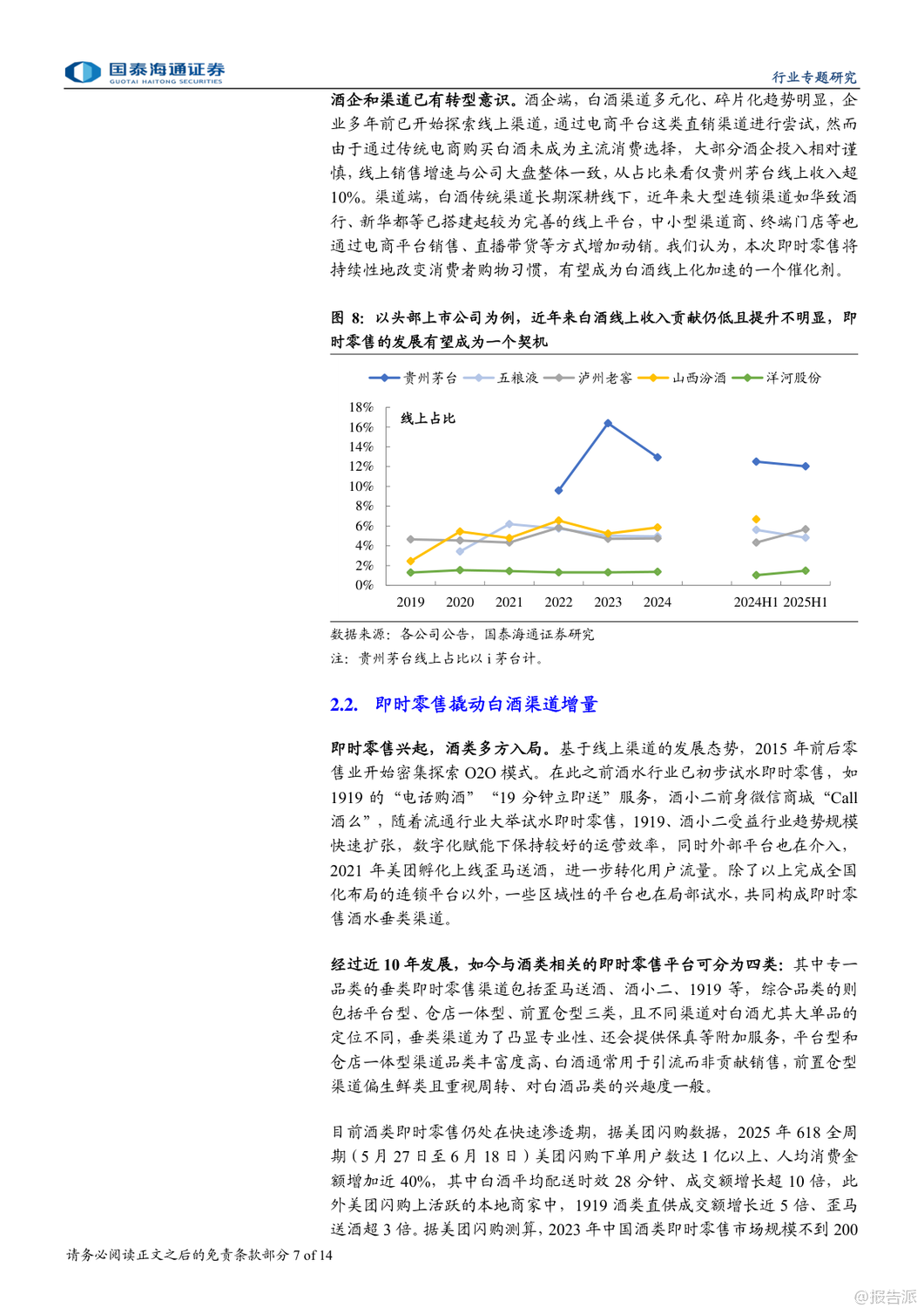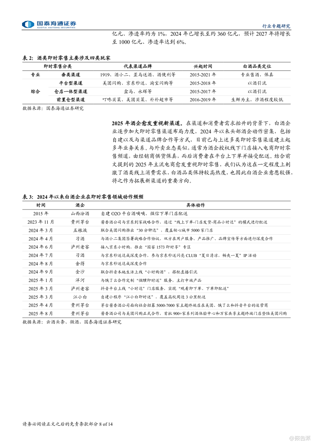 | 即时零售正成为酒类消费的新风口,尤其在白酒行业深度调整的背景下,这一渠道的崛起被视为结构性增长的重要突破口。 国泰海通最新发布的《白酒:即时零售渠道兴起》专题报告指出,2025年以来,在供需双重驱动下,即时零售渠道加速扩张,为白酒品牌提供了全新的增长路径。 报告显示,我国即时零售市场规模在2024年已达7800亿元,同比增长20%,预计2025年将突破万亿元,2030年有望达到2万亿元,未来六年复合增速约17%。 其中,酒类即时零售虽起步较晚,但增长迅猛。 据美团闪购测算,2024年中国酒类即时零售规模已达360亿元,预计到2027年将攀升至1000亿元,复合增速接近中双位数。 白酒和啤酒作为核心品类,将成为主要受益者。 即时零售的兴起源于三大动因:一是消费习惯变迁,年轻群体更追求便捷与即时满足;二是性价比优势明显,通过压缩流通环节、降低运营成本,叠加平台补贴,价格更具竞争力;三是供给侧主动求变,渠道方寻求增量,品牌方则希望通过新渠道触达更多消费者,尤其是年轻客群。 目前酒类即时零售已形成四类模式:垂类平台(如1919、酒小二、歪马送酒)、平台型(如美团闪购、京东秒送、淘宝闪购)、仓店一体型(如盒马、永辉)和前置仓型(如叮咚买菜、美团买菜)。 其中,垂类平台强调专业性和保真服务,而综合平台则多以白酒作为引流工具。 头部酒企已在积极布局。 贵州茅台、五粮液、泸州老窖等纷纷与美团、京东、抖音等平台合作,推出“30分钟达”“小时达”等服务。 2025年,茅台酱香酒公司更与美团闪购正式合作,超万家终端门店上线,标志着大品牌对即时零售的战略重视。 中酒协调研显示,2025年一季度,多数酒企线上业务实现持平或正增长,即时零售已成为企业拓展的主要方向之一。 不过,即时零售也带来挑战。 线上渠道难以提供线下特有的社交体验、鉴真服务和情绪价值,部分平台低价销售还可能冲击价格体系,影响品牌形象。 例如,飞天茅台在部分即时零售渠道售价波动剧烈,曾引发批价下行。 因此,报告建议酒企需把握渠道边界,避免核心单品沦为纯引流工具,同时加强产品区隔和数字化防伪建设。 投资层面,报告推荐具备强渠道力和资金实力的全国化名酒及区域龙头,如贵州茅台、山西汾酒、五粮液、泸州老窖、古井贡酒等,短期弹性标的关注珍酒李渡、舍得、酒鬼酒。 啤酒板块则推荐青岛啤酒、珠江啤酒、华润啤酒。 总体来看,即时零售不仅是渠道变革,更是白酒行业应对周期调整、连接新一代消费者的关键抓手。 尽管存在价格管控等风险,但其带来的增量机会不容忽视。 未来,谁能更好平衡效率与品牌价值,谁就将在新渠道竞争中占据先机。 出品方:国泰海通 发布时间:2025年