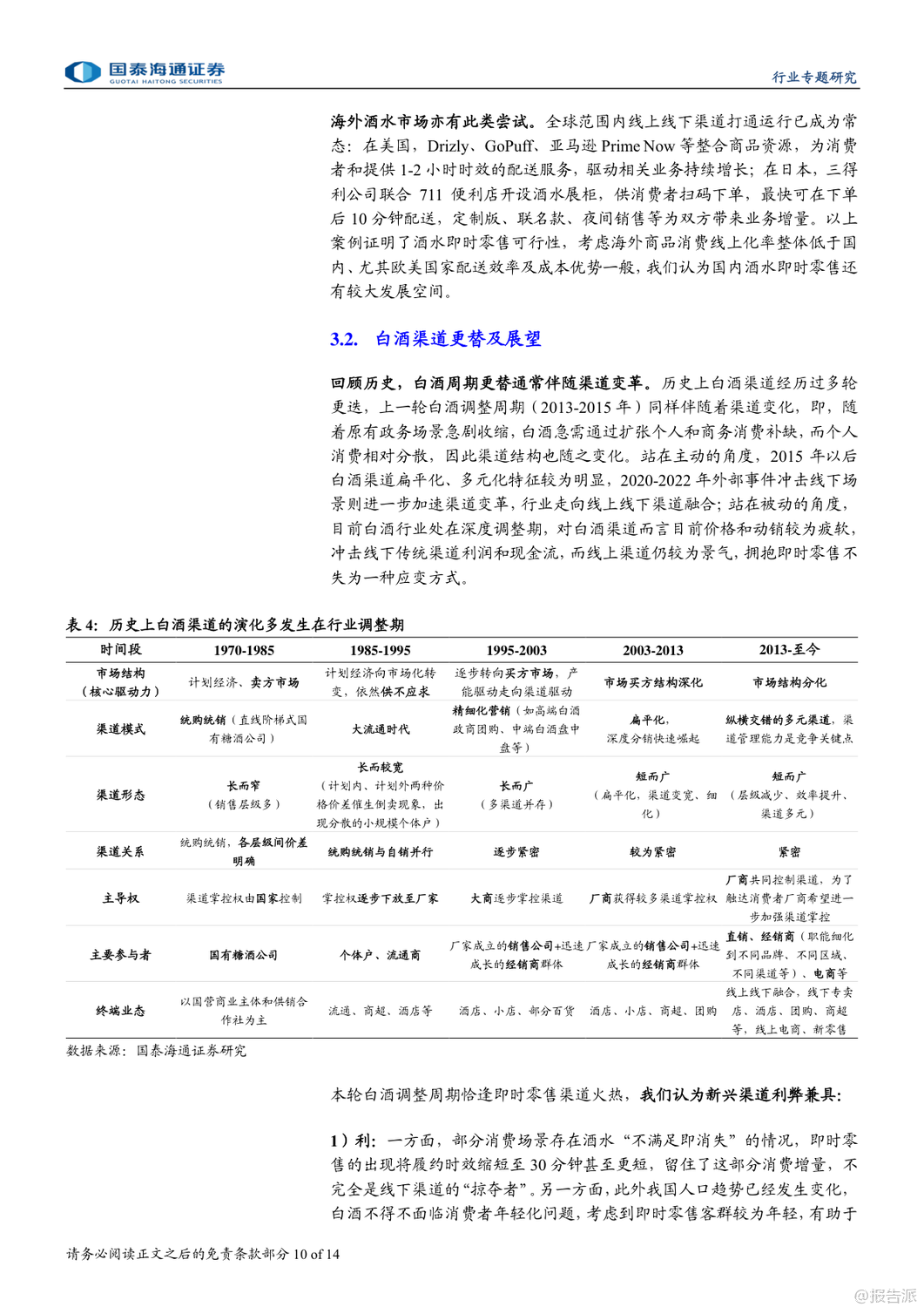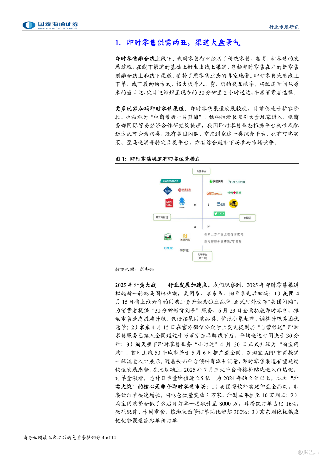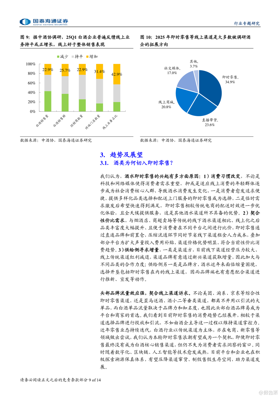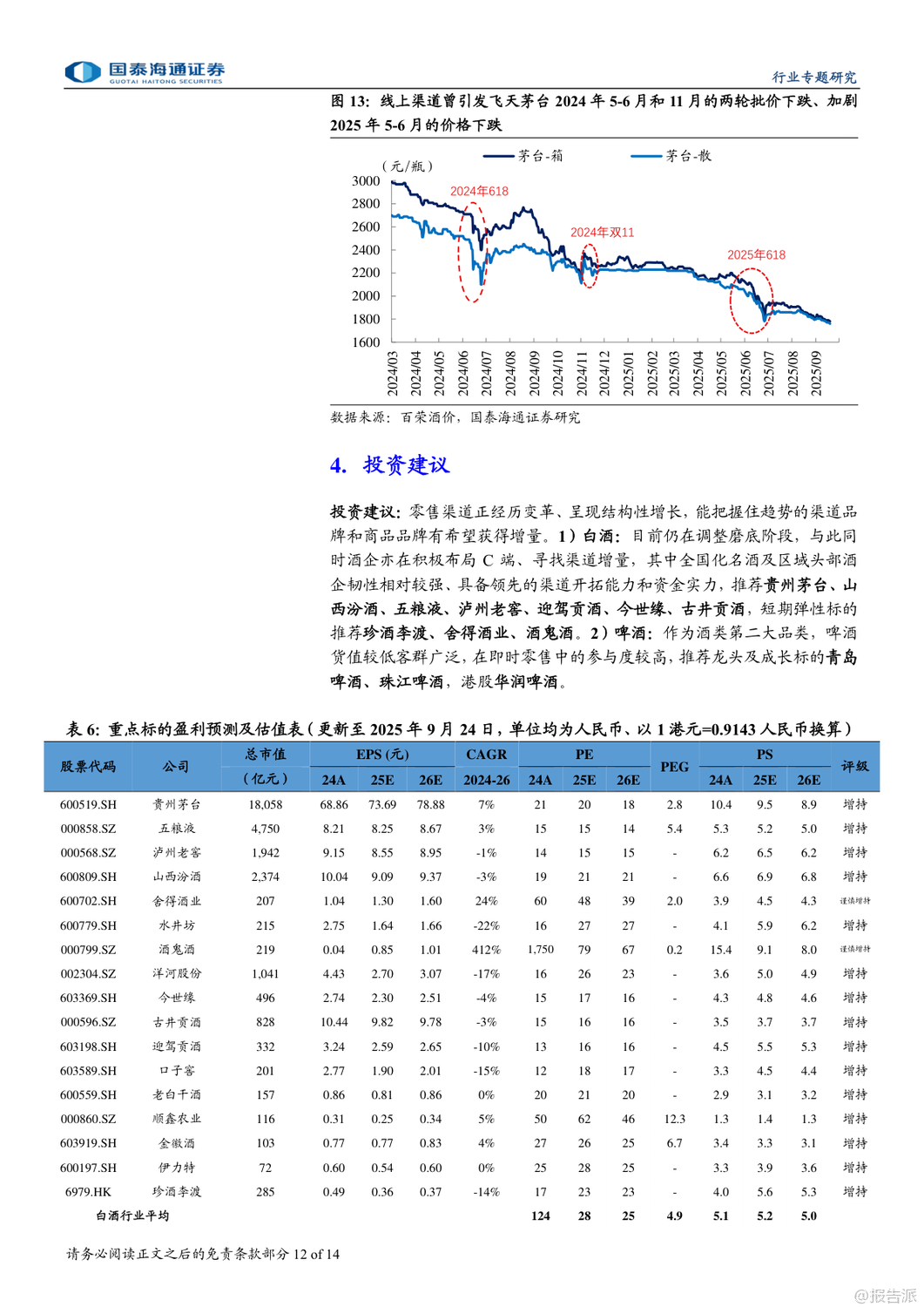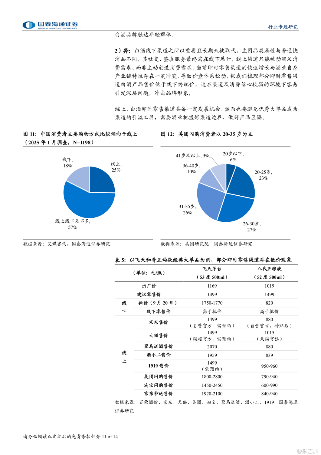 | 即时零售正成为酒类消费的新风口,尤其在白酒行业深度调整的背景下,这一渠道的崛起被视为结构性增长的重要突破口。 国泰海通最新发布的《白酒:即时零售渠道兴起》专题报告指出,2025年以来,在供需双重驱动下,即时零售渠道加速扩张,为白酒品牌提供了全新的增长路径。 报告显示,我国即时零售市场规模在2024年已达7800亿元,同比增长20%,预计2025年将突破万亿元,2030年有望达到2万亿元,未来六年复合增速约17%。 其中,酒类即时零售虽起步较晚,但增长迅猛。 据美团闪购测算,2024年中国酒类即时零售规模已达360亿元,预计到2027年将攀升至1000亿元,复合增速接近中双位数。 白酒和啤酒作为核心品类,将成为主要受益者。 即时零售的兴起源于三大动因:一是消费习惯变迁,年轻群体更追求便捷与即时满足;二是性价比优势明显,通过压缩流通环节、降低运营成本,叠加平台补贴,价格更具竞争力;三是供给侧主动求变,渠道方寻求增量,品牌方则希望通过新渠道触达更多消费者,尤其是年轻客群。 目前酒类即时零售已形成四类模式:垂类平台(如1919、酒小二、歪马送酒)、平台型(如美团闪购、京东秒送、淘宝闪购)、仓店一体型(如盒马、永辉)和前置仓型(如叮咚买菜、美团买菜)。 其中,垂类平台强调专业性和保真服务,而综合平台则多以白酒作为引流工具。 头部酒企已在积极布局。 贵州茅台、五粮液、泸州老窖等纷纷与美团、京东、抖音等平台合作,推出“30分钟达”“小时达”等服务。 2025年,茅台酱香酒公司更与美团闪购正式合作,超万家终端门店上线,标志着大品牌对即时零售的战略重视。 中酒协调研显示,2025年一季度,多数酒企线上业务实现持平或正增长,即时零售已成为企业拓展的主要方向之一。 不过,即时零售也带来挑战。 线上渠道难以提供线下特有的社交体验、鉴真服务和情绪价值,部分平台低价销售还可能冲击价格体系,影响品牌形象。 例如,飞天茅台在部分即时零售渠道售价波动剧烈,曾引发批价下行。 因此,报告建议酒企需把握渠道边界,避免核心单品沦为纯引流工具,同时加强产品区隔和数字化防伪建设。 投资层面,报告推荐具备强渠道力和资金实力的全国化名酒及区域龙头,如贵州茅台、山西汾酒、五粮液、泸州老窖、古井贡酒等,短期弹性标的关注珍酒李渡、舍得、酒鬼酒。 啤酒板块则推荐青岛啤酒、珠江啤酒、华润啤酒。 总体来看,即时零售不仅是渠道变革,更是白酒行业应对周期调整、连接新一代消费者的关键抓手。 尽管存在价格管控等风险,但其带来的增量机会不容忽视。 未来,谁能更好平衡效率与品牌价值,谁就将在新渠道竞争中占据先机。 出品方:国泰海通 发布时间:2025年