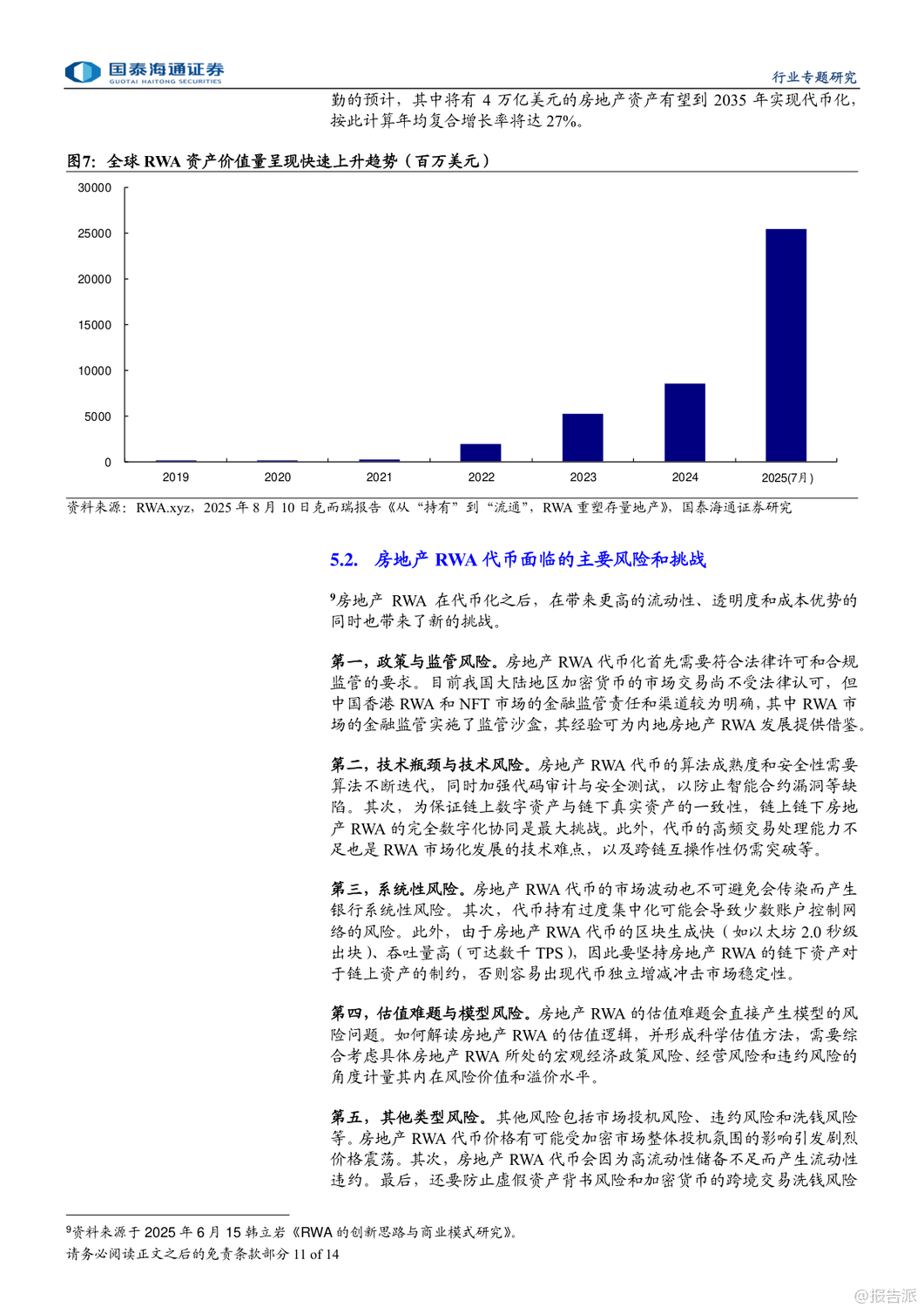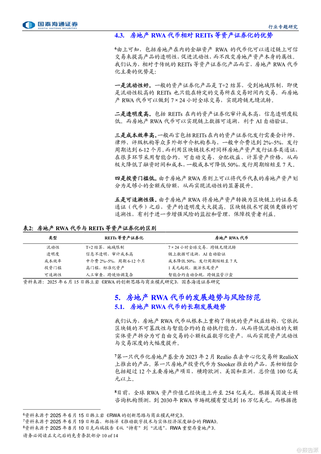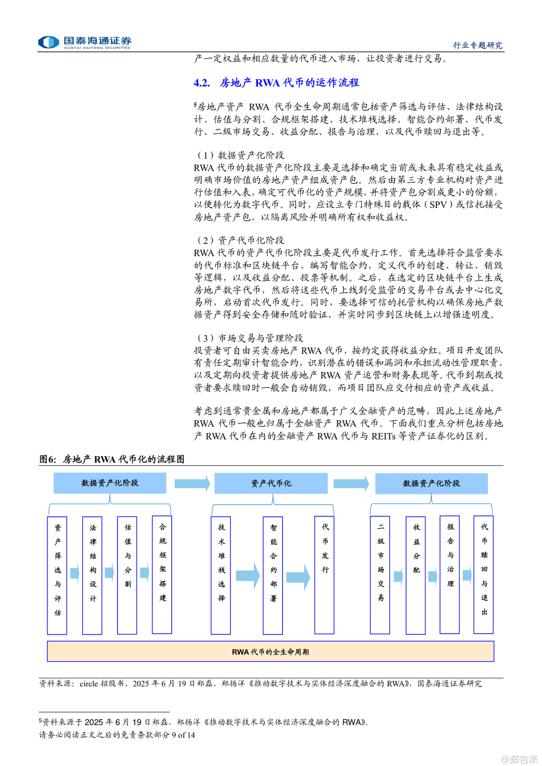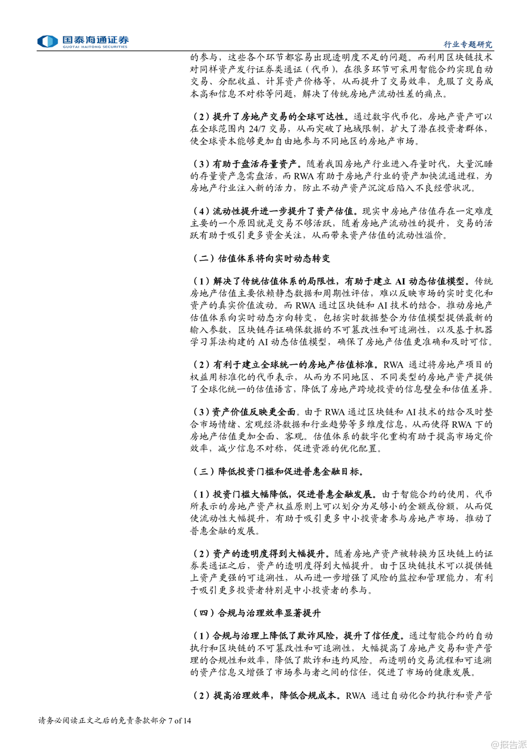 | 近年来,随着数字经济的深化发展,真实世界资产代币化(RWA)成为房地产投融资领域的潜在创新方向。 RWA通过区块链技术将现实中的高价值资产如房地产进行数字化分割,形成可在链上交易的代币,从而实现资产的高效流通与普惠投资。 这一模式不仅提升了传统房地产资产的流动性、透明度和交易效率,还大幅降低了投资门槛和中介成本,被视为存量时代盘活不动产的重要突破口。 RWA的本质是将实体资产“通证化”,即通过区块链为房地产等资产创建数字孪生体,代表其所有权与收益权,并支持在全球范围内7×24小时交易。 相比传统的房地产投资信托基金(REITs),RWA代币具有显著优势:交易不再受限于特定交易所和时段,实现跨链无缝流转;链上数据可追溯,提升审计效率并支持AI自动验证;发行周期可从6-12个月缩短至7天,中介成本降低50%;投资门槛可低至1美元起投,激活长尾资产市场。 在运作流程上,房地产RWA代币通常经历三大阶段:首先是数据资产化,即筛选具备稳定现金流的项目,由专业机构估值后装入特殊目的载体(SPV)隔离风险;其次是资产代币化,通过智能合约定义代币逻辑,在合规区块链平台上发行证券型代币(STO);最后是市场交易与管理,投资者可自由买卖,收益自动分配,全过程由智能合约驱动,提升治理效率与合规性。 据德勤预测,到2035年全球房地产RWA市场规模有望达到4万亿美元,年均复合增速达27%。 目前全球RWA总规模已达254亿美元,多个标杆案例已落地。 例如2022年中国香港首只合规REITs STO成功发行,底层资产为中环甲级写字楼,投资门槛降至10万港元,二级市场价格波动率仅为5%,远低于主流加密资产。 2025年6月,绿地(亚洲)证券将价值29亿港元的锣湾写字楼拆分为NFT产权凭证,在DigiFT交易所上市,最低投资额仅1000港元,开创了国资企业试水先河。 此外,欧盟Blocksquare平台已累计完成超2亿美元房地产代币化,年化收益率达6%-12%,并与DeFi生态打通,展现出强大生命力。 尽管前景广阔,房地产RWA仍面临多重挑战。 政策监管尚未完全明朗,尤其在中国大陆地区加密交易仍受限制;技术层面存在智能合约漏洞、链上链下一致性难题及高频交易处理瓶颈;系统性风险方面,代币集中度过高或市场联动可能引发金融传染;此外,估值模型不成熟、投机炒作及洗钱风险也需警惕。 总体来看,RWA正在重塑房地产投融资逻辑,推动行业从“持有”走向“流通”。 未来随着监管沙盒推进、技术迭代与AI深度融合,房地产或将迈入智能化、碎片化、全球化的资产管理新时代。 出品方:国泰海通 发布时间:2025年 文档页数:14页