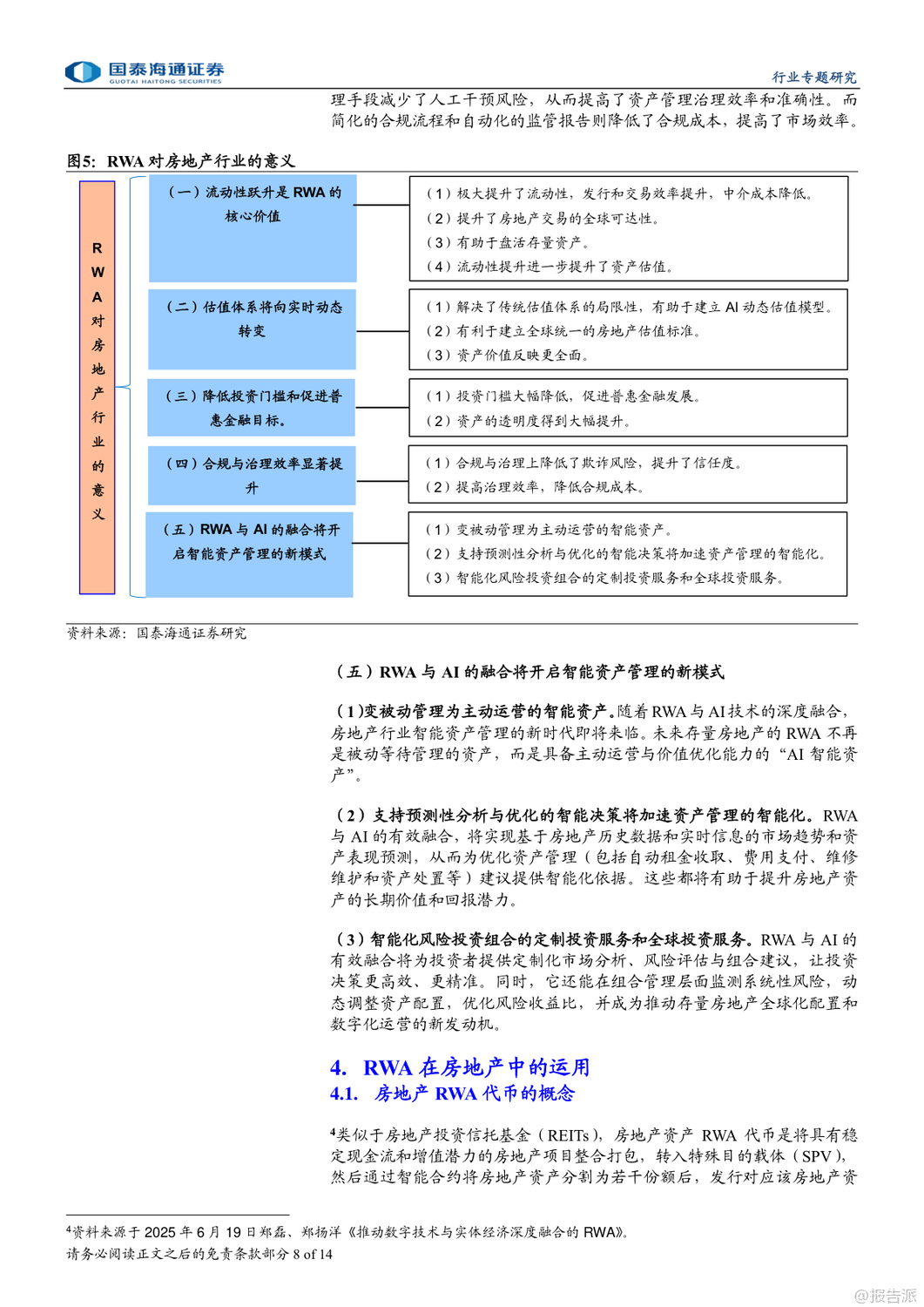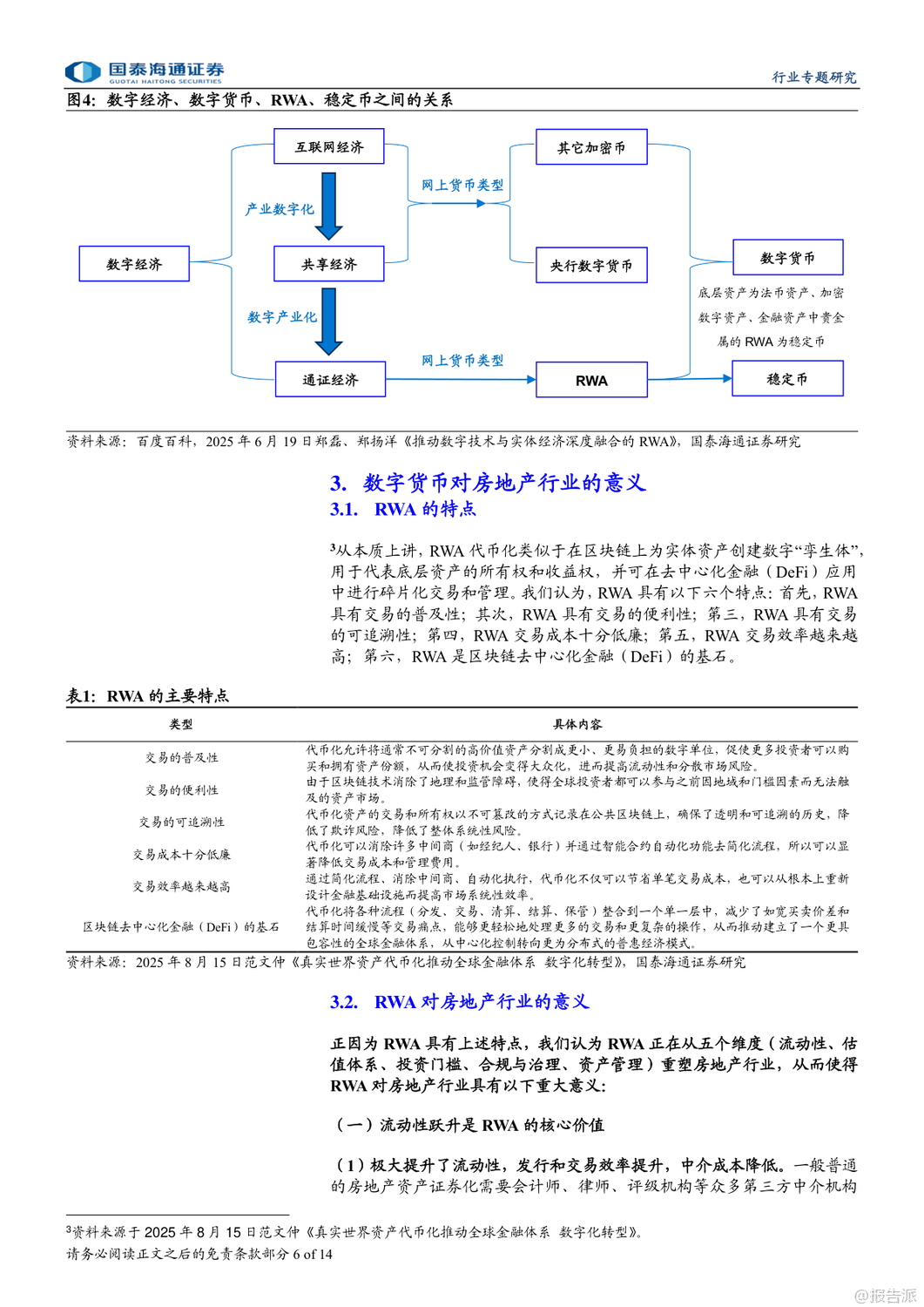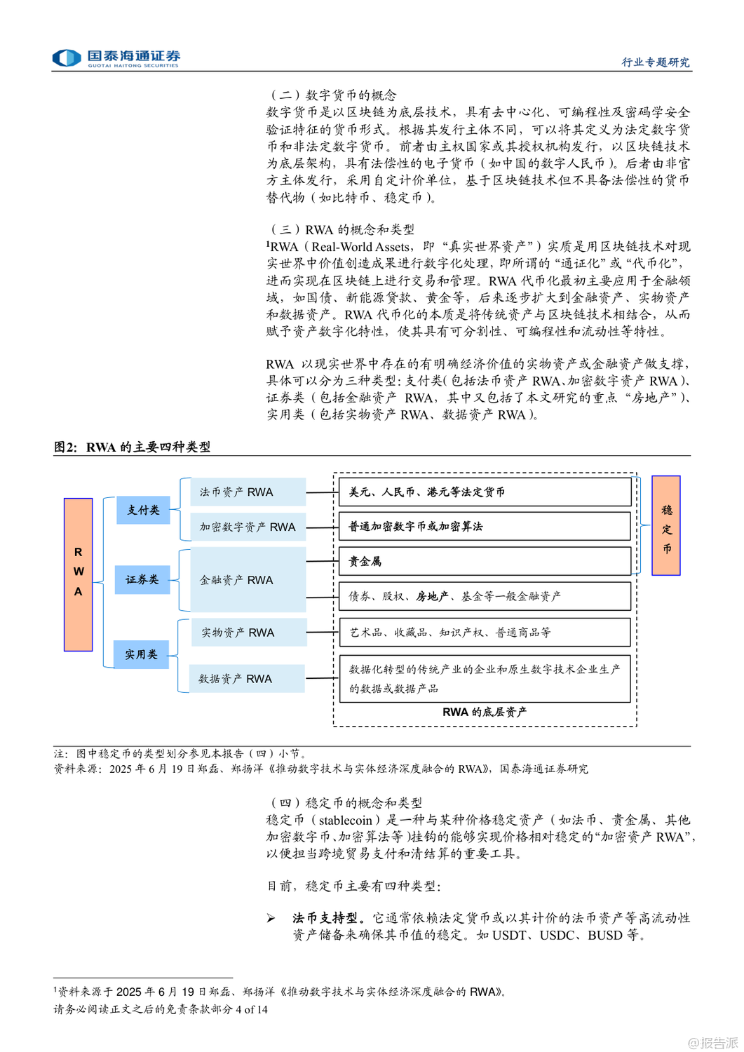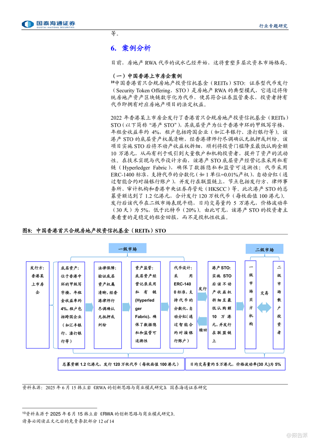 | 近年来,随着数字经济的深化发展,真实世界资产代币化(RWA)成为房地产投融资领域的潜在创新方向。 RWA通过区块链技术将现实中的高价值资产如房地产进行数字化分割,形成可在链上交易的代币,从而实现资产的高效流通与普惠投资。 这一模式不仅提升了传统房地产资产的流动性、透明度和交易效率,还大幅降低了投资门槛和中介成本,被视为存量时代盘活不动产的重要突破口。 RWA的本质是将实体资产“通证化”,即通过区块链为房地产等资产创建数字孪生体,代表其所有权与收益权,并支持在全球范围内7×24小时交易。 相比传统的房地产投资信托基金(REITs),RWA代币具有显著优势:交易不再受限于特定交易所和时段,实现跨链无缝流转;链上数据可追溯,提升审计效率并支持AI自动验证;发行周期可从6-12个月缩短至7天,中介成本降低50%;投资门槛可低至1美元起投,激活长尾资产市场。 在运作流程上,房地产RWA代币通常经历三大阶段:首先是数据资产化,即筛选具备稳定现金流的项目,由专业机构估值后装入特殊目的载体(SPV)隔离风险;其次是资产代币化,通过智能合约定义代币逻辑,在合规区块链平台上发行证券型代币(STO);最后是市场交易与管理,投资者可自由买卖,收益自动分配,全过程由智能合约驱动,提升治理效率与合规性。 据德勤预测,到2035年全球房地产RWA市场规模有望达到4万亿美元,年均复合增速达27%。 目前全球RWA总规模已达254亿美元,多个标杆案例已落地。 例如2022年中国香港首只合规REITs STO成功发行,底层资产为中环甲级写字楼,投资门槛降至10万港元,二级市场价格波动率仅为5%,远低于主流加密资产。 2025年6月,绿地(亚洲)证券将价值29亿港元的锣湾写字楼拆分为NFT产权凭证,在DigiFT交易所上市,最低投资额仅1000港元,开创了国资企业试水先河。 此外,欧盟Blocksquare平台已累计完成超2亿美元房地产代币化,年化收益率达6%-12%,并与DeFi生态打通,展现出强大生命力。 尽管前景广阔,房地产RWA仍面临多重挑战。 政策监管尚未完全明朗,尤其在中国大陆地区加密交易仍受限制;技术层面存在智能合约漏洞、链上链下一致性难题及高频交易处理瓶颈;系统性风险方面,代币集中度过高或市场联动可能引发金融传染;此外,估值模型不成熟、投机炒作及洗钱风险也需警惕。 总体来看,RWA正在重塑房地产投融资逻辑,推动行业从“持有”走向“流通”。 未来随着监管沙盒推进、技术迭代与AI深度融合,房地产或将迈入智能化、碎片化、全球化的资产管理新时代。 出品方:国泰海通 发布时间:2025年 文档页数:14页