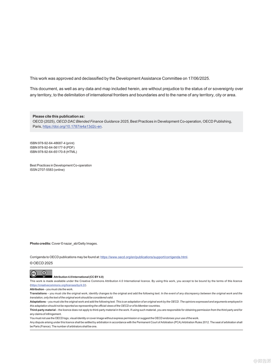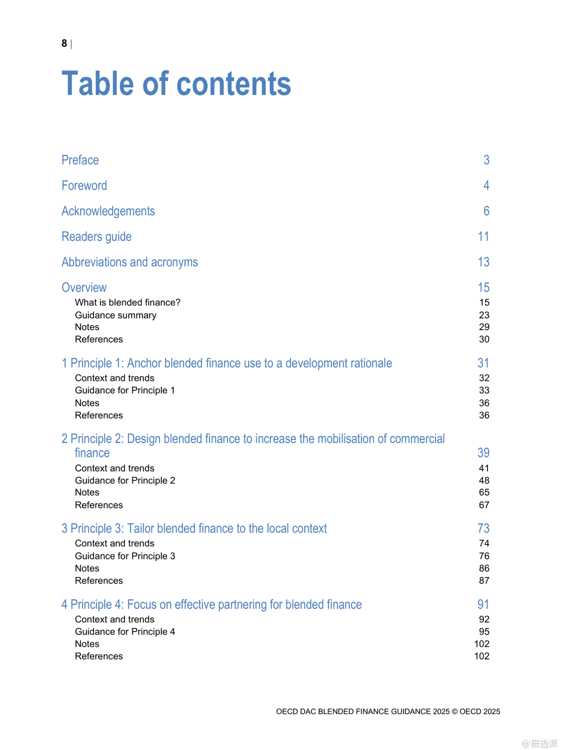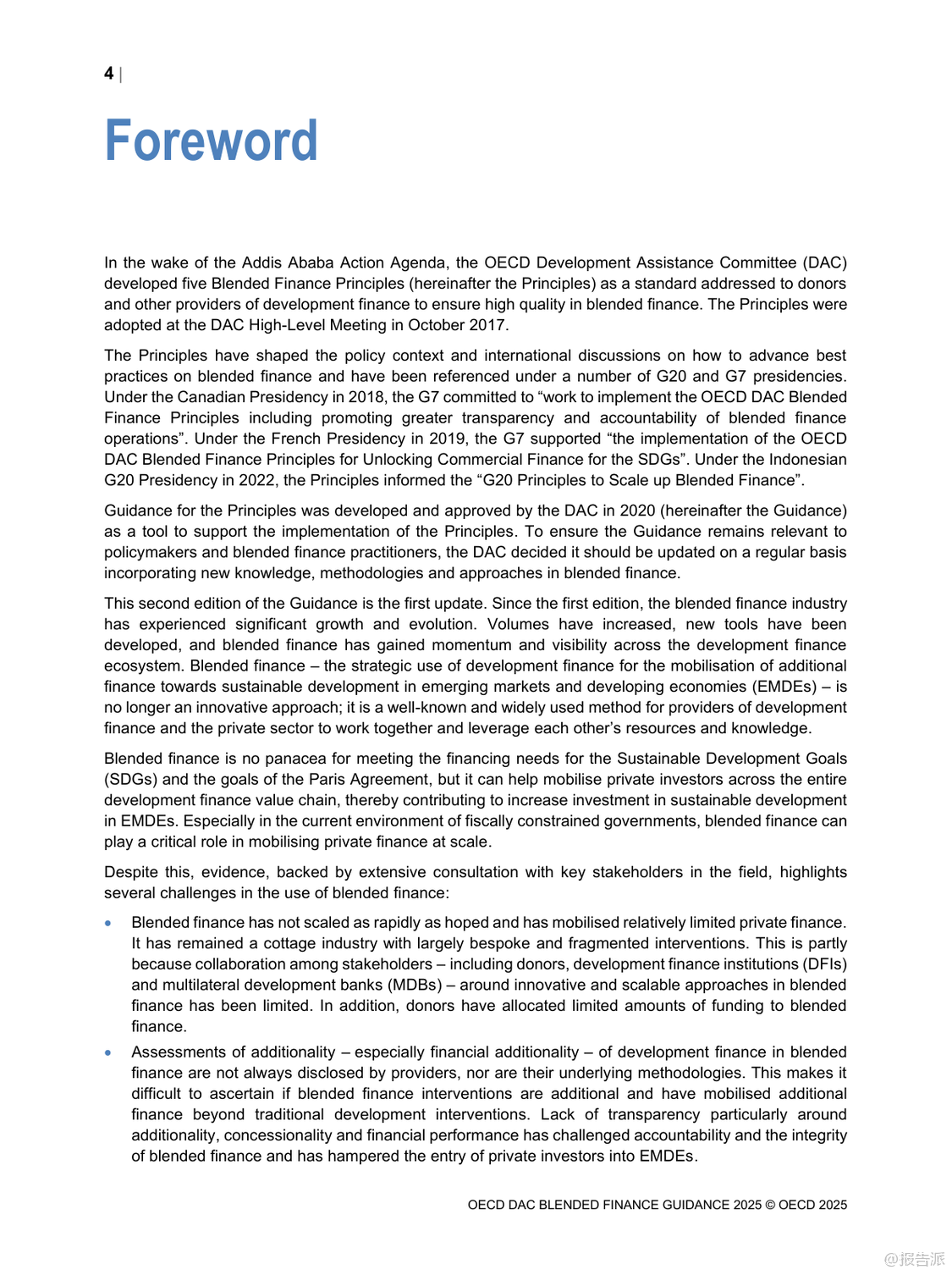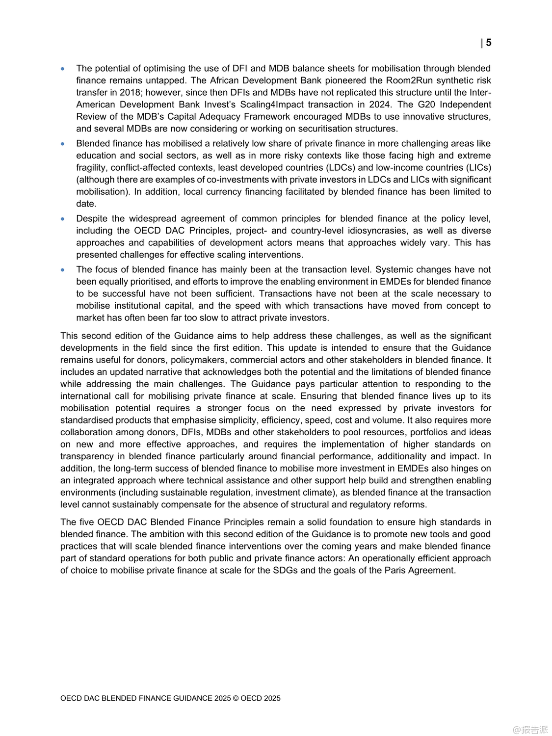 | 近日,经济合作与发展组织(OECD)发展援助委员会(DAC)发布了《2025年OECD混合融资指南》,这是自2017年首次提出混合融资原则以来的第二次更新。 该指南旨在应对当前全球发展资金短缺的严峻挑战,特别是在公共发展合作预算日益紧张的背景下,如何更有效地动员私人资本参与可持续发展目标(SDGs)的实现。 这一新指南不仅反映了近年来混合融资领域的显著增长和演变,也指出了现存的一些关键障碍,并提出了改进的方向。 混合融资被定义为“战略性地使用发展融资来动员额外的商业融资,以支持发展中经济体的可持续发展”。 简而言之,它是一种通过利用公共资金作为催化剂,吸引私人投资进入那些传统上被认为风险较高或回报不确定的领域的方法。 自2017年以来,这一概念已经从一种创新尝试转变为国际发展合作中的一个核心组成部分。 然而,尽管有此进展,混合融资尚未达到预期规模,其在促进私人资本流动方面的作用仍然有限。 此次发布的《2025年OECD混合融资指南》强调了几个重要变化:首先,加强了对透明度的要求,特别是关于财务表现、附加性和影响的数据披露;其次,鼓励更多采用标准化的产品和服务,以便于大规模复制与推广;再者,重视地方货币融资以及本地资本市场的发展,减少对外部硬通货依赖所带来的汇率波动风险;最后,提倡建立更加紧密的合作关系,包括捐赠国之间、多边开发银行(MDBs)、双边开发金融机构(DFIs)及其他利益相关者之间的协作。 值得注意的是,《指南》特别提到了一些成功案例,如非洲开发银行推出的Room2Run合成风险转移机制及美洲开发银行投资公司实施的Scaling4Impact交易等,这些都展示了如何通过创新结构优化资产负债表,从而有效撬动私人资本。 此外,《指南》还呼吁各方共同努力解决教育和社会部门等领域内较低水平的私人金融动员问题,同时探索如何更好地服务于脆弱国家和地区。 总之,《2025年OECD混合融资指南》不仅为政策制定者和从业者提供了最新的最佳实践指导,也为未来几年内进一步提升混合融资的质量、规模及其影响力设定了明确目标。 随着越来越多的利益相关者加入到这场变革之中,我们有望见证一个更加高效且包容性强的世界级投融资生态系统逐渐形成。 出品方:OECD 发布时间:2025年 文档页数: