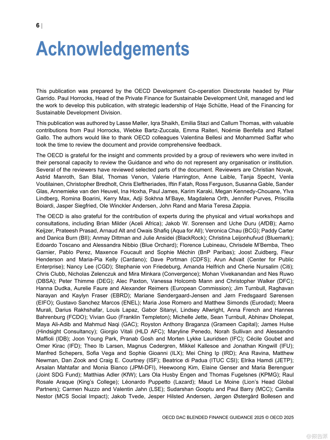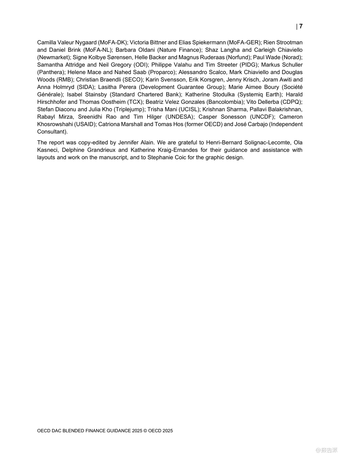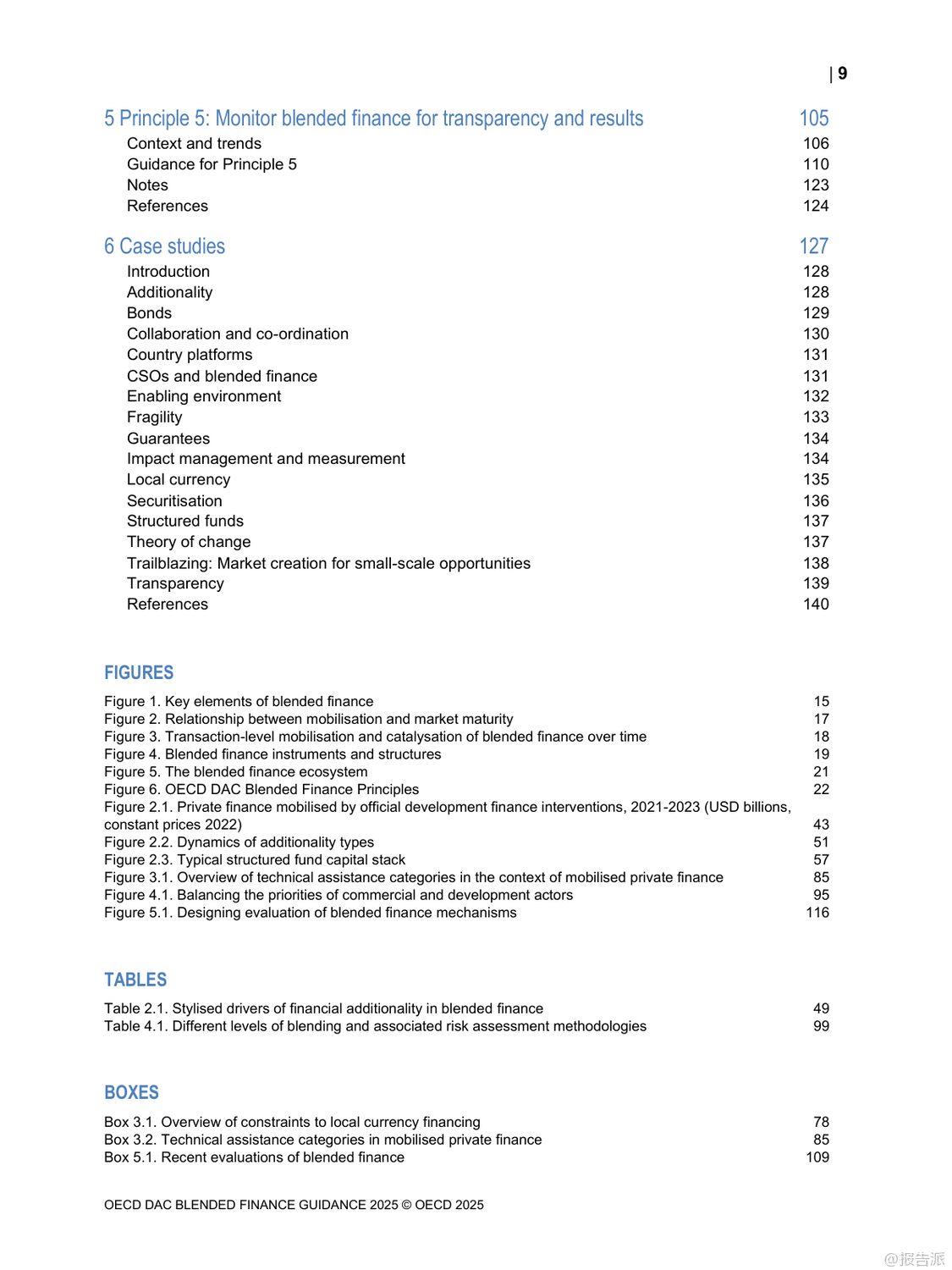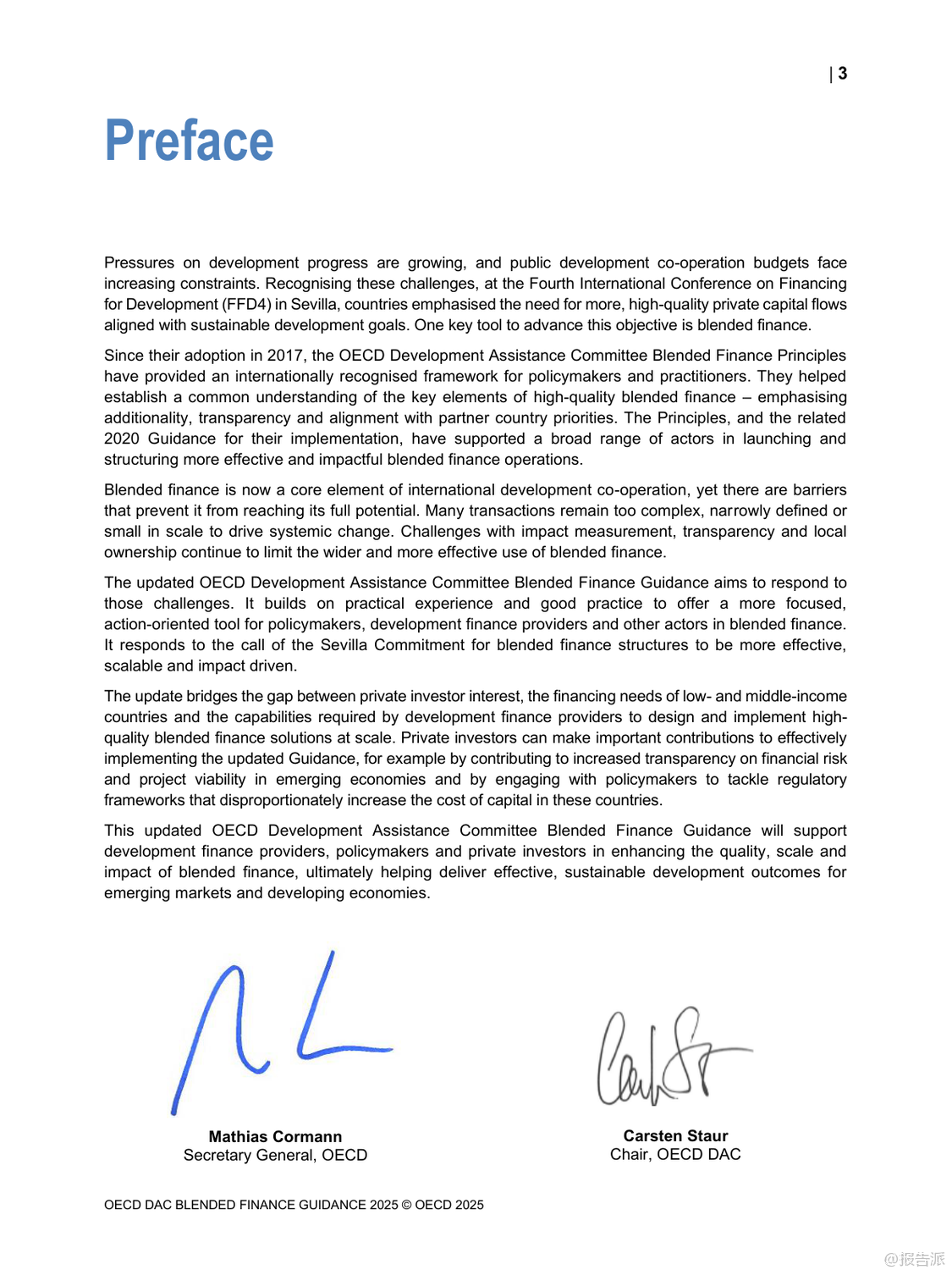 | 近日,经济合作与发展组织(OECD)发展援助委员会(DAC)发布了《2025年OECD混合融资指南》,这是自2017年首次提出混合融资原则以来的第二次更新。 该指南旨在应对当前全球发展资金短缺的严峻挑战,特别是在公共发展合作预算日益紧张的背景下,如何更有效地动员私人资本参与可持续发展目标(SDGs)的实现。 这一新指南不仅反映了近年来混合融资领域的显著增长和演变,也指出了现存的一些关键障碍,并提出了改进的方向。 混合融资被定义为“战略性地使用发展融资来动员额外的商业融资,以支持发展中经济体的可持续发展”。 简而言之,它是一种通过利用公共资金作为催化剂,吸引私人投资进入那些传统上被认为风险较高或回报不确定的领域的方法。 自2017年以来,这一概念已经从一种创新尝试转变为国际发展合作中的一个核心组成部分。 然而,尽管有此进展,混合融资尚未达到预期规模,其在促进私人资本流动方面的作用仍然有限。 此次发布的《2025年OECD混合融资指南》强调了几个重要变化:首先,加强了对透明度的要求,特别是关于财务表现、附加性和影响的数据披露;其次,鼓励更多采用标准化的产品和服务,以便于大规模复制与推广;再者,重视地方货币融资以及本地资本市场的发展,减少对外部硬通货依赖所带来的汇率波动风险;最后,提倡建立更加紧密的合作关系,包括捐赠国之间、多边开发银行(MDBs)、双边开发金融机构(DFIs)及其他利益相关者之间的协作。 值得注意的是,《指南》特别提到了一些成功案例,如非洲开发银行推出的Room2Run合成风险转移机制及美洲开发银行投资公司实施的Scaling4Impact交易等,这些都展示了如何通过创新结构优化资产负债表,从而有效撬动私人资本。 此外,《指南》还呼吁各方共同努力解决教育和社会部门等领域内较低水平的私人金融动员问题,同时探索如何更好地服务于脆弱国家和地区。 总之,《2025年OECD混合融资指南》不仅为政策制定者和从业者提供了最新的最佳实践指导,也为未来几年内进一步提升混合融资的质量、规模及其影响力设定了明确目标。 随着越来越多的利益相关者加入到这场变革之中,我们有望见证一个更加高效且包容性强的世界级投融资生态系统逐渐形成。 出品方:OECD 发布时间:2025年 文档页数: