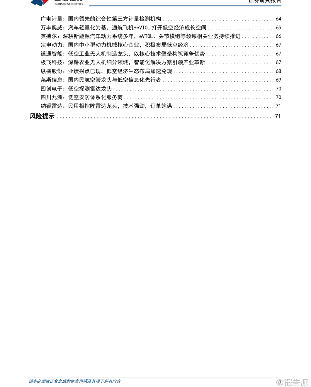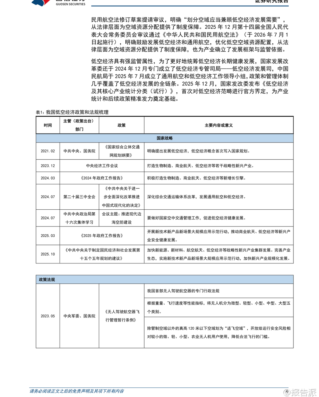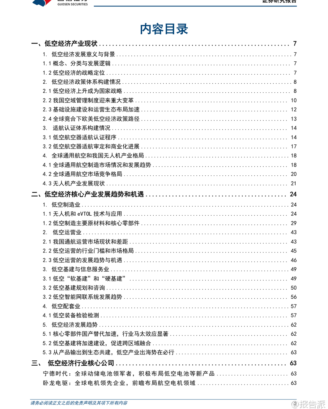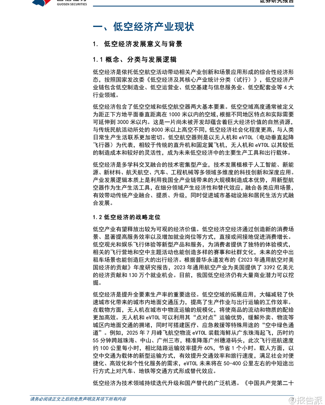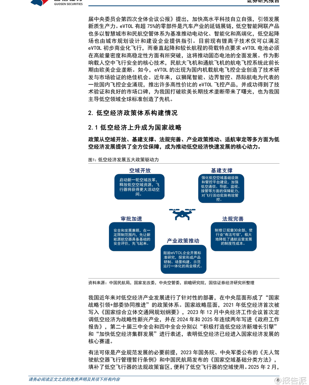 | 低空经济作为新质生产力的重要代表,正迎来政策、技术与市场的多重驱动。 根据国信证券发布的《低空经济产业链研究专题一》报告,我国低空经济已进入“从产品到生态、从试点到常态”的关键发展阶段,未来将形成万亿级产业规模。 报告首先明确了低空经济的官方定义:依托低空航空活动带动相关产业创新和场景应用形成的综合性经济形态。 其产业链涵盖四大核心领域——低空制造业、低空运营业、低空基建与信息服务业、低空配套业。 其中,低空制造业在全产业链中价值量占比近60%,是当前投资的核心焦点。 在产业现状方面,中国已具备坚实基础。 截至2024年底,全国获得通航经营许可证的企业达760家,在册通用航空器总量为5224架,无人机累计飞行超2666万小时,同比增长15.4%。 我国民用无人机市场规模预计2025年将达到1278亿元,并有望在2035年突破7000亿元。 同时,中国已是全球最大的民用无人机出口国,专利申请量占全球约70%。 政策层面,低空经济已被提升至国家战略高度。 自2021年首次写入国家规划以来,连续多年被写入政府工作报告。 2025年修订通过的新版《民用航空法》将于2026年7月施行,明确提出“划分空域应当兼顾低空经济发展需要”,并确立“基于风险的分类分级管理”原则,为产业发展提供法律保障。 此外,国家发改委专门成立低空经济发展司,进一步强化顶层设计与统筹协调。 适航认证体系的建设成为商业化落地的关键突破口。 目前亿航智能EH216-S已获型号合格证(TC)、生产许可证(PC)和单机适航证(AC),成为全球首个“三证齐全”的载人eVTOL。 峰飞航空V2000CG凯瑞鸥也已获得吨级以上eVTOL的“三证”。 截至2025年第三季度,国内约有17款eVTOL产品进入适航受理或取证阶段,预计大部分载人机型将在2028年前后获批并初步实现量产。 从产业链细分来看,各环节均存在显著发展机遇:低空制造业方面,碳纤维复合材料是轻量化核心,T700及以上高性能碳纤维国产化进程加快;电机系统要求高功率密度与可靠性,卧龙电驱、英搏尔等企业加速布局航空电机;能源系统以纯电为主、混动为辅,固态电池被视为解决续航瓶颈的关键,宁德时代、亿纬锂能等头部电池厂商纷纷推进凝聚态、全固态电池研发与产业化。 低空运营业正处于从试点向常态化过渡的关键期。 物流配送商业化进程最快,顺丰、京东已在大湾区开展跨城无人机物流试点;海上运输、港口引航等高价值小切口场景也逐步验证成熟,中信海直等传统通航企业积极参与运营模式探索。 低空基础设施建设将迎来爆发式增长。 据测算,2025-2030年仅通用机场与起降场建设费用合计将达5996亿元,配套的规划咨询市场空间亦超359亿元。 未来将构建“硬基建+软基建”融合体系,包括实体设施网络与低空智联平台,推动运行模式由“点状分散”向“网络化、智能化”演进。 低空配套服务中,检验检测最具商业化兑现潜力。 检测需求贯穿研发、取证与运营全生命周期,具备强合规属性。 广电计量、莱斯信息等第三方机构凭借资质与系统测试能力,有望率先受益。 总体而言,低空经济正处于“政策红利释放—技术迭代突破—应用场景拓展”的良性循环中。 随着适航认证加速、基建铺开与运营模式跑通,未来五年将迎来规模化发展拐点。 中国企业不仅有望在国内市场建立领先地位,更将通过“产品出海+标准输出”参与全球竞争,打造具有国际影响力的低空经济生态体系。 本文由【报告派】研读,输出观点仅作为行业分析! 原文标题:原文标题:2026-02-08-国信证券-国信证券-国防军工行业低空经济产业链研究专题一:从产品到生态、从试点到常态,低空经济的发展潜力与机遇 发布时间:2026年 报告出品方:国信证券 文档页数:72页