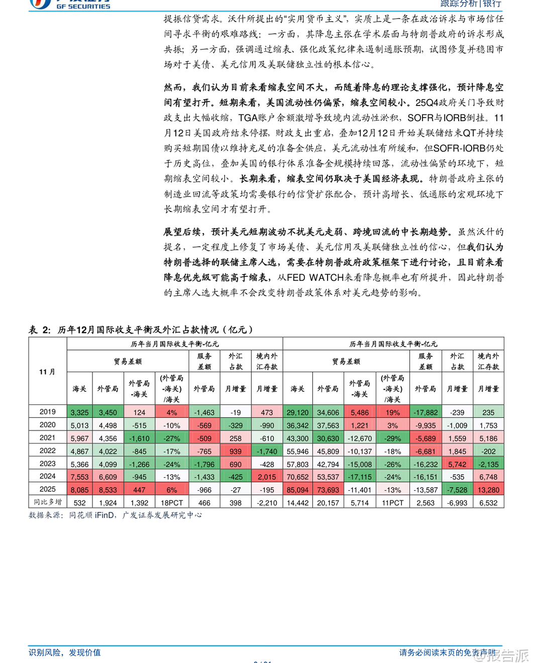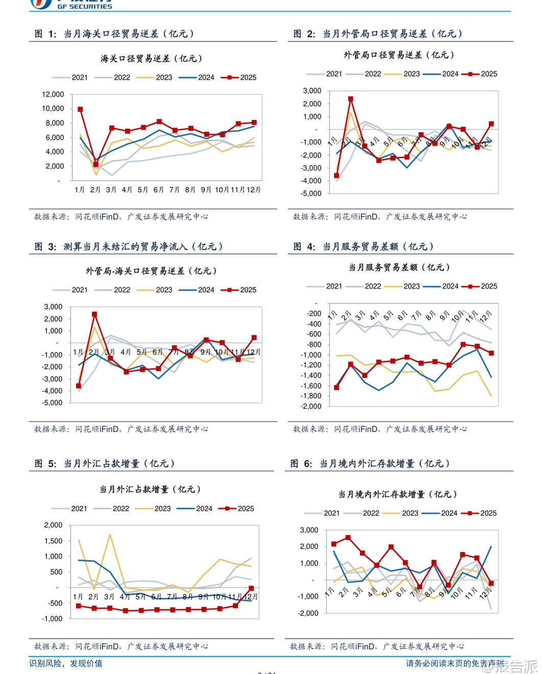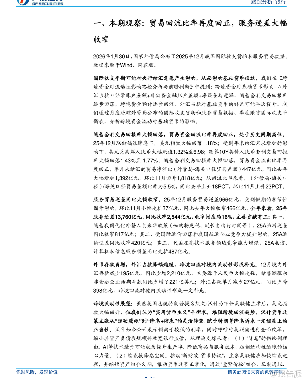 | 2025年12月,我国跨境资金流动呈现积极变化,贸易资金回流趋势明显增强,服务贸易逆差显著收窄,为境内流动性提供了有力支撑。 根据外管局公布的国际收支货物和服务贸易数据,随着美联储鸽派降息、美元指数回落以及人民币走强,套利交易回报率大幅下降,推动企业加快结汇,贸易资金流出压力缓解,甚至出现净回流迹象。 核心数据显示,2025年12月单月未结汇的贸易净流出(即外管局口径与海关口径贸易差额之差)为447亿元,同比多增1,392亿元,环比11月回升1,818亿元。 从更关键的“贸易回流比率”来看,(外管局-海关)/海关口径差额比率达到5.5%,不仅由负转正,而且同比上升18个百分点,环比上升23个百分点,处于历史同期高位,表明贸易项下资金正加速回流至国内金融体系。 这一转变的背后是套利环境的根本性逆转。 测算显示,2025年12月10年期美债人民币套利交易的实际年化回报率已大幅回落1.43个百分点至-1.77%。 这意味着持有美元资产进行套利的收益已转为亏损,极大地削弱了市场主体囤积外汇的动机,反而促使企业将此前留存的贸易顺差收入兑换为人民币,从而形成资本回流。 同时,年末传统的结汇需求也对人民币形成阶段性支撑。 在服务贸易方面,2025年全年逆差收窄至1.38万亿元,同比减少2,544亿元,降幅约16%,展现出结构性改善的强劲势头。 12月当月服务逆差为966亿元,虽受假期因素影响环比略有扩大,但同比大幅收窄466亿元。 主要贡献来自三大领域:一是旅游服务逆差同比收窄817亿元,得益于我国优化外籍人员来华政策,便利购物免税、延长停留时间等措施有效促进了入境游;二是运输服务逆差同比收窄420亿元,受益于国际航运价格回落及中国航运企业全球竞争力的持续提升;三是高技术服务领域实现突破,电信、计算机和信息服务顺差同比扩大487亿元,反映出我国在数字服务出口方面的竞争优势日益凸显。 跨境资金的回流对国内基础货币投放产生了积极影响。 尽管12月外汇占款仍减少27亿元,但同比少降398亿元,降幅显著趋缓。 与此同时,境内外汇存款减少195亿元,同比少增2,210亿元,表明企业和居民部门持有的外汇存款正在转化为人民币存款。 这说明,尽管央行没有直接大规模购汇,但市场自发的资金回流行为,已经通过银行体系补充了境内人民币流动性,对冲了部分因政府债券发行等因素带来的流动性收紧压力。 展望未来,虽然美国总统特朗普提名凯文·沃什为下一任美联储主席,其“降息+缩表”的主张一度提振美元信心,导致美元指数短期反弹,但报告认为,这大概率不会改变美元中长期走弱的趋势。 当前美国经济基本面仍面临挑战,流动性环境偏紧,银行体系准备金持续回落,短期内缩表空间有限。 相比之下,降息以刺激经济的优先级可能更高。 因此,中美利差倒挂收窄乃至反转的逻辑依然成立,这将继续支撑人民币资产吸引力,并有利于跨境资金保持回流态势。 然而,报告也提示了潜在风险,包括测算模型与实际数据的偏差、国内经济超预期下滑、财政政策力度不足,以及国际金融市场剧烈波动导致利率汇率大幅波动等。 这些因素都可能扰动当前的资金流动格局。 总体而言,2025年底以来,我国跨境流动性已出现方向性好转的积极信号。 贸易资金回流比率转正并攀升,服务贸易结构优化带动逆差收窄,共同构成了跨境资金流入的基础。 这一趋势若能延续,将有助于稳定人民币汇率预期,减轻央行对冲操作的压力,并为国内货币政策提供更大的操作空间,对银行业和整体金融市场构成利好。 本文由【报告派】研读,输出观点仅作为行业分析! 原文标题:原文标题:2026-02-09-广发证券-广发证券-银行业跨境流动性跟踪:贸易回流比率再度回正,服务逆差大幅收窄 发布时间:2026年 出品方:广发证券