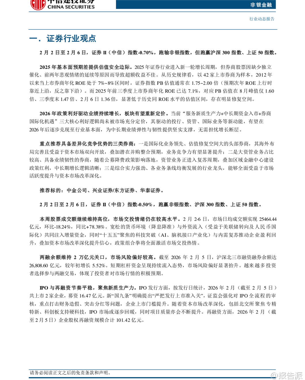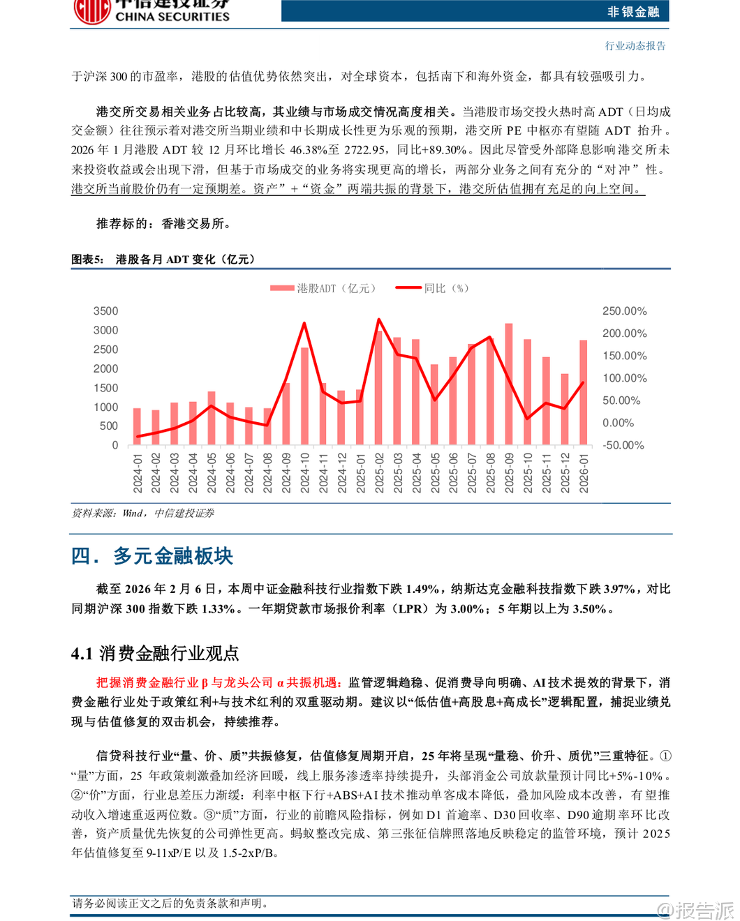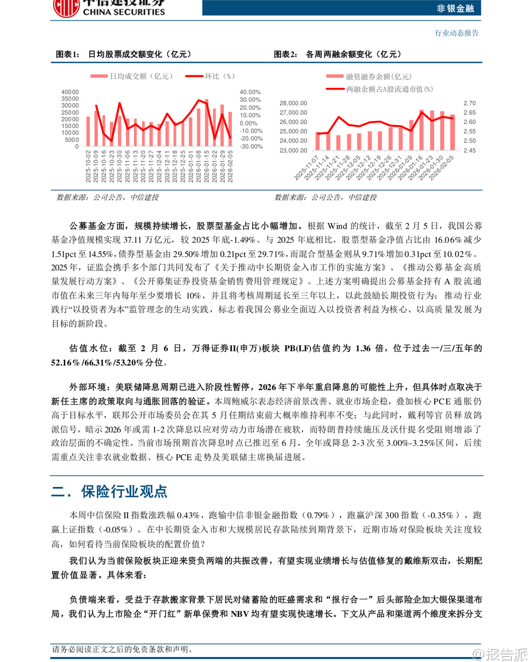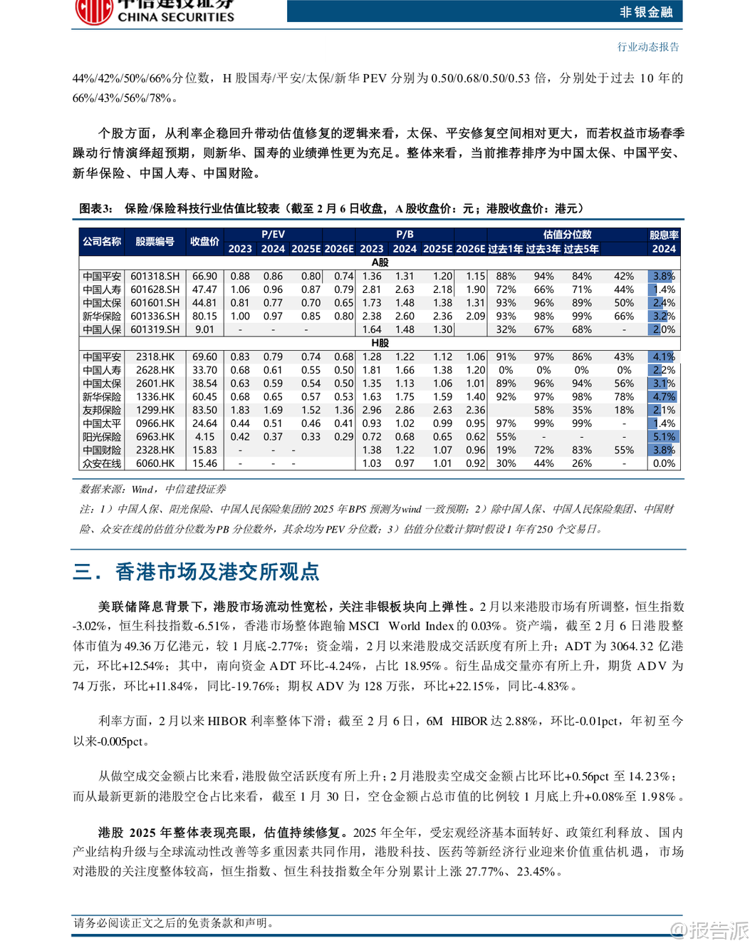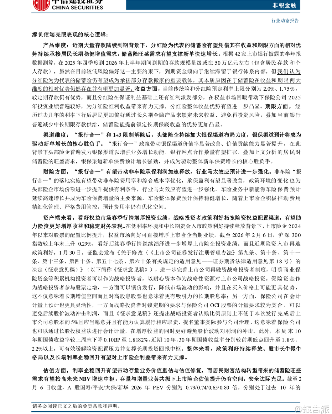 | 近期,随着大量居民存款陆续到期,资金流向成为市场关注焦点。 中信建投最新发布的《如何看待当前保险股的配置价值?》报告指出,以分红险为代表的储蓄型保险产品正迎来历史性配置机遇。 在低利率环境下,储蓄险凭借相对更高的收益水平和长期锁定利率的优势,有望承接从银行体系流出的稳健型资金,推动“开门红”新单保费与内含价值(NBV)实现超预期增长。 负债端方面,报告强调两大核心驱动力:一是产品优势凸显。 当前传统险与分红险预定利率上限分别为2.0%和1.75%,虽较前期有所下调,但结合2025年权益市场回暖带来的投资收益改善,分红险的实际综合回报仍显著高于定期存款。 同时,在居民普遍担忧未来利率下行、追求“锁定长期收益”的背景下,储蓄险长达10年甚至20年的保障期限具备独特吸引力。 二是渠道变革深化。 “报行合一”政策落地后,银保渠道费用率大幅压缩,头部险企的价值率明显回升。 在此基础上,平安、太保等大型保险公司纷纷加大银保渠道布局力度,推动业务重心向高价值、可持续的银保合作模式转型,预计将成为驱动整体新单增长的核心胜负手。 资产端同样呈现积极共振。 一方面,资本市场春季躁动行情可直接增厚险企当期投资收益。 另一方面,监管层对战略投资者制度的优化,为保险资金参与上市公司定增打开了新的空间。 通过锁价发行方式,险资不仅能以更优价格获取优质资产,还能通过OCI计量或权益法核算有效规避股价短期波动对利润表的冲击,实现长期稳定增值。 此外,长端利率自低位企稳回升,10年期国债收益率重回1.8%以上,缓解了险资配置压力,并支撑其长期投资回报中枢。 估值层面,当前上市险企仍处于历史低位。 截至2026年2月6日,A股主要保险公司2026年PEV估值普遍在0.65-0.80倍之间,处于过去十年分位数的42%-66%,H股估值则更低。 报告认为,随着NBV增速中枢抬升与存量业务价值重估,保险股有望迎来“业绩增长+估值修复”的戴维斯双击。 个股推荐顺序为中国太保、中国平安、新华保险、中国人寿、中国财险。 与此同时,券商板块亦被看好。 2025年前三季度上市券商年化ROE已达7.1%,但当前PB估值仅1.36倍,显著低于历史同ROE水平下的合理区间,存在明显修复空间。 在宽松货币环境、外资持续流入、“十五五”科技突破与内需复苏的共同推动下,市场交投情绪高涨,两融余额维持2万亿元高位,券商基本面有望持续改善,形成估值修复与业绩增长的戴维斯双击。 重点推荐三类券商:国际化领先且估值偏低的头部券商、大资管业务占比较高具备业绩韧性的券商,以及综合实力强劲的行业龙头。 多元金融领域,消费金融行业在监管趋稳和技术提效双重驱动下进入修复周期,信贷科技平台量价质共振,建议关注股东背景强、科技能力突出的机构;租赁行业则受益于准备金率下调与美元降息,净息差有望走阔,叠加高股息特性,配置价值凸显。 港交所作为港股市场核心载体,受益于美联储降息带来的流动性改善与南向资金持续高增,业绩增长确定性较强。 综上所述,当前非银金融板块整体处于“资负双击”的有利格局。 保险股凭借产品力与渠道变革迎来景气周期,券商估值处于洼地,多元金融细分赛道亮点纷呈。 对于中长期资金而言,当前时点配置非银金融资产,尤其是保险股,具备较高的安全边际与成长弹性。 本文由【报告派】研读,输出观点仅作为行业分析! 原文标题:原文标题:如何看待当前保险股的配置价值? 发布时间:2026年 报告出品方:中信建投 文档页数:30页