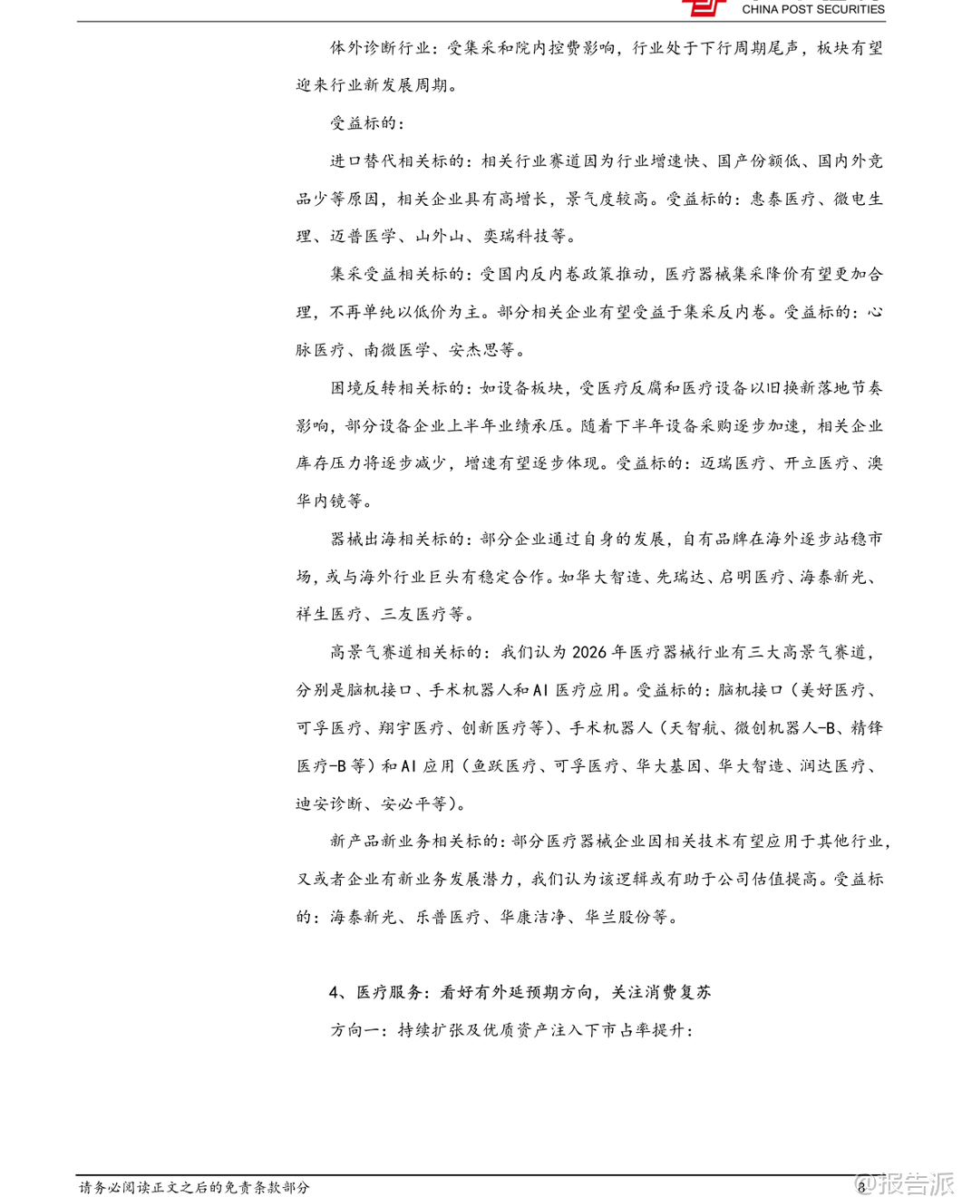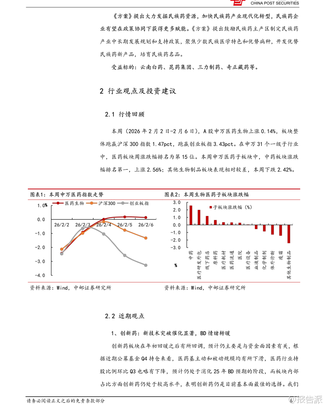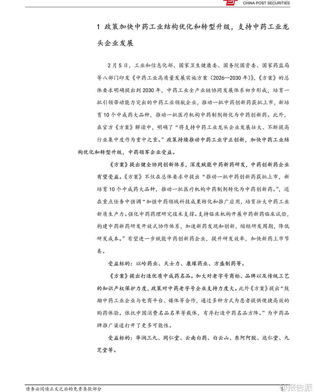 | 近日,中邮证券发布《医药生物行业周报》,聚焦2026年2月5日由工信部、国家卫健委、国务院国资委、国家药监局等八部门联合印发的《中药工业高质量发展实施方案(2026—2030年)》。 该方案明确提出到2030年,初步形成中药工业全产业链协同发展体系,培育一批具有引领带动能力的中药工业领航企业,推动中药创新药加速上市,新培育10个中成药大品种,并推进医疗机构中药制剂向创新药转化。 政策明确将“支持中药工业龙头企业发展壮大、提升行业集中度”作为重中之重,标志着中药产业进入结构性优化与转型升级的关键阶段。 从政策导向来看,《方案》强调健全协同创新体系,赋能中药新药研发。 具体包括强化中药药理研究技术支撑,鼓励临床机构开展中药新药临床试验,构建开放式协作研发体系,以缩短研发周期、降低研发成本。 这一系列举措将显著提升中药创新企业的研发效率和成果转化能力。 受益标的包括以岭药业、天士力、康缘药业、方盛制药等具备较强研发实力的企业。 在品牌建设方面,《方案》提出打造优质中成药名品,加大对老字号商标、品牌及传统工艺的知识产权保护力度,体现出对中医药文化传承的高度支持。 同时鼓励中药企业与电商平台、媒体合作,拓展便捷购药渠道,并依托“中国消费名品名单”打造中药名品方阵,助力品牌价值提升。 相关受益企业包括华润三九、同仁堂、云南白药、白云山、东阿阿胶、达仁堂、九芝堂等拥有深厚品牌积淀的老字号药企。 此外,《方案》还大力推动民族药资源发掘与现代化转型,鼓励主产区制定中长期发展规划,聚焦少数民族医学特色病种,开发优势民族药新产品,培育民族药名品。 这为云南白药、昆药集团、三力制药、奇正藏药等深耕民族药领域的企业提供了新的增长动能。 从市场表现看,2026年2月2日至6日当周,A股申万医药生物指数上涨0.14%,跑赢沪深300指数1.47个百分点,在31个一级行业中排名第15位。 其中中药板块表现亮眼,涨幅达2.56%,位居子板块首位。 恒生医疗保健指数同期下跌1.37%,但跑赢恒生指数1.65个百分点,显示医药板块仍具相对配置优势。 在整体行业观点上,中邮证券维持“强于大市”的评级判断。 对于创新药板块,尽管年初有所回调,主要受资金面因素影响,公募基金Q4持仓显示医药持股比例略有下降,但创新药仍是当前基本面最优的选择。 国产创新药在全球参与度持续提升,尤其是在早期研发阶段已显现追赶甚至反超趋势,中期将迎来收获期。 建议关注信达生物、三生制药、康方生物、映恩生物、维立志博、乐普生物、康诺亚等确定性高、BD预期扰动小的标的。 在创新药产业链方面,看好CXO及生命科研服务板块2026年的景气复苏。 海外研发外包需求回暖,国内BigPharma研发投入稳步增长,Biotech企业融资环境改善,叠加前期产能出清完成,行业盈利有望修复。 重点推荐药明康德、药明合联、泰格医药、昭衍新药、普蕊斯、皓元医药等。 医疗器械板块方面,随着医疗反腐边际缓和、集采“反内卷”推进以及设备以旧换新政策落地,行业利润有望逐步恢复。 高值耗材集采趋于科学合理,降价压力减弱,带来估值修复预期;体外诊断行业处于下行周期尾声,有望开启新一轮成长。 细分方向上,进口替代(惠泰医疗、微电生理)、集采受益(心脉医疗、南微医学)、困境反转(迈瑞医疗、开立医疗)、器械出海(华大智造、启明医疗)以及高景气赛道如脑机接口、手术机器人、AI医疗应用(天智航、微创机器人-B、鱼跃医疗)均值得关注。 医疗服务板块则看好外延扩张与消费复苏逻辑。 爱尔眼科通过并购持续提升市占率,中小机构经营压力加大背景下龙头整合优势凸显。 同时,眼科、口腔等消费属性强的细分领域在消费力回升后弹性较大,有望迎来业绩修复。 中药板块投资策略聚焦三大方向:一是集采/基药政策受益品种,如盘龙药业(盘龙七片)、方盛制药(藤黄健骨)、佐力药业(乌灵胶囊)等,有望实现以价换量和医院覆盖加速;二是高基数出清后的拐点型企业,如以岭药业、贵州三力,疫情影响消退后库存回归常态,业绩增速有望回升;三是积极布局创新研发的企业,如康缘药业、天士力、桂林三金等。 医药商业领域,零售药店行业集中度加速提升。 龙头药房凭借专业化服务、强大供应链、数字化管理和合规体系,在行业出清后更具竞争优势。 推荐益丰药房、大参林等具备持续扩张能力和运营效率的企业。 AI+医疗成为重要发展趋势,已在制药、影像/手术、辅助诊断、医疗服务四大场景落地应用。 AI制药通过高效分子设计和药物筛选提升研发成功率,受益企业包括晶泰控股、英矽智能、泓博医药、成都先导;AI影像/手术领域有联影智能、鹰瞳科技、微创机器人-B、天智航;AI辅助诊断涵盖华大基因、润达医疗、迪安诊断、安必平;AI医疗服务则包括讯飞医疗科技、美年健康、医渡科技、卫宁健康等。 风险提示方面,报告指出需警惕创新药研发进度不及预期、市场竞争加剧、地缘政治风险以及政策降价压力超预期等潜在风险因素。 总体来看,中药行业在政策强力支持下迎来结构性机遇,龙头企业、创新能力强、品牌优势突出的企业将在本轮转型升级中率先受益。 本文由【报告派】研读,输出观点仅作为行业分析! 原文标题:原文标题:2026-02-09-中邮证券-中邮证券-医药生物行业报告:政策加快