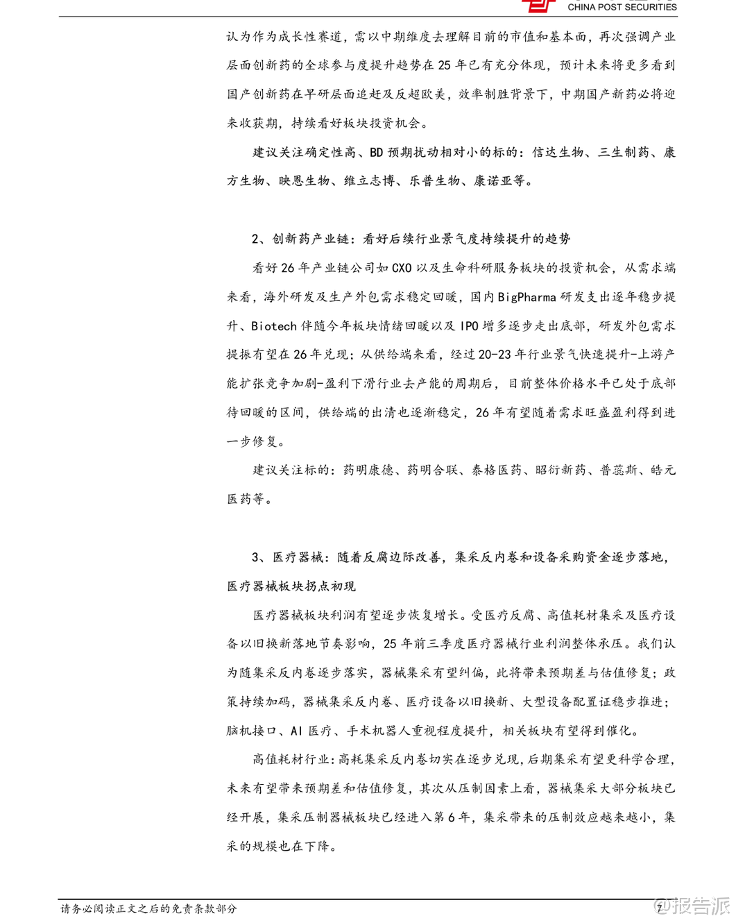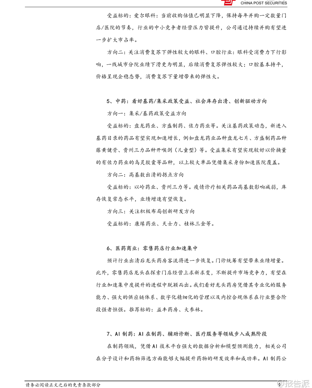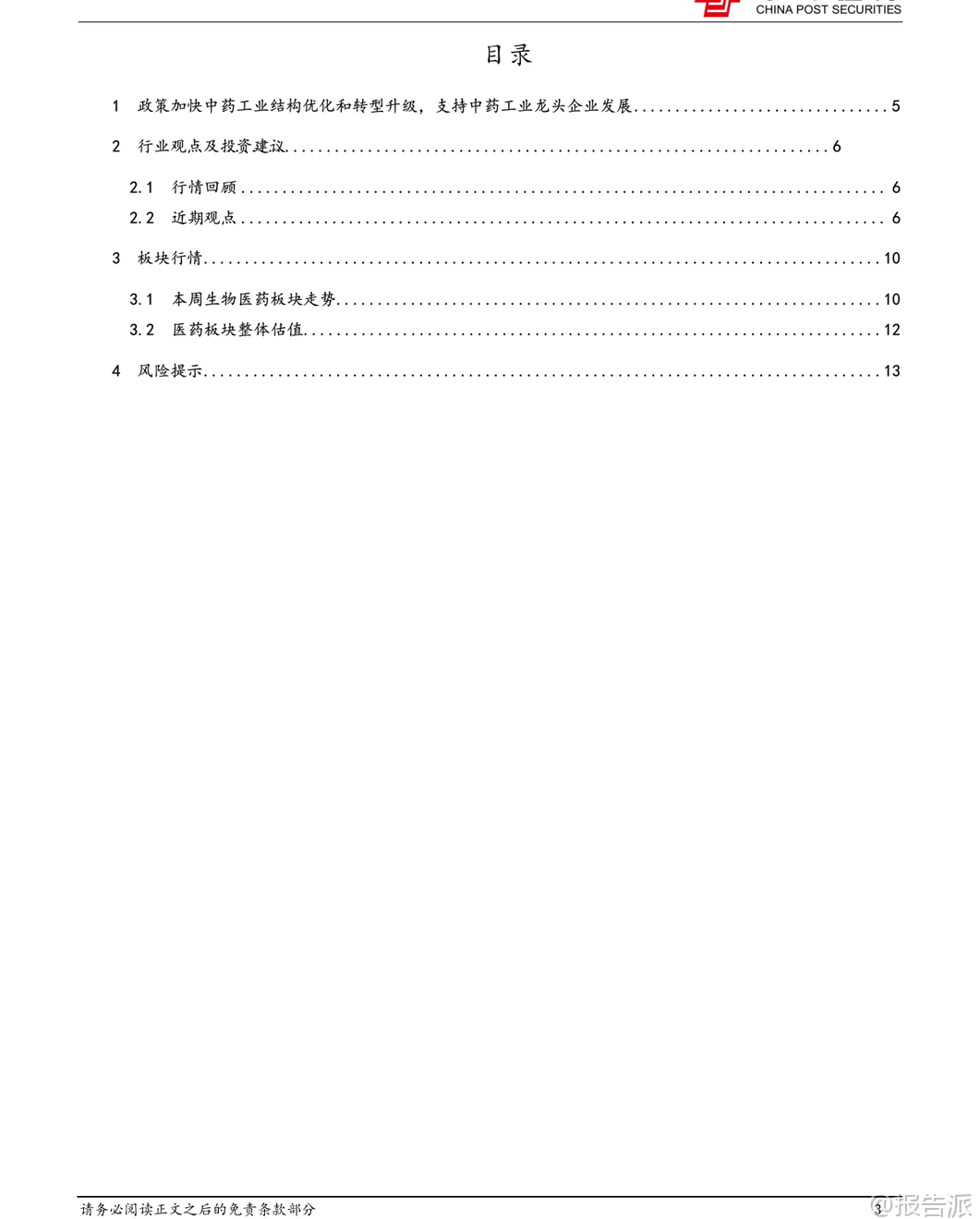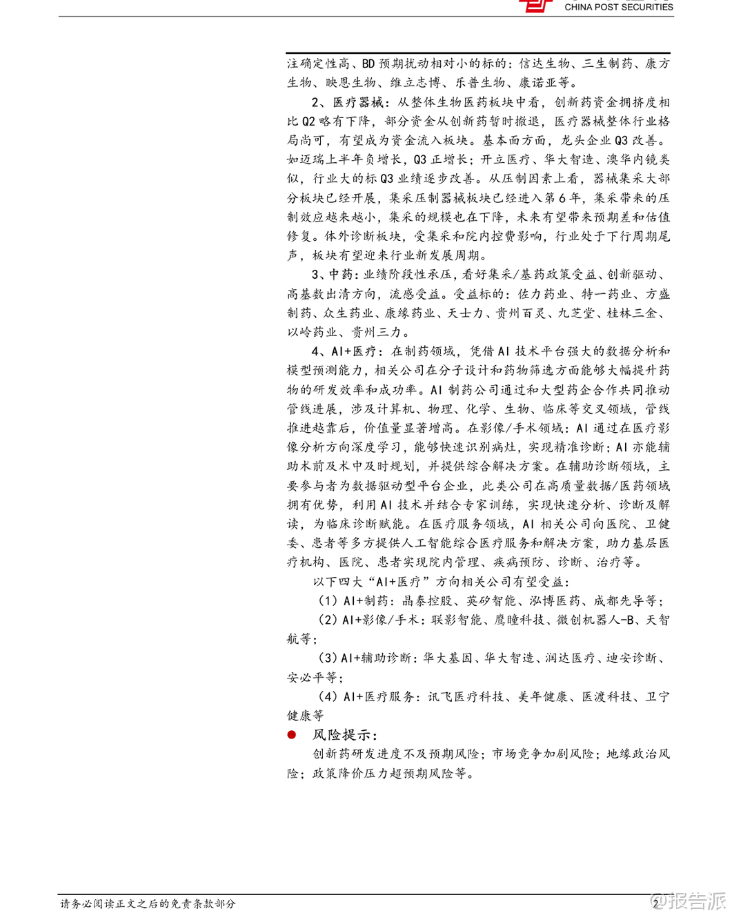 | 近日,中邮证券发布《医药生物行业周报》,聚焦2026年2月5日由工信部、国家卫健委、国务院国资委、国家药监局等八部门联合印发的《中药工业高质量发展实施方案(2026—2030年)》。 该方案明确提出到2030年,初步形成中药工业全产业链协同发展体系,培育一批具有引领带动能力的中药工业领航企业,推动中药创新药加速上市,新培育10个中成药大品种,并推进医疗机构中药制剂向创新药转化。 政策明确将“支持中药工业龙头企业发展壮大、提升行业集中度”作为重中之重,标志着中药产业进入结构性优化与转型升级的关键阶段。 从政策导向来看,《方案》强调健全协同创新体系,赋能中药新药研发。 具体包括强化中药药理研究技术支撑,鼓励临床机构开展中药新药临床试验,构建开放式协作研发体系,以缩短研发周期、降低研发成本。 这一系列举措将显著提升中药创新企业的研发效率和成果转化能力。 受益标的包括以岭药业、天士力、康缘药业、方盛制药等具备较强研发实力的企业。 在品牌建设方面,《方案》提出打造优质中成药名品,加大对老字号商标、品牌及传统工艺的知识产权保护力度,体现出对中医药文化传承的高度支持。 同时鼓励中药企业与电商平台、媒体合作,拓展便捷购药渠道,并依托“中国消费名品名单”打造中药名品方阵,助力品牌价值提升。 相关受益企业包括华润三九、同仁堂、云南白药、白云山、东阿阿胶、达仁堂、九芝堂等拥有深厚品牌积淀的老字号药企。 此外,《方案》还大力推动民族药资源发掘与现代化转型,鼓励主产区制定中长期发展规划,聚焦少数民族医学特色病种,开发优势民族药新产品,培育民族药名品。 这为云南白药、昆药集团、三力制药、奇正藏药等深耕民族药领域的企业提供了新的增长动能。 从市场表现看,2026年2月2日至6日当周,A股申万医药生物指数上涨0.14%,跑赢沪深300指数1.47个百分点,在31个一级行业中排名第15位。 其中中药板块表现亮眼,涨幅达2.56%,位居子板块首位。 恒生医疗保健指数同期下跌1.37%,但跑赢恒生指数1.65个百分点,显示医药板块仍具相对配置优势。 在整体行业观点上,中邮证券维持“强于大市”的评级判断。 对于创新药板块,尽管年初有所回调,主要受资金面因素影响,公募基金Q4持仓显示医药持股比例略有下降,但创新药仍是当前基本面最优的选择。 国产创新药在全球参与度持续提升,尤其是在早期研发阶段已显现追赶甚至反超趋势,中期将迎来收获期。 建议关注信达生物、三生制药、康方生物、映恩生物、维立志博、乐普生物、康诺亚等确定性高、BD预期扰动小的标的。 在创新药产业链方面,看好CXO及生命科研服务板块2026年的景气复苏。 海外研发外包需求回暖,国内BigPharma研发投入稳步增长,Biotech企业融资环境改善,叠加前期产能出清完成,行业盈利有望修复。 重点推荐药明康德、药明合联、泰格医药、昭衍新药、普蕊斯、皓元医药等。 医疗器械板块方面,随着医疗反腐边际缓和、集采“反内卷”推进以及设备以旧换新政策落地,行业利润有望逐步恢复。 高值耗材集采趋于科学合理,降价压力减弱,带来估值修复预期;体外诊断行业处于下行周期尾声,有望开启新一轮成长。 细分方向上,进口替代(惠泰医疗、微电生理)、集采受益(心脉医疗、南微医学)、困境反转(迈瑞医疗、开立医疗)、器械出海(华大智造、启明医疗)以及高景气赛道如脑机接口、手术机器人、AI医疗应用(天智航、微创机器人-B、鱼跃医疗)均值得关注。 医疗服务板块则看好外延扩张与消费复苏逻辑。 爱尔眼科通过并购持续提升市占率,中小机构经营压力加大背景下龙头整合优势凸显。 同时,眼科、口腔等消费属性强的细分领域在消费力回升后弹性较大,有望迎来业绩修复。 中药板块投资策略聚焦三大方向:一是集采/基药政策受益品种,如盘龙药业(盘龙七片)、方盛制药(藤黄健骨)、佐力药业(乌灵胶囊)等,有望实现以价换量和医院覆盖加速;二是高基数出清后的拐点型企业,如以岭药业、贵州三力,疫情影响消退后库存回归常态,业绩增速有望回升;三是积极布局创新研发的企业,如康缘药业、天士力、桂林三金等。 医药商业领域,零售药店行业集中度加速提升。 龙头药房凭借专业化服务、强大供应链、数字化管理和合规体系,在行业出清后更具竞争优势。 推荐益丰药房、大参林等具备持续扩张能力和运营效率的企业。 AI+医疗成为重要发展趋势,已在制药、影像/手术、辅助诊断、医疗服务四大场景落地应用。 AI制药通过高效分子设计和药物筛选提升研发成功率,受益企业包括晶泰控股、英矽智能、泓博医药、成都先导;AI影像/手术领域有联影智能、鹰瞳科技、微创机器人-B、天智航;AI辅助诊断涵盖华大基因、润达医疗、迪安诊断、安必平;AI医疗服务则包括讯飞医疗科技、美年健康、医渡科技、卫宁健康等。 风险提示方面,报告指出需警惕创新药研发进度不及预期、市场竞争加剧、地缘政治风险以及政策降价压力超预期等潜在风险因素。 总体来看,中药行业在政策强力支持下迎来结构性机遇,龙头企业、创新能力强、品牌优势突出的企业将在本轮转型升级中率先受益。 本文由【报告派】研读,输出观点仅作为行业分析! 原文标题:原文标题:2026-02-09-中邮证券-中邮证券-医药生物行业报告:政策加快