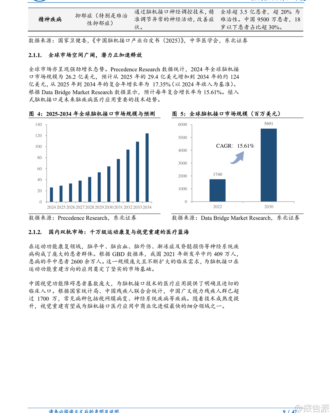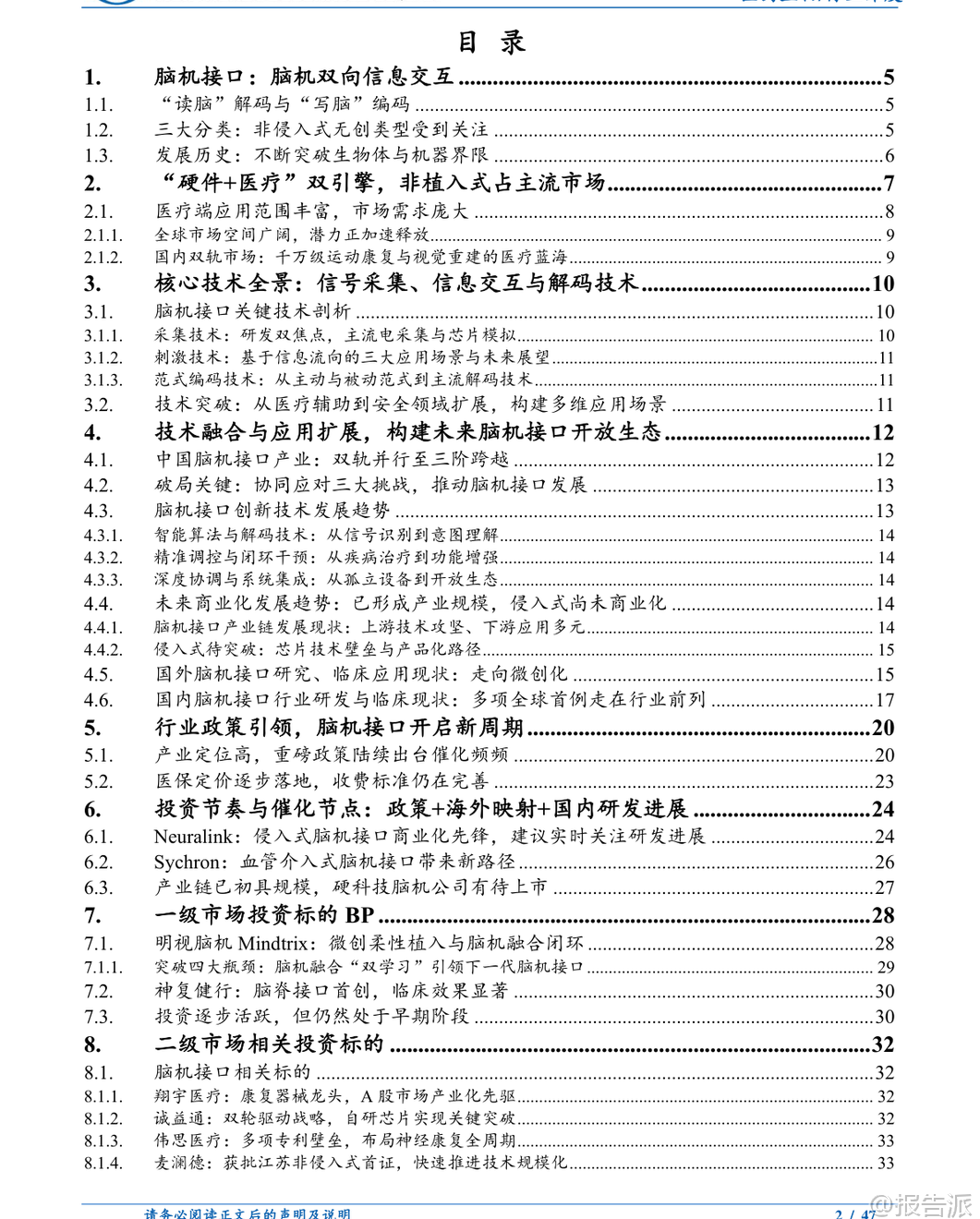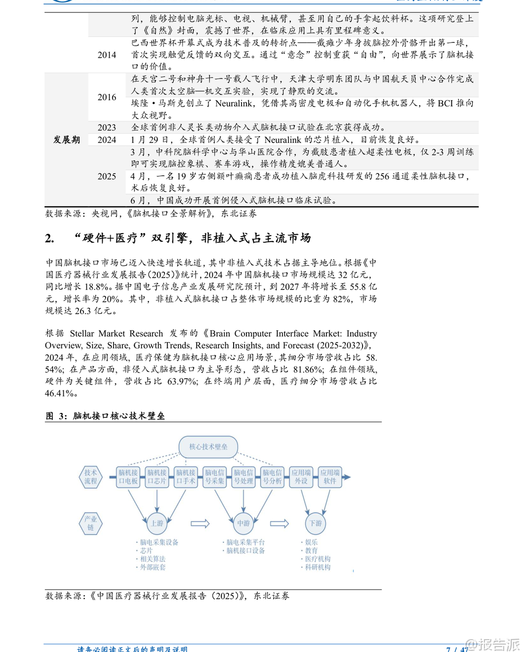 | 脑机接口(Brain-Computer Interface, BCI)作为连接大脑与外部设备的颠覆性人机交互技术,正迎来前所未有的发展机遇。 根据东北证券发布的《脑机接口行业深度报告》,在国家顶层设计和产业生态协同推动下,我国脑机接口技术已从实验室研究迈入临床应用与商业化落地的关键阶段。 全球市场方面,2024年脑机接口市场规模已达26.2亿美元,Precedence Research预测,2025至2034年间复合增长率将达17.35%,到2034年有望突破124亿美元。 国内市场同步提速,2024年规模达32亿元,预计2027年将增至55.8亿元,年均增速约20%。 当前非侵入式产品占据主导地位,占比高达82%,主要应用于康复训练、认知监测等场景,而侵入式和介入式技术则成为未来高增长的核心驱动力。 核心技术层面,脑机接口的发展依赖三大关键环节:信号采集、解码算法与神经刺激。 目前行业形成三大技术路径:侵入式、半侵入式和非侵入式。 其中,侵入式通过植入皮质内微电极实现高精度信号读取,代表企业如Neuralink已完成21例人体植入手术;半侵入式以ECoG为代表,平衡了信号质量与安全性,“北脑一号”128通道系统实现无线全植入,是我国在该领域的重大突破;非侵入式则以EEG为主,安全无创,已在消费级产品中广泛应用。 国内企业在多项关键技术上实现“全球首例”级突破。 例如,南开大学段峰团队完成全球首例介入式脑机接口人体试验,开创微创血管内植入新路径;中科院脑智卓越中心联合华山医院开展我国首例侵入式BCI前瞻性临床试验,标志着我国成为继美国后第二个掌握该技术的国家;此外,在柔性电极、汉语语言解码、视觉重建等领域也取得领先成果,显示出中国在特定应用场景下的差异化竞争优势。 政策端持续加码,为行业发展提供强力支撑。 “十四五”“十五五”规划均将脑机接口列为国家战略重点,科技部设立颠覆性技术专项,工信部等七部门联合发布产业发展实施意见。 医保支付体系加速完善,浙江率先将“非侵入式脑机接口适配费”纳入医保乙类报销范围,湖北、江苏等地明确收费标准,打通商业化闭环的关键瓶颈。 北京、上海等地出台专项政策,构建标准制定、基金支持、产业集聚的完整生态。 产业链方面,上游核心部件国产化进程加快,国产模拟芯片功耗较海外产品降低60%;中游产品逐步落地,医疗康复是当前最成熟的应用领域,覆盖卒中、脊髓损伤、渐冻症等功能障碍患者的运动与语言重建;下游场景向消费电子、工业安全、航天等领域拓展,形成多元化应用格局。 投资逻辑上,建议聚焦三大主线:一是非侵入式产品商业化领先企业,如翔宇医疗、伟思医疗等已在康复设备中实现规模化应用;二是侵入式/介入式技术临床突破标的,如心玮医疗、微创脑科学正推进关键临床试验;三是产业链核心部件供应商,包括芯片、电极、精密制造等环节。 同时需关注三大催化因素:医保支付扩围、海外头部企业技术映射、硬科技公司上市进程。 值得注意的是,尽管前景广阔,行业仍面临多重挑战:技术层面存在生物相容性、长期稳定性与信号解码复杂性难题;产业化面临成本高、审批严、用户教育不足等问题;伦理与数据安全问题亦不容忽视,需建立完善的治理框架。 总体来看,脑机接口正处于“技术验证向商业化初期过渡”的关键窗口期。 医疗康复因需求刚性、政策支持明确,将成为率先爆发的核心赛道。 随着技术迭代、支付体系完善与资本助力,国产脑机接口有望在全球竞争中占据重要一席,开启“增强人类”的新时代。 本文由【报告派】研读,输出观点仅作为行业分析! 原文标题:2026-02-08-东北证券-东北证券-脑机接口行业深度报告:顶层战略支持,国产脑机技术进入发展快车道 发布时间:2026年 报告出品方:东北证券 文档页数:47页