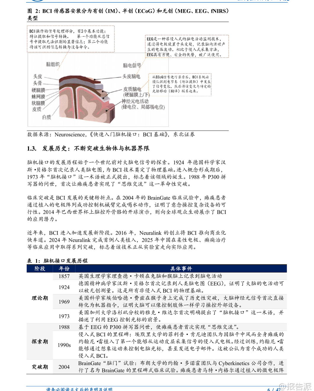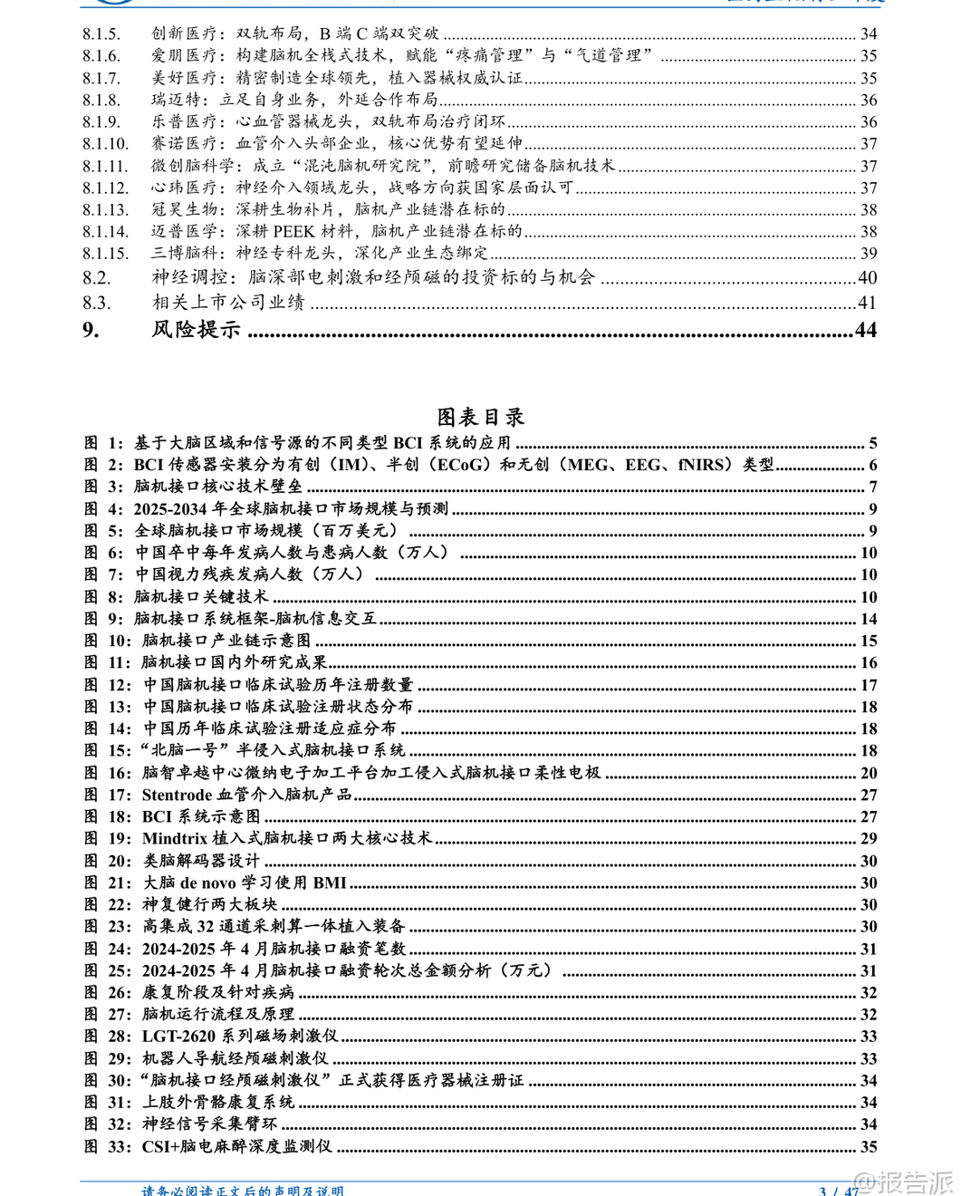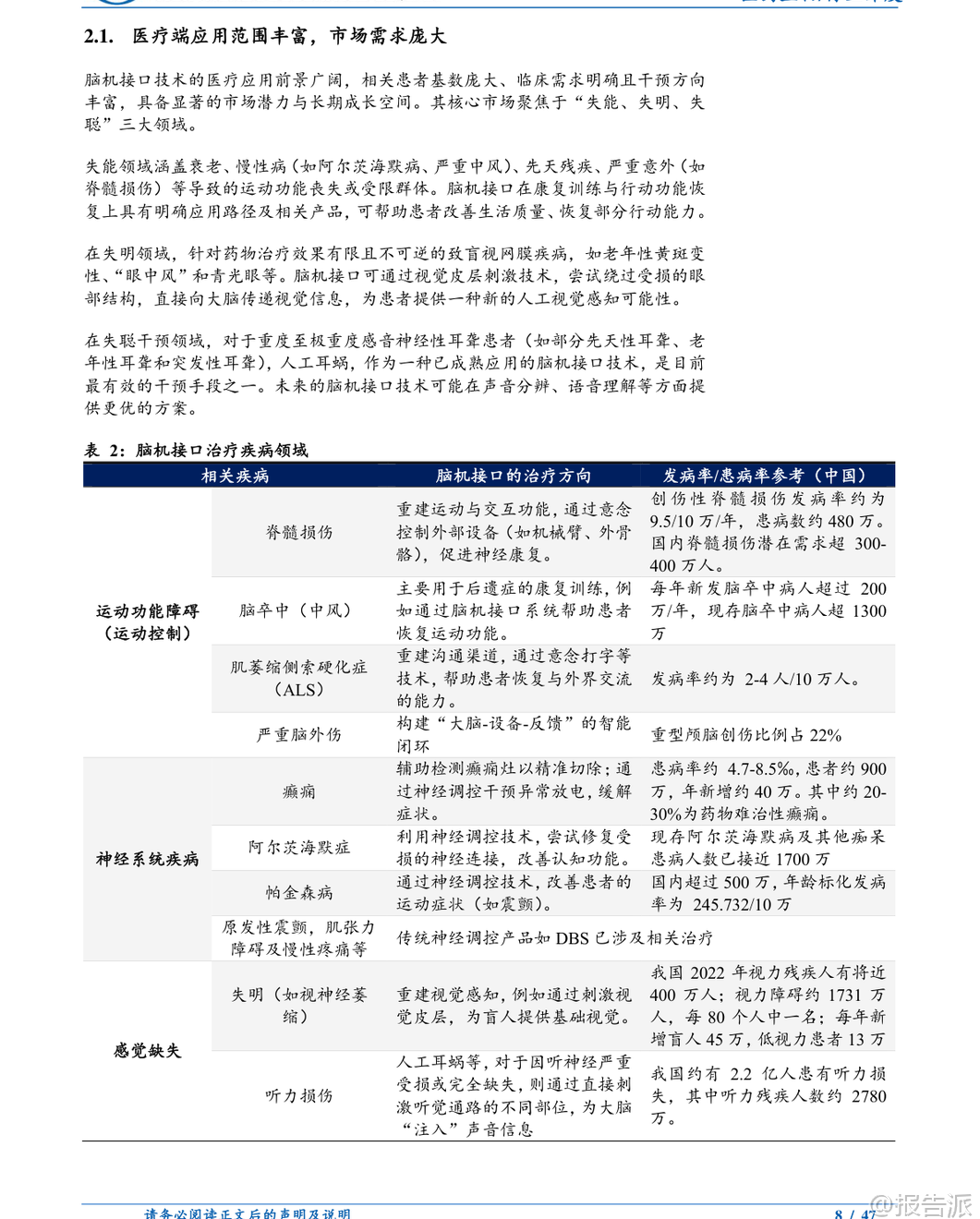 | 脑机接口(Brain-Computer Interface, BCI)作为连接大脑与外部设备的颠覆性人机交互技术,正迎来前所未有的发展机遇。 根据东北证券发布的《脑机接口行业深度报告》,在国家顶层设计和产业生态协同推动下,我国脑机接口技术已从实验室研究迈入临床应用与商业化落地的关键阶段。 全球市场方面,2024年脑机接口市场规模已达26.2亿美元,Precedence Research预测,2025至2034年间复合增长率将达17.35%,到2034年有望突破124亿美元。 国内市场同步提速,2024年规模达32亿元,预计2027年将增至55.8亿元,年均增速约20%。 当前非侵入式产品占据主导地位,占比高达82%,主要应用于康复训练、认知监测等场景,而侵入式和介入式技术则成为未来高增长的核心驱动力。 核心技术层面,脑机接口的发展依赖三大关键环节:信号采集、解码算法与神经刺激。 目前行业形成三大技术路径:侵入式、半侵入式和非侵入式。 其中,侵入式通过植入皮质内微电极实现高精度信号读取,代表企业如Neuralink已完成21例人体植入手术;半侵入式以ECoG为代表,平衡了信号质量与安全性,“北脑一号”128通道系统实现无线全植入,是我国在该领域的重大突破;非侵入式则以EEG为主,安全无创,已在消费级产品中广泛应用。 国内企业在多项关键技术上实现“全球首例”级突破。 例如,南开大学段峰团队完成全球首例介入式脑机接口人体试验,开创微创血管内植入新路径;中科院脑智卓越中心联合华山医院开展我国首例侵入式BCI前瞻性临床试验,标志着我国成为继美国后第二个掌握该技术的国家;此外,在柔性电极、汉语语言解码、视觉重建等领域也取得领先成果,显示出中国在特定应用场景下的差异化竞争优势。 政策端持续加码,为行业发展提供强力支撑。 “十四五”“十五五”规划均将脑机接口列为国家战略重点,科技部设立颠覆性技术专项,工信部等七部门联合发布产业发展实施意见。 医保支付体系加速完善,浙江率先将“非侵入式脑机接口适配费”纳入医保乙类报销范围,湖北、江苏等地明确收费标准,打通商业化闭环的关键瓶颈。 北京、上海等地出台专项政策,构建标准制定、基金支持、产业集聚的完整生态。 产业链方面,上游核心部件国产化进程加快,国产模拟芯片功耗较海外产品降低60%;中游产品逐步落地,医疗康复是当前最成熟的应用领域,覆盖卒中、脊髓损伤、渐冻症等功能障碍患者的运动与语言重建;下游场景向消费电子、工业安全、航天等领域拓展,形成多元化应用格局。 投资逻辑上,建议聚焦三大主线:一是非侵入式产品商业化领先企业,如翔宇医疗、伟思医疗等已在康复设备中实现规模化应用;二是侵入式/介入式技术临床突破标的,如心玮医疗、微创脑科学正推进关键临床试验;三是产业链核心部件供应商,包括芯片、电极、精密制造等环节。 同时需关注三大催化因素:医保支付扩围、海外头部企业技术映射、硬科技公司上市进程。 值得注意的是,尽管前景广阔,行业仍面临多重挑战:技术层面存在生物相容性、长期稳定性与信号解码复杂性难题;产业化面临成本高、审批严、用户教育不足等问题;伦理与数据安全问题亦不容忽视,需建立完善的治理框架。 总体来看,脑机接口正处于“技术验证向商业化初期过渡”的关键窗口期。 医疗康复因需求刚性、政策支持明确,将成为率先爆发的核心赛道。 随着技术迭代、支付体系完善与资本助力,国产脑机接口有望在全球竞争中占据重要一席,开启“增强人类”的新时代。 本文由【报告派】研读,输出观点仅作为行业分析! 原文标题:2026-02-08-东北证券-东北证券-脑机接口行业深度报告:顶层战略支持,国产脑机技术进入发展快车道 发布时间:2026年 报告出品方:东北证券 文档页数:47页