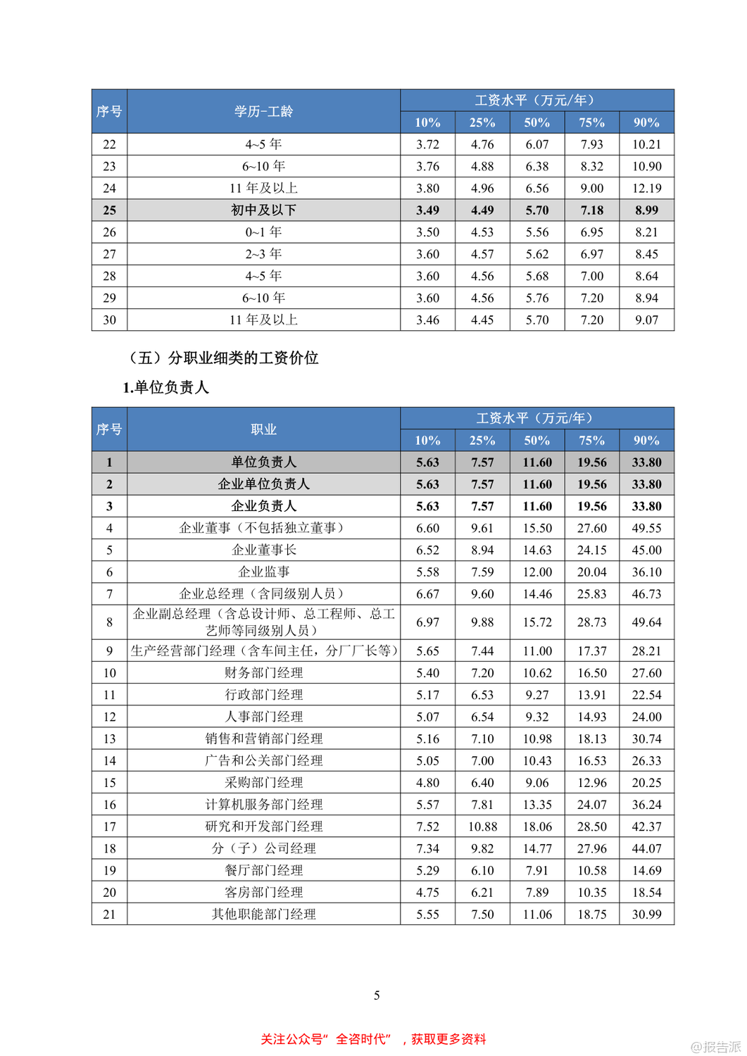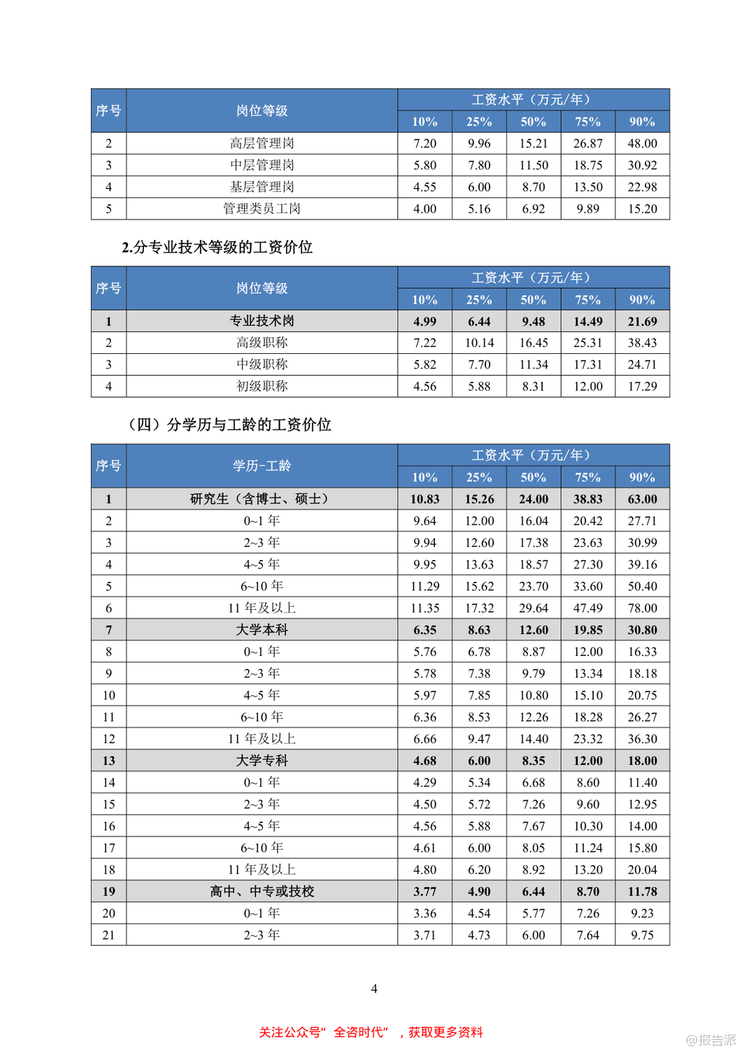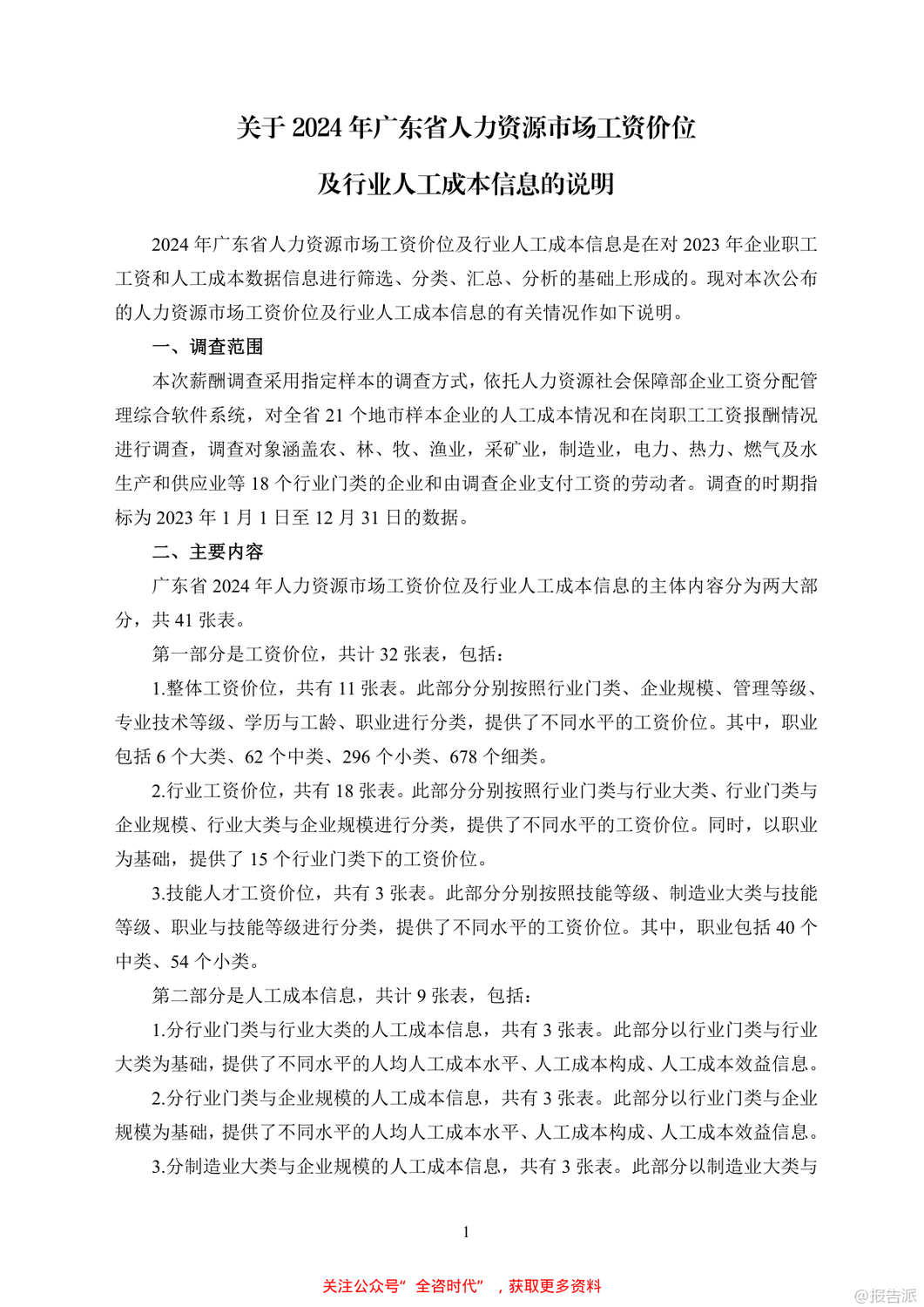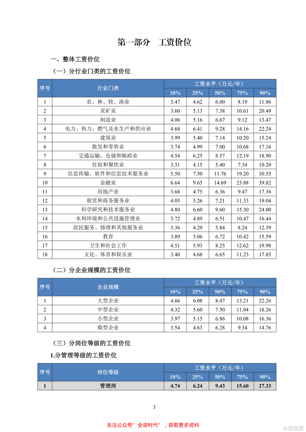 | 近日,广东省人力资源和社会保障厅发布了《2024年广东省人力资源市场工资价位及行业人工成本信息》报告,全面揭示了当前全省各行业、岗位、学历与工龄背景下的薪酬分布格局,以及企业人工成本结构与效益情况。 这份覆盖广泛、数据详实的官方报告,为求职者、企业HR及政策制定者提供了极具价值的参考依据。 从整体工资水平来看,不同职业类别之间的收入差距显著。 单位负责人年薪中位数达11.6万元,而农林牧渔业生产人员仅为3.7万元,凸显出管理层与基层劳动者之间的薪酬鸿沟。 在专业技术人员中,科学研究人员表现亮眼,中位数为11.98万元,其中生物学、医学和海洋工程领域尤为突出,海洋工程技术人员年薪90分位值高达45.23万元,显示出高端技术人才的稀缺性与高回报。 相比之下,教育学研究人员薪资偏低,中位数仅7万元,反映出部分公共服务领域的薪酬竞争力有待提升。 分行业看,信息传输、软件和信息技术服务业成为高薪代表,单位负责人年薪中位数达18万元,是全省平均水平的近两倍。 金融业虽人工成本占比高,但利润贡献波动较大,尤其是资本市场服务类企业人事费用率高达36.11%,百元人工成本利润却仅为112元,表明其人力投入产出效率面临挑战。 相比之下,制造业如汽车、电气机械等行业保持稳健的人工成本利润率,显示其较强的盈利能力。 值得注意的是,企业规模对薪酬水平影响明显。 大型企业普遍高于中小微企业,但在某些细分领域,小微企业因灵活机制也可能实现较高人工成本利润,如交通运输业的微型企业百元人工成本利润高达1286元,远超其他规模企业。 学历与工龄仍是决定薪资的重要因素。 本科及以上学历人群年薪中位数突破9万元,且随工龄增长持续上升,11年以上经验者可达14.4万元以上。 大专及以下学历群体则增长平缓,凸显终身学习与技能积累的重要性。 此外,报告还披露了人工成本构成,员工劳动报酬平均占比超80%,保险费用、福利支出等次之。 住宿餐饮业人工成本占总成本比重高达30.6%,但利润率接近盈亏平衡甚至亏损,提示行业经营压力较大。 总体而言,该报告不仅是一份薪资指南,更是观察广东经济结构、产业升级与劳动力市场趋势的重要窗口。 它提醒我们,在数字经济与先进制造驱动下,技术型、管理型人才将持续获得溢价,而传统服务业需通过提质增效来改善人力回报。 出品方:广东省人社厅 发布时间:2024年 文档页数:159页