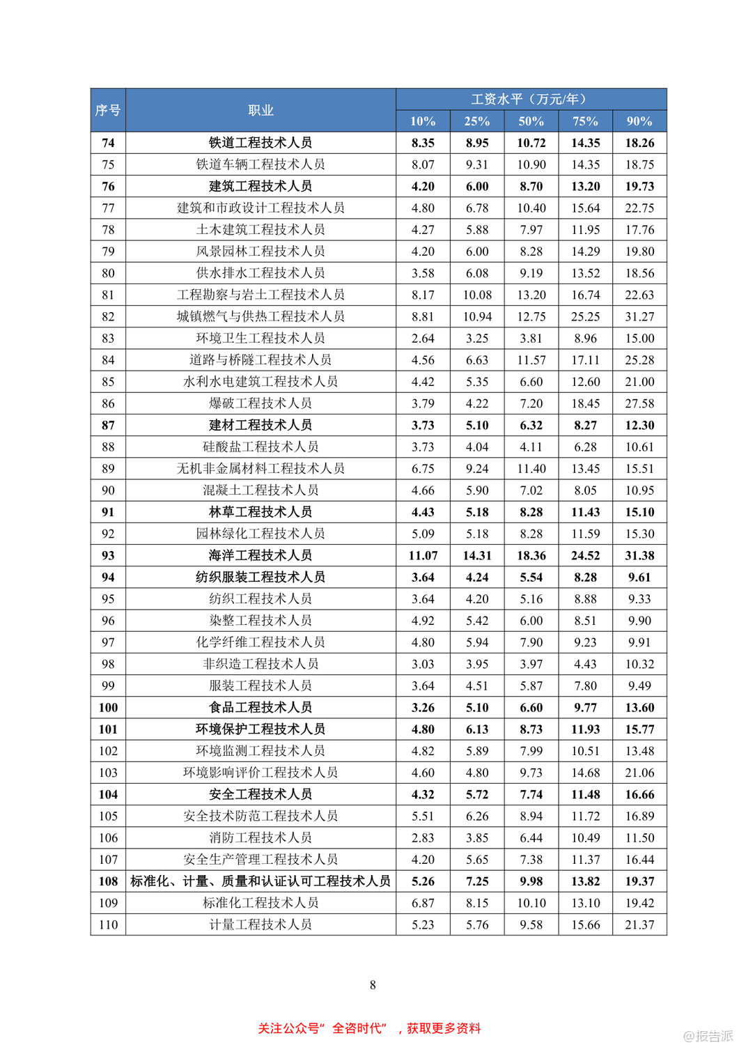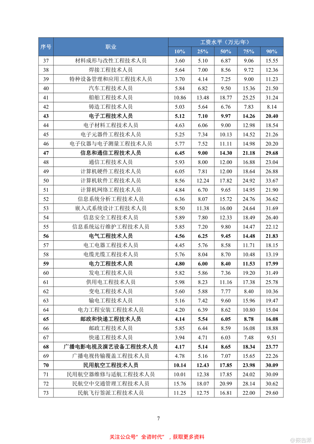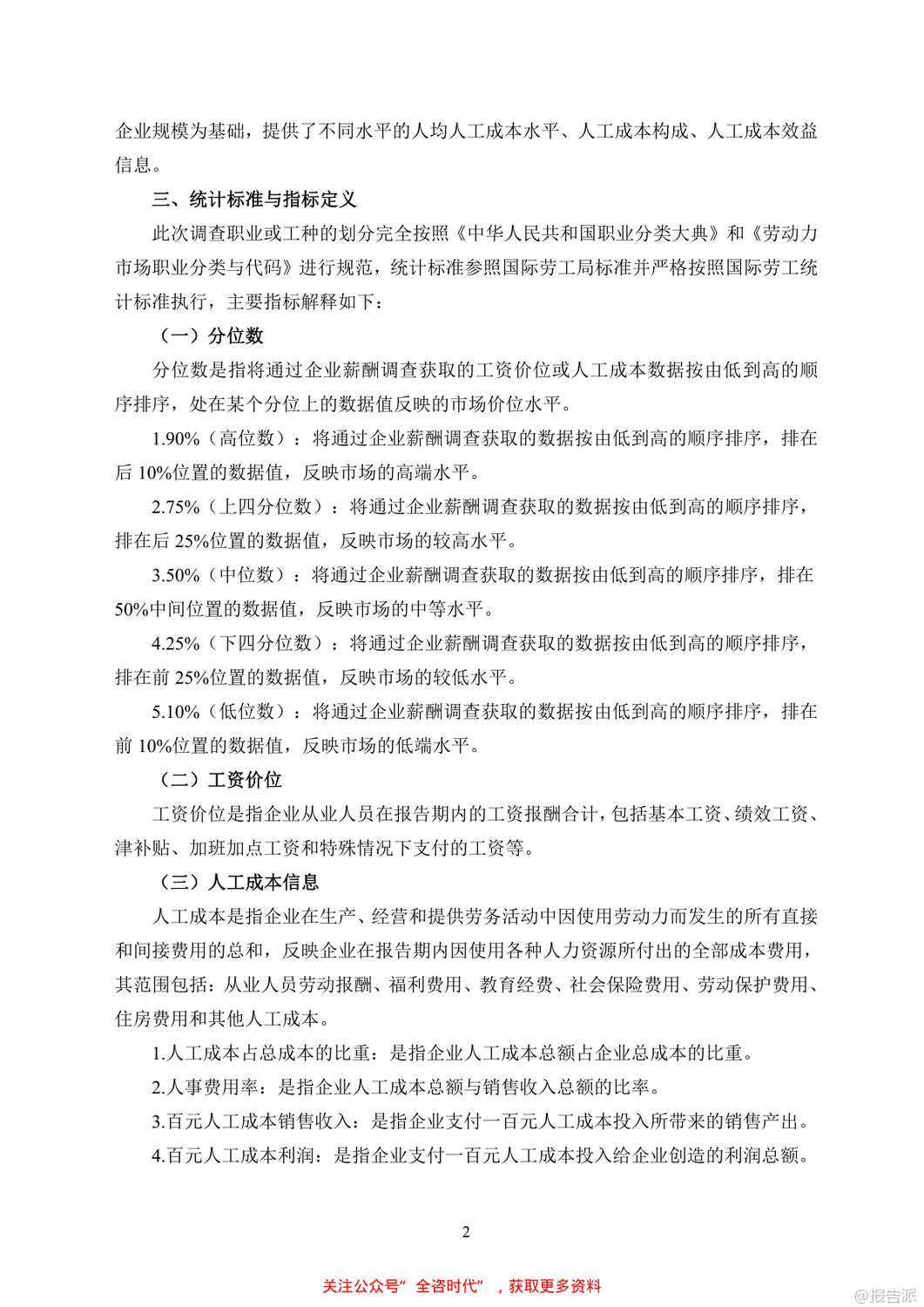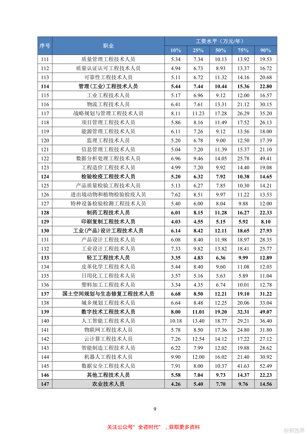 | 近日,广东省人力资源和社会保障厅发布了《2024年广东省人力资源市场工资价位及行业人工成本信息》报告,全面揭示了当前全省各行业、岗位、学历与工龄背景下的薪酬分布格局,以及企业人工成本结构与效益情况。 这份覆盖广泛、数据详实的官方报告,为求职者、企业HR及政策制定者提供了极具价值的参考依据。 从整体工资水平来看,不同职业类别之间的收入差距显著。 单位负责人年薪中位数达11.6万元,而农林牧渔业生产人员仅为3.7万元,凸显出管理层与基层劳动者之间的薪酬鸿沟。 在专业技术人员中,科学研究人员表现亮眼,中位数为11.98万元,其中生物学、医学和海洋工程领域尤为突出,海洋工程技术人员年薪90分位值高达45.23万元,显示出高端技术人才的稀缺性与高回报。 相比之下,教育学研究人员薪资偏低,中位数仅7万元,反映出部分公共服务领域的薪酬竞争力有待提升。 分行业看,信息传输、软件和信息技术服务业成为高薪代表,单位负责人年薪中位数达18万元,是全省平均水平的近两倍。 金融业虽人工成本占比高,但利润贡献波动较大,尤其是资本市场服务类企业人事费用率高达36.11%,百元人工成本利润却仅为112元,表明其人力投入产出效率面临挑战。 相比之下,制造业如汽车、电气机械等行业保持稳健的人工成本利润率,显示其较强的盈利能力。 值得注意的是,企业规模对薪酬水平影响明显。 大型企业普遍高于中小微企业,但在某些细分领域,小微企业因灵活机制也可能实现较高人工成本利润,如交通运输业的微型企业百元人工成本利润高达1286元,远超其他规模企业。 学历与工龄仍是决定薪资的重要因素。 本科及以上学历人群年薪中位数突破9万元,且随工龄增长持续上升,11年以上经验者可达14.4万元以上。 大专及以下学历群体则增长平缓,凸显终身学习与技能积累的重要性。 此外,报告还披露了人工成本构成,员工劳动报酬平均占比超80%,保险费用、福利支出等次之。 住宿餐饮业人工成本占总成本比重高达30.6%,但利润率接近盈亏平衡甚至亏损,提示行业经营压力较大。 总体而言,该报告不仅是一份薪资指南,更是观察广东经济结构、产业升级与劳动力市场趋势的重要窗口。 它提醒我们,在数字经济与先进制造驱动下,技术型、管理型人才将持续获得溢价,而传统服务业需通过提质增效来改善人力回报。 出品方:广东省人社厅 发布时间:2024年 文档页数:159页
