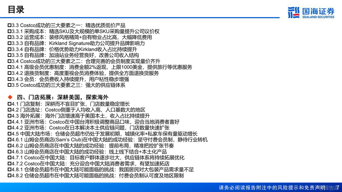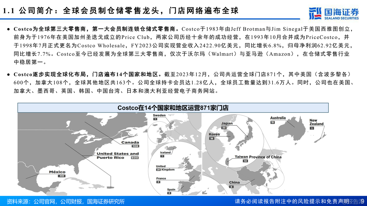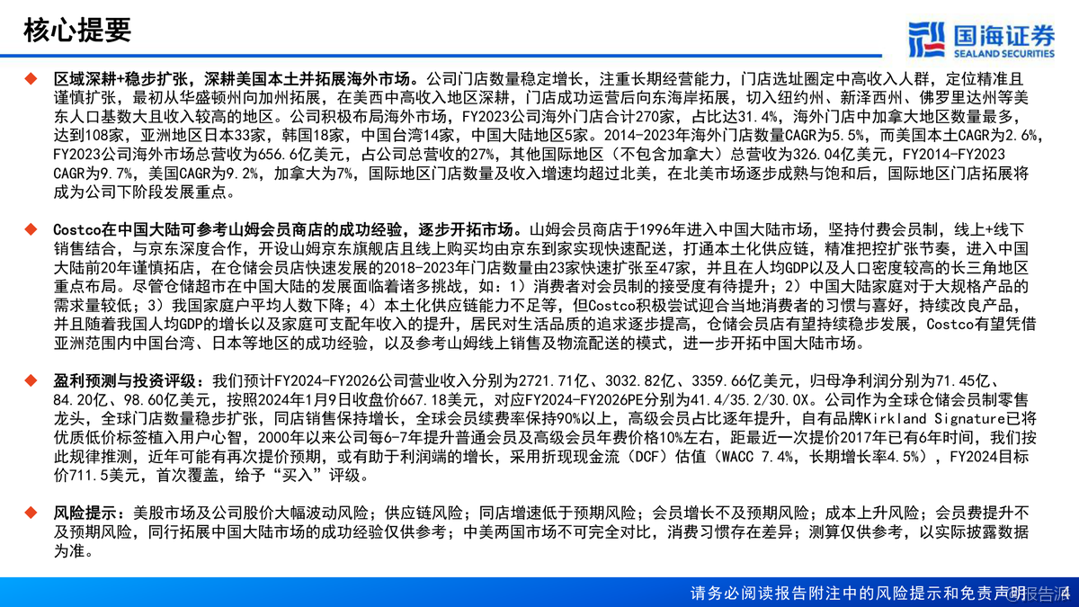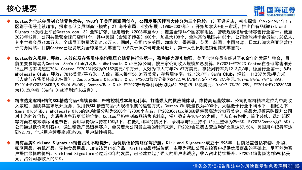 | Costco(COST.US)作为全球会员制仓储零售的龙头企业,自1983年在美国西雅图创立以来,已发展成为仅次于沃尔玛和亚马逊的全球第三大零售商,同时也是全球第一大会员制连锁仓储式零售商。 截至2023年12月,Costco在全球14个国家和地区运营着871家门店,其中美国(含波多黎各)600家、加拿大108家、其他国际地区163家,全球持卡会员达1.28亿人,付费会员7100万人,员工总数达31.6万人。 公司不仅在线下布局广泛,还在美国、加拿大、墨西哥、英国、韩国、中国台湾、日本和澳大利亚等地开展电商业务。 从经营表现来看,Costco展现出强劲的增长势头和卓越的盈利能力。 2023财年公司实现营业收入2422.90亿美元,同比增长6.8%;归母净利润62.92亿美元,同比增长7.7%。 过去十年(FY2014-FY2023),营收复合年增长率(CAGR)为8.9%,归母净利润CAGR更是高达13.2%,远超行业平均水平。 其坪效达到20152美元/平方米,人效为每人每年76.67万美元,存货周转率高达12.3次/年,均稳居行业首位。 相比之下,Sam’s Club和BJ’s Wholesale Club在这些关键运营指标上均落后于Costco。 Costco的核心竞争力在于其独特的商业模式:精选SKU、优质低价、高用户粘性和强大的供应链体系。 公司SKU数量仅约4000个,远低于传统超市的2-3万个,通过精简品类实现单品大规模采购,从而大幅提升对上游供应商的议价能力。 其商品销售毛利率长期控制在10%-12%之间,费用率维持在10%以下,真正实现了“薄利多销”。 而会员费则是公司最主要的利润来源,2023年会员费占营业利润比重高达57.58%。 美国地区会员续费率高达92.7%,全球续费率超过90%,显示出极强的用户粘性。 自有品牌Kirkland Signature是Costco战略的重要组成部分,涵盖衣物、食品、家居、宠物、加油站等多个品类,凭借“优质低价”的定位赢得了消费者的广泛认可。 2021年Kirkland销售额达到590亿美元,占公司总收入的31%,已成为推动增长的关键引擎。 此外,公司注重成本控制,约79%的门店为自有物业,选址多位于郊区,装修简洁,有效降低了租金和运营成本。 在区域拓展方面,Costco采取“深耕本土、稳健出海”的策略。 北美仍是其核心市场,但近年来国际地区增长迅猛。 2014-2023年海外门店CAGR为5.5%,高于美国本土的2.6%;国际地区收入CAGR达9.7%,显著高于美国的9.2%和加拿大的7%。 特别是在亚洲市场,日本门店已达33家,中国台湾14家,中国大陆5家(主要集中在长三角),未来国际化扩张将是重要增长点。 展望未来,国海证券预计Costco 2024-2026年营收将分别达到2721.71亿、3032.82亿和3359.66亿美元,归母净利润分别为71.45亿、84.20亿和98.60亿美元。 考虑到其稳健的同店增长、高续费率以及潜在的会员费提价空间(上次提价为2017年),首次覆盖给予“买入”评级。 出品方:国海 发布时间:2024年 文档页数:64页