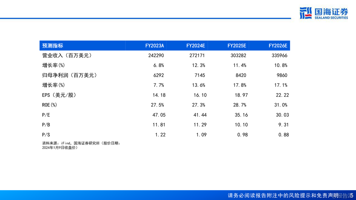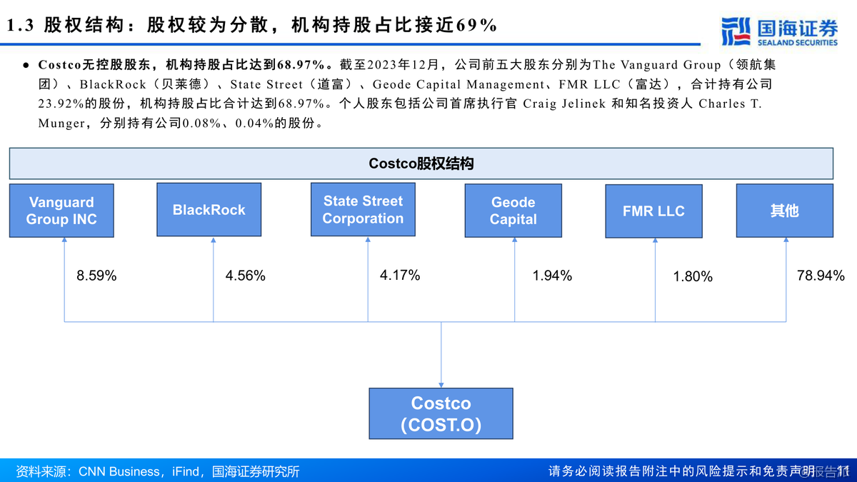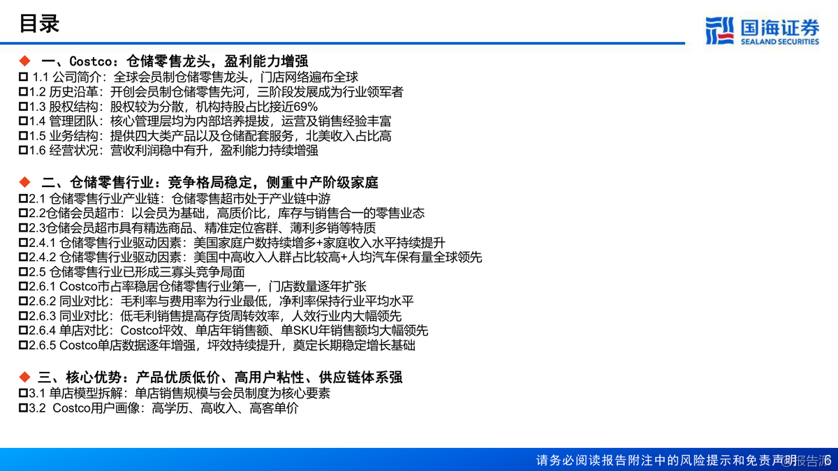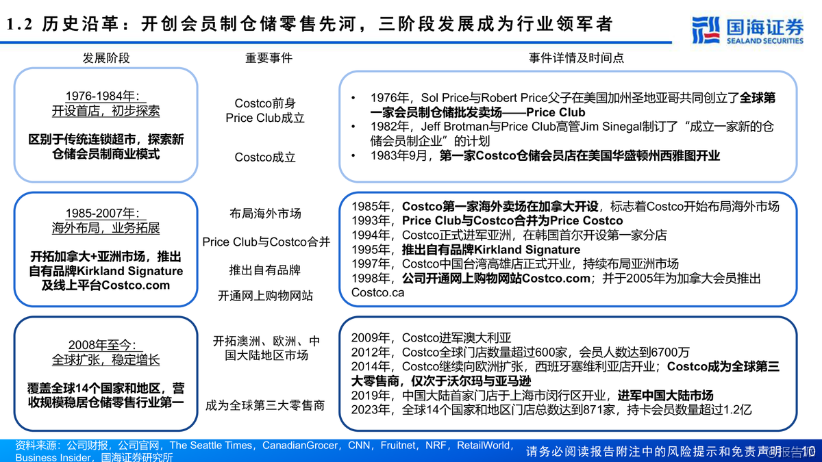 | Costco(COST.US)作为全球会员制仓储零售的龙头企业,自1983年在美国西雅图创立以来,已发展成为仅次于沃尔玛和亚马逊的全球第三大零售商,同时也是全球第一大会员制连锁仓储式零售商。 截至2023年12月,Costco在全球14个国家和地区运营着871家门店,其中美国(含波多黎各)600家、加拿大108家、其他国际地区163家,全球持卡会员达1.28亿人,付费会员7100万人,员工总数达31.6万人。 公司不仅在线下布局广泛,还在美国、加拿大、墨西哥、英国、韩国、中国台湾、日本和澳大利亚等地开展电商业务。 从经营表现来看,Costco展现出强劲的增长势头和卓越的盈利能力。 2023财年公司实现营业收入2422.90亿美元,同比增长6.8%;归母净利润62.92亿美元,同比增长7.7%。 过去十年(FY2014-FY2023),营收复合年增长率(CAGR)为8.9%,归母净利润CAGR更是高达13.2%,远超行业平均水平。 其坪效达到20152美元/平方米,人效为每人每年76.67万美元,存货周转率高达12.3次/年,均稳居行业首位。 相比之下,Sam’s Club和BJ’s Wholesale Club在这些关键运营指标上均落后于Costco。 Costco的核心竞争力在于其独特的商业模式:精选SKU、优质低价、高用户粘性和强大的供应链体系。 公司SKU数量仅约4000个,远低于传统超市的2-3万个,通过精简品类实现单品大规模采购,从而大幅提升对上游供应商的议价能力。 其商品销售毛利率长期控制在10%-12%之间,费用率维持在10%以下,真正实现了“薄利多销”。 而会员费则是公司最主要的利润来源,2023年会员费占营业利润比重高达57.58%。 美国地区会员续费率高达92.7%,全球续费率超过90%,显示出极强的用户粘性。 自有品牌Kirkland Signature是Costco战略的重要组成部分,涵盖衣物、食品、家居、宠物、加油站等多个品类,凭借“优质低价”的定位赢得了消费者的广泛认可。 2021年Kirkland销售额达到590亿美元,占公司总收入的31%,已成为推动增长的关键引擎。 此外,公司注重成本控制,约79%的门店为自有物业,选址多位于郊区,装修简洁,有效降低了租金和运营成本。 在区域拓展方面,Costco采取“深耕本土、稳健出海”的策略。 北美仍是其核心市场,但近年来国际地区增长迅猛。 2014-2023年海外门店CAGR为5.5%,高于美国本土的2.6%;国际地区收入CAGR达9.7%,显著高于美国的9.2%和加拿大的7%。 特别是在亚洲市场,日本门店已达33家,中国台湾14家,中国大陆5家(主要集中在长三角),未来国际化扩张将是重要增长点。 展望未来,国海证券预计Costco 2024-2026年营收将分别达到2721.71亿、3032.82亿和3359.66亿美元,归母净利润分别为71.45亿、84.20亿和98.60亿美元。 考虑到其稳健的同店增长、高续费率以及潜在的会员费提价空间(上次提价为2017年),首次覆盖给予“买入”评级。 出品方:国海 发布时间:2024年 文档页数:64页