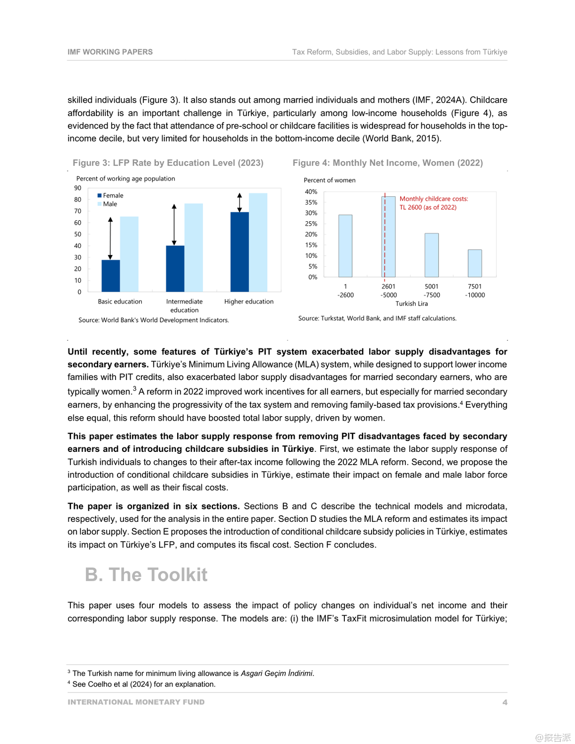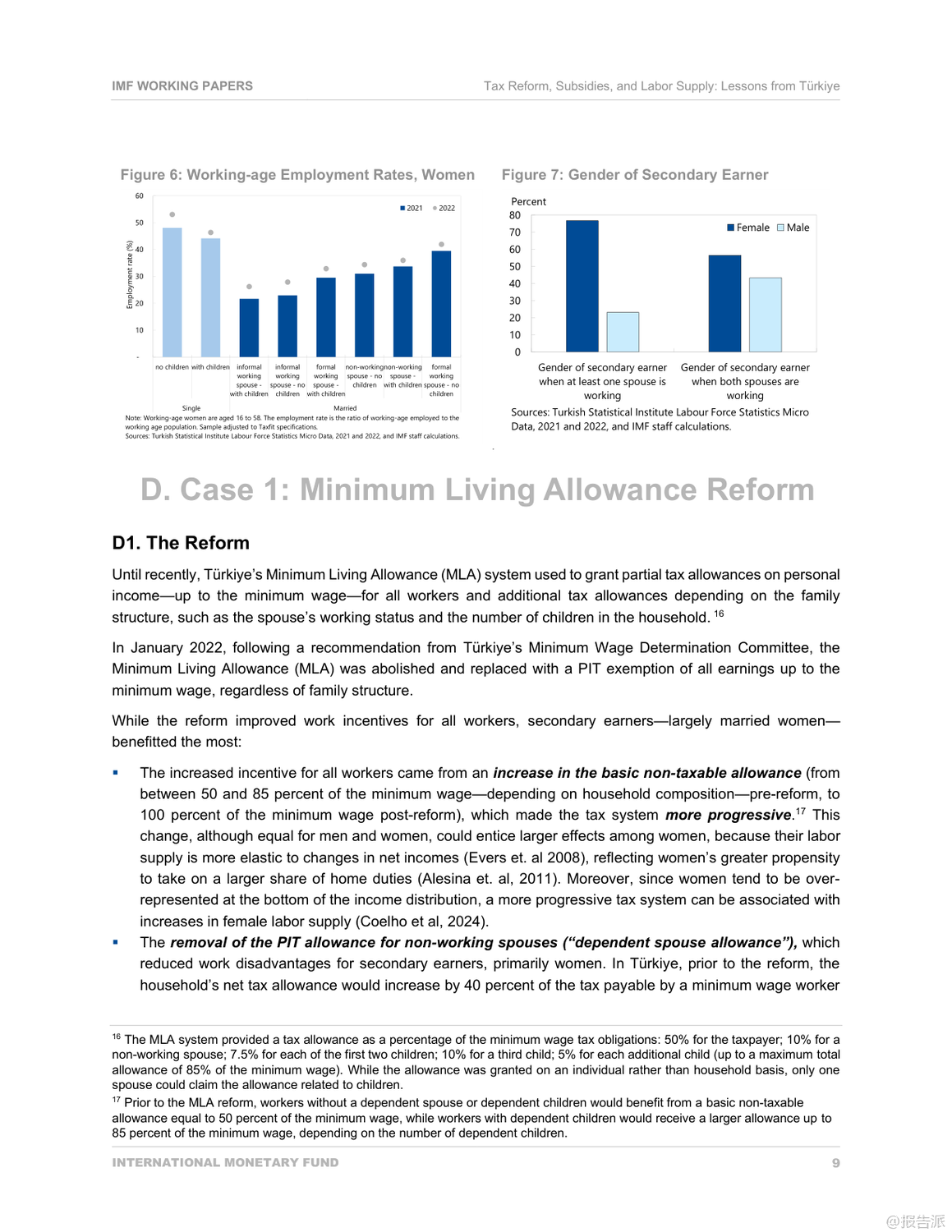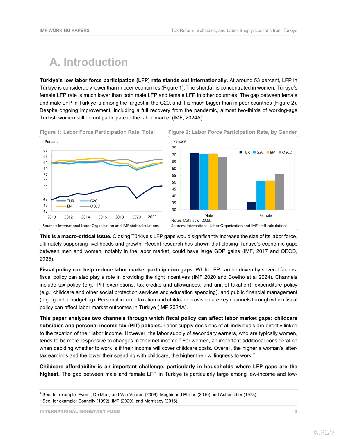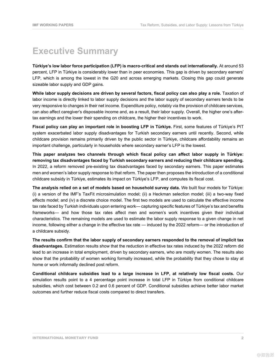 | 国际货币基金组织(IMF)于2025年发布题为《税制改革、补贴与劳动力供给:土耳其的经验教训》的工作论文,深入探讨了财政政策如何通过税收调整和育儿补贴影响劳动参与率,特别是女性及次级劳动者(通常为已婚女性)的就业决策。 该研究对土耳其近年来的政策实践提供了实证支持,也为其他国家提升劳动市场包容性提供了重要参考。 报告指出,土耳其总体劳动参与率约为53%,显著低于G20和经合组织国家平均水平,性别差距尤为突出——女性劳动参与率远低于男性,是全球性别鸿沟最大的国家之一。 这一现象不仅关乎社会公平,更具有宏观层面的重要性,因为提高女性就业率将直接扩大劳动力规模,推动经济增长。 研究认为,财政政策可通过两大渠道有效改善这一局面:一是优化个人所得税制度,消除对次级劳动者的隐性税收惩罚;二是提供有条件育儿补贴,降低家庭托育成本。 2022年,土耳其实施了一项关键税制改革,废除了原有的“最低生活津贴”(MLA)体系,转而实行统一的最低工资免税政策,并取消了针对非工作配偶的家庭税收优惠。 这项改革显著降低了已婚女性进入劳动力市场的边际有效税率。 研究利用四种模型(包括IMF的TaxFit模拟模型、Heckman选择模型、双向固定效应模型和离散选择模型)分析发现,改革后,次级劳动者的就业响应明显高于主要 earners,尤其是女性正式就业概率上升,而非就业或非正规就业的概率下降。 整体上,女性劳动参与率提升了约3个百分点,男性提升1.5个百分点,表明税制设计对激励女性重返职场具有显著作用。 此外,报告模拟了引入有条件育儿补贴的影响。 假设向双职工家庭每月每孩发放2600里拉的托育补贴,模拟结果显示,总劳动参与率可提升4个百分点,达到57%,其中女性贡献了8个百分点的增长。 更为重要的是,性别差距从36个百分点缩小至约30个百分点。 此类政策的财政成本相对可控,约占GDP的0.2%至0.6%,低于OECD国家在早期教育与保育上的平均支出(0.8%)。 研究强调,相比无条件现金转移支付,有条件补贴不仅能更有效地促进就业,还能因更多人就业带来的税收增加和社会援助减少而降低净财政负担,实现“激励相容”。 综上所述,IMF的研究证实,精准的财政工具——如消除婚姻相关的税收扭曲和实施就业挂钩的育儿支持——能够以较低成本显著提升劳动供给,尤其释放女性就业潜力。 这对面临类似结构性挑战的经济体具有重要的政策启示。 出品方:IMF 发布时间:2025年