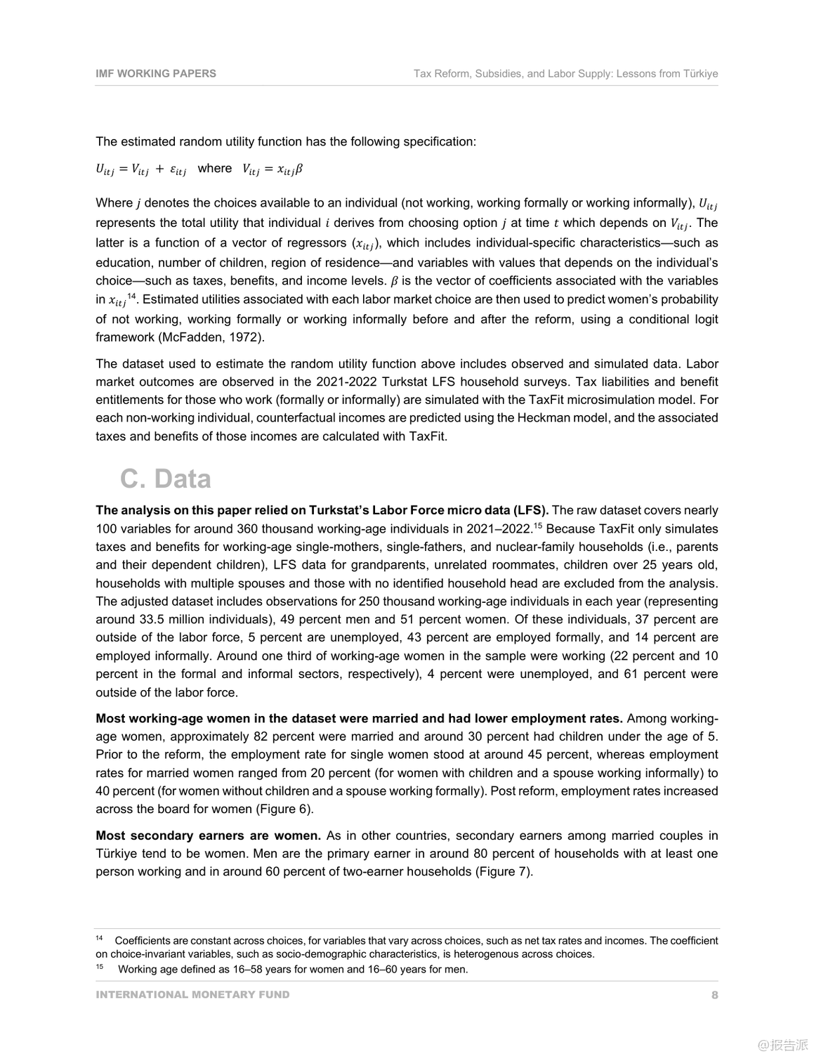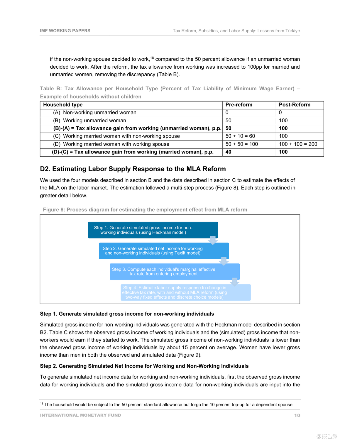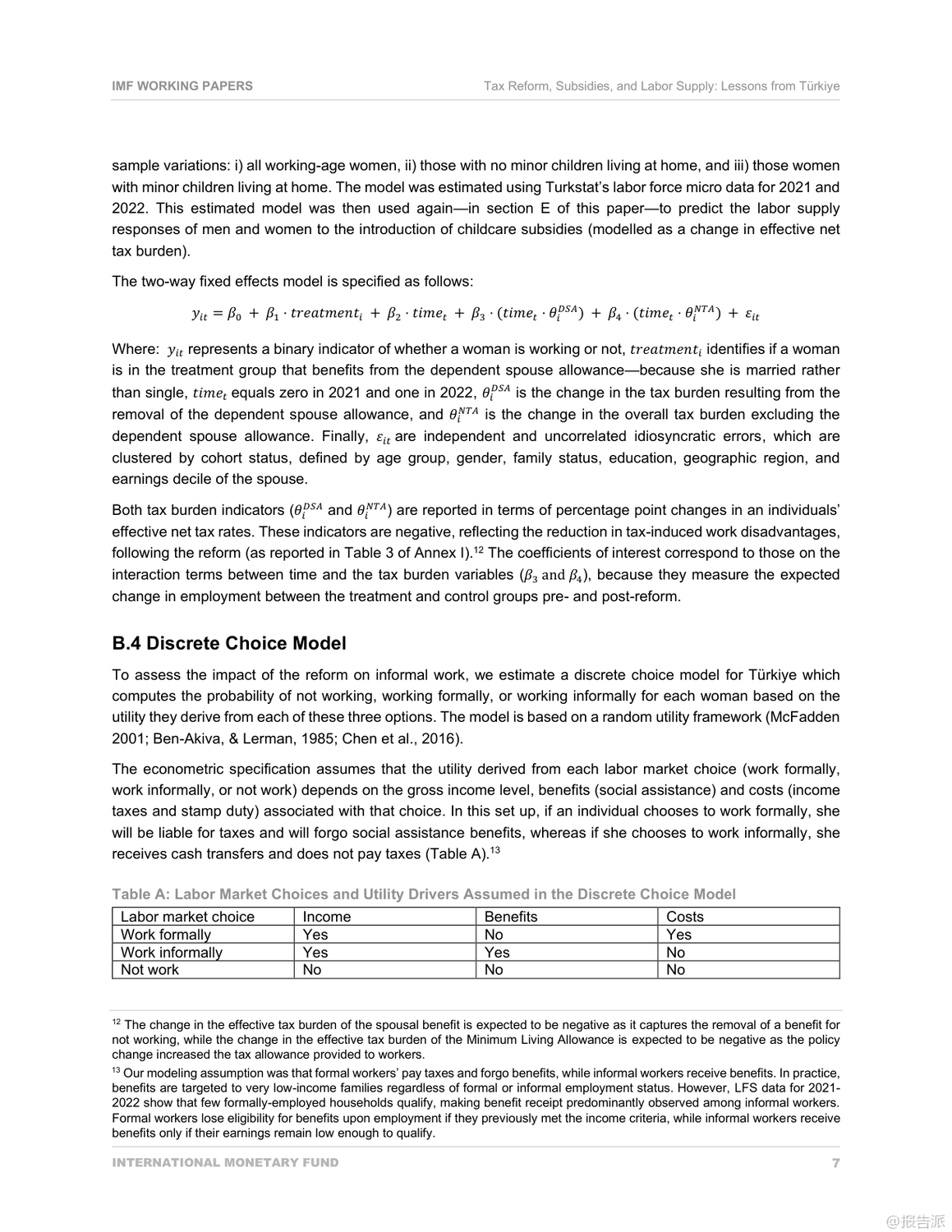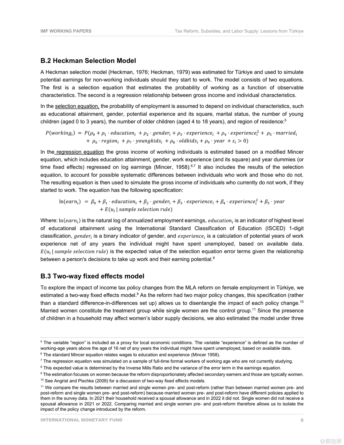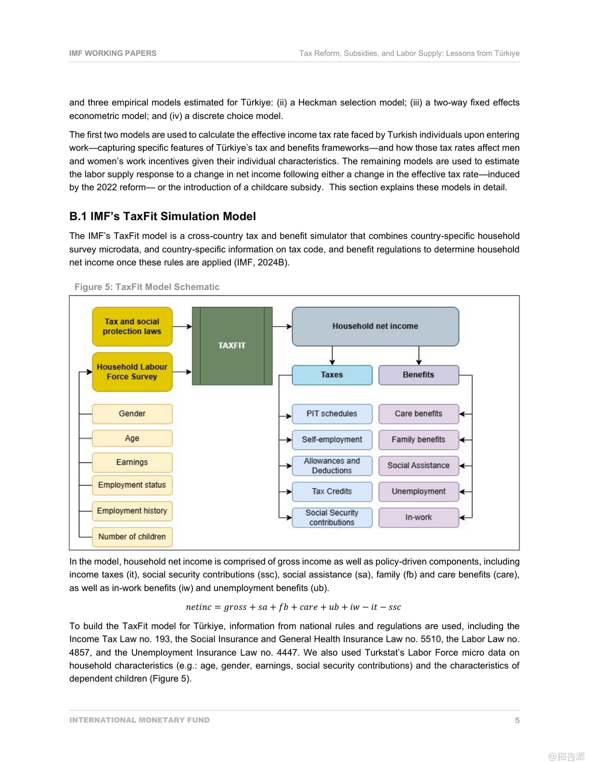 | 国际货币基金组织(IMF)于2025年发布题为《税制改革、补贴与劳动力供给:土耳其的经验教训》的工作论文,深入探讨了财政政策如何通过税收调整和育儿补贴影响劳动参与率,特别是女性及次级劳动者(通常为已婚女性)的就业决策。 该研究对土耳其近年来的政策实践提供了实证支持,也为其他国家提升劳动市场包容性提供了重要参考。 报告指出,土耳其总体劳动参与率约为53%,显著低于G20和经合组织国家平均水平,性别差距尤为突出——女性劳动参与率远低于男性,是全球性别鸿沟最大的国家之一。 这一现象不仅关乎社会公平,更具有宏观层面的重要性,因为提高女性就业率将直接扩大劳动力规模,推动经济增长。 研究认为,财政政策可通过两大渠道有效改善这一局面:一是优化个人所得税制度,消除对次级劳动者的隐性税收惩罚;二是提供有条件育儿补贴,降低家庭托育成本。 2022年,土耳其实施了一项关键税制改革,废除了原有的“最低生活津贴”(MLA)体系,转而实行统一的最低工资免税政策,并取消了针对非工作配偶的家庭税收优惠。 这项改革显著降低了已婚女性进入劳动力市场的边际有效税率。 研究利用四种模型(包括IMF的TaxFit模拟模型、Heckman选择模型、双向固定效应模型和离散选择模型)分析发现,改革后,次级劳动者的就业响应明显高于主要 earners,尤其是女性正式就业概率上升,而非就业或非正规就业的概率下降。 整体上,女性劳动参与率提升了约3个百分点,男性提升1.5个百分点,表明税制设计对激励女性重返职场具有显著作用。 此外,报告模拟了引入有条件育儿补贴的影响。 假设向双职工家庭每月每孩发放2600里拉的托育补贴,模拟结果显示,总劳动参与率可提升4个百分点,达到57%,其中女性贡献了8个百分点的增长。 更为重要的是,性别差距从36个百分点缩小至约30个百分点。 此类政策的财政成本相对可控,约占GDP的0.2%至0.6%,低于OECD国家在早期教育与保育上的平均支出(0.8%)。 研究强调,相比无条件现金转移支付,有条件补贴不仅能更有效地促进就业,还能因更多人就业带来的税收增加和社会援助减少而降低净财政负担,实现“激励相容”。 综上所述,IMF的研究证实,精准的财政工具——如消除婚姻相关的税收扭曲和实施就业挂钩的育儿支持——能够以较低成本显著提升劳动供给,尤其释放女性就业潜力。 这对面临类似结构性挑战的经济体具有重要的政策启示。 出品方:IMF 发布时间:2025年