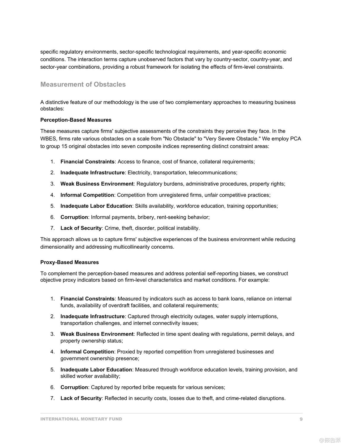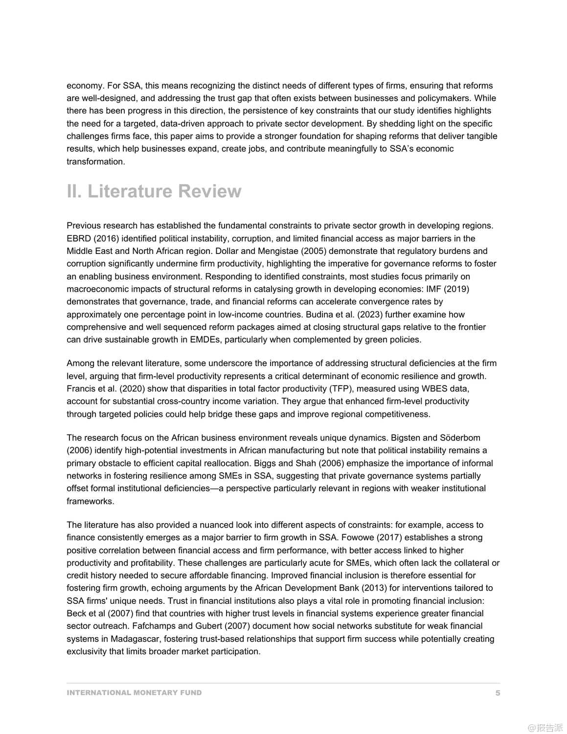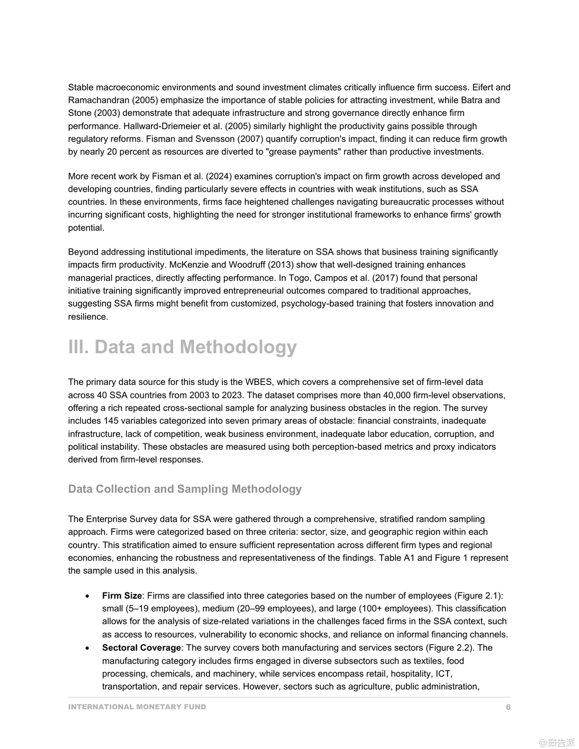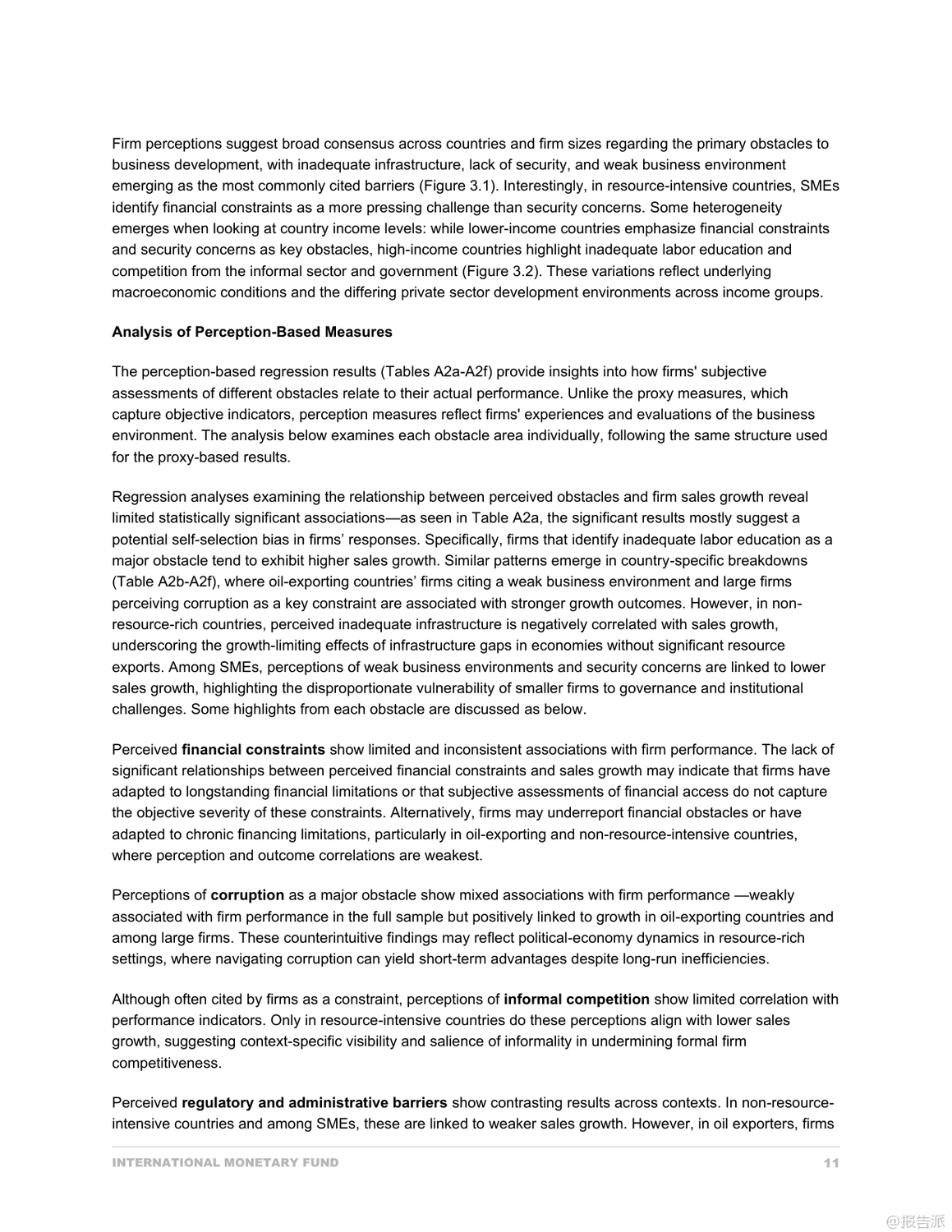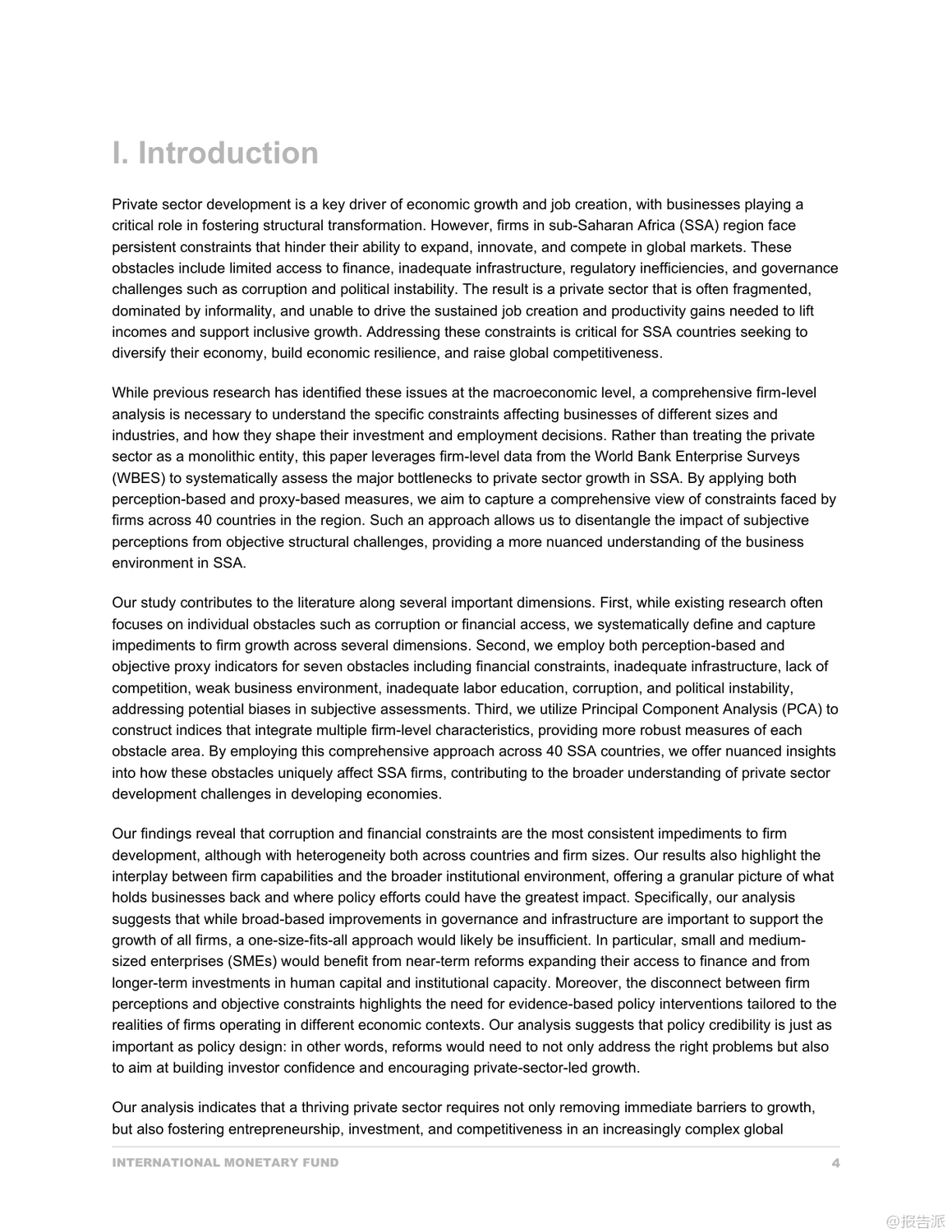 | 撒哈拉以南非洲(SSA)的私营部门是推动经济增长与就业创造的关键引擎,但其发展长期受制于多重结构性障碍。 国际货币基金组织(IMF)最新发布的《撒哈拉以南非洲私营部门发展的瓶颈:公司层面的分析》报告,基于世界银行企业调查(WBES)覆盖40个国家、超过4万家企业的数据,采用感知与代理指标相结合的方法,系统揭示了阻碍企业成长的核心瓶颈。 研究发现,企业在主观感知与客观现实之间存在显著差异。 尽管企业普遍将基础设施不足列为最大挑战,但通过主成分分析(PCA)构建的代理指标显示,腐败和融资约束才是对企业增长最具破坏性的两大因素。 其中,腐败对销售增长的负面影响高达30.8%,远超其他障碍;而融资难则严重制约企业的出口、进口及雇佣扩张能力,尤其在石油出口国表现尤为突出。 中小企业(SMEs)面临的困境更为严峻。 它们在获取信贷方面处于明显劣势——更少拥有透支额度,更多依赖亲友借款和个人贷款维持运营。 同时,高抵押要求和财务报表认证率低进一步加剧了融资壁垒。 此外,SMEs在应对腐败时也更为脆弱,报告称其在检查和合同获取过程中遭遇非正式支付请求的比例远高于大企业,部分国家SME甚至需支付年销售额3%以上的“润滑费”。 另一个关键发现是不同资源禀赋国家之间的异质性。 在石油出口国,腐败与劳动力教育不足等负面因素反而与企业高增长相关,这可能反映了一种租金经济下的特殊生存逻辑:掌握关系的企业能从体制漏洞中获益。 而在非资源型国家,基础设施短板成为更明显的增长制约。 资源密集型国家则深受非正规竞争之苦,扭曲了市场公平。 值得注意的是,企业在电力中断、交通不便等客观条件恶劣的情况下仍可能表现出较高业绩,这反映出韧性企业的适应机制——如自备发电机、优化物流等。 但这不应掩盖系统性基础设施投资的紧迫性,尤其是对无力承担额外成本的中小企业而言。 报告最后强调,政策制定不能仅依赖企业主观反馈。 必须结合客观指标识别真正制约增长的瓶颈,并实施差异化策略:加强反腐败制度建设、改革金融体系以提升中小企业信贷可得性、改善营商环境降低合规成本、推动技能发展与数字基础设施普及。 唯有如此,才能释放撒哈拉以南非洲私营部门的巨大潜力,实现包容性经济转型。 出品方:IMF 发布时间:2025年 文档页数:49页