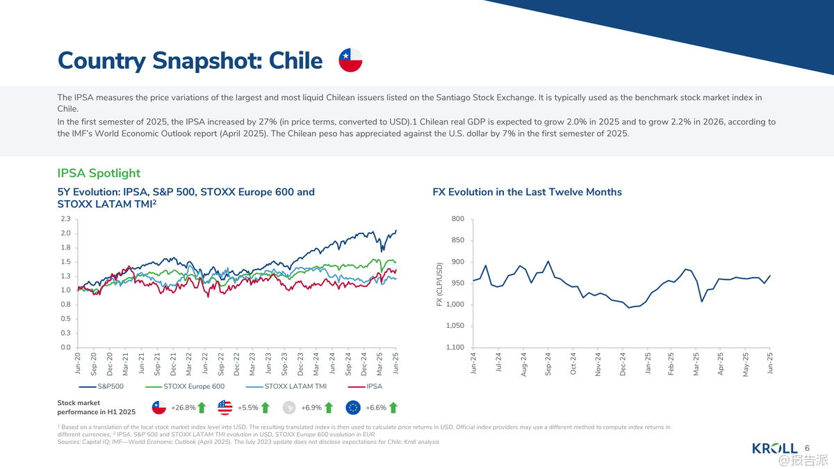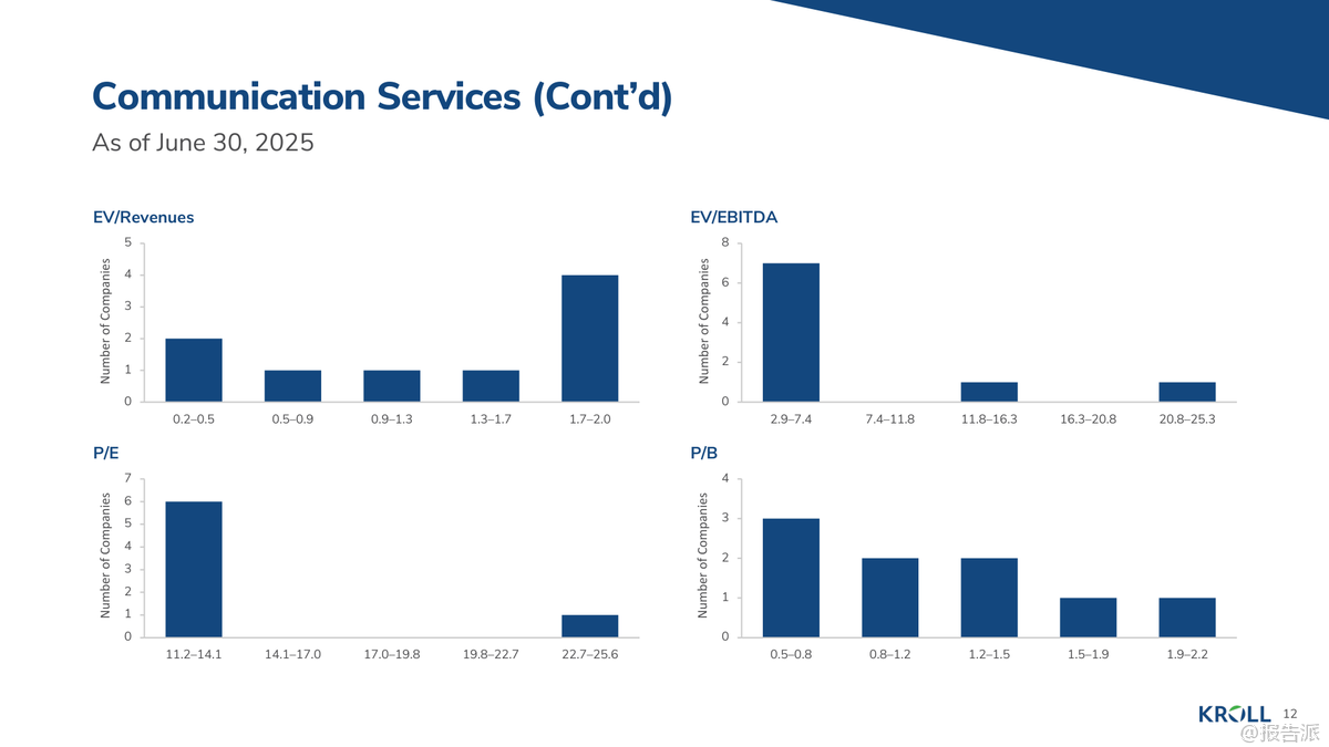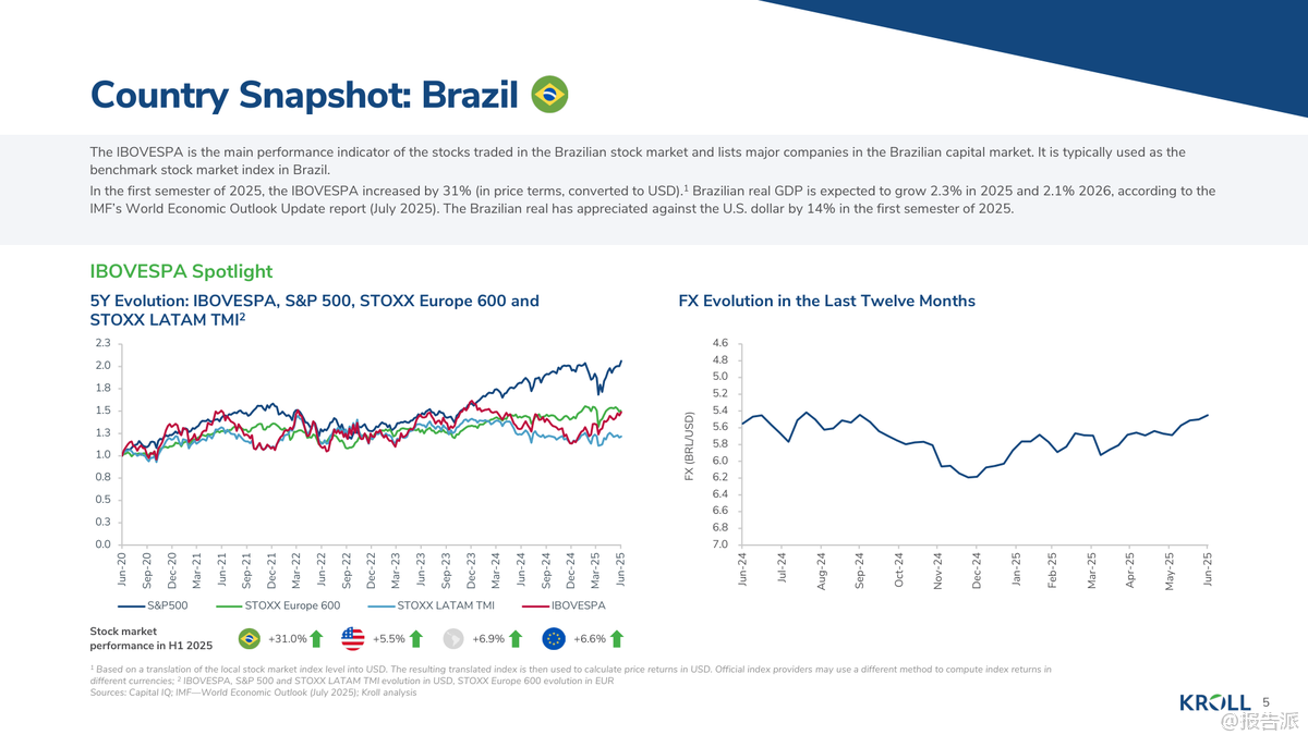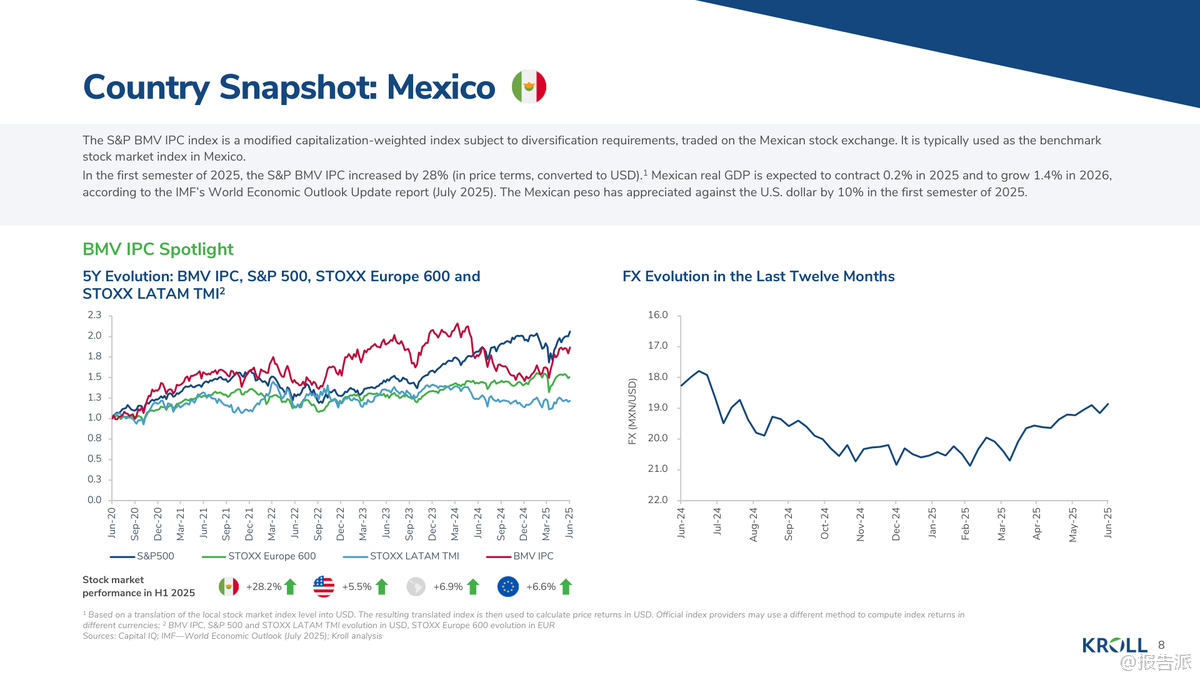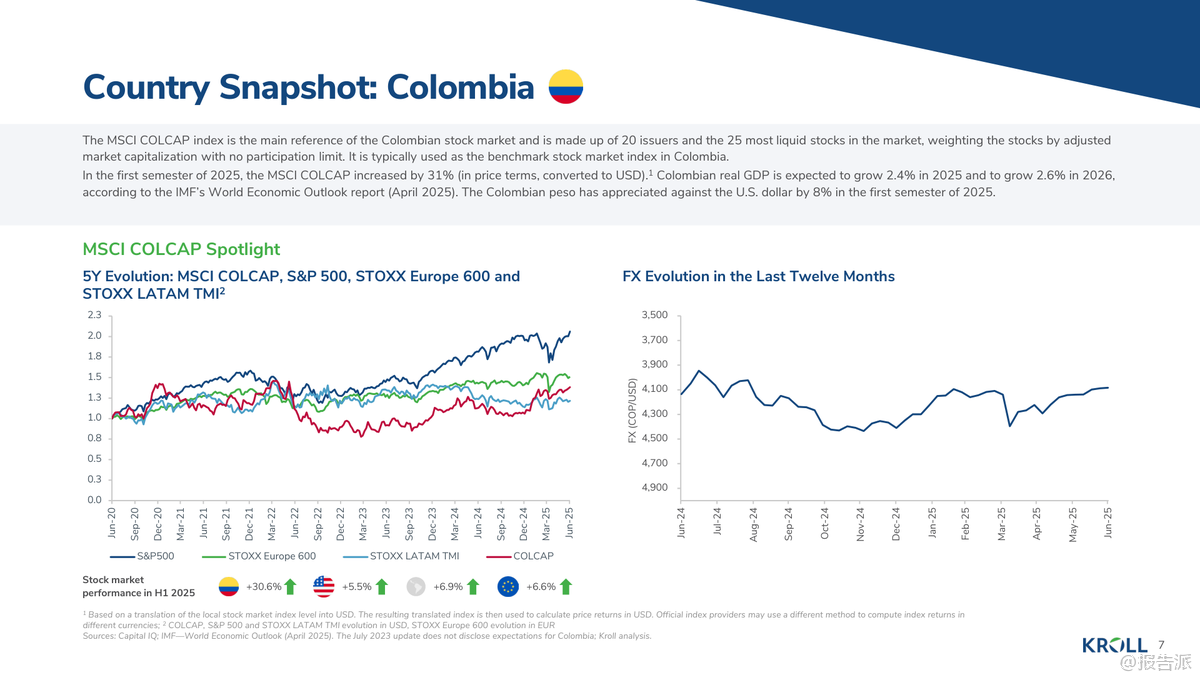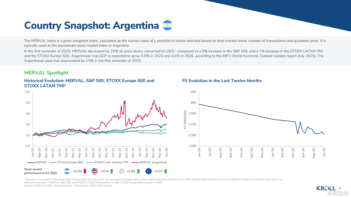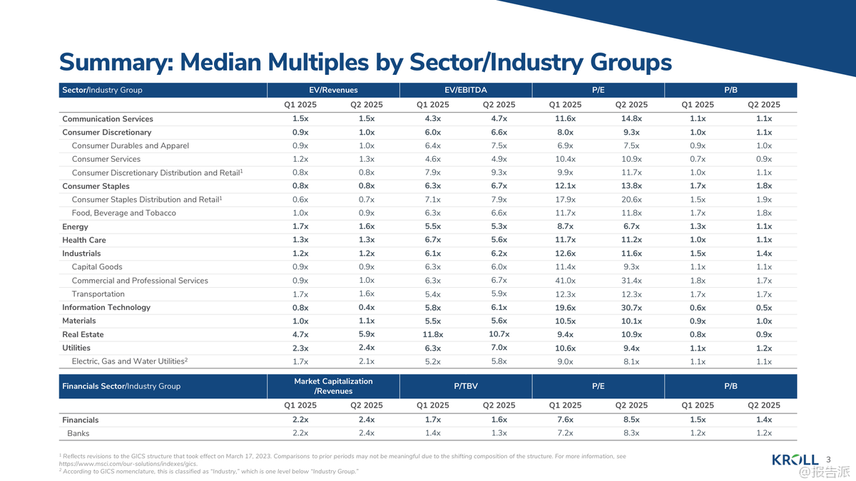 | Kroll最新发布的《2025年第一季度和第二季度拉丁美洲行业倍数报告》(第十版)深入分析了截至2025年3月31日和6月30日拉美地区各主要行业的交易估值倍数趋势。 该报告覆盖了阿根廷、巴西、智利、哥伦比亚、墨西哥和秘鲁六大经济体,基于全球行业分类标准(GICS),对非金融及金融行业的企业估值指标进行了系统性梳理。 报告显示,2025年上半年全球经济增速放缓背景下,拉美地区GDP增长预期从2024年的2.4%下调至2.2%。 尽管整体承压,但各国表现分化显著。 阿根廷成为亮点,预计将在结束两年衰退后实现强劲反弹,主要得益于货币与资本管制放松、宏观经济改革推进及通胀缓和。 相比之下,巴西和墨西哥面临更大挑战。 巴西受到美国前总统特朗普宣布对部分出口产品加征50%关税的冲击,虽橙汁和飞机零部件等关键品类获豁免,但制造业和农业仍受拖累。 墨西哥则因对美出口依赖度高,在获得90天关税延期后仍面临政策不确定性,市场情绪持续承压。 资本市场方面,2025年上半年,拉美股市整体跑赢欧美。 STOXX®拉丁美洲总市场指数上涨约7%,远超S&P 500的5%涨幅。 具体来看,巴西IBOVESPA指数以31%的美元计价回报领跑,智利IPSA涨27%,哥伦比亚COLCAP涨31%,墨西哥IPC涨28%,而阿根廷MERVAL则大幅下跌32%。 汇率层面,除阿根廷比索贬值13%外,其余五国货币均对美元升值,其中巴西雷亚尔升值14%,墨西哥比索升值10%。 在估值倍数层面,EV/EBITDA总体保持稳定,但细分行业差异明显。 消费者可选消费分销与零售板块中位数倍数从2024年末的6.3x跃升至2025上半年的9.3x,显示市场对其前景乐观。 而商业与专业服务板块则从8.5x回落至6.7x,反映需求端有所疲软。 信息技术行业P/E中位数飙升至30.7x(Q2),凸显其高成长属性。 房地产行业EV/Revenues中位数达5.9x,为所有行业中最高,表明资产重估效应显著。 金融行业P/TBV中位数为1.6x,P/E升至8.5x,显示银行股估值修复。 本报告为投资者提供了拉美市场动态的权威参考,尤其在地缘政治与贸易政策波动加剧的环境下,其详尽的跨行业、跨国家估值数据具有重要决策价值。 出品方:Kroll 发布时间:2025年 文档页数:63页