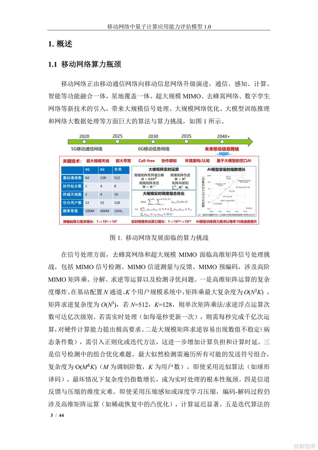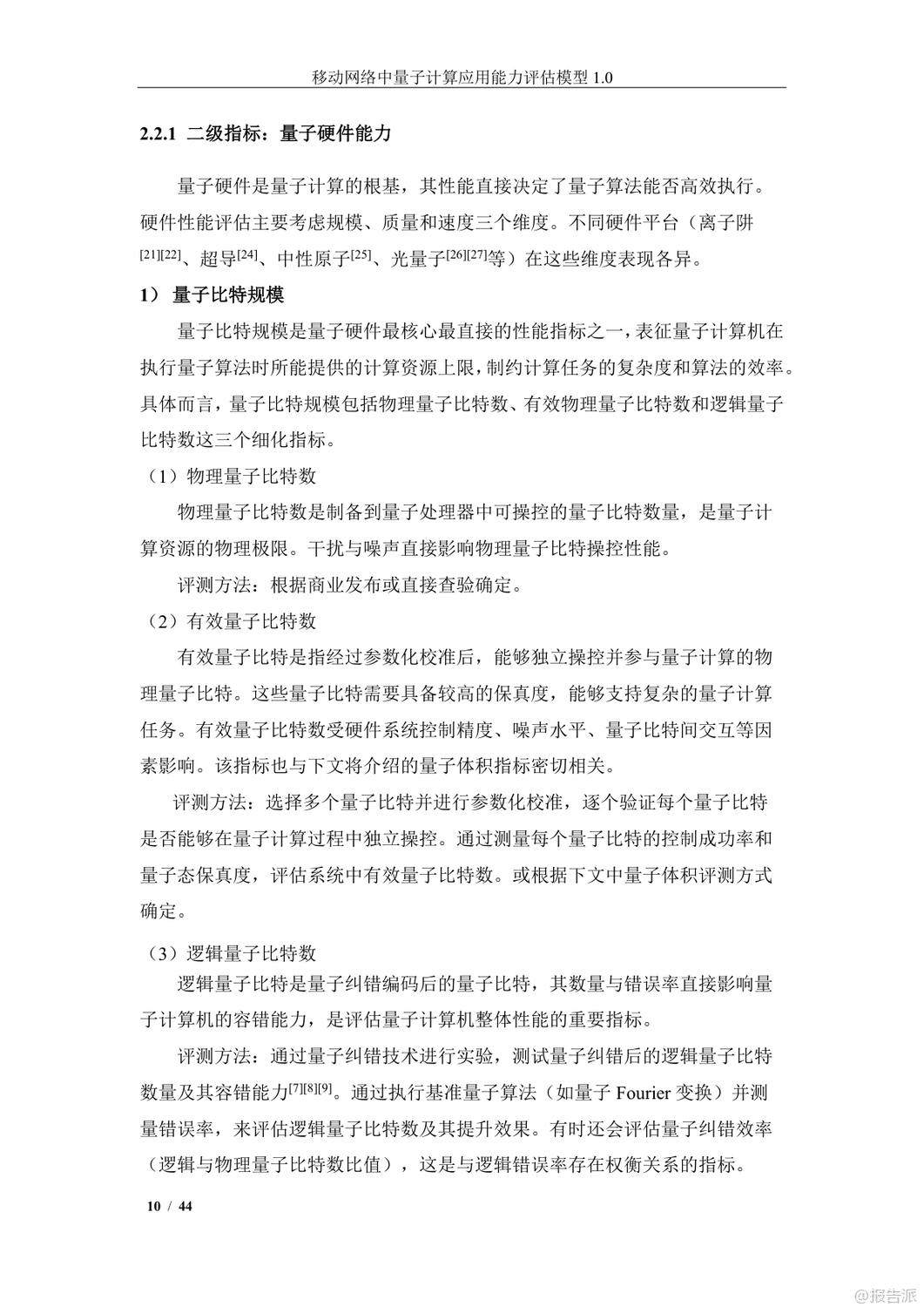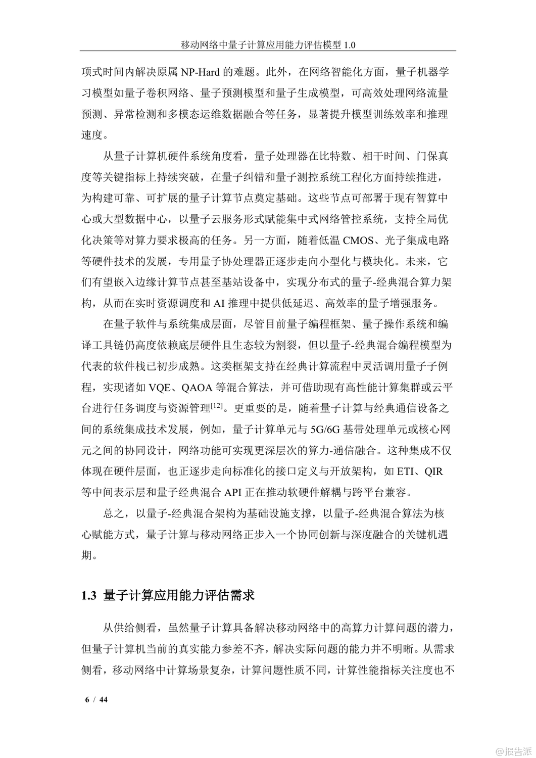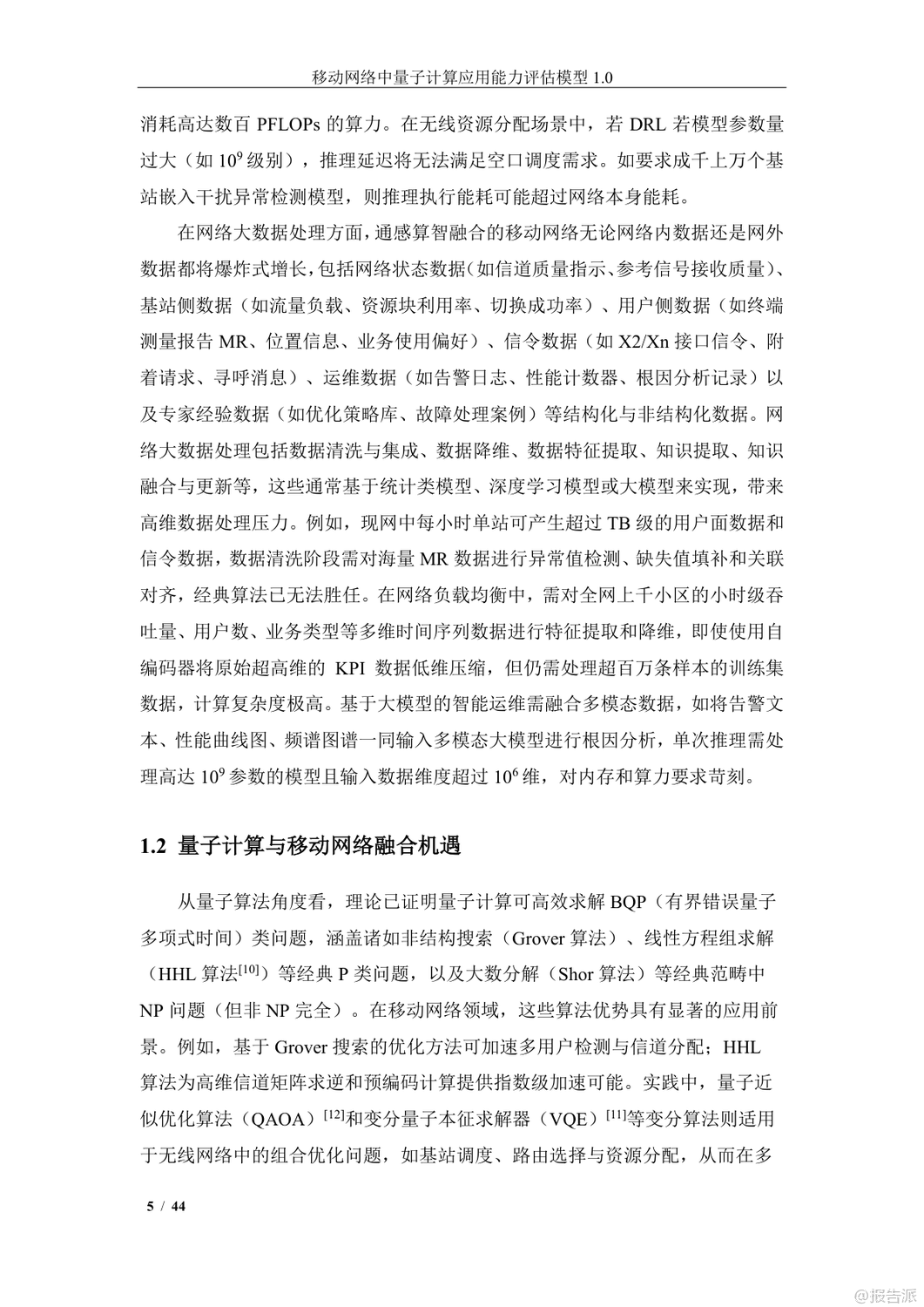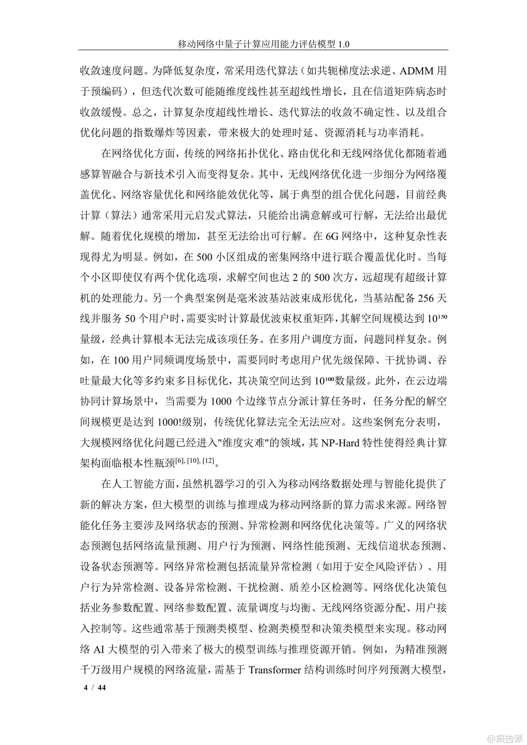 | 近日,中移智库发布了《移动网络中量子计算应用能力评估模型(2025年)》,首次构建了一套系统化、可量化的评估体系,旨在破解当前量子计算在移动通信领域“看似强大、实则难用”的落地困境。 这份由中国移动研究院牵头编制的报告,不仅揭示了6G时代算力瓶颈的严峻性,更提出了衡量量子计算真实应用价值的“标尺”。 移动网络正从传统通信向“通感算智”融合的信息网络演进,超大规模MIMO、去蜂窝网络、数字孪生等技术带来了前所未有的算力挑战。 报告指出,面对高维矩阵求逆、组合优化等问题,经典计算已接近“维度灾难”的极限。 例如,一个500小区的联合覆盖优化,其解空间高达2^500,远超现有超级计算机能力。 量子计算凭借其在Grover搜索、HHL算法等方面的理论优势,被视为破局关键。 然而,当前量子计算技术路线繁杂,硬件性能参差不齐,软件生态割裂,导致其真实能力难以评估。 为此,该报告创新性地提出了“钻石模型”需求框架,将“计算可用性”分解为精度、速度、规模、容量四大核心指标,并以此为基础,构建了包含系统性能、扩展能力和部署能力三大维度的三级评估体系。 在系统性能层面,报告强调不能只看“量子比特数”这一单一指标,而应综合考量硬件能力(如双比特门保真度、量子体积)、软件栈能力(如编译效率、量子-经典交互效率)和算法运行能力(如算法保真度、可运行规模)。 例如,衡量软件栈能力时,引入了“保真度感知编译”和“混合算法迭代开销”等新指标,直击含噪中等规模量子(NISQ)时代的痛点。 更进一步,报告设计了可落地的评估模型。 以“移动网络后端运维”场景为例,通过专家调研确定了各指标权重:系统性能占60%,其中算法运行能力权重最高(40%),凸显了对实际任务解决能力的重视;扩展能力占25%,部署能力占15%。 模型采用线性加权求和法计算综合得分,并建议通过敏感性分析和与专家共识对比来验证模型的稳健性。 该模型的价值在于,它不仅是对量子计算能力的“打分卡”,更是一个“诊断工具”。 它能帮助企业识别量子系统在算法保真度、混合计算效率等方面的短板,指导技术发展方向。 报告也坦言,当前模型仍是初级版本,未来将随技术演进持续更新。 这份报告的发布,标志着量子计算的应用探索,正从“盲目追捧”迈向“理性评估”的新阶段,为量子计算真正融入下一代移动网络奠定了科学基础。 出品方:中移智库 发布时间:2025年 文档页数:44页