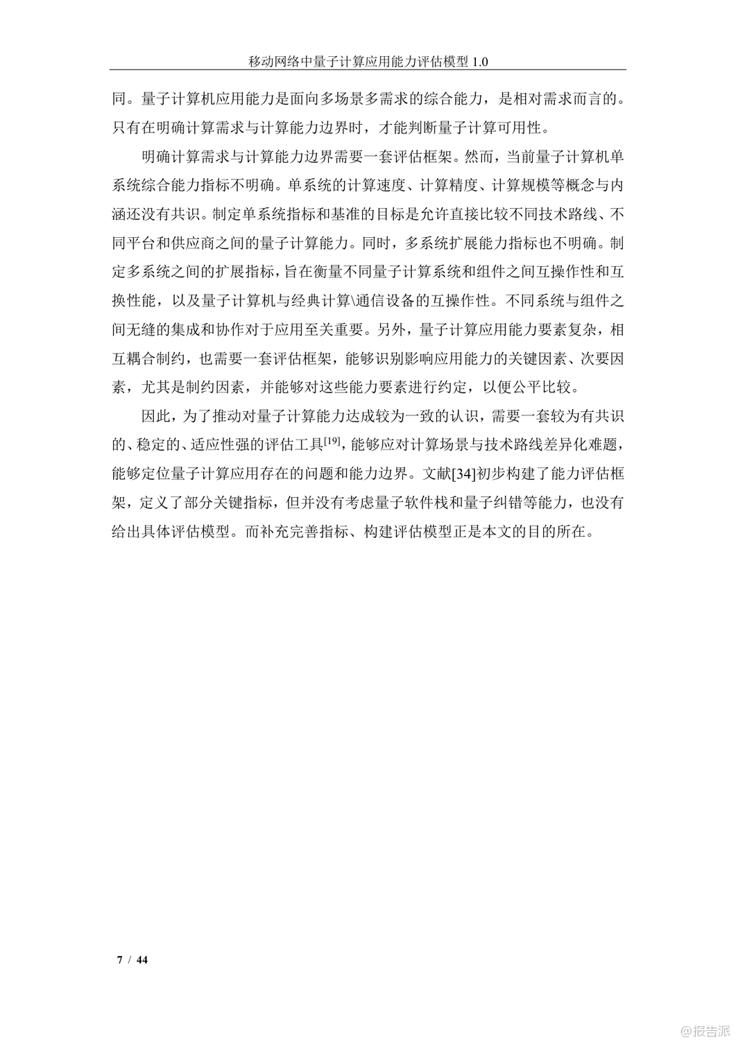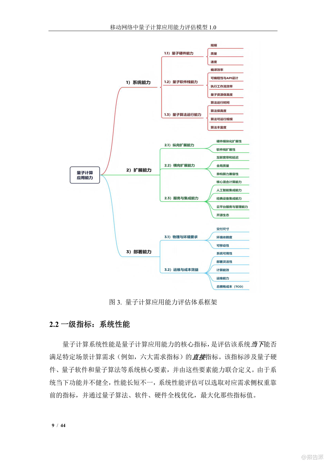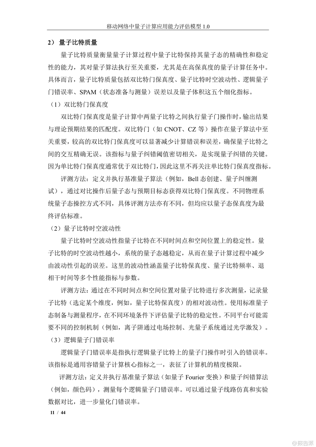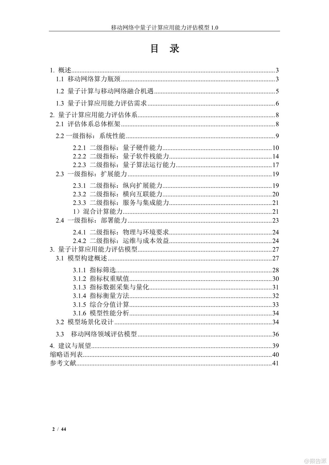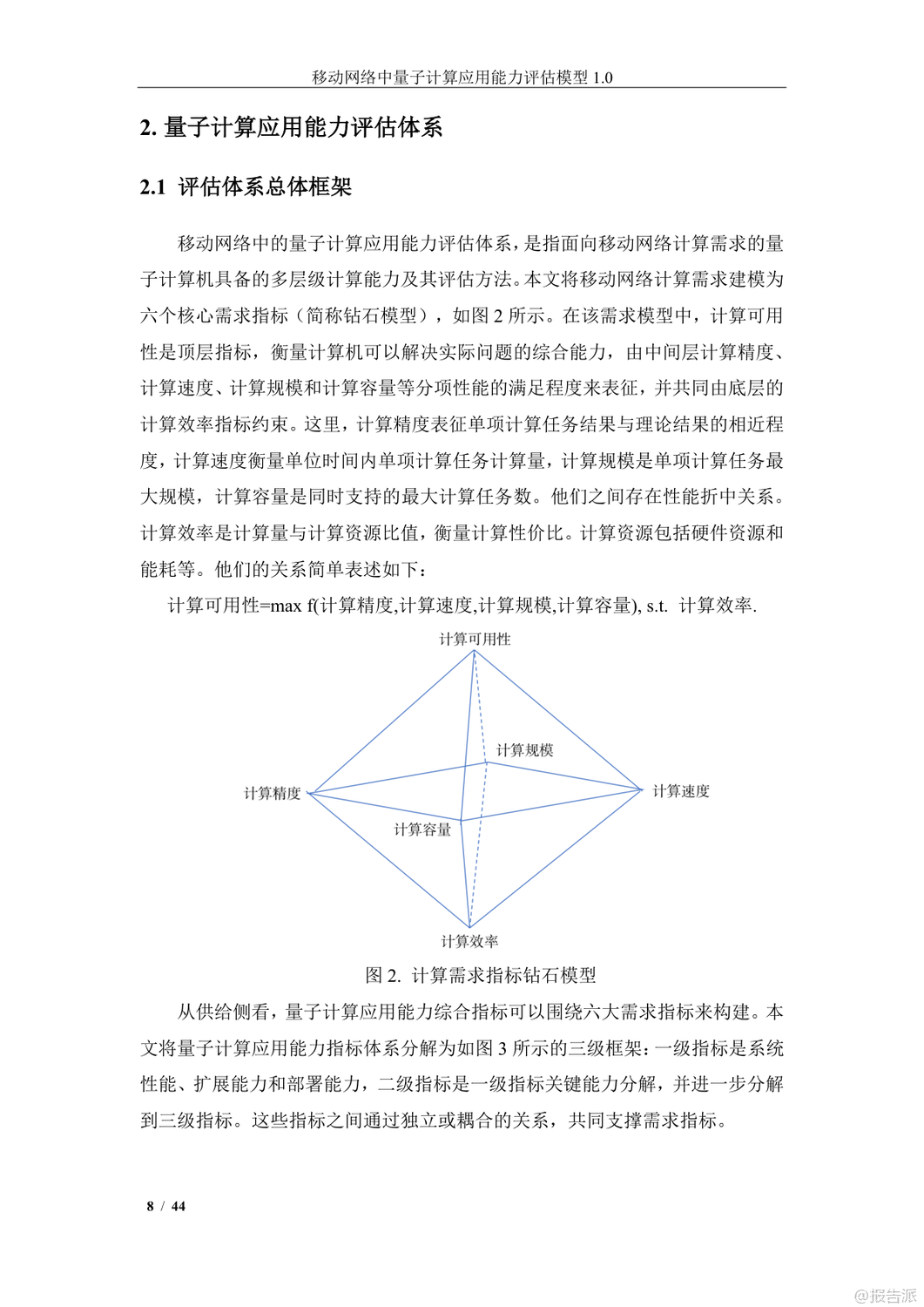 | 近日,中移智库发布了《移动网络中量子计算应用能力评估模型(2025年)》,首次构建了一套系统化、可量化的评估体系,旨在破解当前量子计算在移动通信领域“看似强大、实则难用”的落地困境。 这份由中国移动研究院牵头编制的报告,不仅揭示了6G时代算力瓶颈的严峻性,更提出了衡量量子计算真实应用价值的“标尺”。 移动网络正从传统通信向“通感算智”融合的信息网络演进,超大规模MIMO、去蜂窝网络、数字孪生等技术带来了前所未有的算力挑战。 报告指出,面对高维矩阵求逆、组合优化等问题,经典计算已接近“维度灾难”的极限。 例如,一个500小区的联合覆盖优化,其解空间高达2^500,远超现有超级计算机能力。 量子计算凭借其在Grover搜索、HHL算法等方面的理论优势,被视为破局关键。 然而,当前量子计算技术路线繁杂,硬件性能参差不齐,软件生态割裂,导致其真实能力难以评估。 为此,该报告创新性地提出了“钻石模型”需求框架,将“计算可用性”分解为精度、速度、规模、容量四大核心指标,并以此为基础,构建了包含系统性能、扩展能力和部署能力三大维度的三级评估体系。 在系统性能层面,报告强调不能只看“量子比特数”这一单一指标,而应综合考量硬件能力(如双比特门保真度、量子体积)、软件栈能力(如编译效率、量子-经典交互效率)和算法运行能力(如算法保真度、可运行规模)。 例如,衡量软件栈能力时,引入了“保真度感知编译”和“混合算法迭代开销”等新指标,直击含噪中等规模量子(NISQ)时代的痛点。 更进一步,报告设计了可落地的评估模型。 以“移动网络后端运维”场景为例,通过专家调研确定了各指标权重:系统性能占60%,其中算法运行能力权重最高(40%),凸显了对实际任务解决能力的重视;扩展能力占25%,部署能力占15%。 模型采用线性加权求和法计算综合得分,并建议通过敏感性分析和与专家共识对比来验证模型的稳健性。 该模型的价值在于,它不仅是对量子计算能力的“打分卡”,更是一个“诊断工具”。 它能帮助企业识别量子系统在算法保真度、混合计算效率等方面的短板,指导技术发展方向。 报告也坦言,当前模型仍是初级版本,未来将随技术演进持续更新。 这份报告的发布,标志着量子计算的应用探索,正从“盲目追捧”迈向“理性评估”的新阶段,为量子计算真正融入下一代移动网络奠定了科学基础。 出品方:中移智库 发布时间:2025年 文档页数:44页