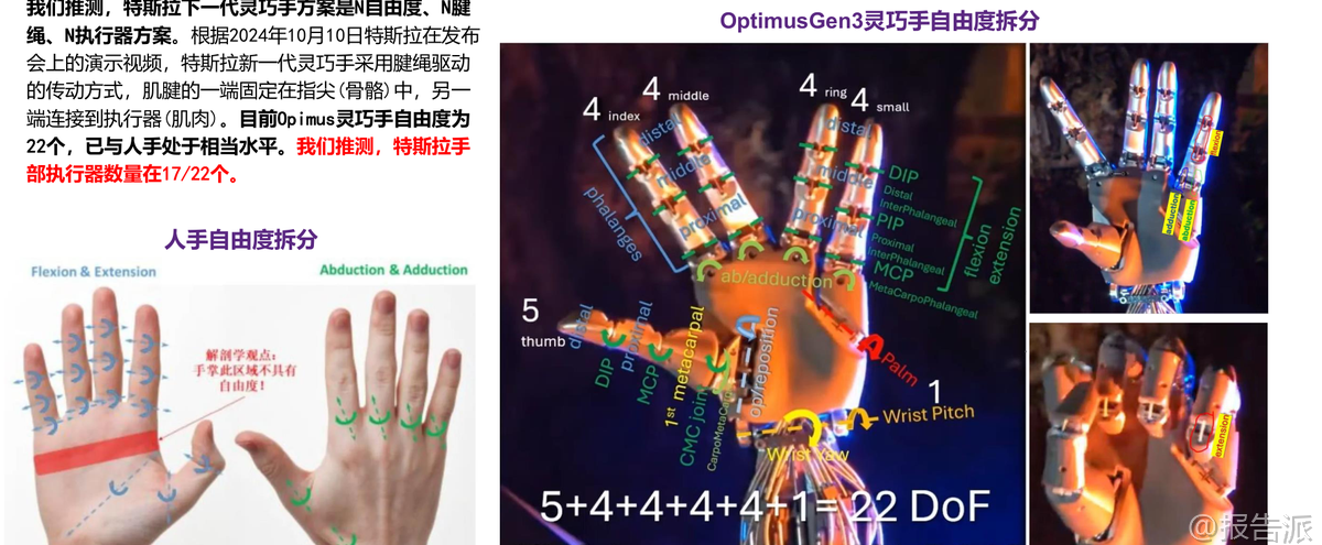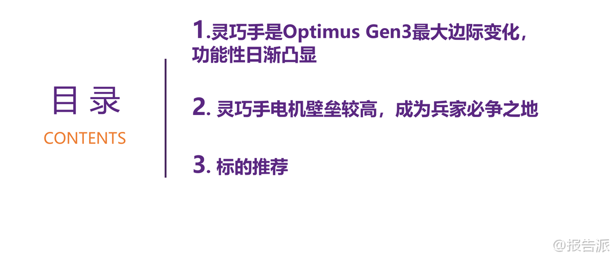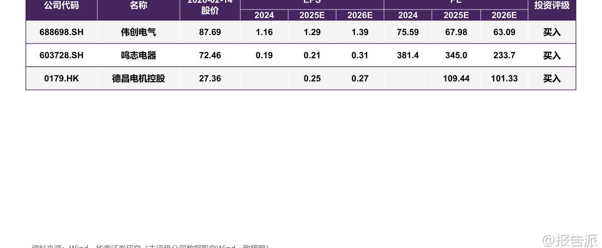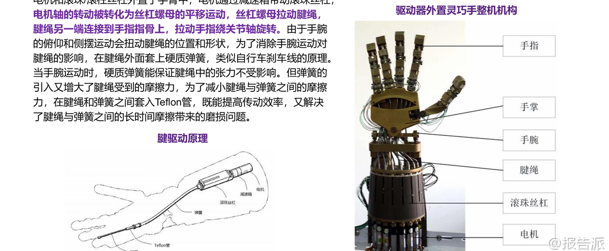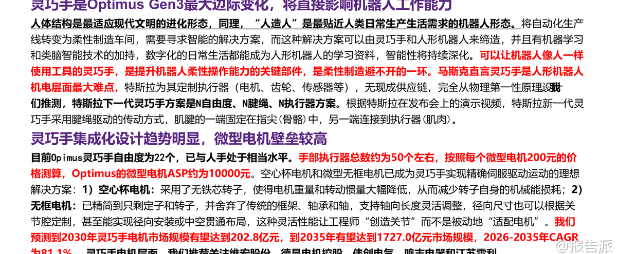 | 人形机器人正从科幻走向现实,而推动这一进程的核心技术之一,正是灵巧手。 在特斯拉Optimus Gen3的最新迭代中,灵巧手成为其最大的边际变化,标志着人形机器人从“能动”迈向“会用工具”的关键跨越。 这份由华鑫证券发布的《微型电机行业专题报告》深入剖析了灵巧手的技术演进、核心部件壁垒以及未来市场空间,揭示出微型电机已成为产业链竞争的焦点。 报告指出,人体结构是最适应现代文明的进化形态,因此,“人造人”形态的人形机器人最贴近人类日常生产生活需求。 要将传统自动化生产线转变为柔性制造车间,必须依赖具备高度灵活性的操作能力——这正是灵巧手的价值所在。 马斯克曾直言,灵巧手是人形机器人机电层面的最大难点。 特斯拉为此专门定制执行器(包括电机、齿轮、传感器等),没有现成供应链,完全基于物理第一性原理进行设计。 这说明该领域尚处于技术攻坚阶段,但也意味着巨大的国产替代与创新机会。 目前,Optimus灵巧手已实现22个自由度,接近人手水平。 每个手指的动作都需要精密控制,背后是约50个微型执行器的协同工作。 按照每个微型电机200元估算,单台Optimus的微型电机价值量高达1万元。 如此高的ASP(平均售价)凸显了其在整机成本中的重要地位。 报告预测,随着人形机器人放量,灵巧手电机市场规模将爆发式增长:到2030年有望达到202.8亿元,到2035年更将攀升至1727.0亿元,2026-2035年的复合年均增长率(CAGR)高达81.1%。 驱动这一高增长的核心动力,来自于两大主流技术路线:空心杯电机和微型无框电机。 空心杯电机采用无铁芯转子结构,大幅降低重量和转动惯量,响应速度快、效率高,非常适合需要快速启停和精准定位的应用场景。 相比之下,传统有刷直流电机存在铁损大、效率低、寿命短等问题,难以满足高端需求。 而微型无框电机则进一步打破结构限制,仅保留定子和转子,舍弃外壳、轴承和轴,可直接嵌入机械关节中,实现真正的“一体化集成”。 这种设计不仅提升了功率密度和散热性能,还允许工程师“创造关节”而非被动适配电机,极大增强了系统设计的灵活性。 报告特别强调,微型无框电机的优势在于其嵌入式设计可有效抵消装配误差和传动回程误差,提升整体精度;同时便于通过壳体导热实现高效散热,保障长时间稳定运行。 此外,模块化封装减少了外部接线和易损件,提高了可靠性,并为集成温度、振动等传感器预留空间,结合AI算法可实现故障预警和预测性维护,显著降低运维成本。 当前全球范围内已有多个企业在灵巧手领域取得突破。 例如,灵心巧手已成为全球唯一实现月产千台高自由度灵巧手的企业,市占率超80%,并计划在2026年实现5-10万台交付规模。 Sharpa Wave在CES大会上展示折纸风车的能力,其自研动态触觉阵列指尖分辨率小于1毫米,压力感知灵敏度达0.005N,展现了前所未有的精细操作能力。 临界点作为智元机器人拆分出的独立公司,已完成数亿元融资,专注于灵巧手的研发与量产。 面对如此广阔的市场前景,国内一批企业已在微型电机赛道上积极布局。 维宏股份通过收购汉姆电子切入机器人用无刷电机领域;伟创电气作为工控平台全链路供应商,持续研发关节模组与灵巧手相关产品;鸣志电器凭借全球领先的空心杯电机技术和价格优势,在机器人应用领域增速接近200%;江苏雷利深耕微特电机多年,加速拓展汽车、医疗及机器人新兴业务;德昌电机控股则在微型驱动系统方面拥有深厚积累。 然而,行业仍面临多重挑战:一是技术研发与产业化进程可能不及预期;二是人形机器人商业化落地节奏存在不确定性;三是市场竞争加剧可能导致格局恶化;四是原材料如稀土永磁体的价格波动将影响成本控制。 尽管如此,报告仍维持对行业的“推荐”评级,认为灵巧手作为人形机器人功能实现的关键环节,其技术突破将持续带动微型电机需求扩张。 总体来看,灵巧手不仅是Optimus Gen3的最大亮点,更是整个具身智能产业发展的缩影。 随着AI大模型赋予机器人“大脑”,灵巧手则为其提供了“双手”,二者结合将真正开启通用机器人的时代。 而在这场技术浪潮中,掌握高性能微型电机核心技术的企业,有望在全球供应链重构中占据有利位置。 本文由【报告派】研读,输出观点仅作为行业分析! 原文标题:2026-02-14-华鑫证券-华鑫证券-微型电机行业专题报告:灵巧手是Optimus Gen3最大边际变化,微型电机成为兵家必争之地 发布时间:2026年 出品方:华鑫证券 文档页数:29页