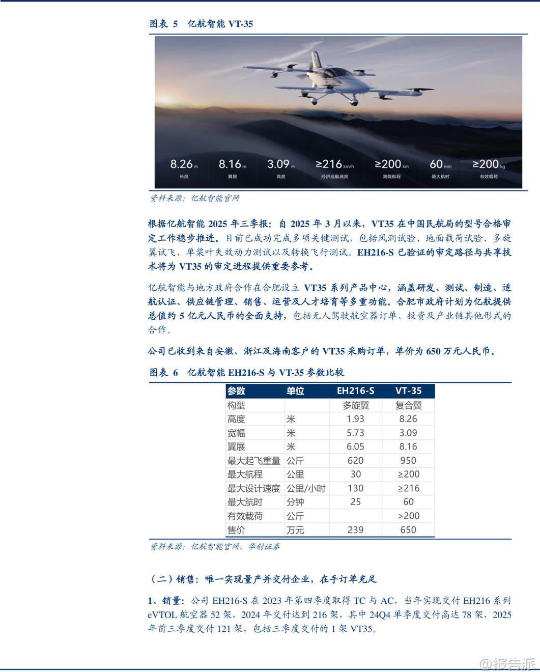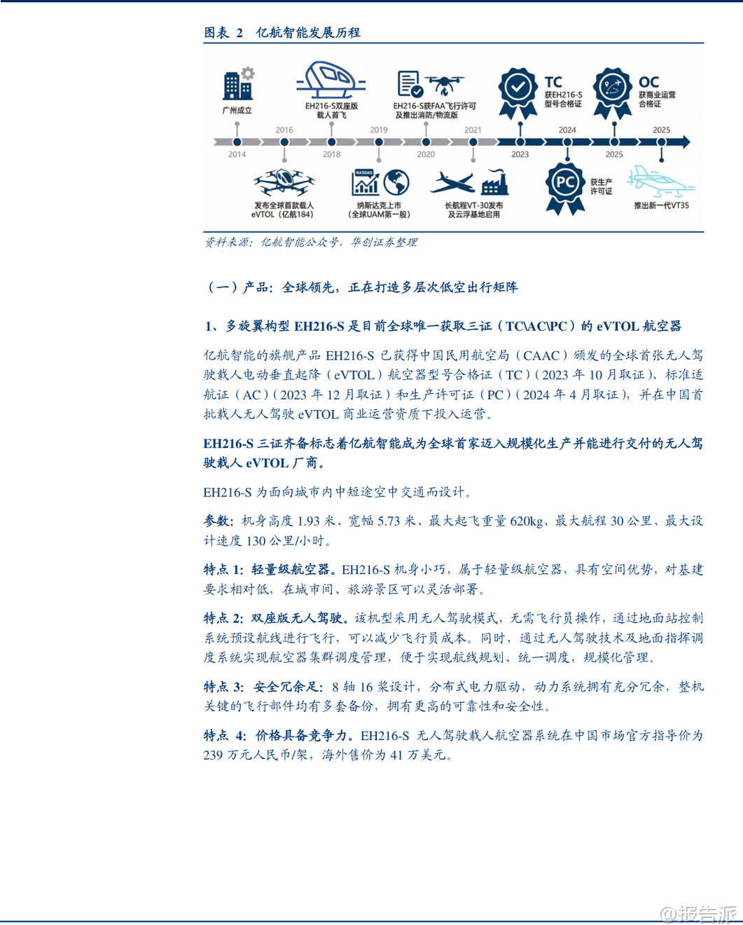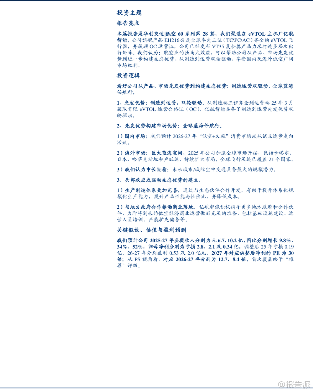 | 亿航智能(EH.US)作为全球领先的eVTOL(电动垂直起降飞行器)企业,正在引领低空经济的产业变革。 本篇由华创证券发布的深度研究报告系统梳理了亿航智能在产品、市场、财务及生态布局方面的核心优势,并展望其在全球低空经济浪潮中的战略前景。 从产品维度看,亿航智能已构建起多层次的低空出行矩阵。 其旗舰产品EH216-S是目前全球唯一获得中国民航局颁发的型号合格证(TC)、标准适航证(AC)和生产许可证(PC)“三证”齐全的无人驾驶载人eVTOL航空器,标志着其正式迈入规模化量产与商业化交付阶段。 该机型为多旋翼构型,具备轻量化、双座无人驾驶、高安全冗余(8轴16桨设计)等特点,适用于城市短途交通与景区空中游览,单机售价约239万元人民币。 2025年10月,公司推出新一代复合翼构型产品VT35,最大航程超过200公里,最大设计速度达216公里/小时以上,有效载荷超200公斤,主要面向城际、跨海、山区等中长途交通场景,进一步完善了产品体系。 在销售与订单方面,亿航智能展现出强劲的市场拓展能力。 截至2025年三季度,公司已累计交付EH216系列飞行器359架,其中2024年全年交付216架,2025年前三季度交付121架,包括首架VT35。 其客户结构以地方政府及其下属文旅企业为主,反映出当前eVTOL应用正从政策推动下的试点示范走向实际落地。 典型合作案例包括合肥市政府采购100架、山西西山文旅500架意向订单、贵州贵旅集团50架采购订单等。 这些合作不仅带来直接收入,更推动了基础设施建设、航线规划与运营资质的获取,为商业化运营奠定基础。 财务表现上,公司处于高速成长期。 2024年实现营业收入4.56亿元,同比增长288.5%,毛利率高达61.4%。 尽管2025年前三季度因交付节奏调整导致收入同比略有下滑,但公司维持全年5亿元收入指引。 值得注意的是,公司在2024年首次实现调整后盈利4309万元,显示出良好的盈利能力。 根据华创证券预测,随着交付量提升,公司有望在2026-2027年实现全面盈利,届时对应调整后净利润的市盈率具备吸引力。 亿航智能的核心竞争力在于其“先发优势”向“生态优势”的转化。 一方面,公司在制造端拥有全球首个“四证齐全”(TC/AC/PC/OC)的企业——2025年3月,旗下运营子公司获得国内首批无人驾驶载人航空器运营合格证(OC),实现了从制造到运营的闭环。 另一方面,公司积极构建产业生态:在供应链上,与英搏尔合作开发电驱动系统,与国轩高科定制动力电池,投资固态电池企业欣界能源,与敏实集团联合开发机舱系统;在市场端,与合肥、威海、长春、安顺等多个地方政府建立战略合作,共建运营中心与产业园区,推动低空经济产业集群发展。 国内市场方面,报告预计2026-2027年“低空+文旅”市场将从试点走向活跃。 假设30%的4A级以上景区引入eVTOL,每景区配置5-10架,则潜在需求可达5000-10000架。 中长期看,城市空中交通潜力巨大——仅按1%渗透率测算,我国巡游出租车存量即对应超1.3万架eVTOL需求。 而在城际交通方面,EH216系列已完成跨越琼州海峡22公里航线飞行,耗时仅18分钟,较传统轮渡效率提升70%以上。 海外市场同样空间广阔。 亿航智能已在全球21个国家开展飞行测试与合作,重点布局泰国、卡塔尔、日本、哈萨克斯坦和卢旺达。 尤其在泰国,公司启动AAM沙盒试点项目,计划2026年底前部署100架EH216用于观光、接驳等服务,有望成为全球首个商业化落地的样板。 此外,卡塔尔完成中东地区首次无人驾驶载人飞行,日本在世博会及富士山区域成功试飞,均验证了产品的国际适应性。 宏观层面,2026年或成为中国低空经济建设提速的关键年份。 “十五五”规划明确提出培育低空经济为新兴支柱产业,新修订的《民用航空法》将于2026年7月施行,为行业发展提供法律保障。 同时,十部门联合发布《低空经济标准体系建设指南》,工信部等五部门推进低空通信网络建设,政策体系正加速完善。 美国亦通过行政命令推动eVTOL试点,中美两国将在全球低空经济领域展开竞逐。 综上所述,亿航智能凭借产品领先、制造成熟、运营资质完备及生态协同优势,已成为低空经济赛道最具竞争力的企业之一。 随着国内政策落地与海外市场的持续开拓,公司有望率先享受万亿级低空经济的蓝海红利。 华创证券首次覆盖给予“推荐”评级,认为其长期价值值得重点关注。 本文由【报告派】研读,输出观点仅作为行业分析! 原文标题:华创证券-亿航智能(EH.US)深度研究报告:华创交运、低空60系列研究(二十八),先发优势到生态优势,制造运营双驱动,全球蓝海任航行 发布时间:2025年 出品方:华创证券